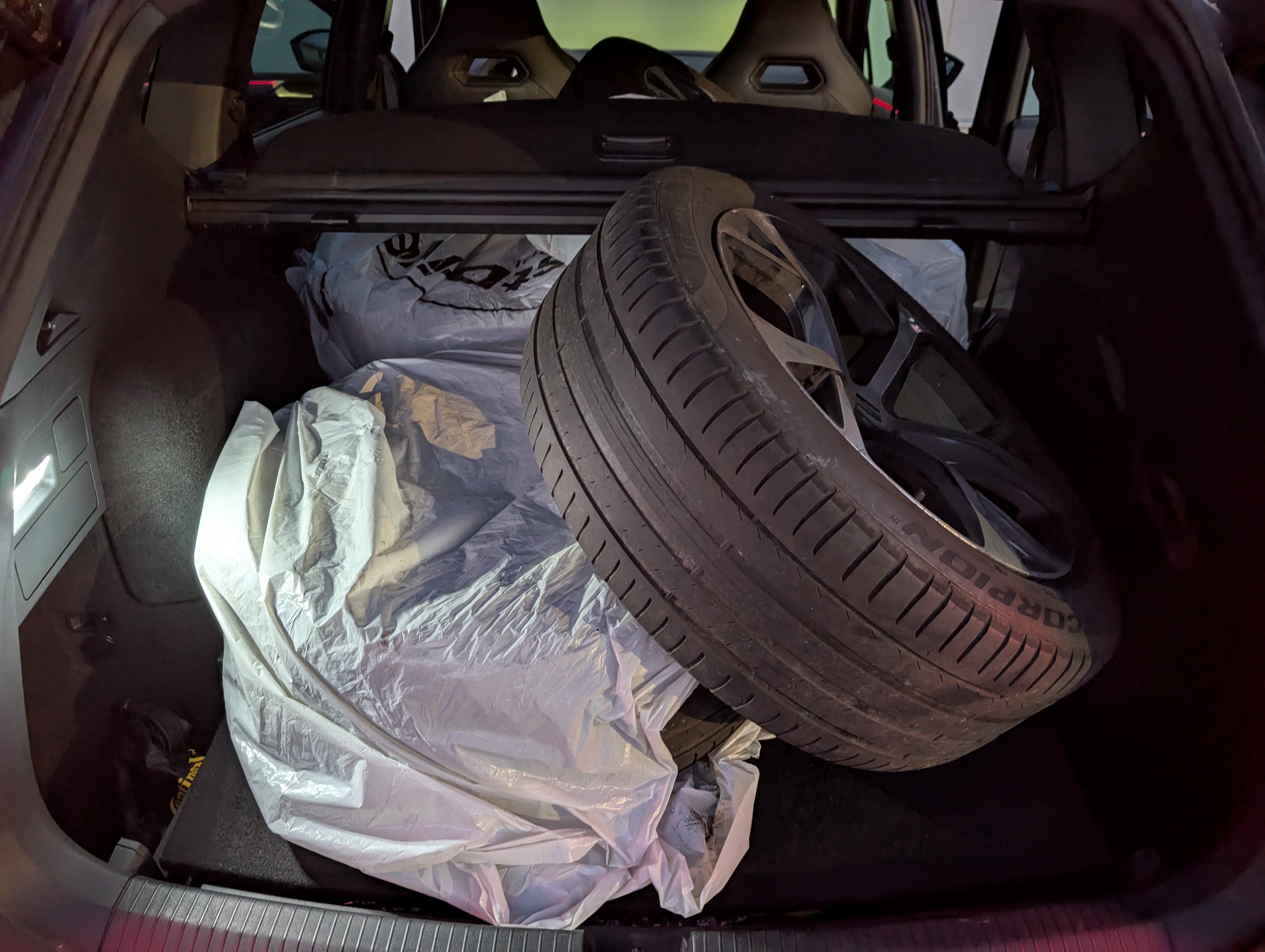4x letné pneumatiky na diskoch, uložené vo vozidle.