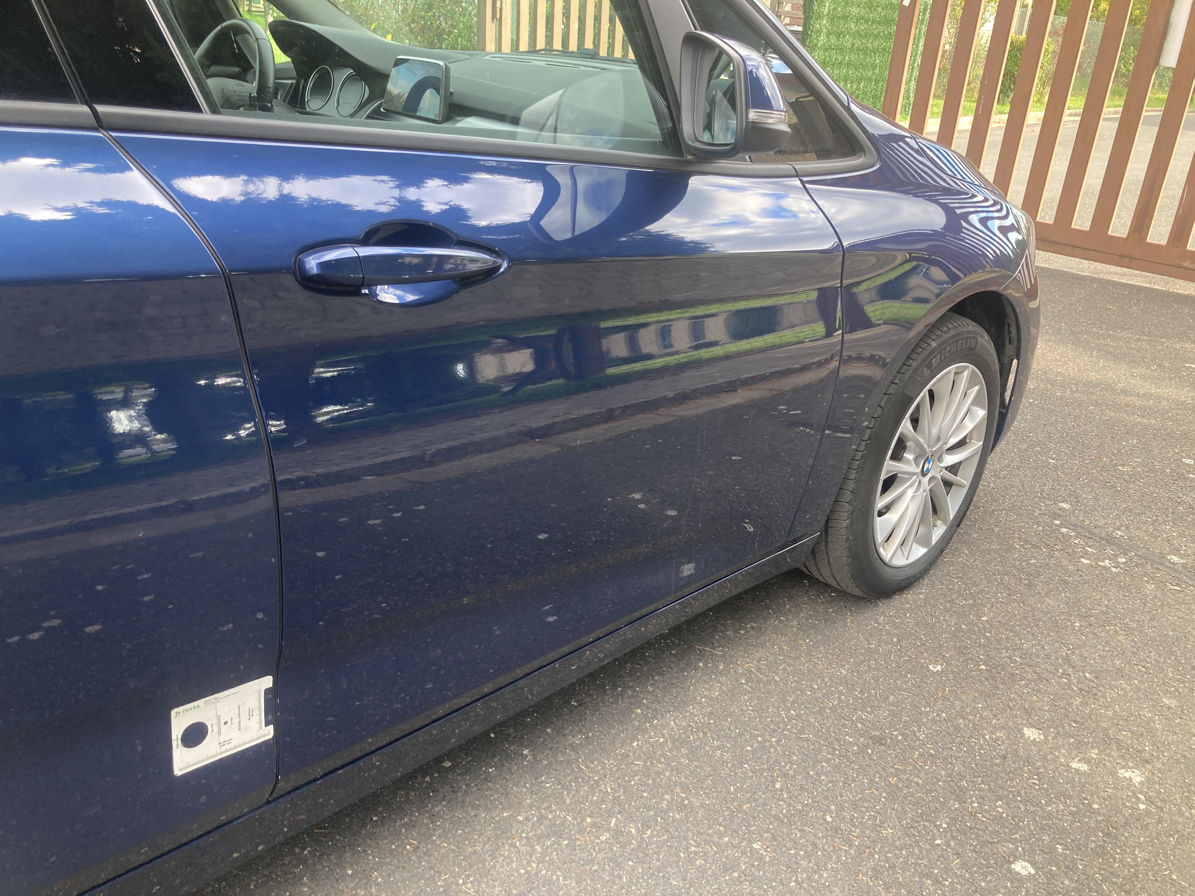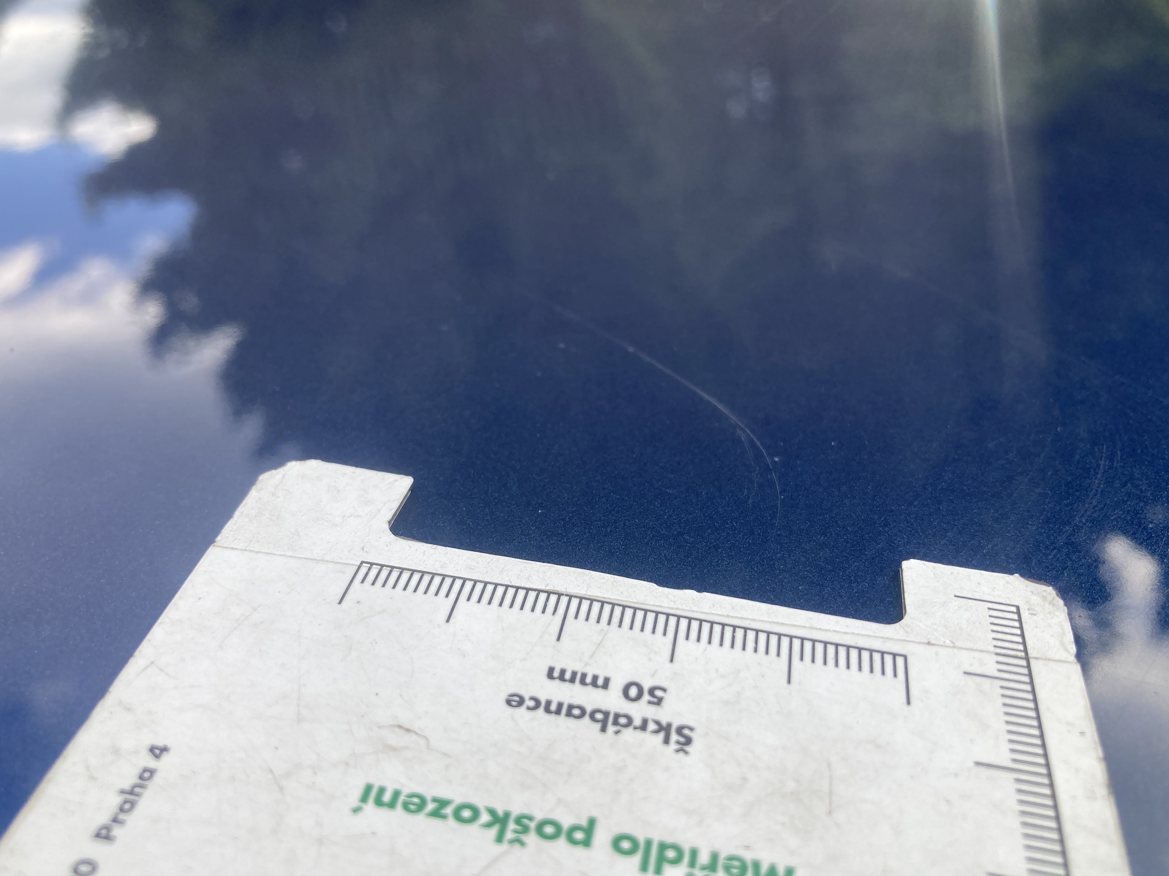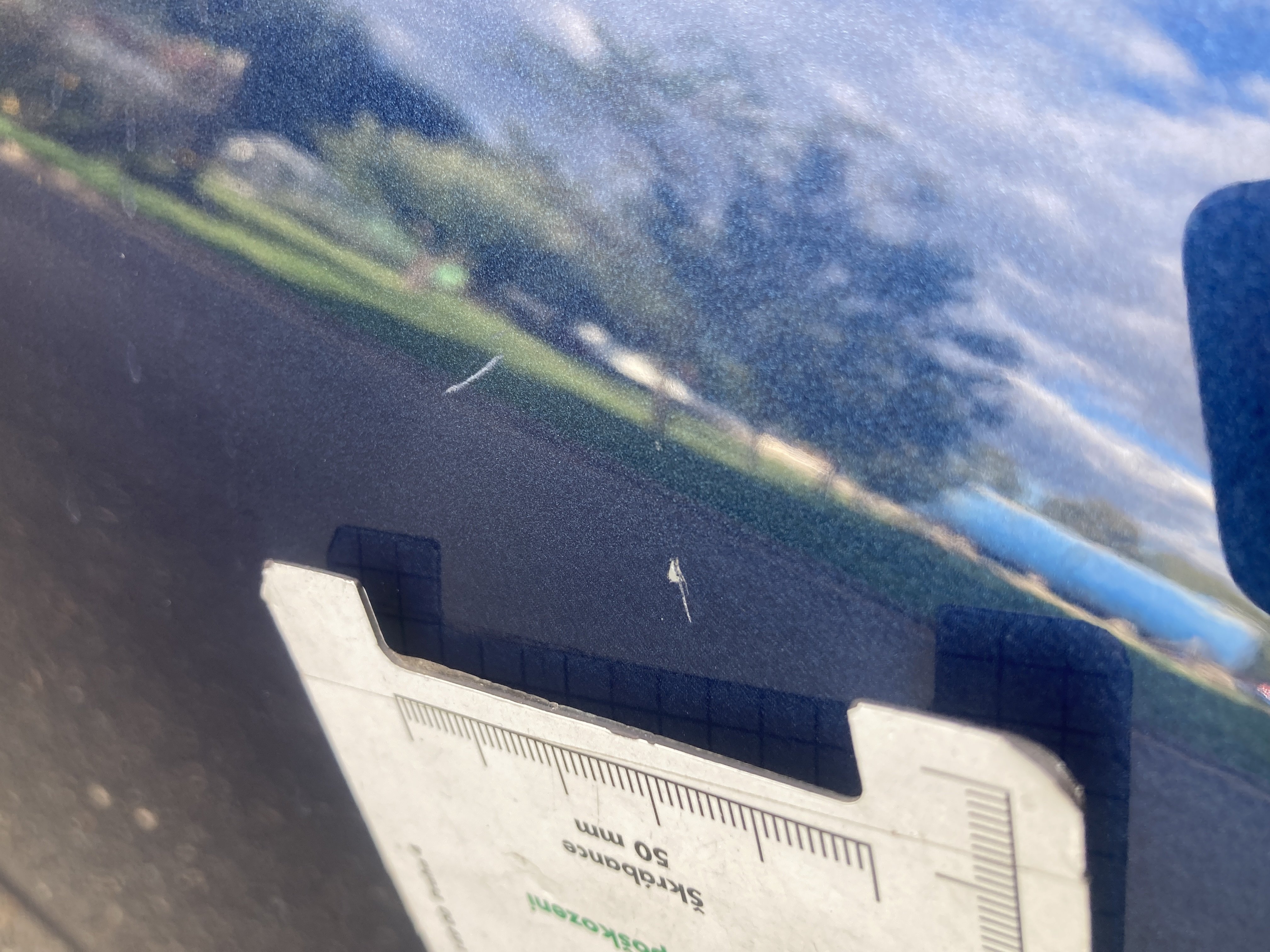 Oděrky a škrábance po obvodu karosérie, přední část karosérie je poškozená od kamínků, mírně odřený pravý přední blatník, odřený zadní nárazník, odřená hrana pravých předních dveří, odřený pravý rám dveří, odřená střecha, interiér vozidla opotřeben, karosérie nese stopy po předchozí opravě,