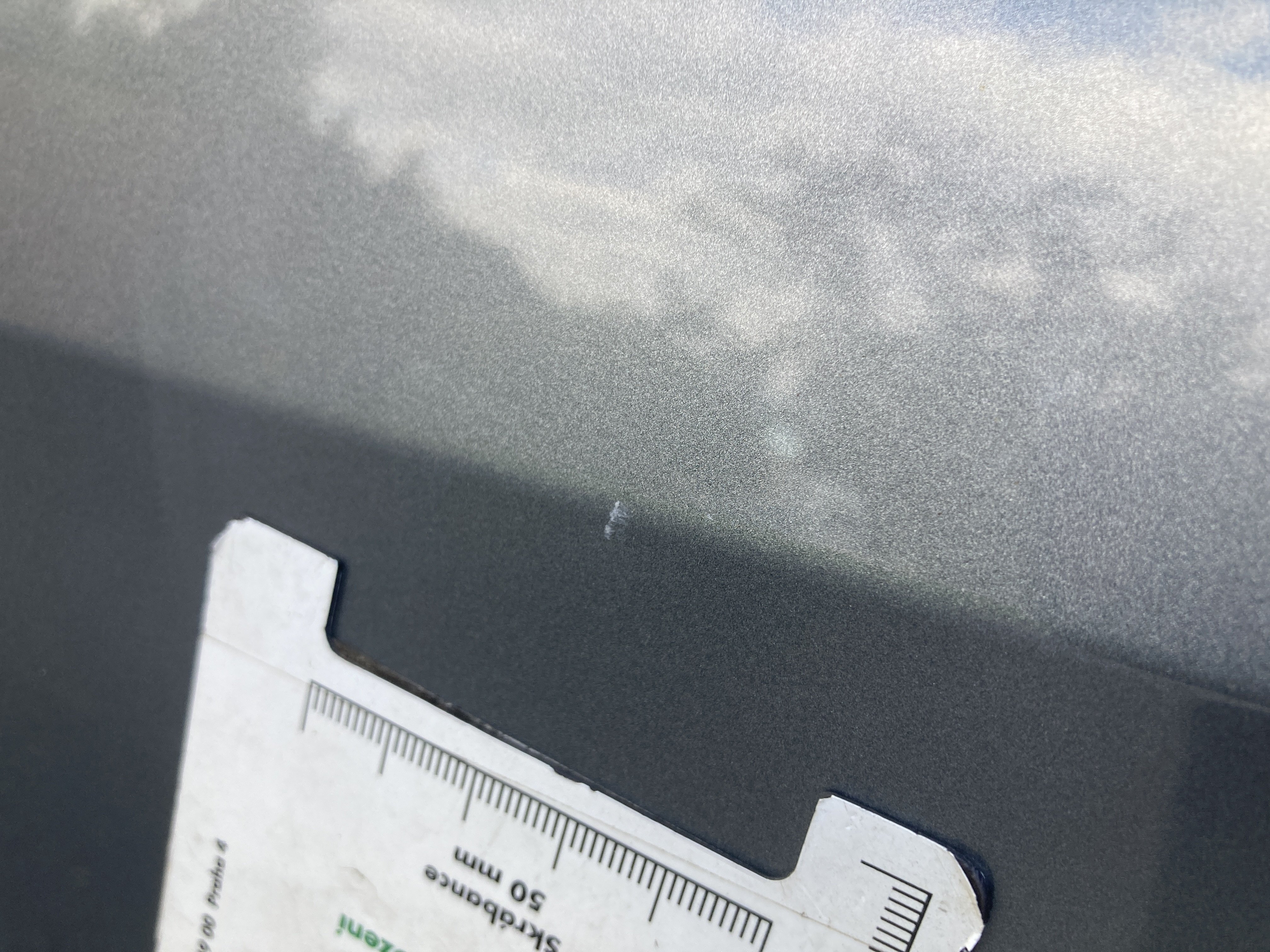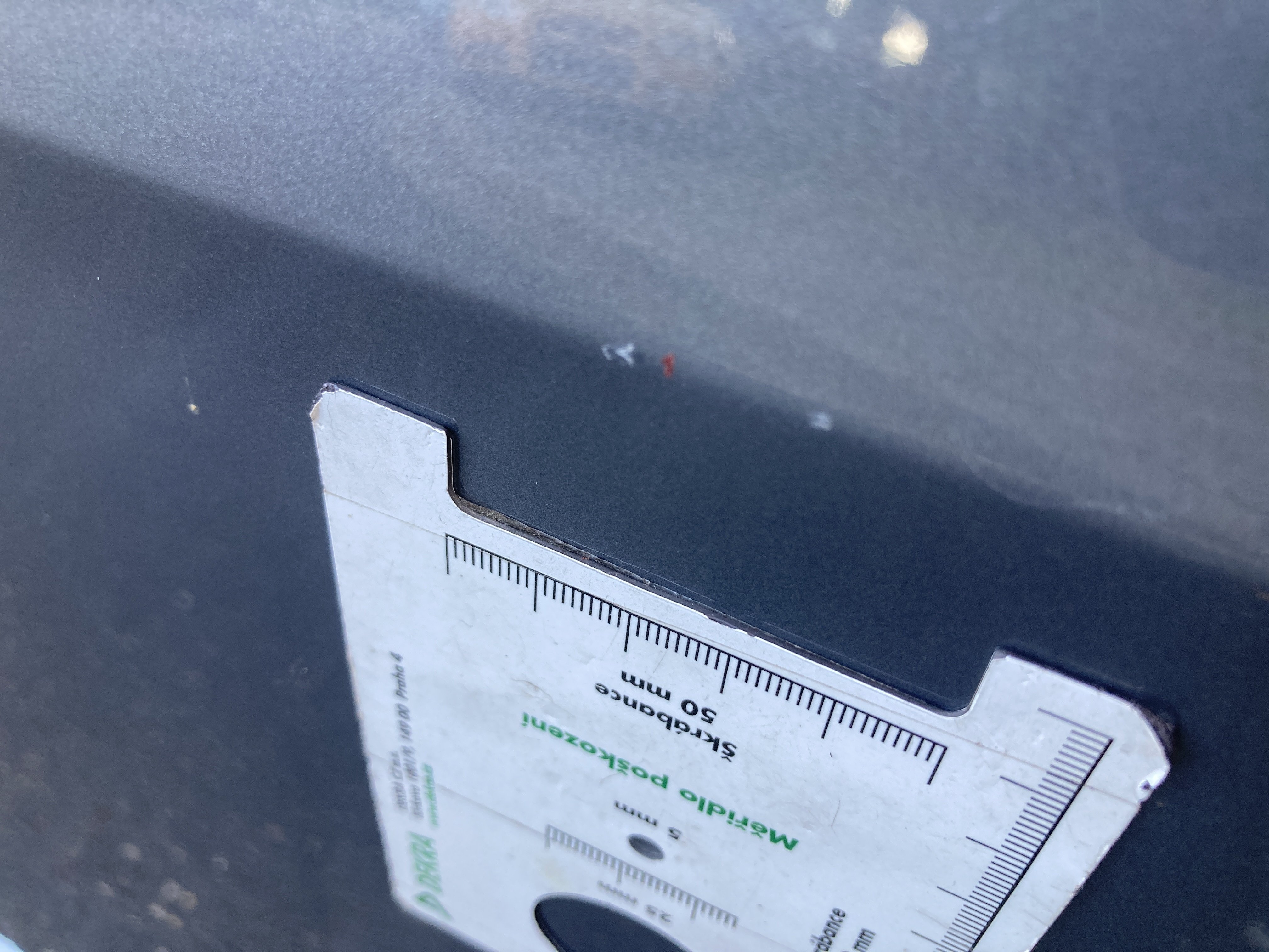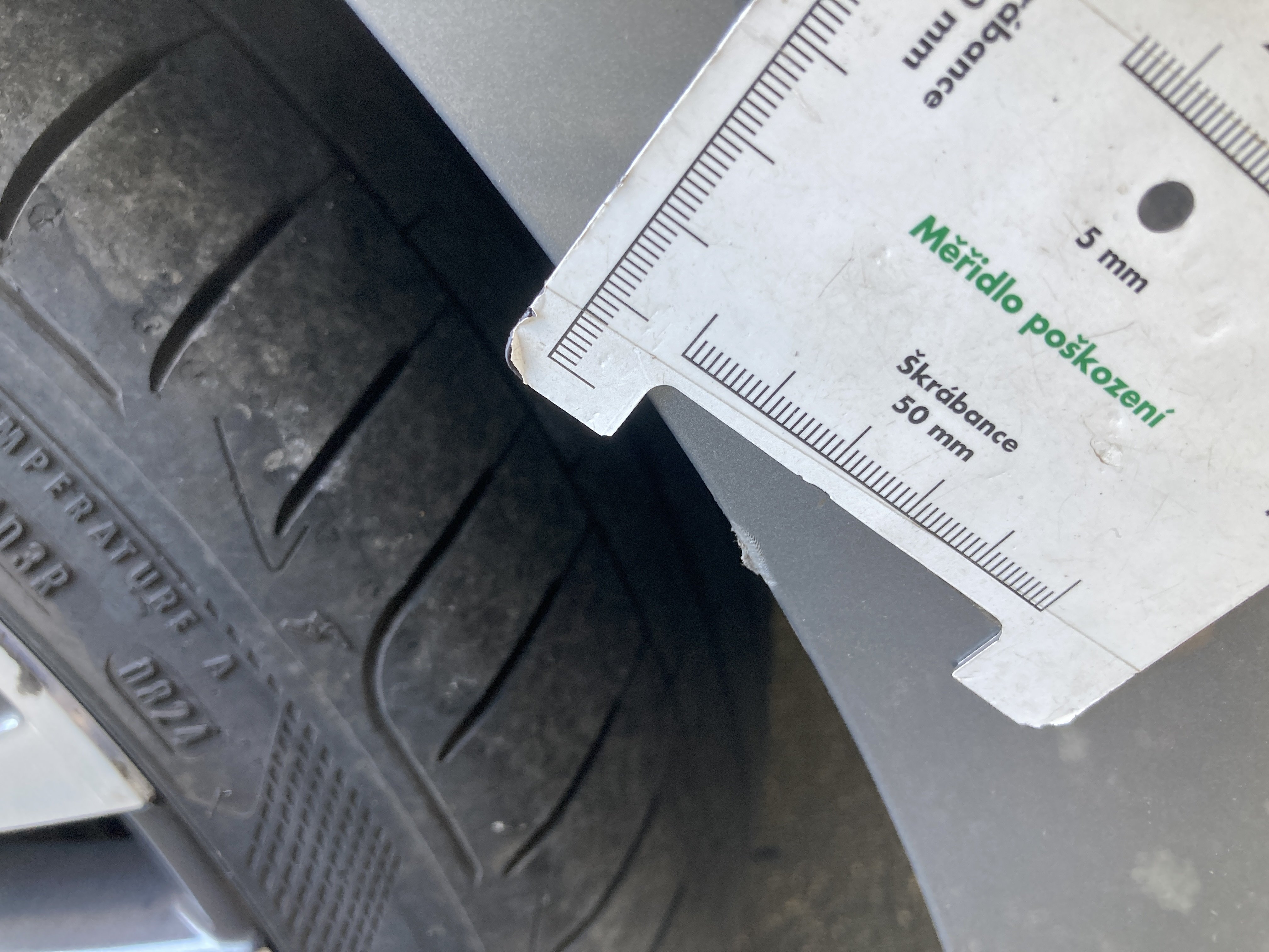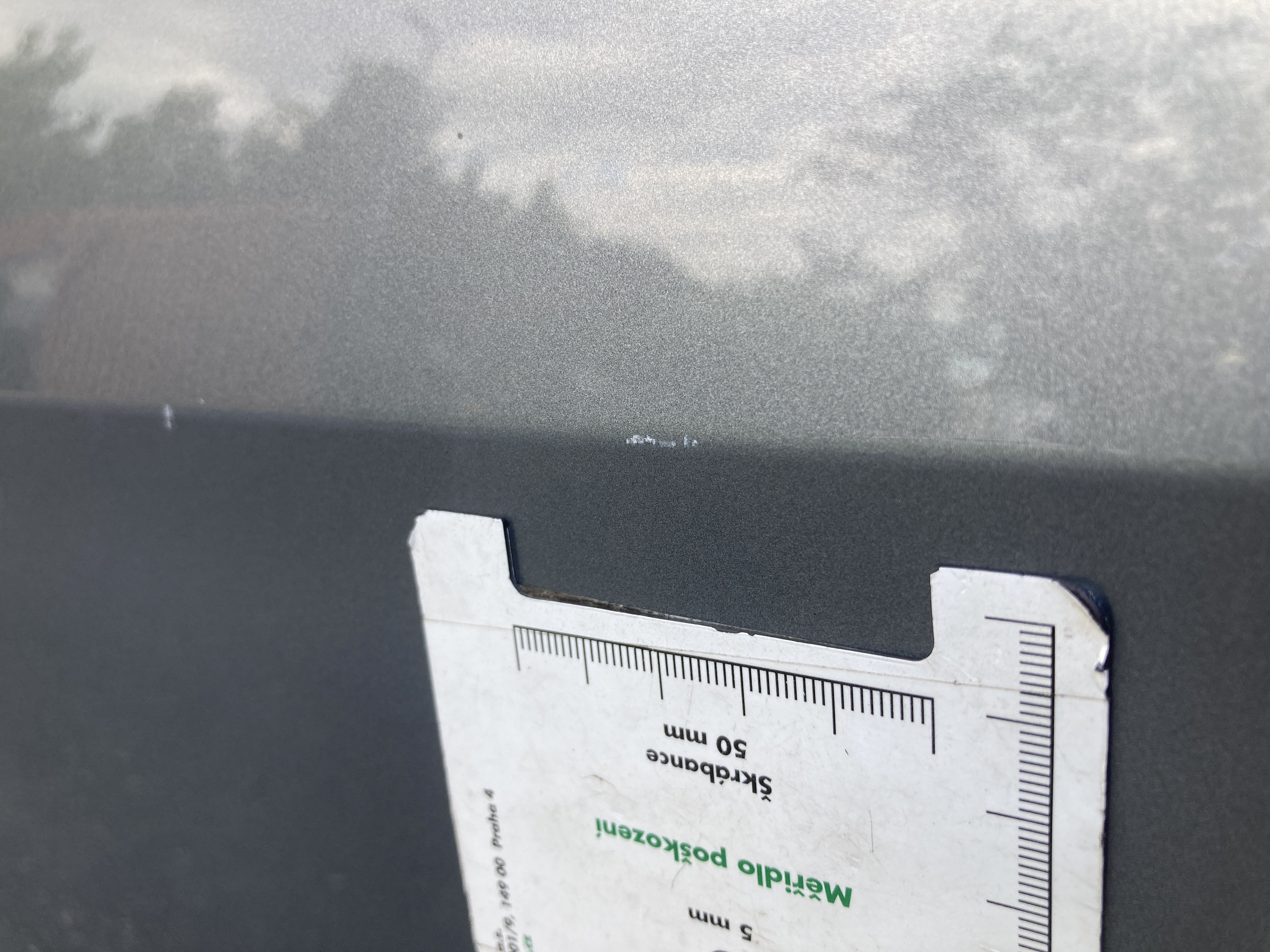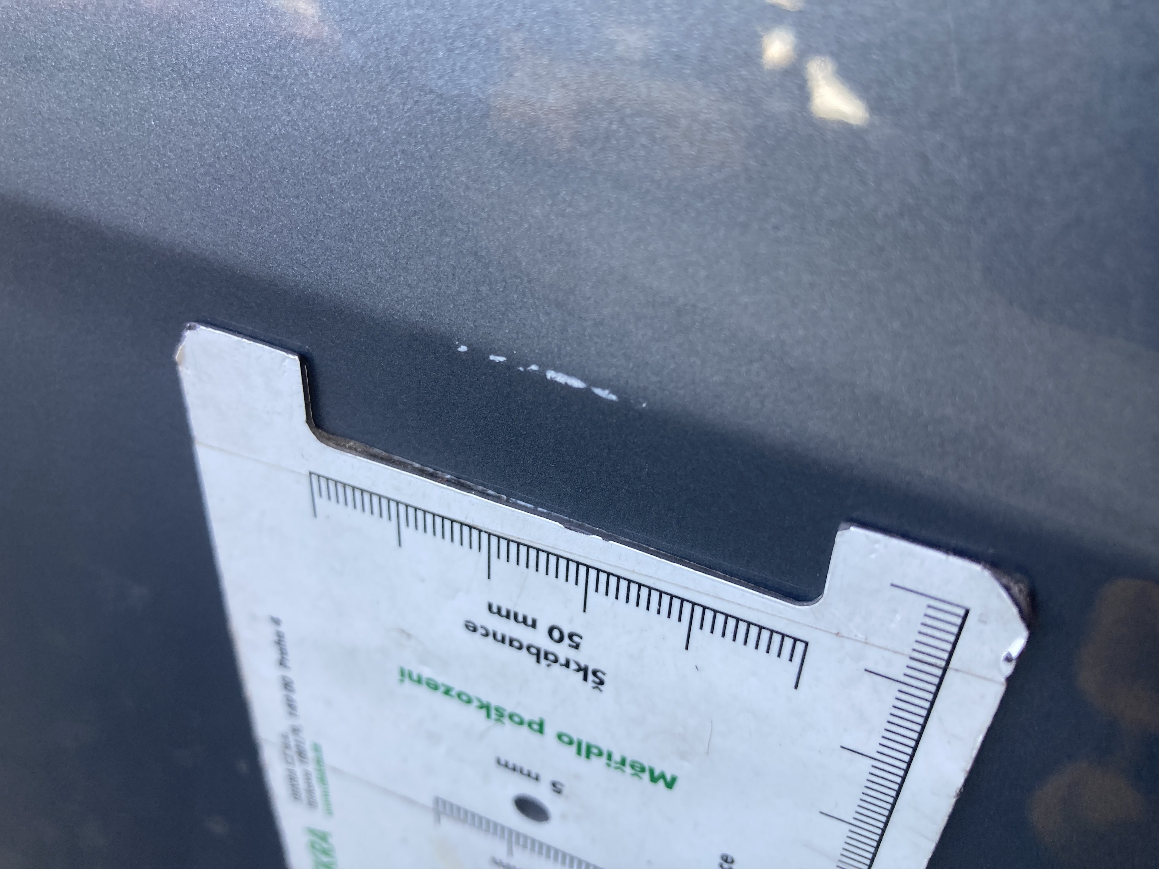 Oděrky a škrábance po obvodu karosérie, přední část karosérie je poškozená od kamínků, odřený přední nárazník, mírně odřené levé přední dveře, mírně odřený zadní nárazník, mírně odřené pravé zadní dveře, odřený kryt pravého zpětného zrcátka, mírně poškozené čelní sklo,
