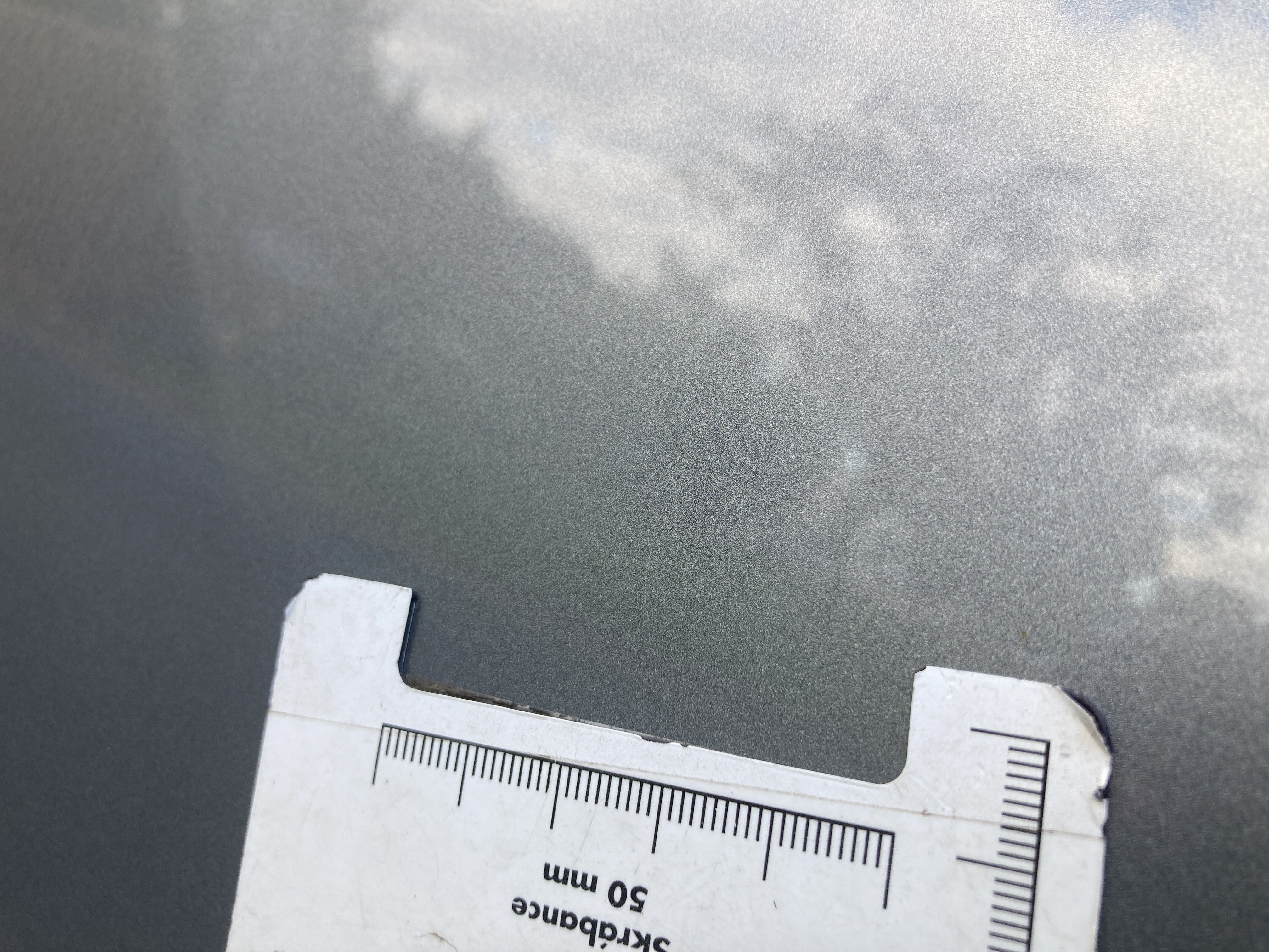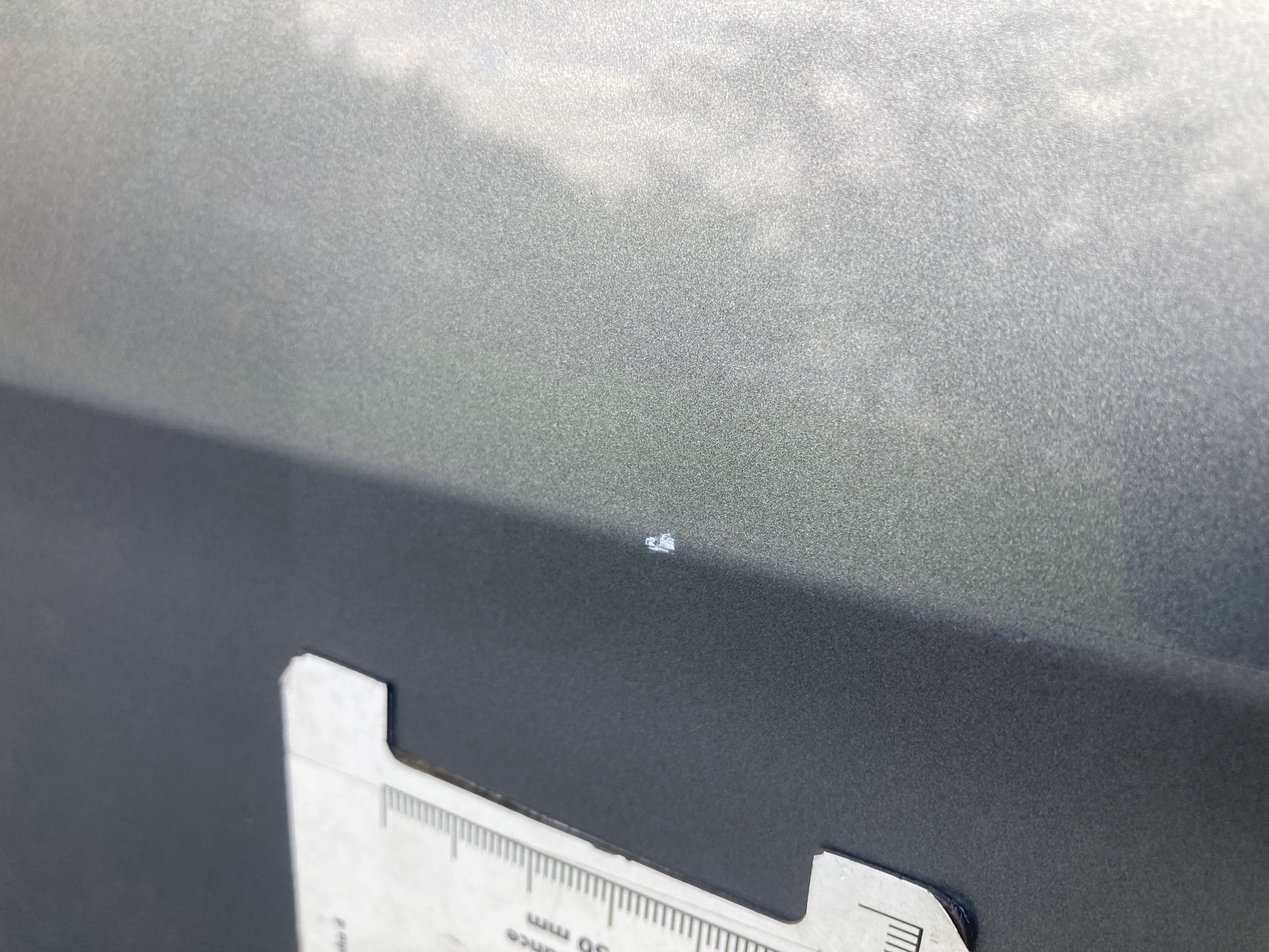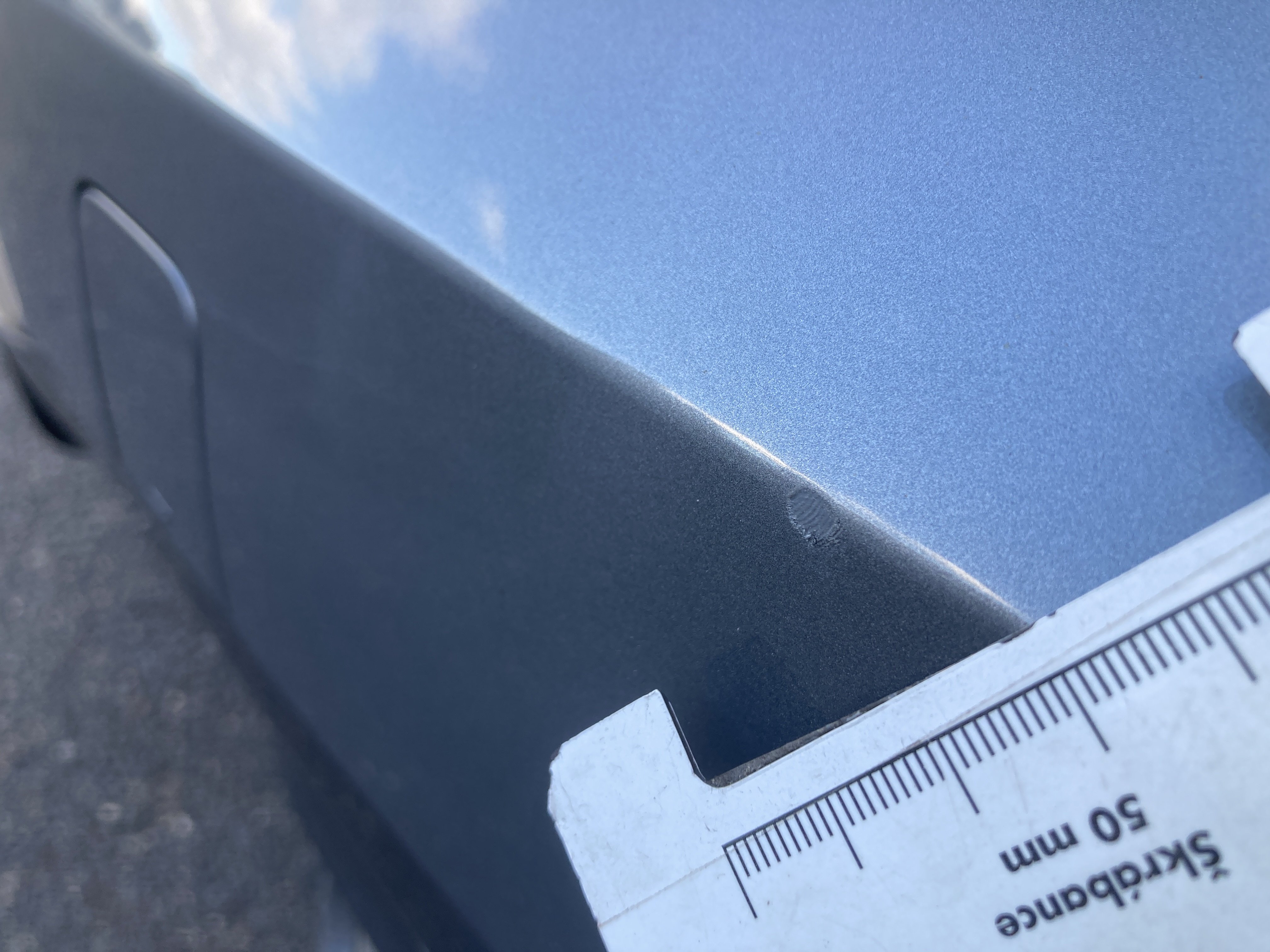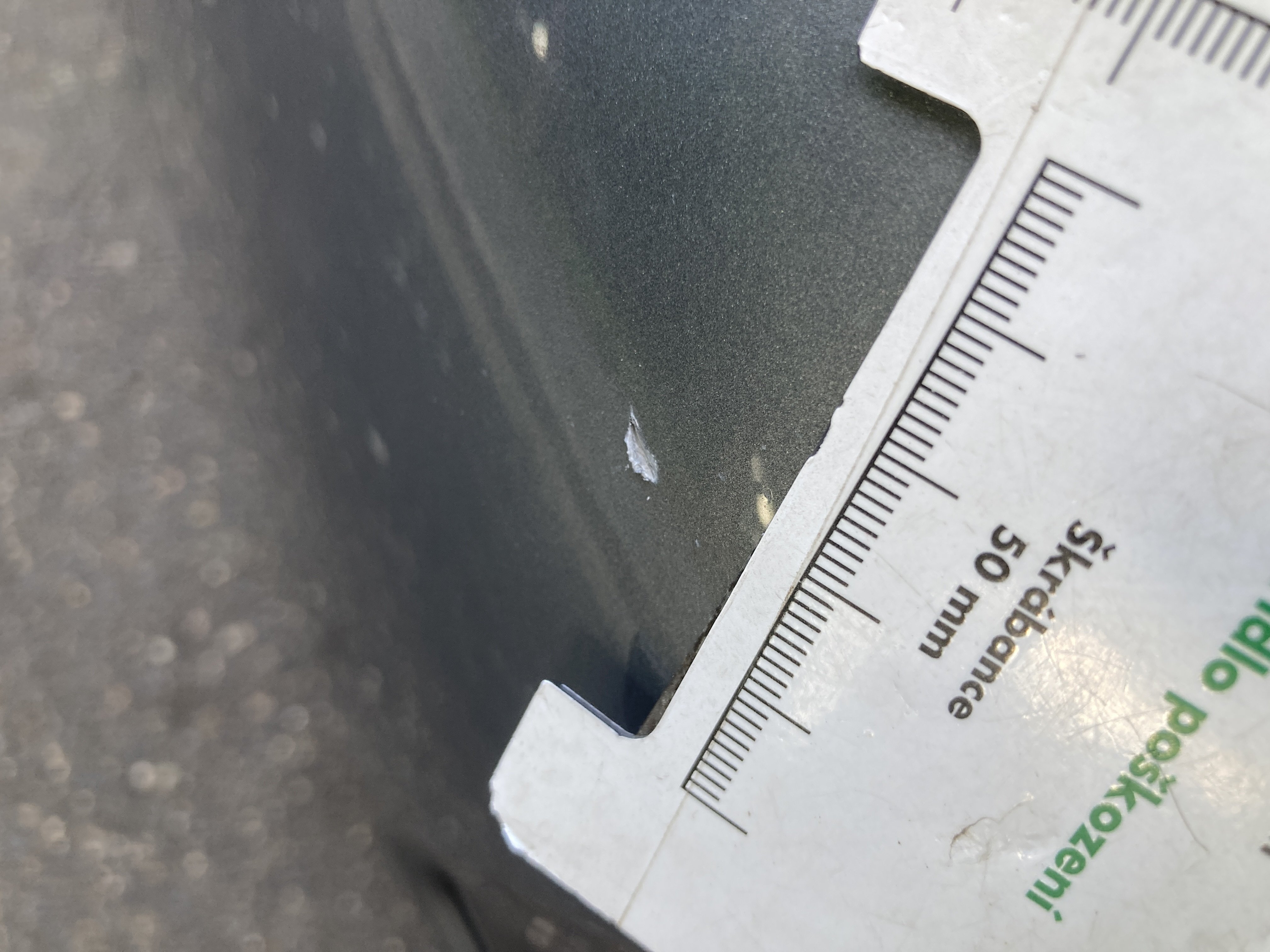 Oděrky a škrábance po obvodu karosérie, přední část karosérie je poškozená od kamínků, odřený přední nárazník, mírně odřené levé přední dveře, mírně odřený zadní nárazník, mírně odřené pravé zadní dveře, odřený kryt pravého zpětného zrcátka, mírně poškozené čelní sklo,