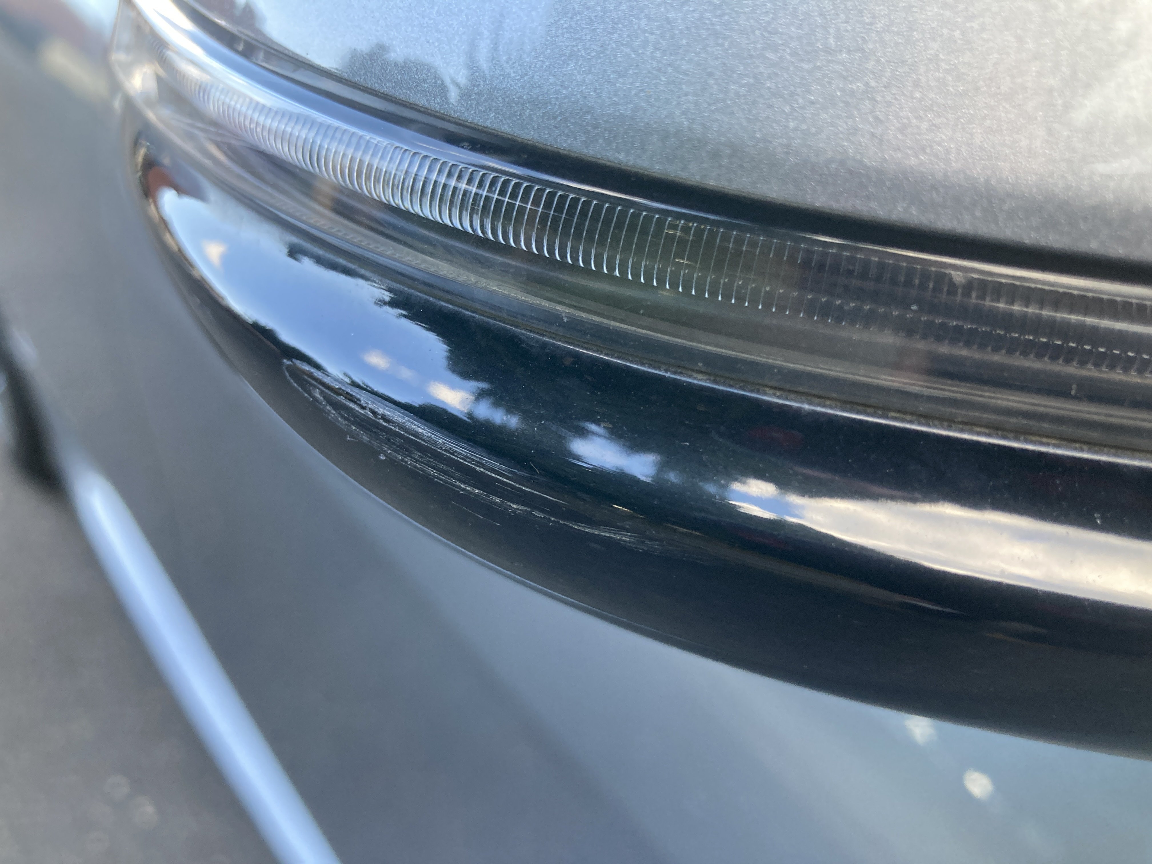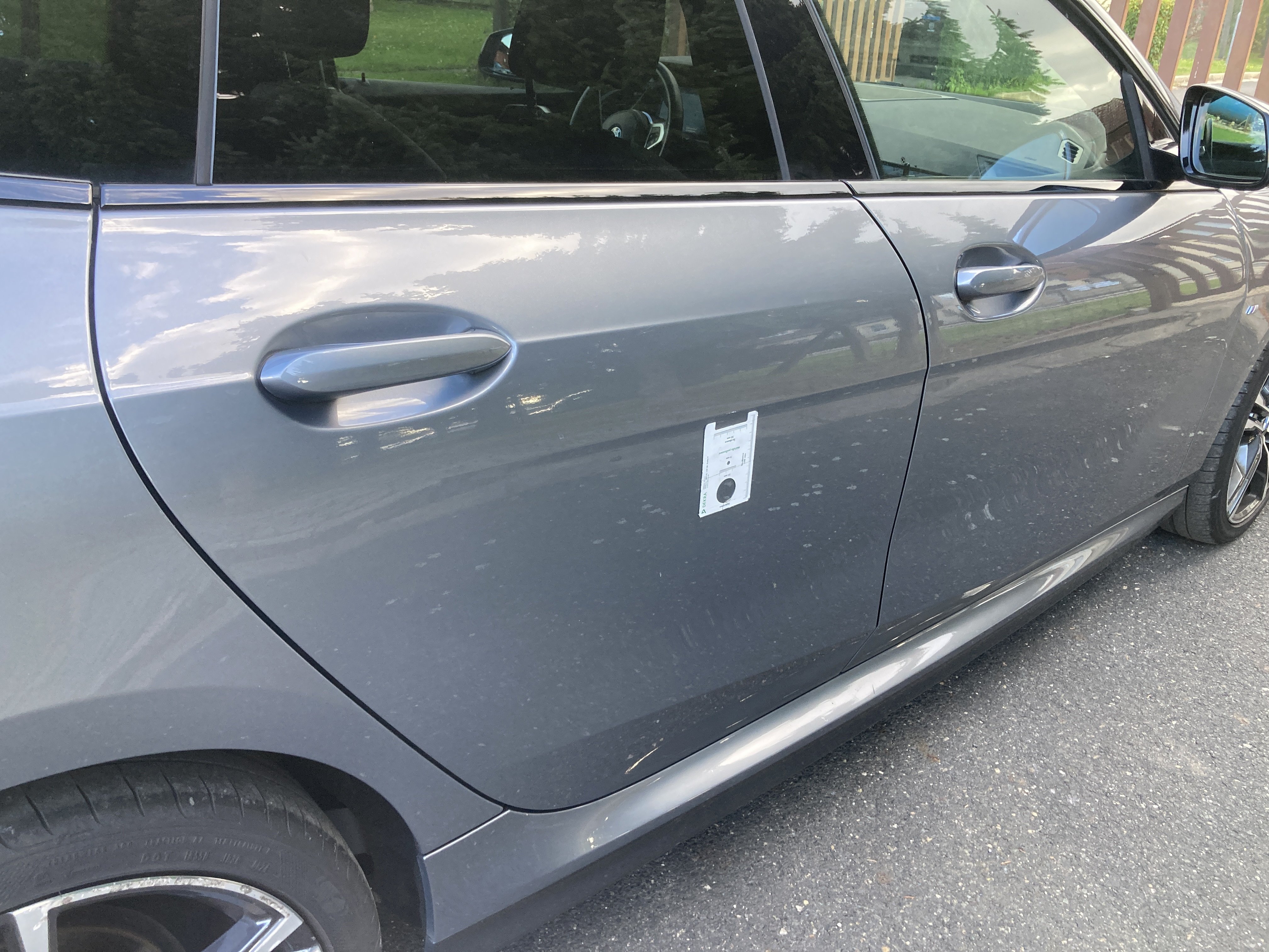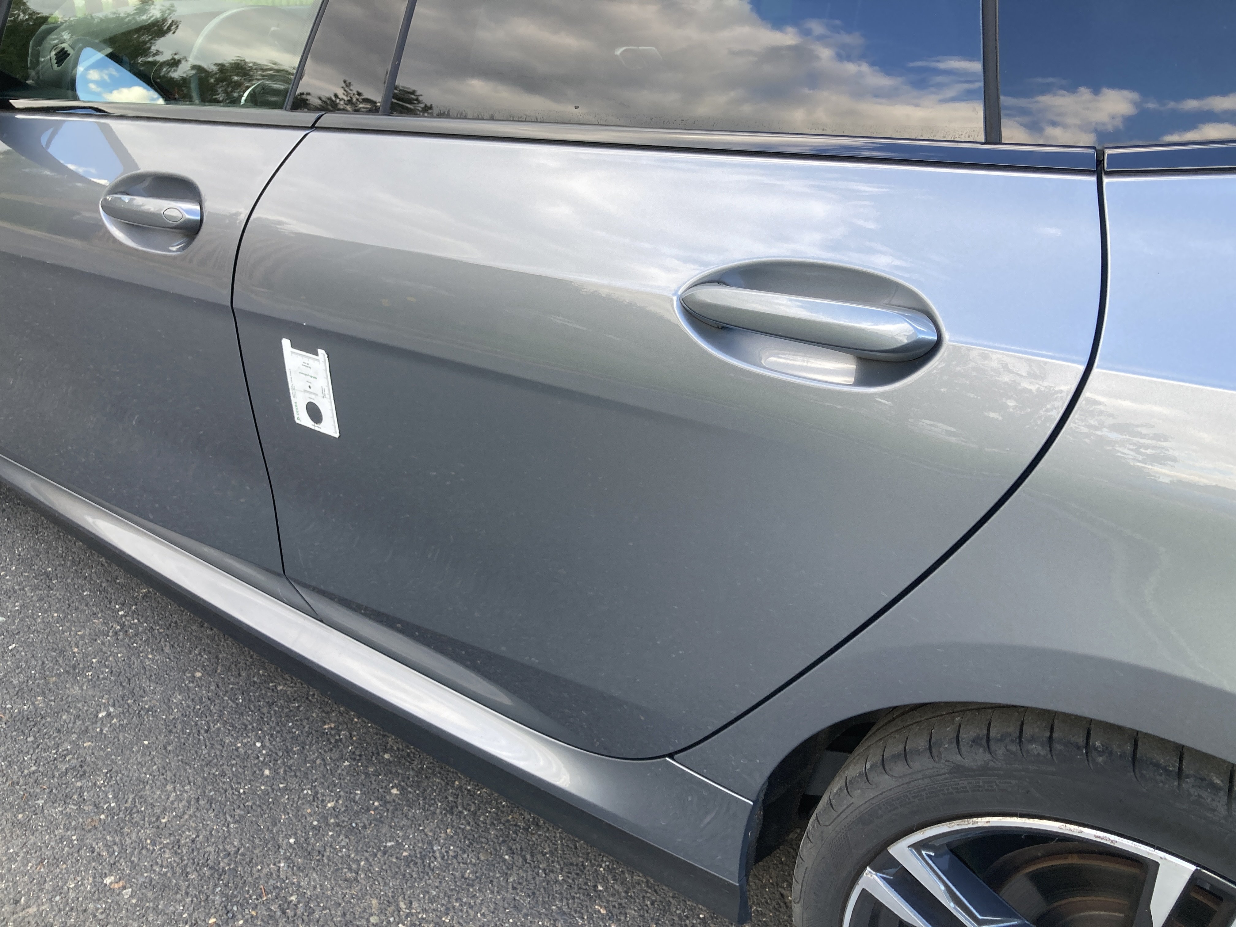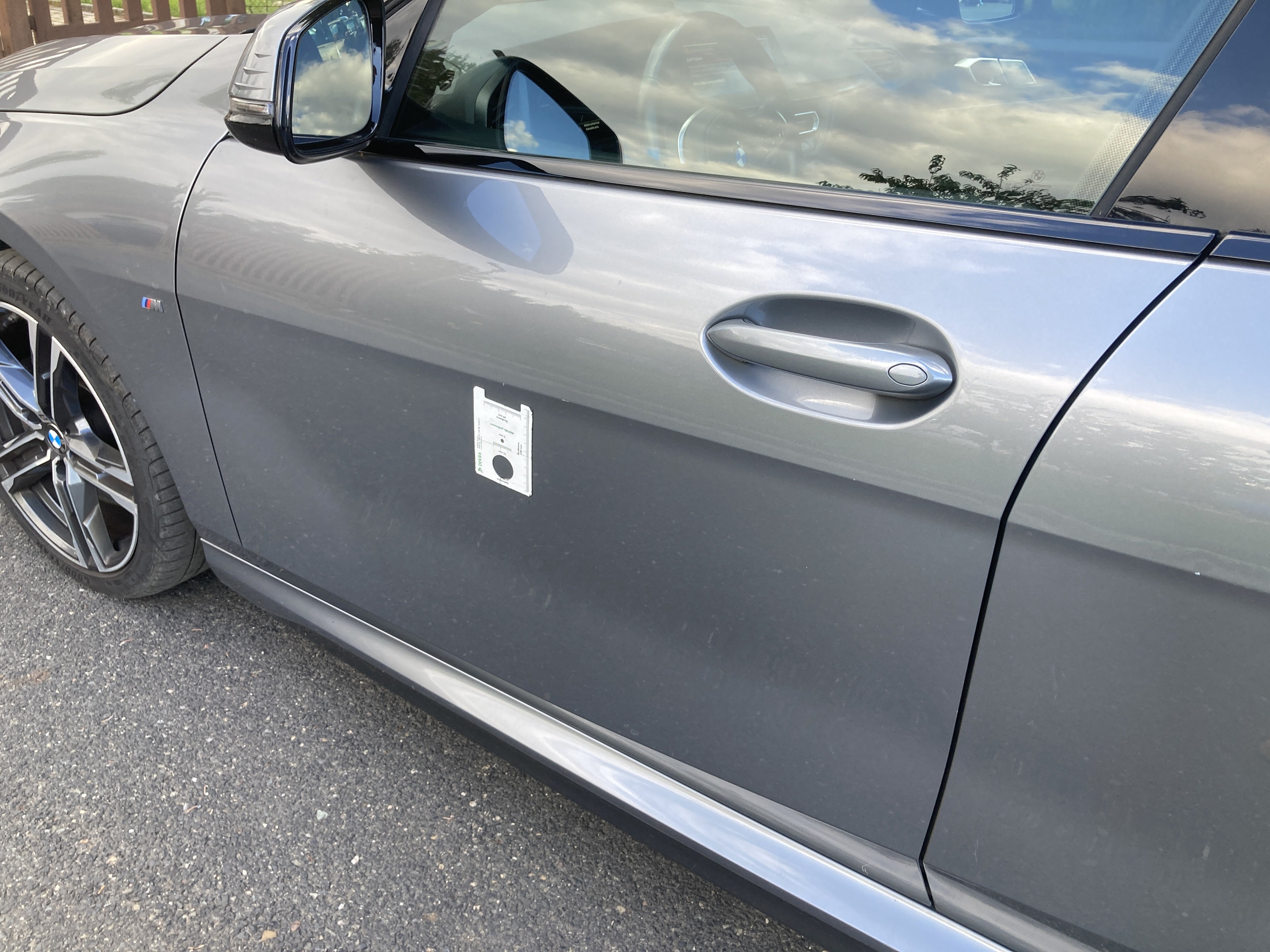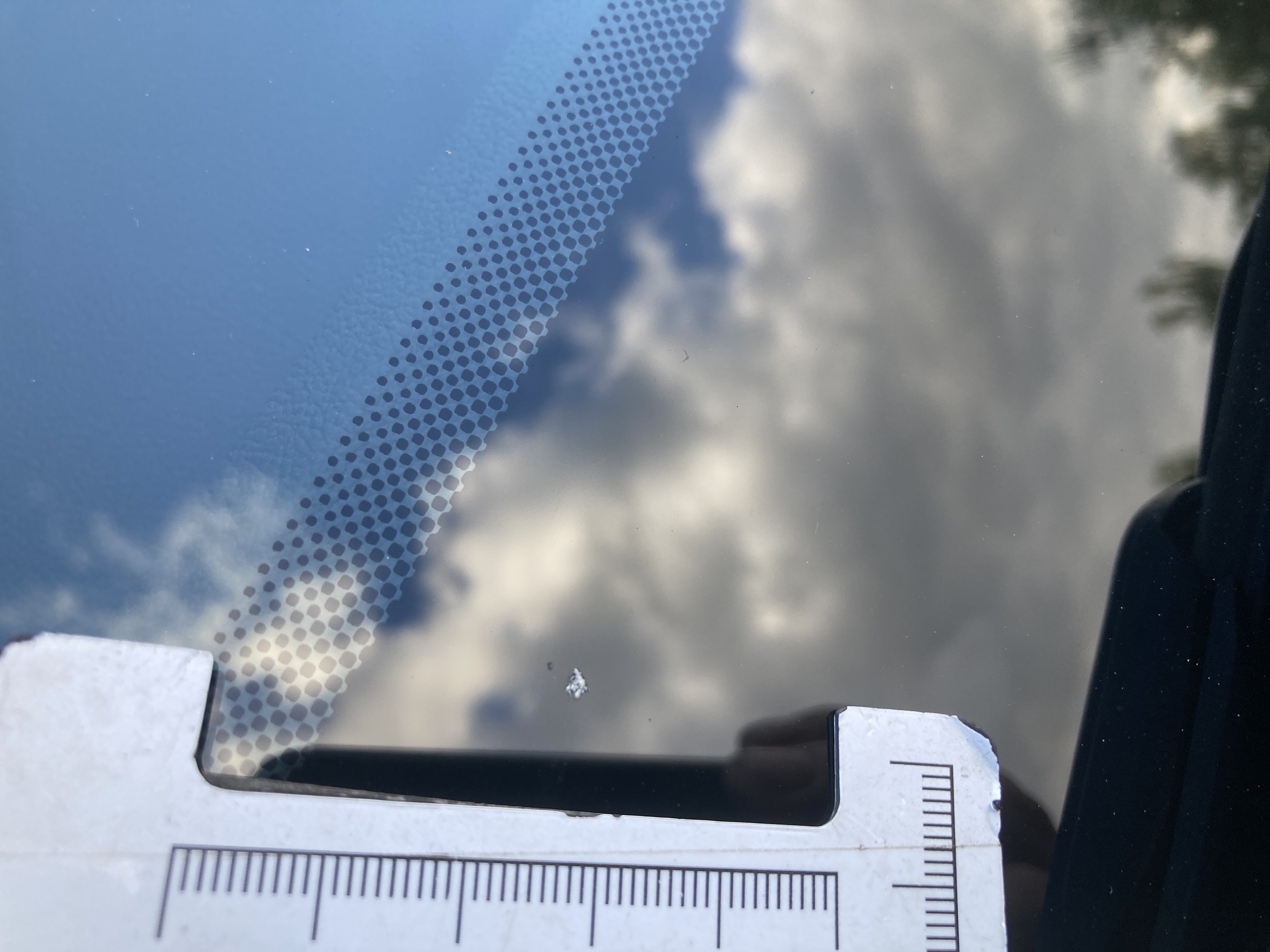 Oděrky a škrábance po obvodu karosérie, přední část karosérie je poškozená od kamínků, odřený přední nárazník, mírně odřené levé přední dveře, mírně odřený zadní nárazník, mírně odřené pravé zadní dveře, odřený kryt pravého zpětného zrcátka, mírně poškozené čelní sklo,