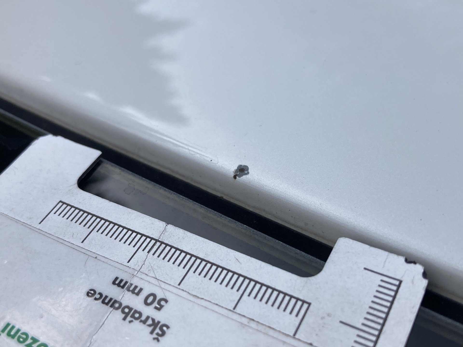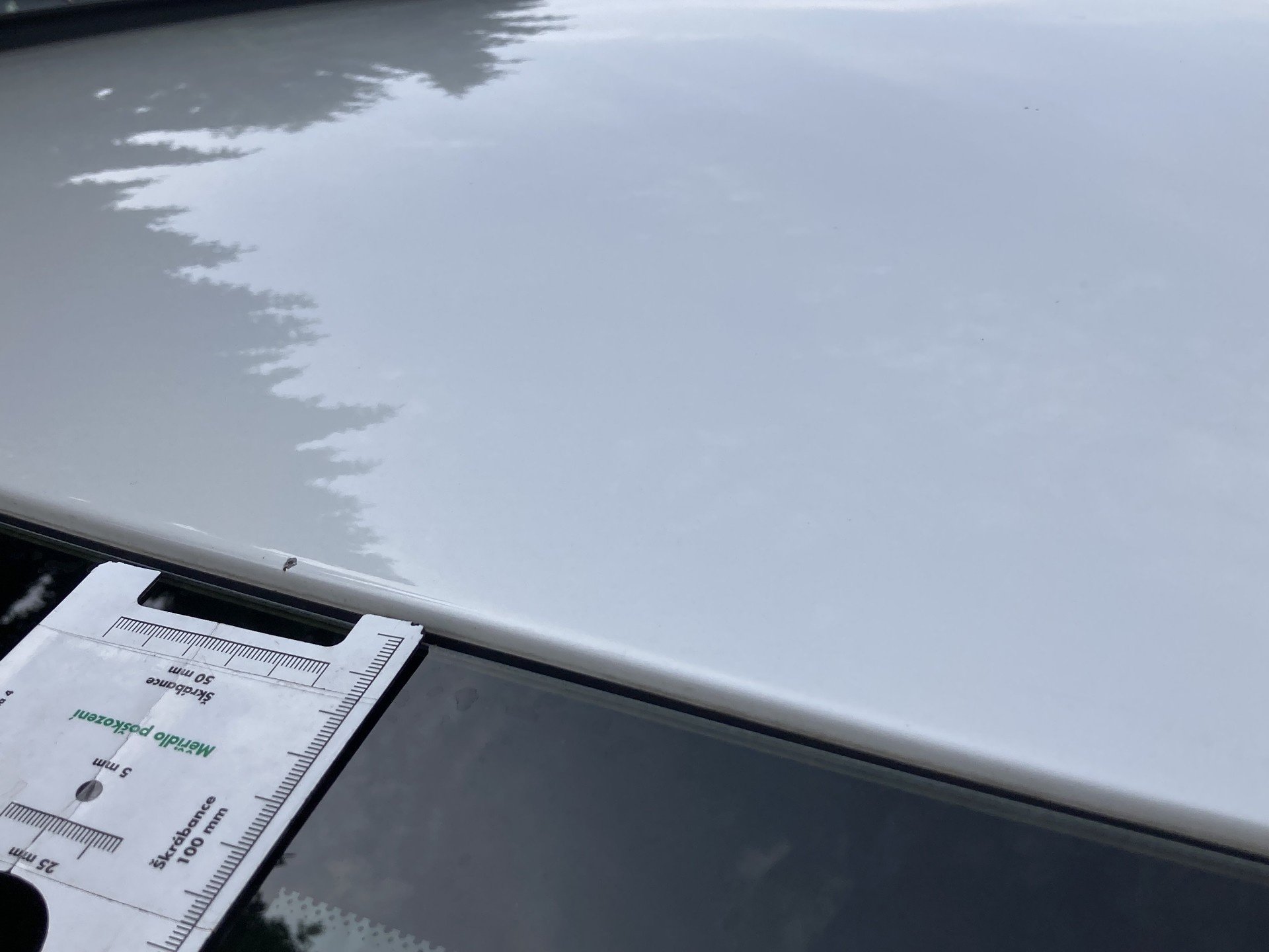Oděrky a škrábance po obvodu karosérie, přední část karosérie je poškozená od kamínků, poškozená hluková izolace víka motorového prostoru, odřený kryt levého zpětného zrcátka, odřený zadní nárazník, interiér vozidla opotřeben, odřený přední nárazník ve spodní části, deformace plata střechy,