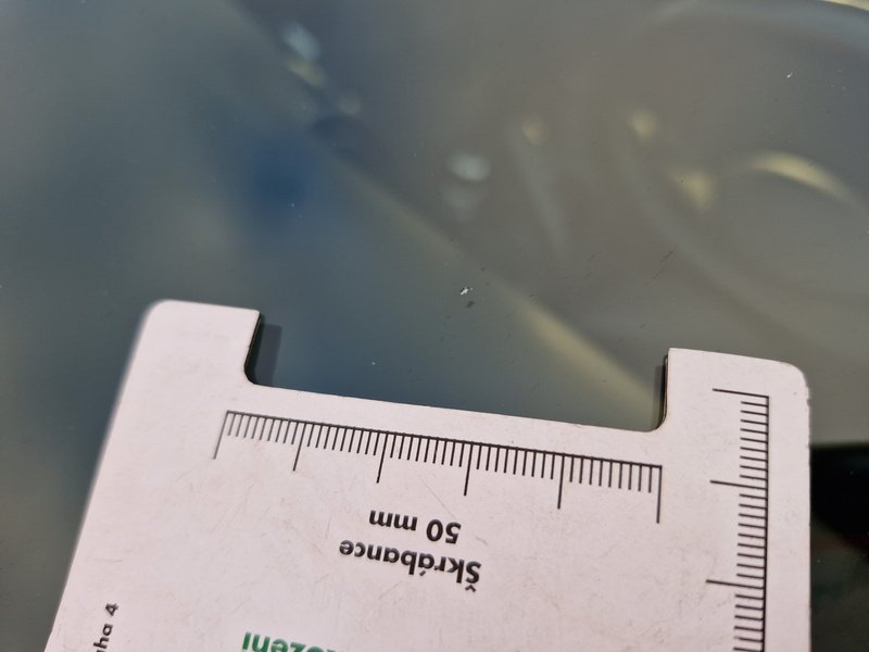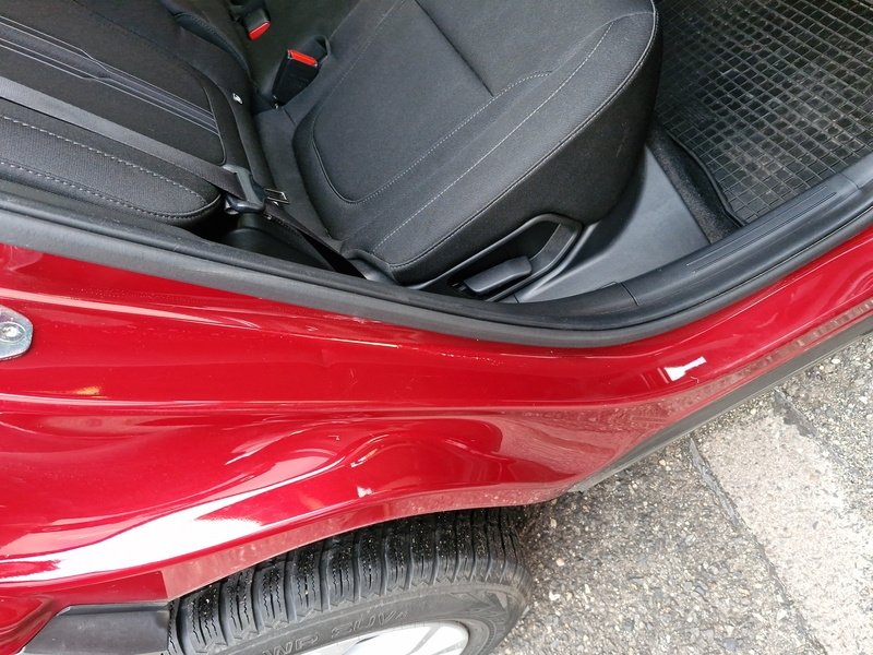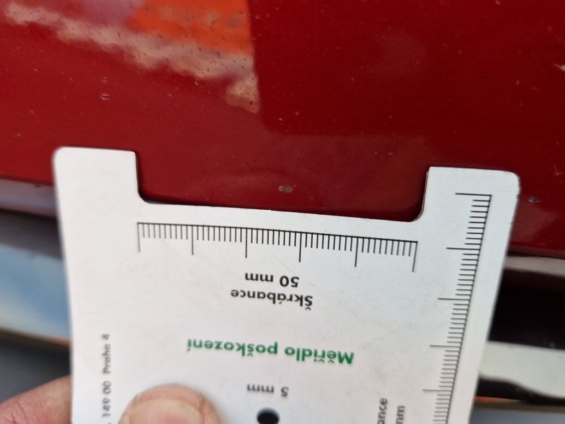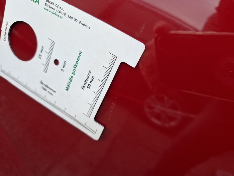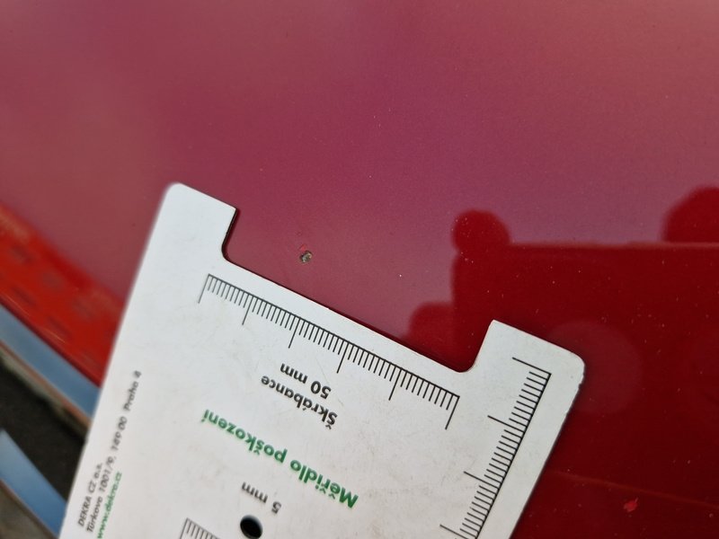Oděrky a škrábance po obvodu karosérie, přední část karosérie je poškozená od kamínků, odřené pravé zadní dveře, mírně promáčklé víko motorvého prostoru - jamka, interiér vozidla opotřeben,