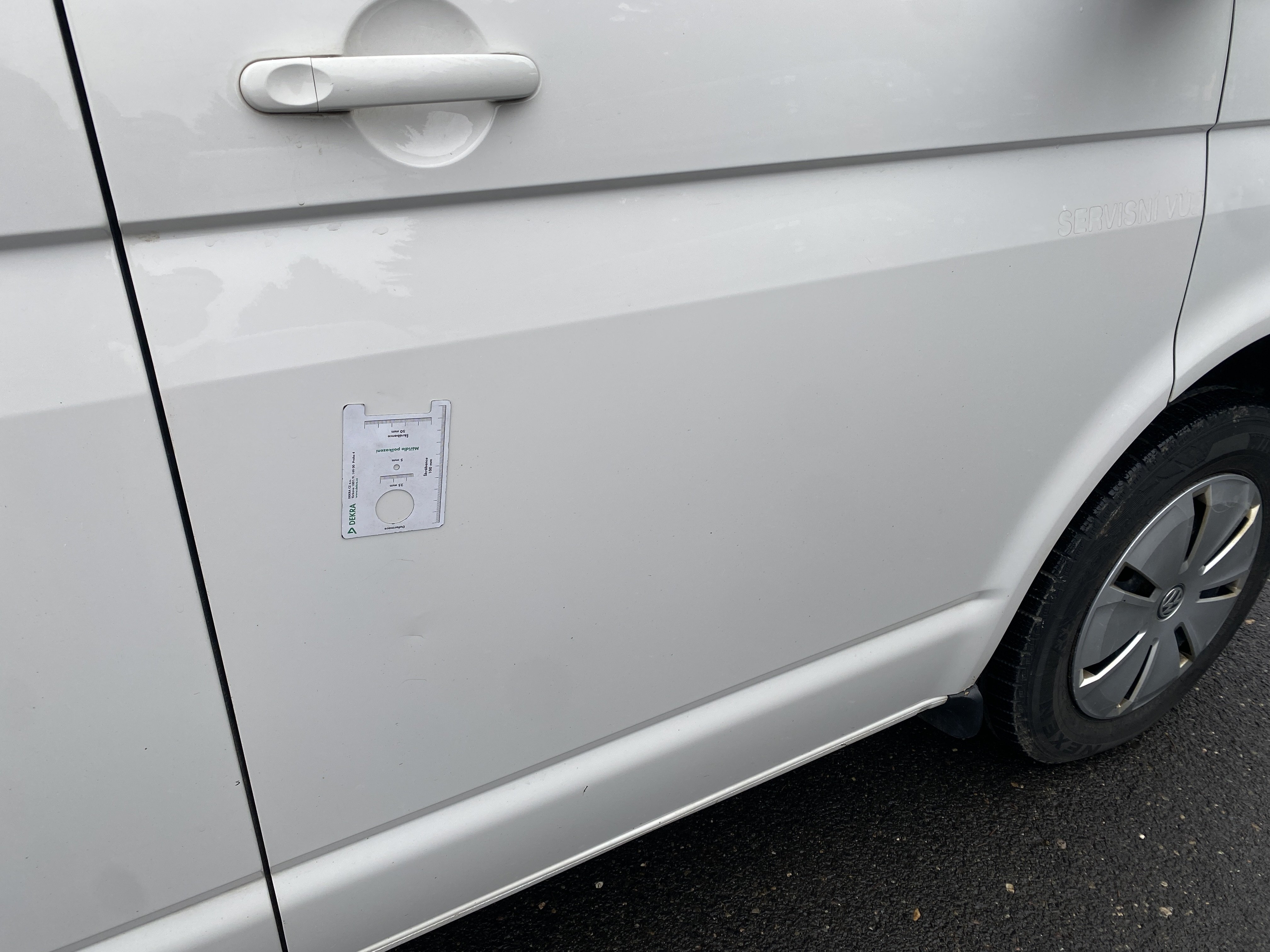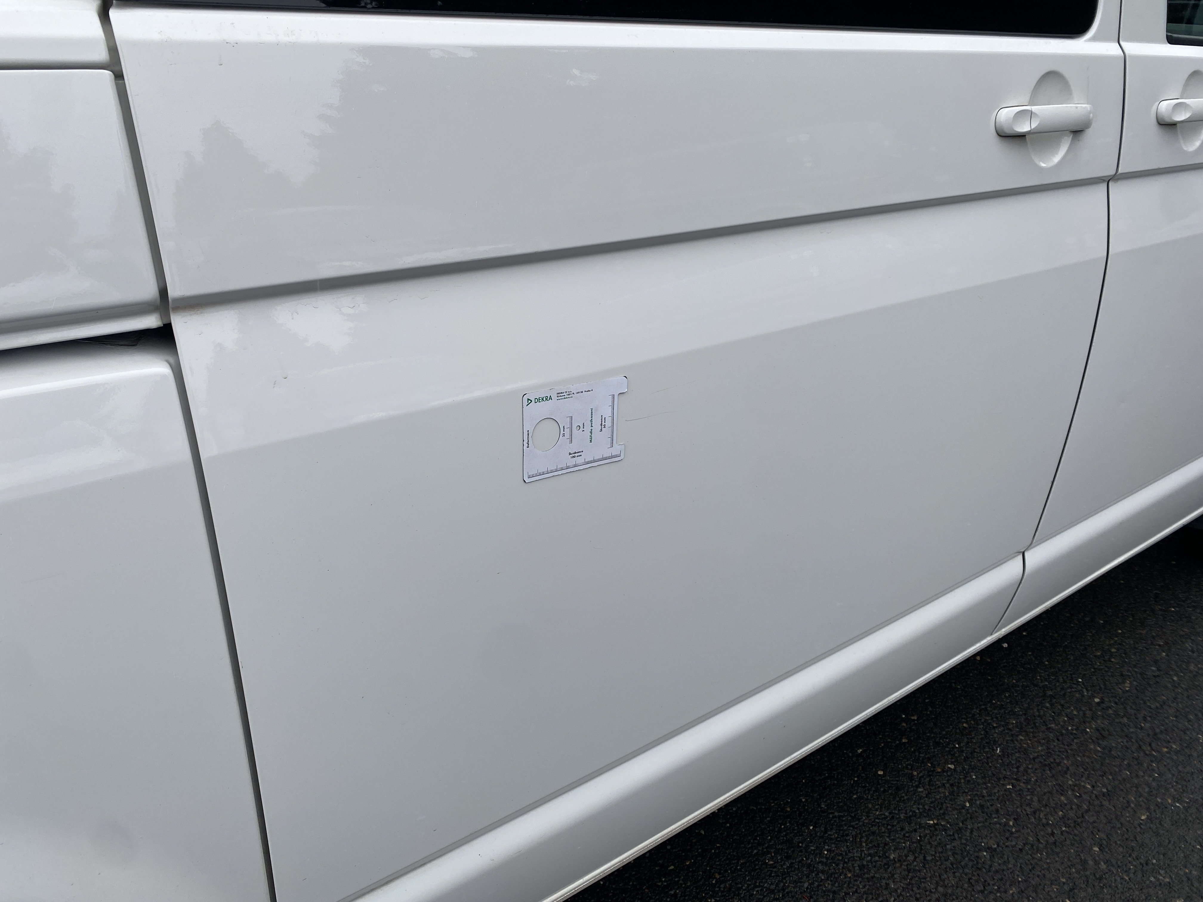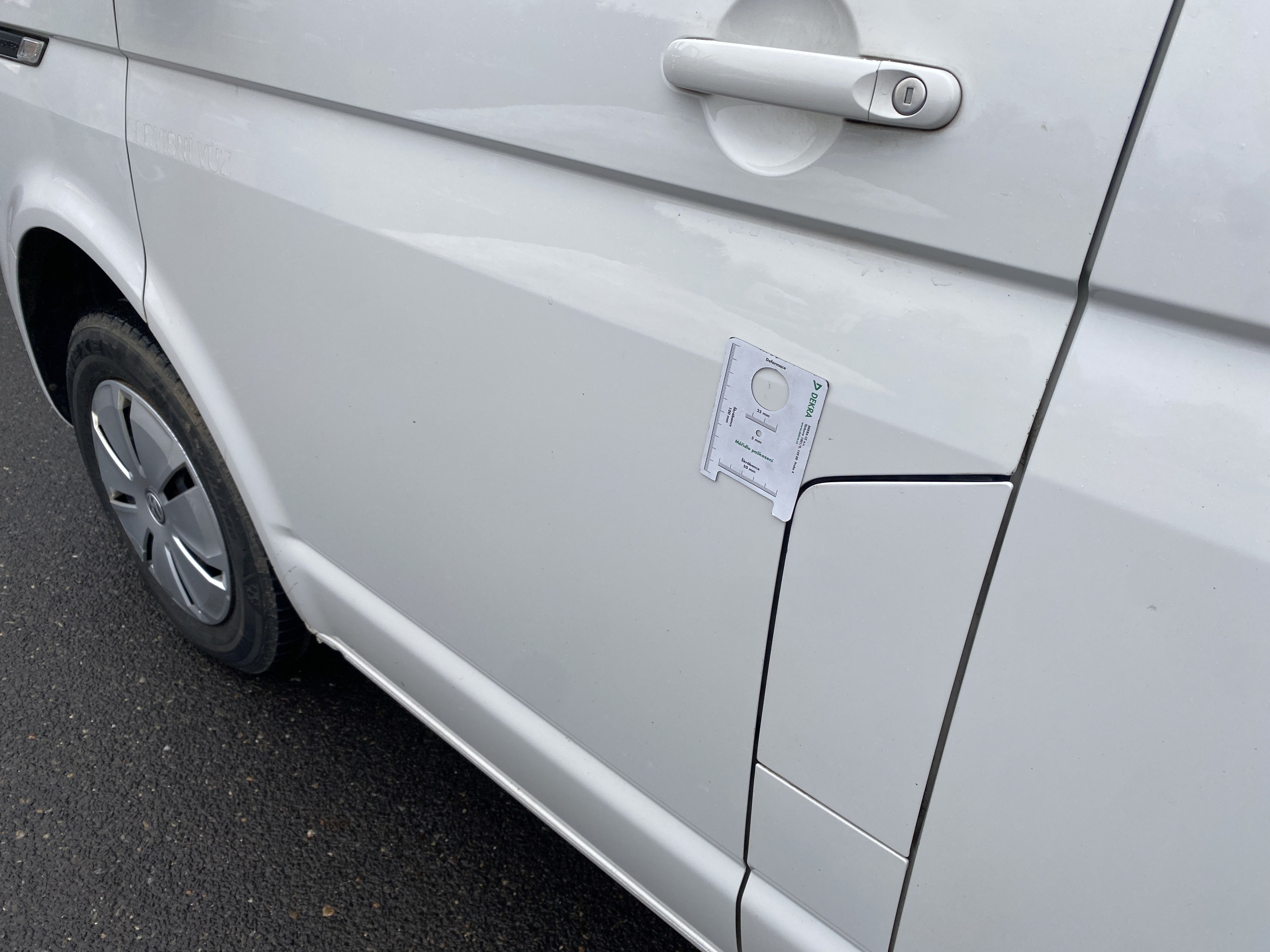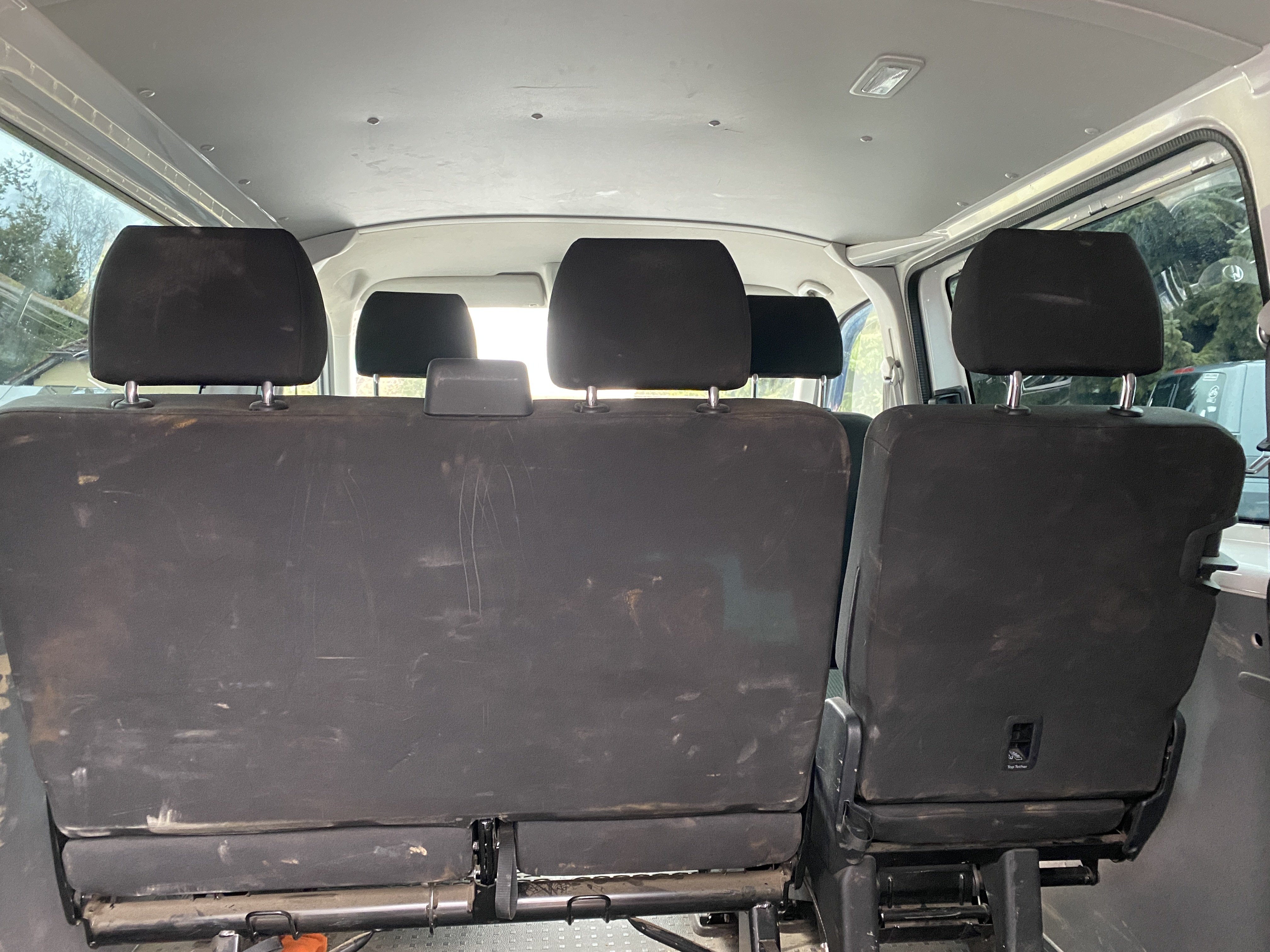 Oděrky a škrábance po obvodu karosérie, přední část karosérie je poškozená od kamínků, odřený přední nárazník, poškozené čelní sklo, mírně odřené levé přední dveře, odřený kryt levého zpětného zrcátka, promáčklý levý zadní blatník, promáčklý levý práh, odřený zadní nárazník, odřené zadní dveře nákladového prostoru, odřené pravé zadní světlo, odřené pravé posuvné dveře, odřené a mírně promáčklé pravé přední dveře - jamka, poškozen středový výdech ventilace, interiér vozidla opotřeben,