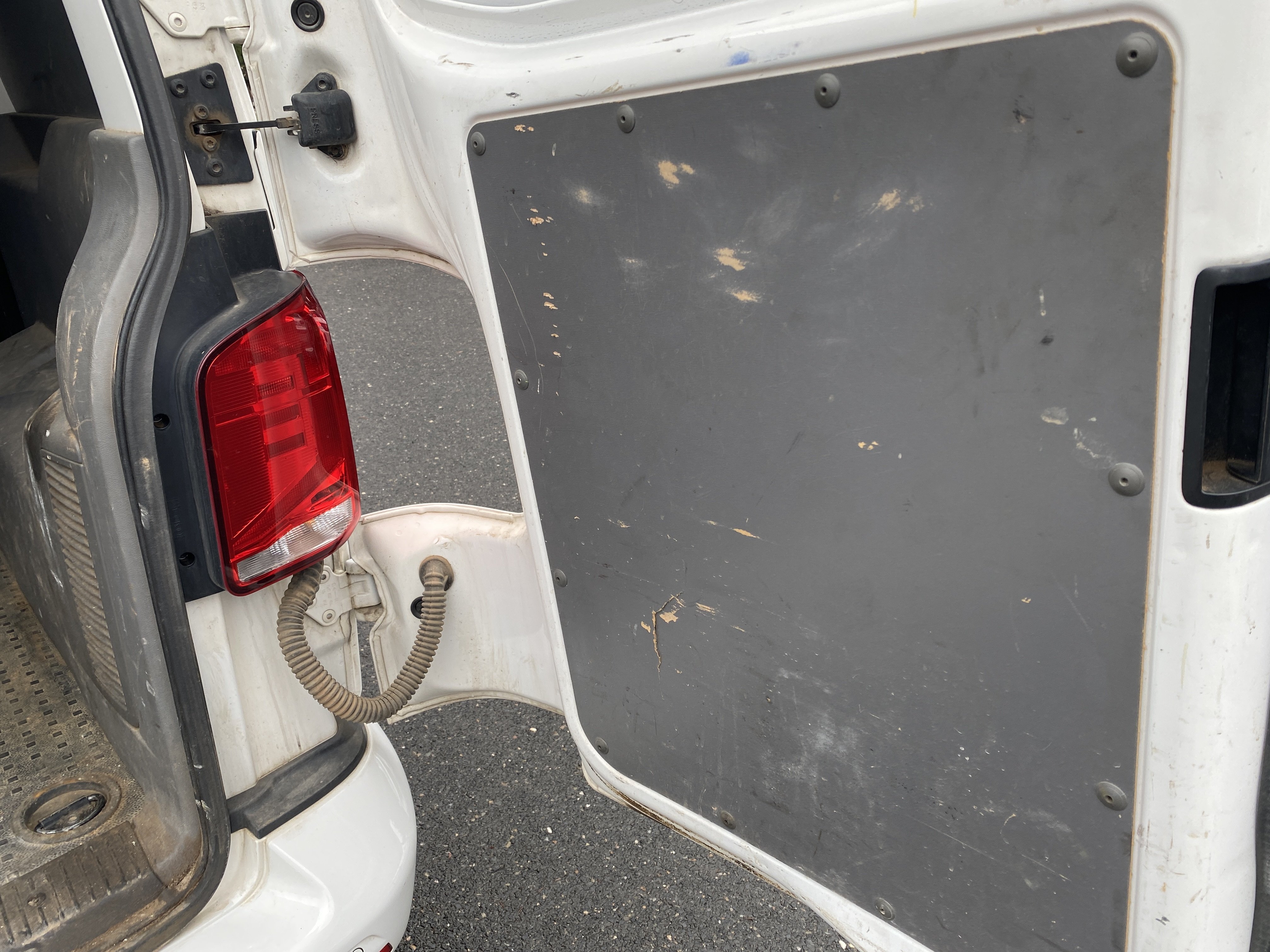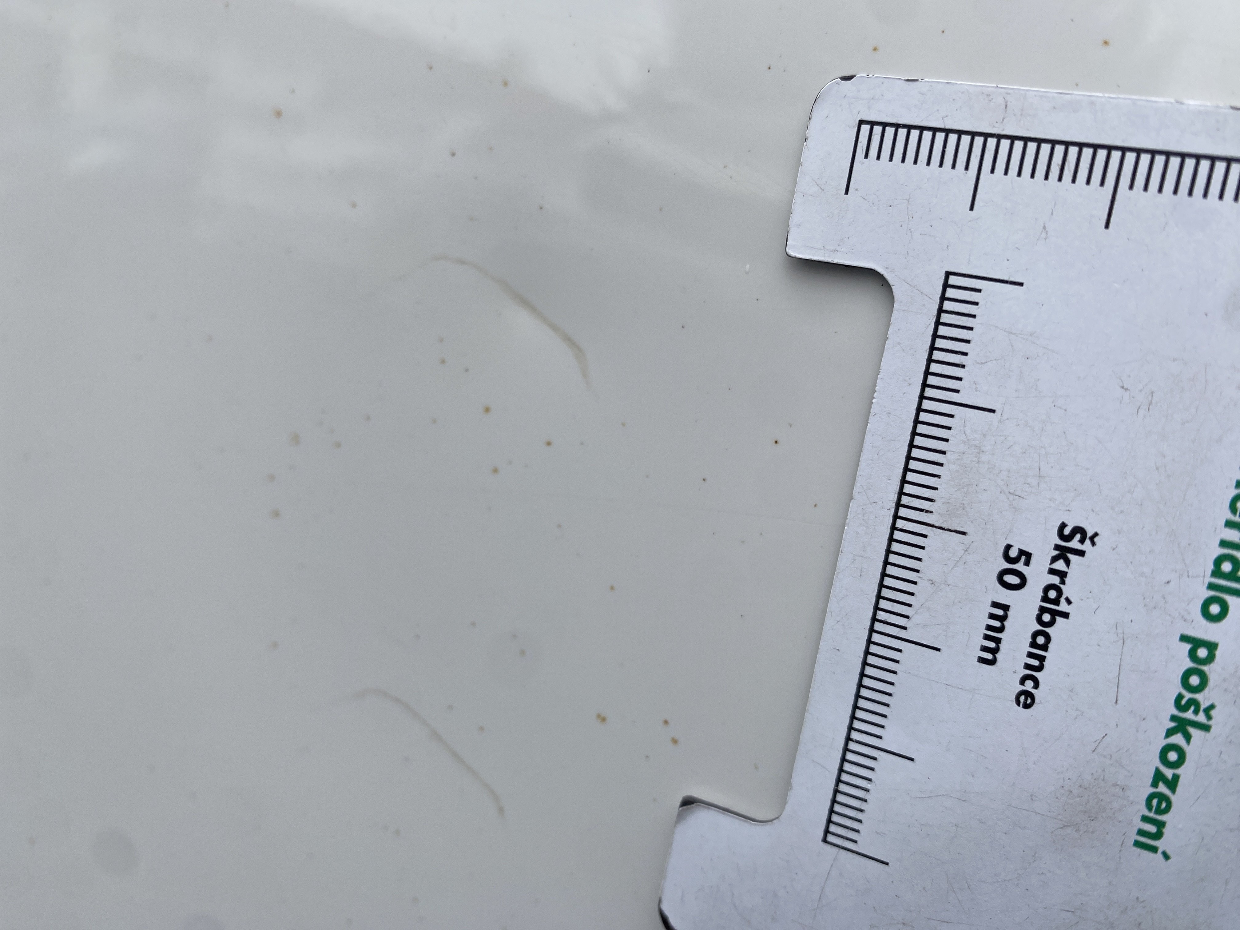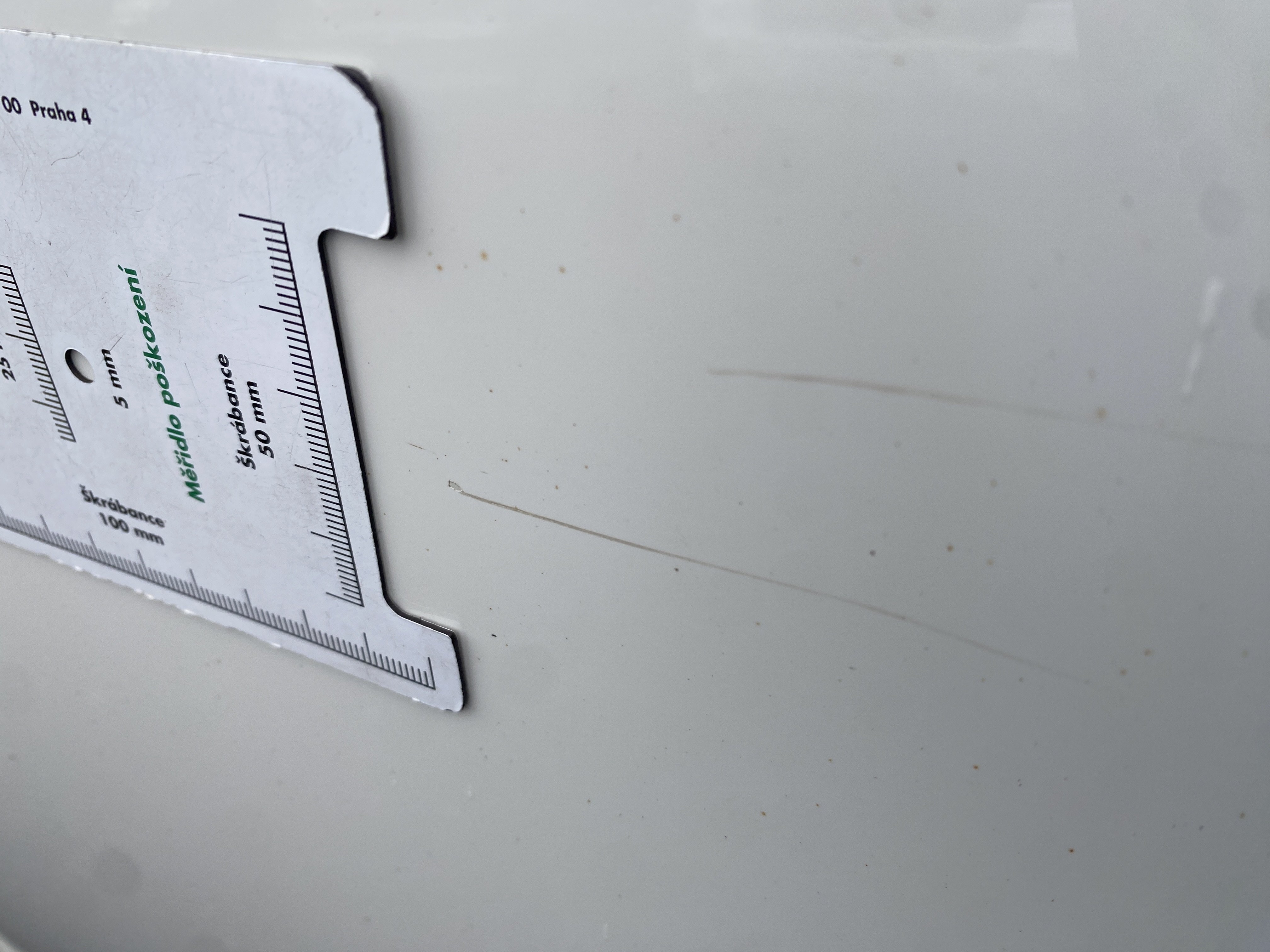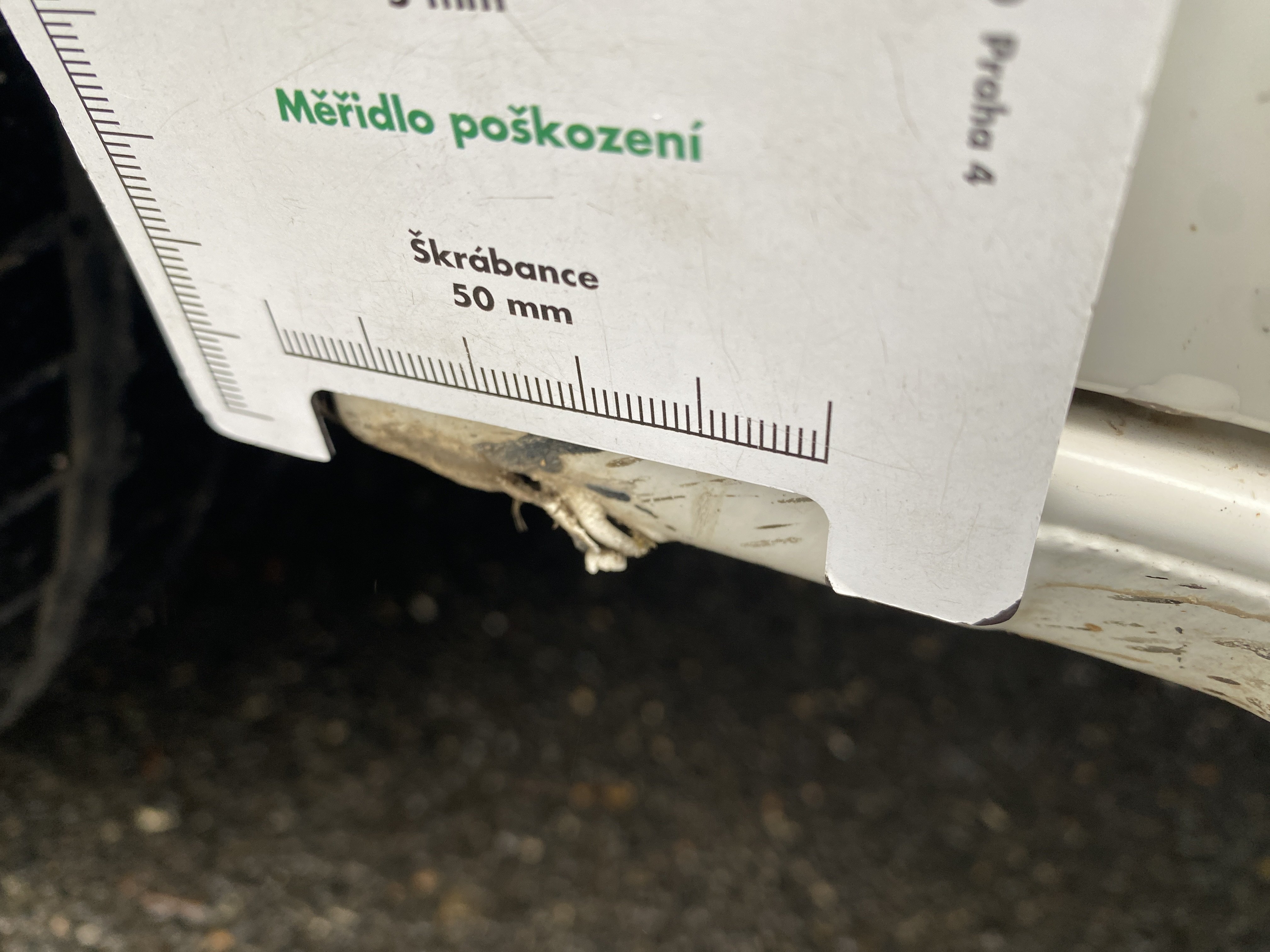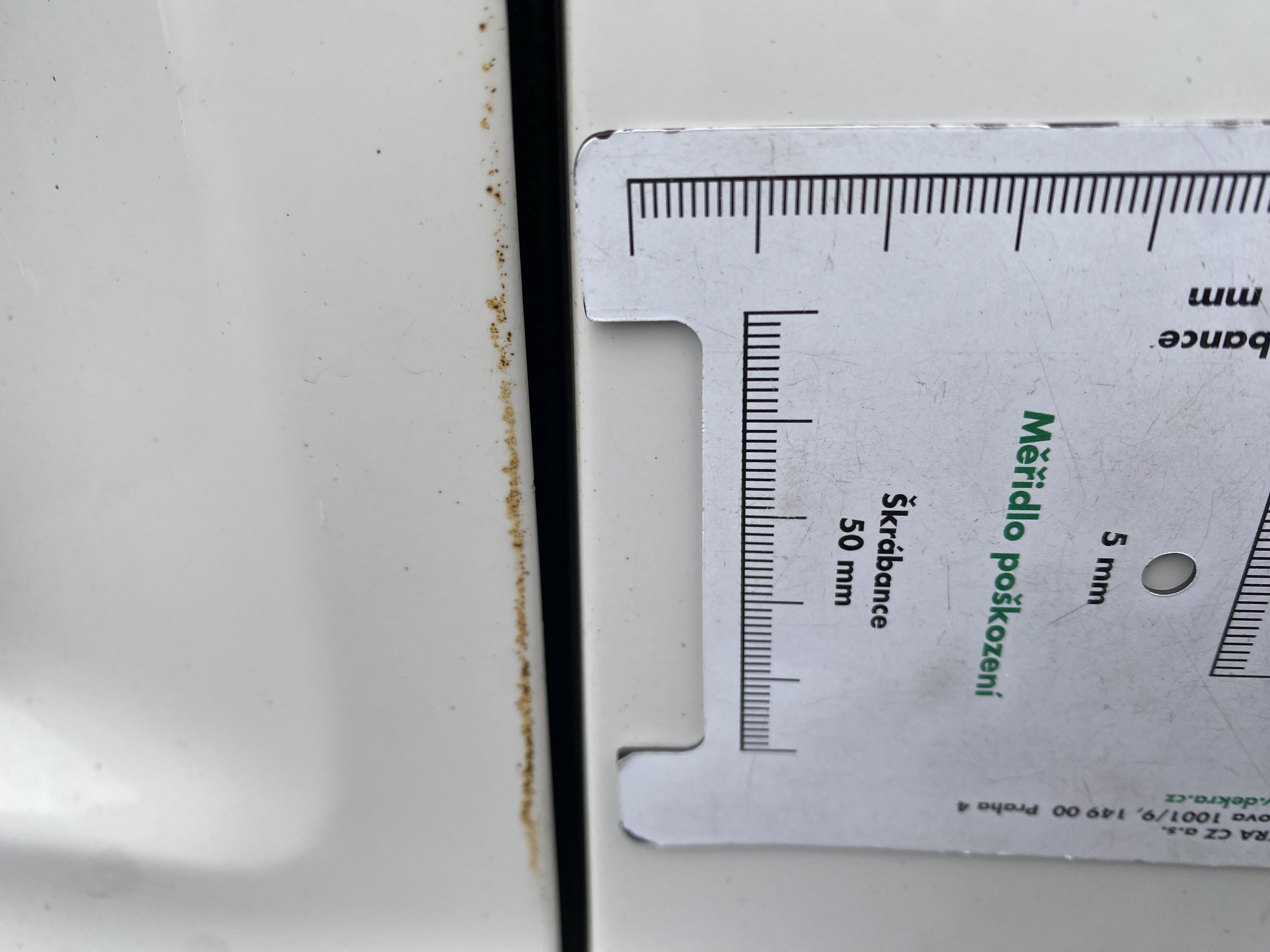 Oděrky a škrábance po obvodu karosérie, přední část karosérie je poškozená od kamínků, odřený přední nárazník, poškozené čelní sklo, mírně odřené levé přední dveře, odřený kryt levého zpětného zrcátka, promáčklý levý zadní blatník, promáčklý levý práh, odřený zadní nárazník, odřené zadní dveře nákladového prostoru, odřené pravé zadní světlo, odřené pravé posuvné dveře, odřené a mírně promáčklé pravé přední dveře - jamka, poškozen středový výdech ventilace, interiér vozidla opotřeben,