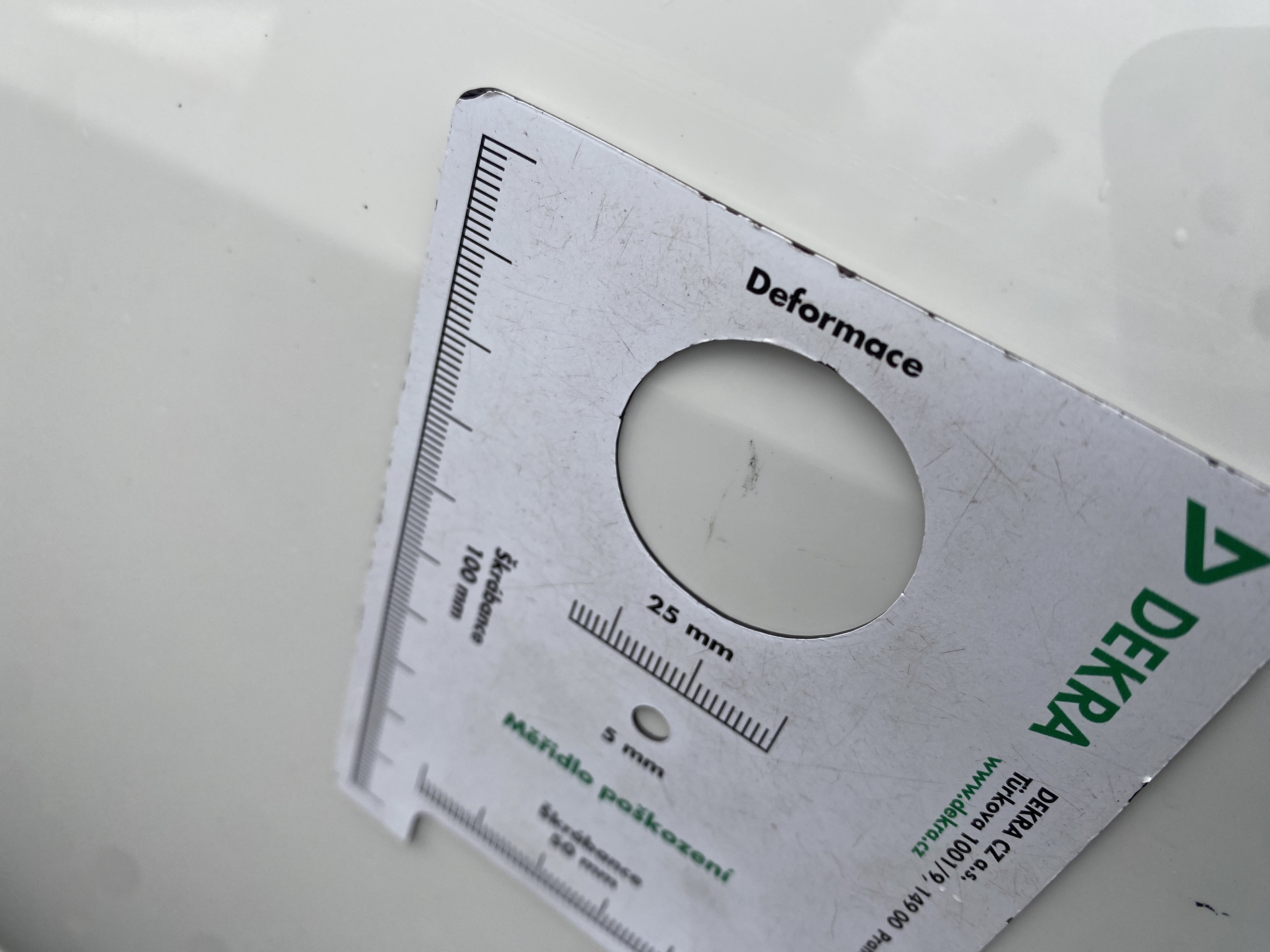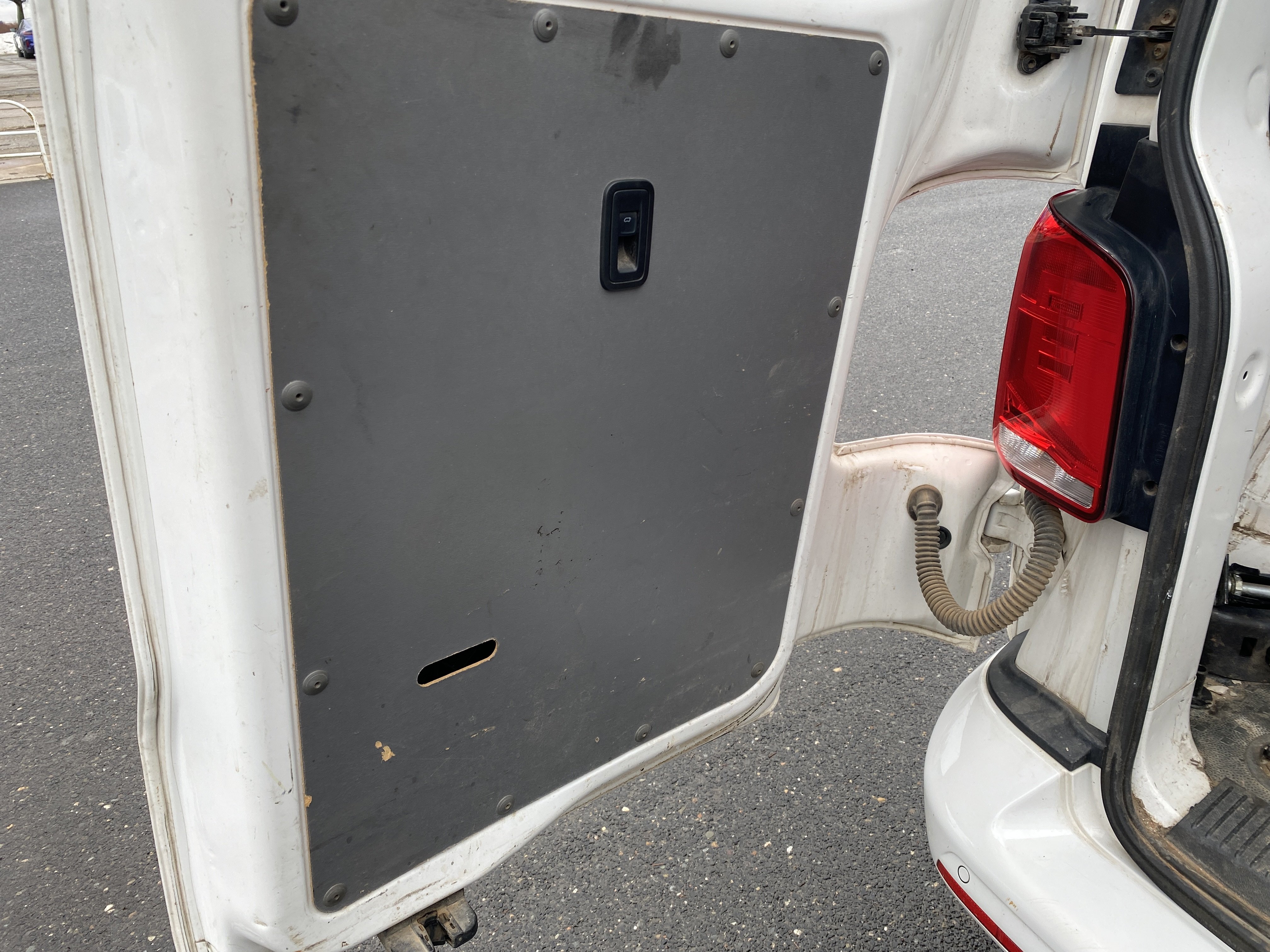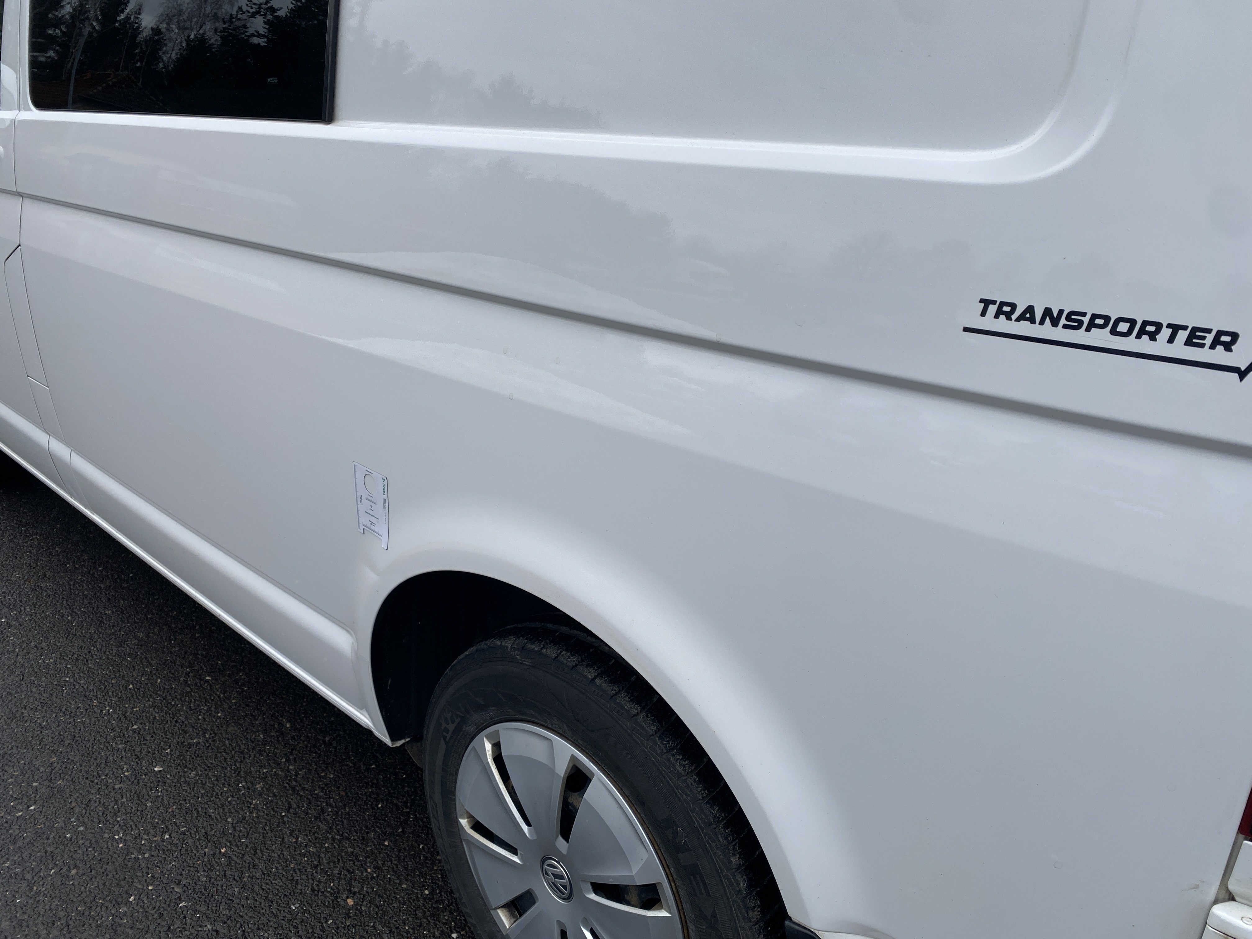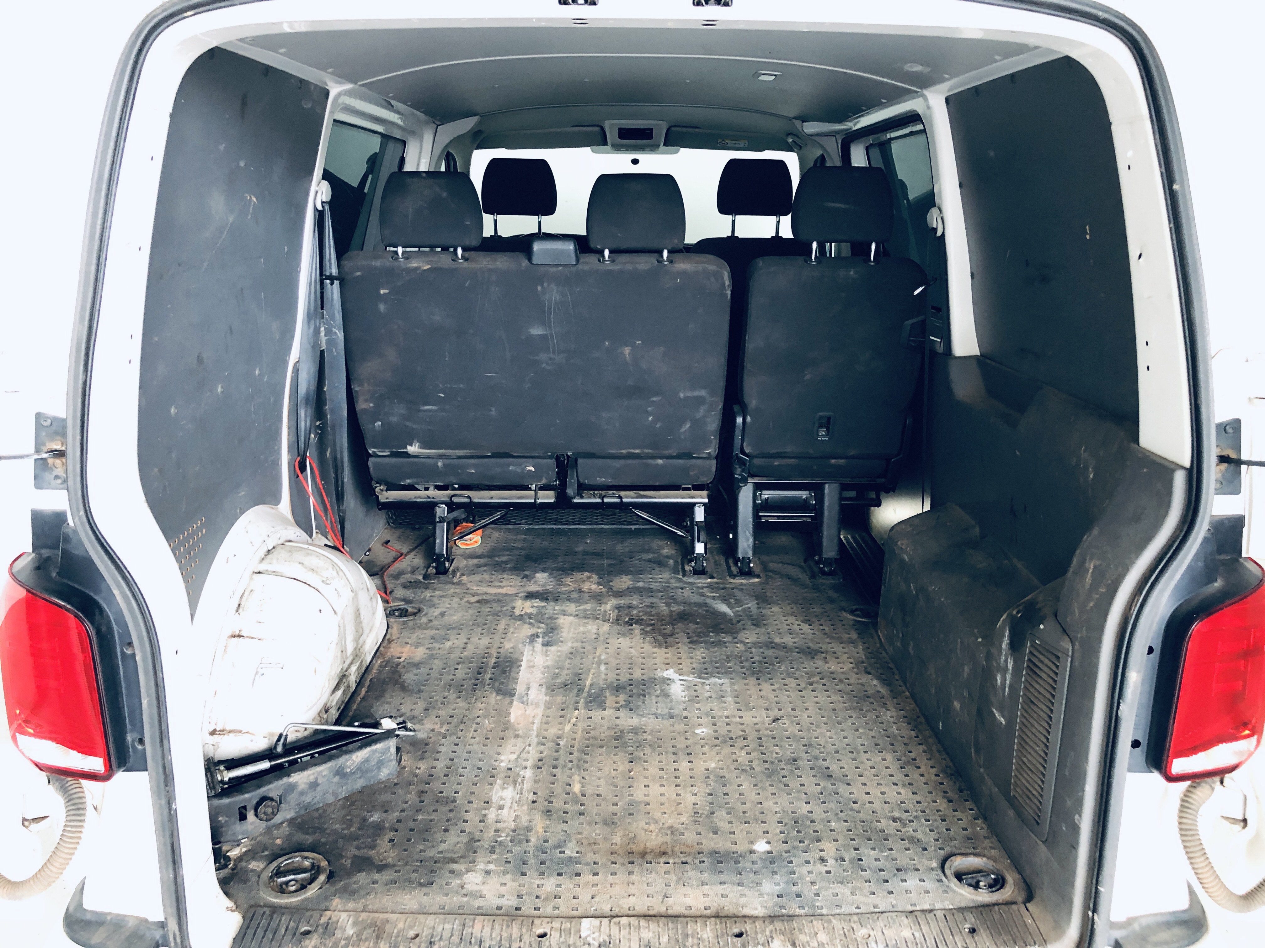 Oděrky a škrábance po obvodu karosérie, přední část karosérie je poškozená od kamínků, odřený přední nárazník, poškozené čelní sklo, mírně odřené levé přední dveře, odřený kryt levého zpětného zrcátka, promáčklý levý zadní blatník, promáčklý levý práh, odřený zadní nárazník, odřené zadní dveře nákladového prostoru, odřené pravé zadní světlo, odřené pravé posuvné dveře, odřené a mírně promáčklé pravé přední dveře - jamka, poškozen středový výdech ventilace, interiér vozidla opotřeben,
