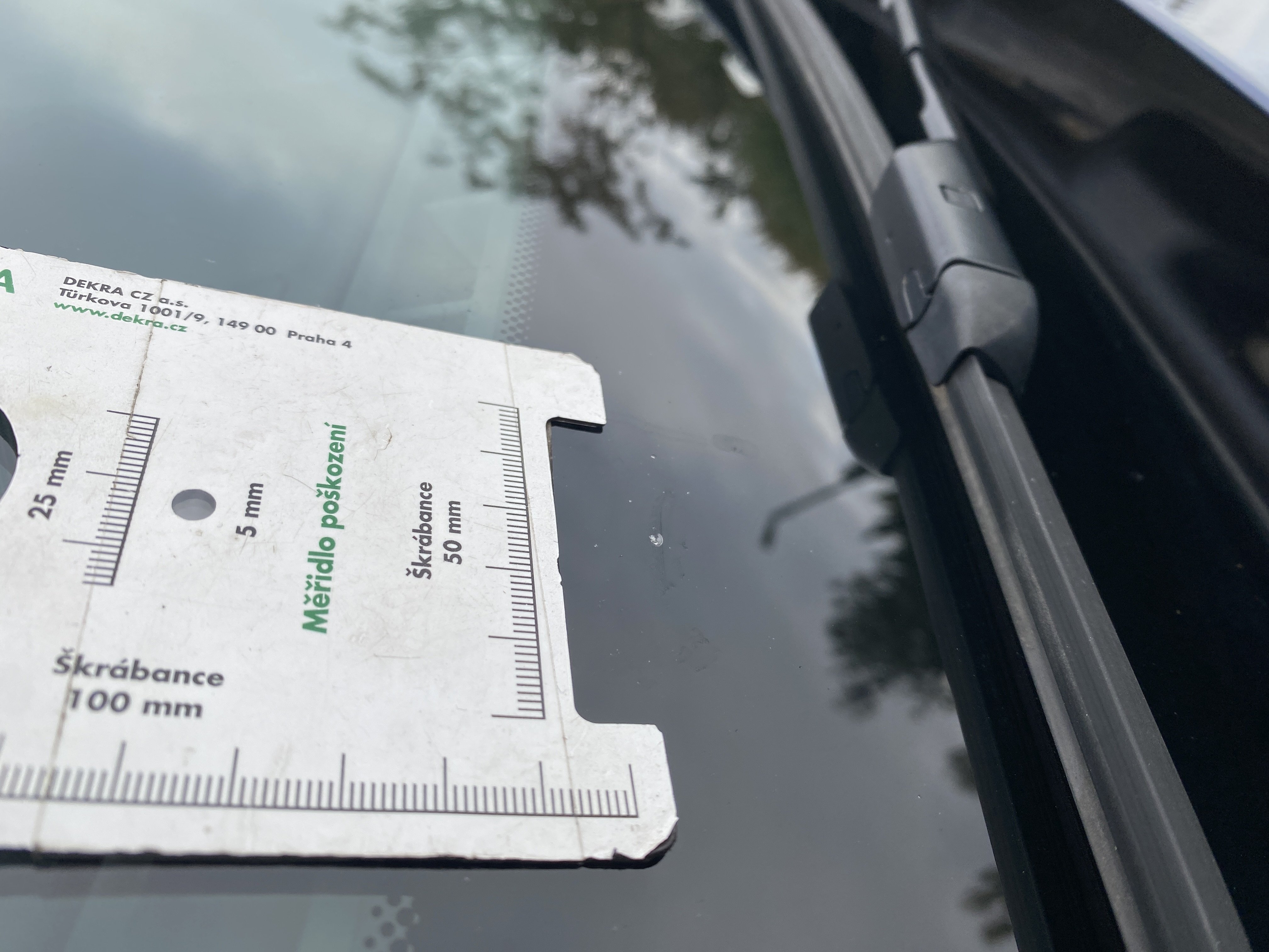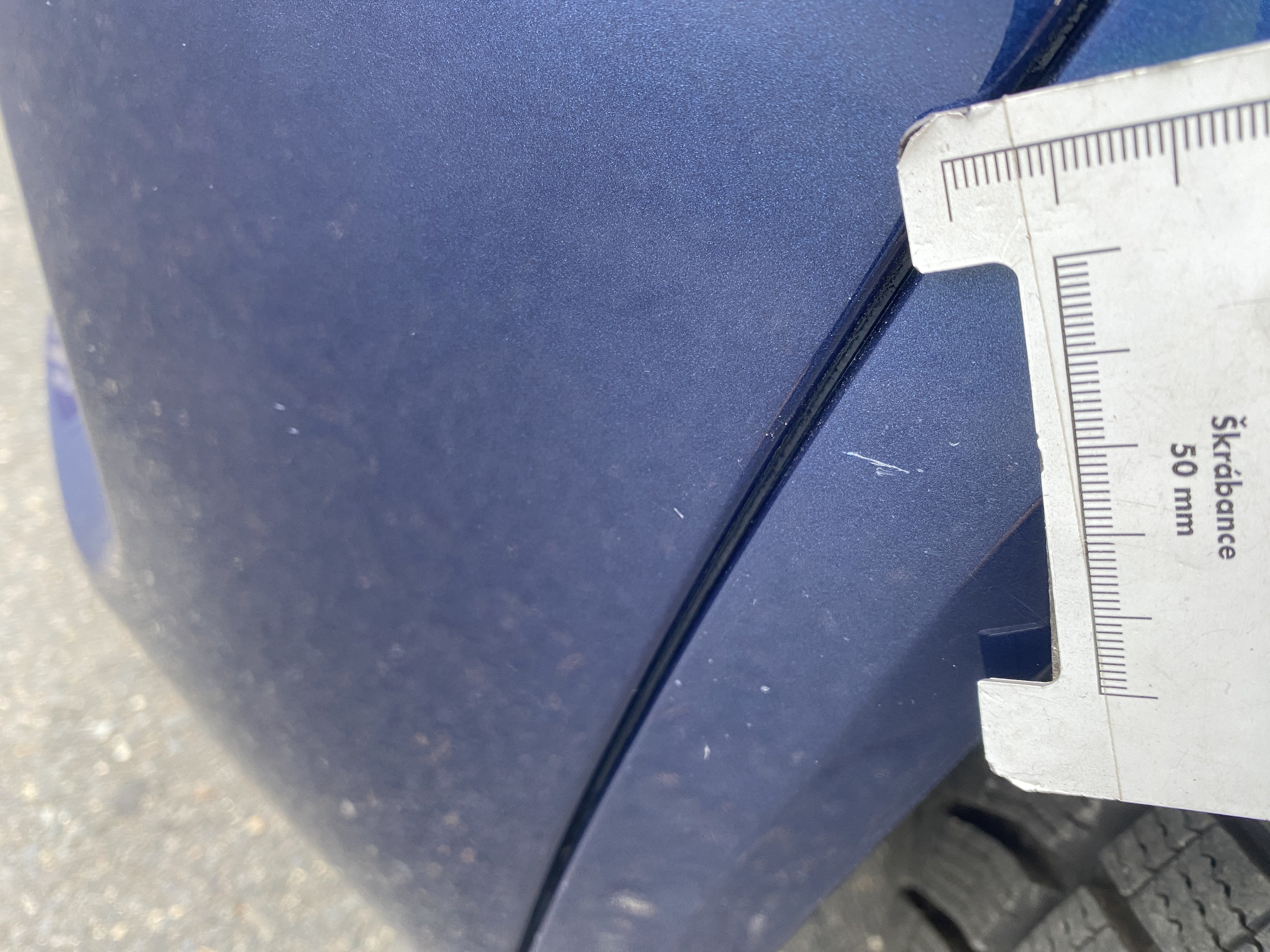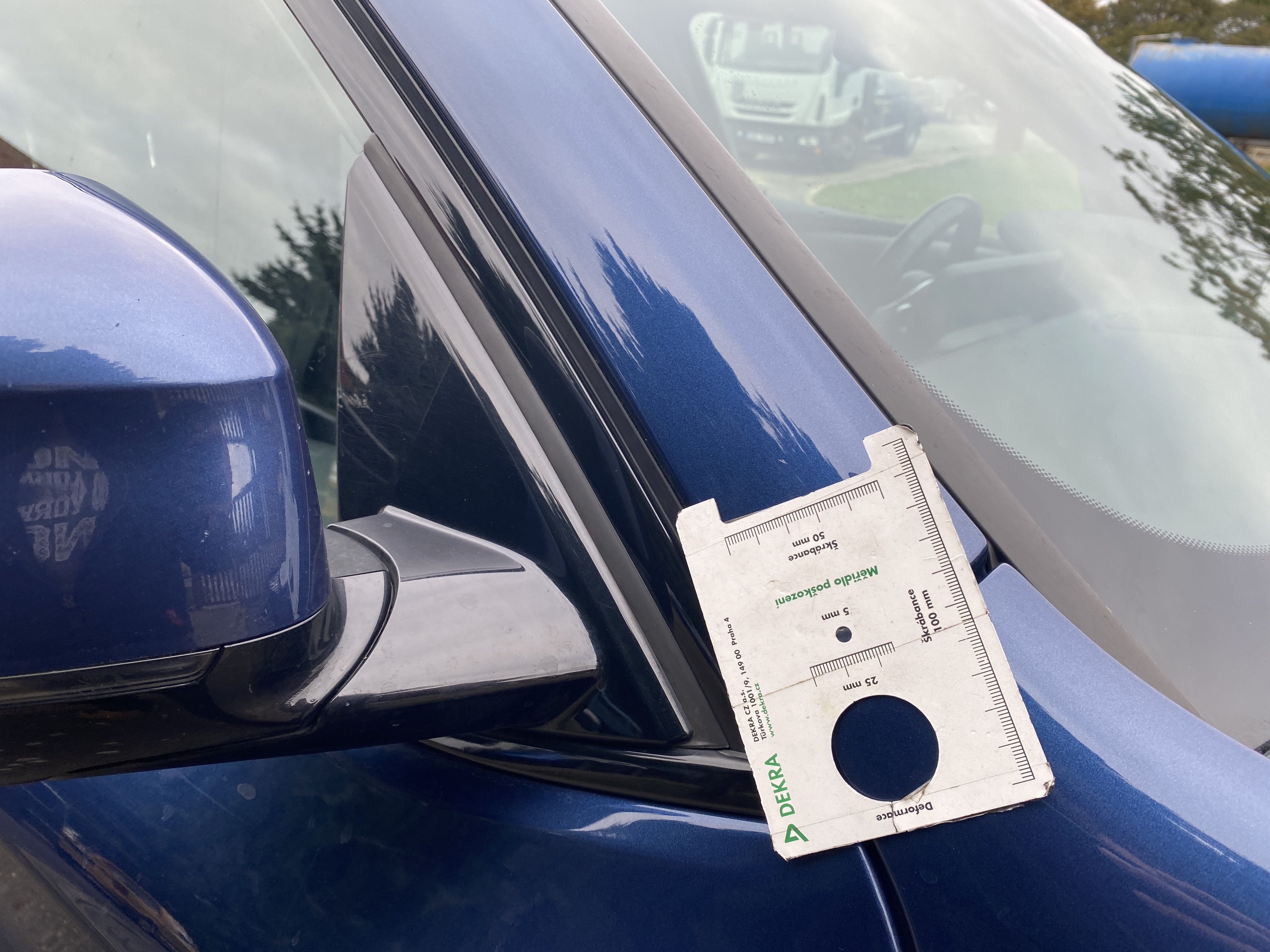 Oděrky a škrábance po obvodu karosérie, přední část karosérie je poškozená od kamínků, odřené levé přední dveře, odřený zadní nárazník, odřené víko zavzadlového prostoru, odřené pravé zadní dveře, mírně poškozené čelní sklo, karosérie nese stopy po předchozí opravě, chybí krytka pro tažné oko v předním nárazníku, interiér vozidla opotřeben,