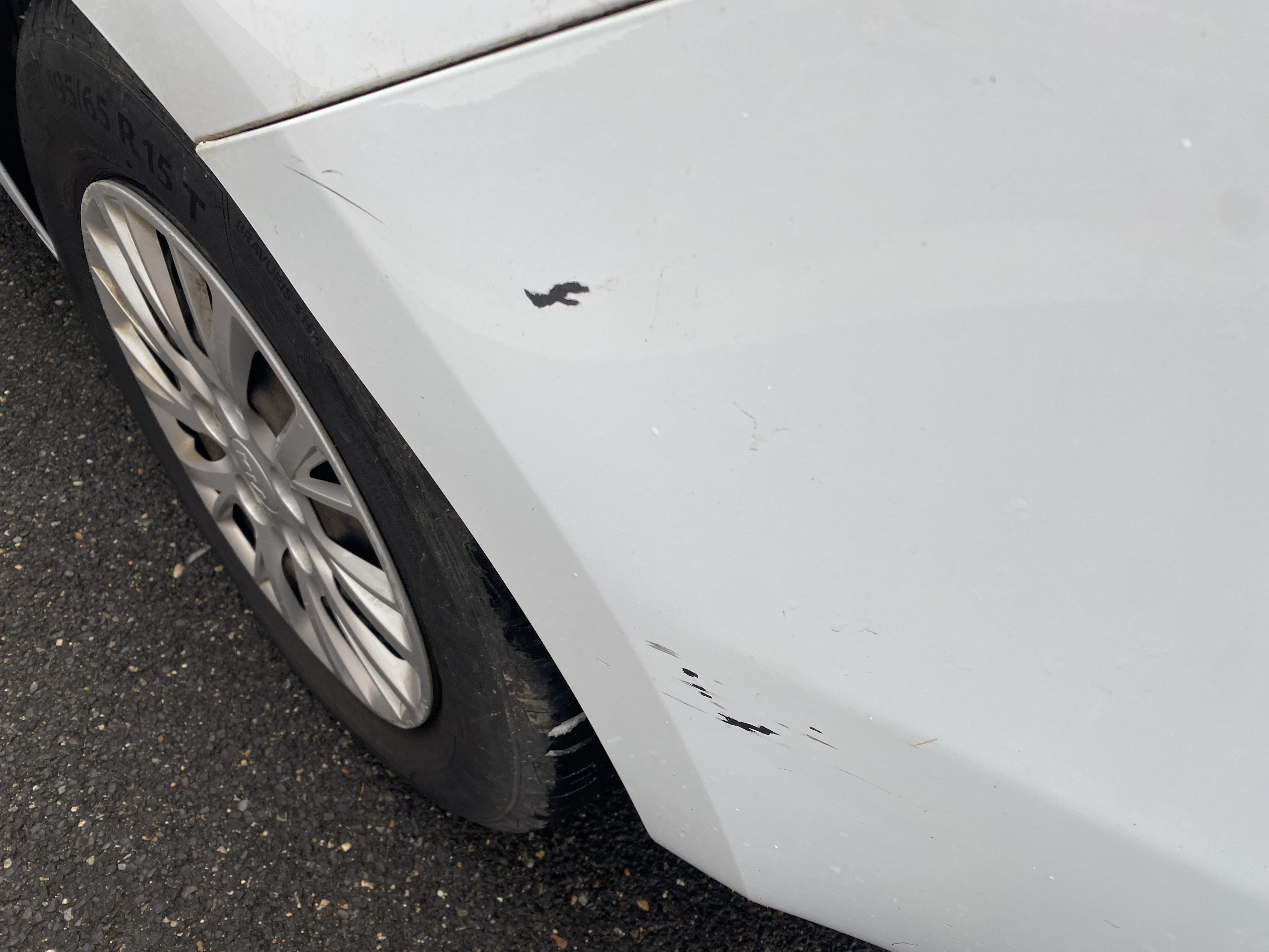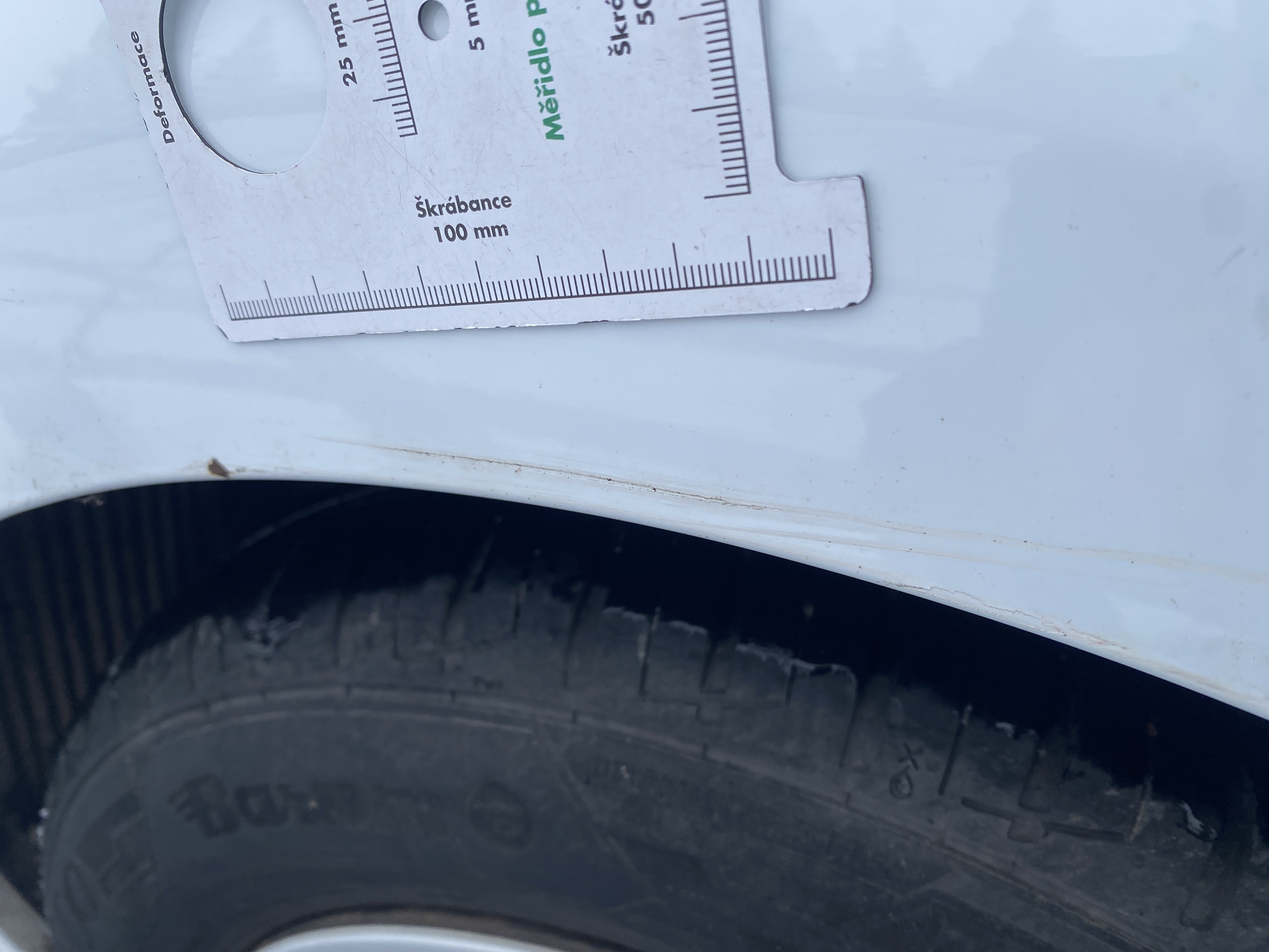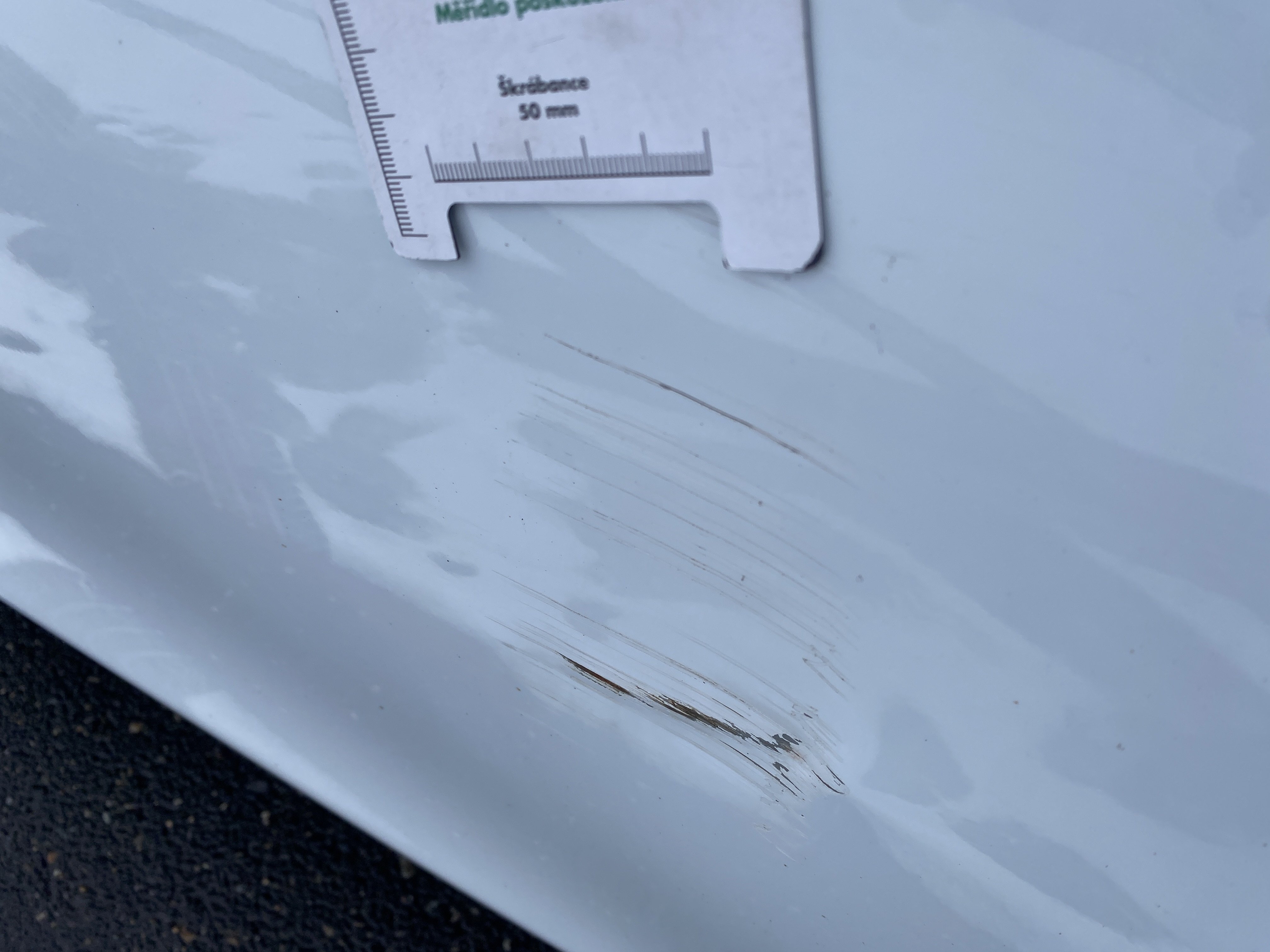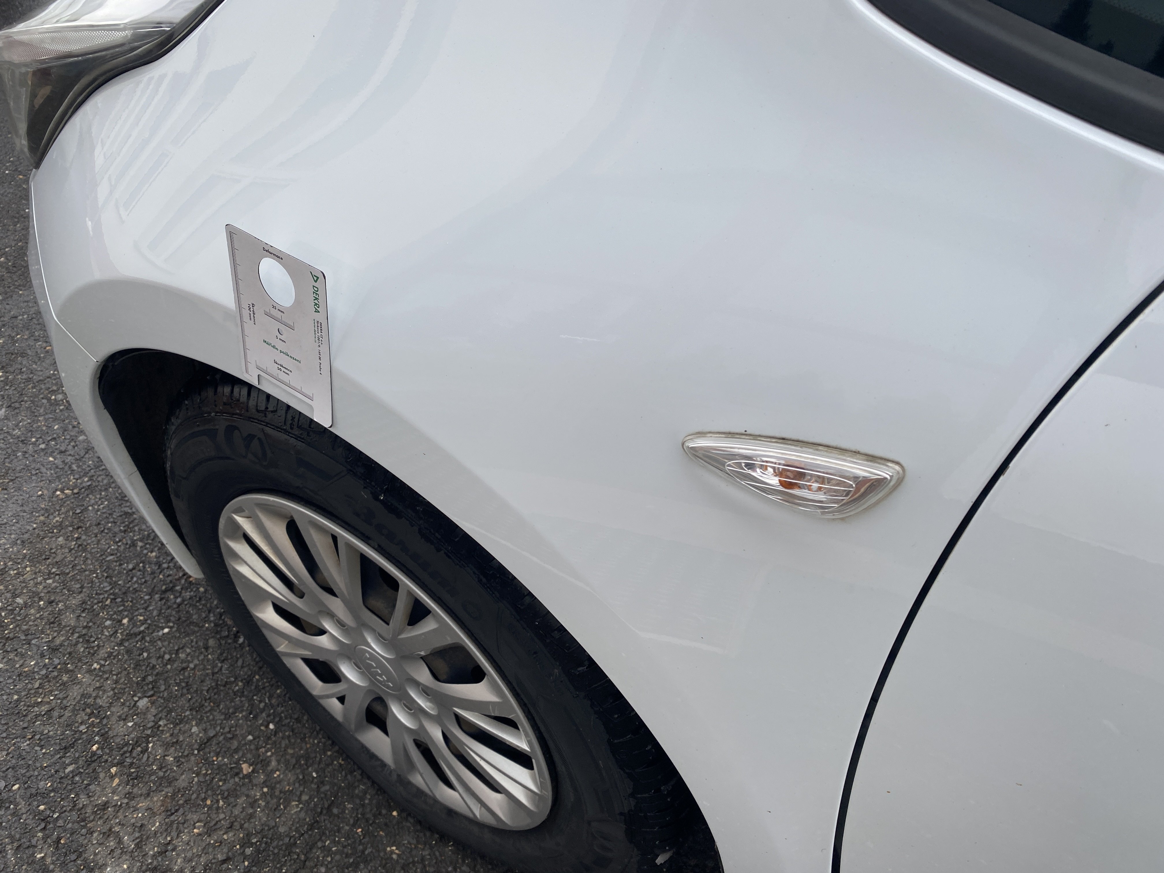 Oděrky a škrábance po obvodu karosérie, přední část karosérie je poškozená od kamínků, odřený přední nárazník, odřený levý přední blatník, lehce promáčklé levé přední dveře, odřená klika levých předních dveří, lehce promáčklé levé zadní dveře, odřený zadní nárazník, odřený znak víka zavazadlového prostoru, odřený pravý zadní blatník - koroze, odřené pravé zadní dveře, promáčklé pravé přední dveře, odřená klika pravých předních dveří, odřený plastový kryt pravého zpětného zrcátka, poškozený pravý práh - koroze, poškozené čelní sklo - jamka, chybí krycí roleta zavazadlového prostoru, interiér vozidla opotřeben.