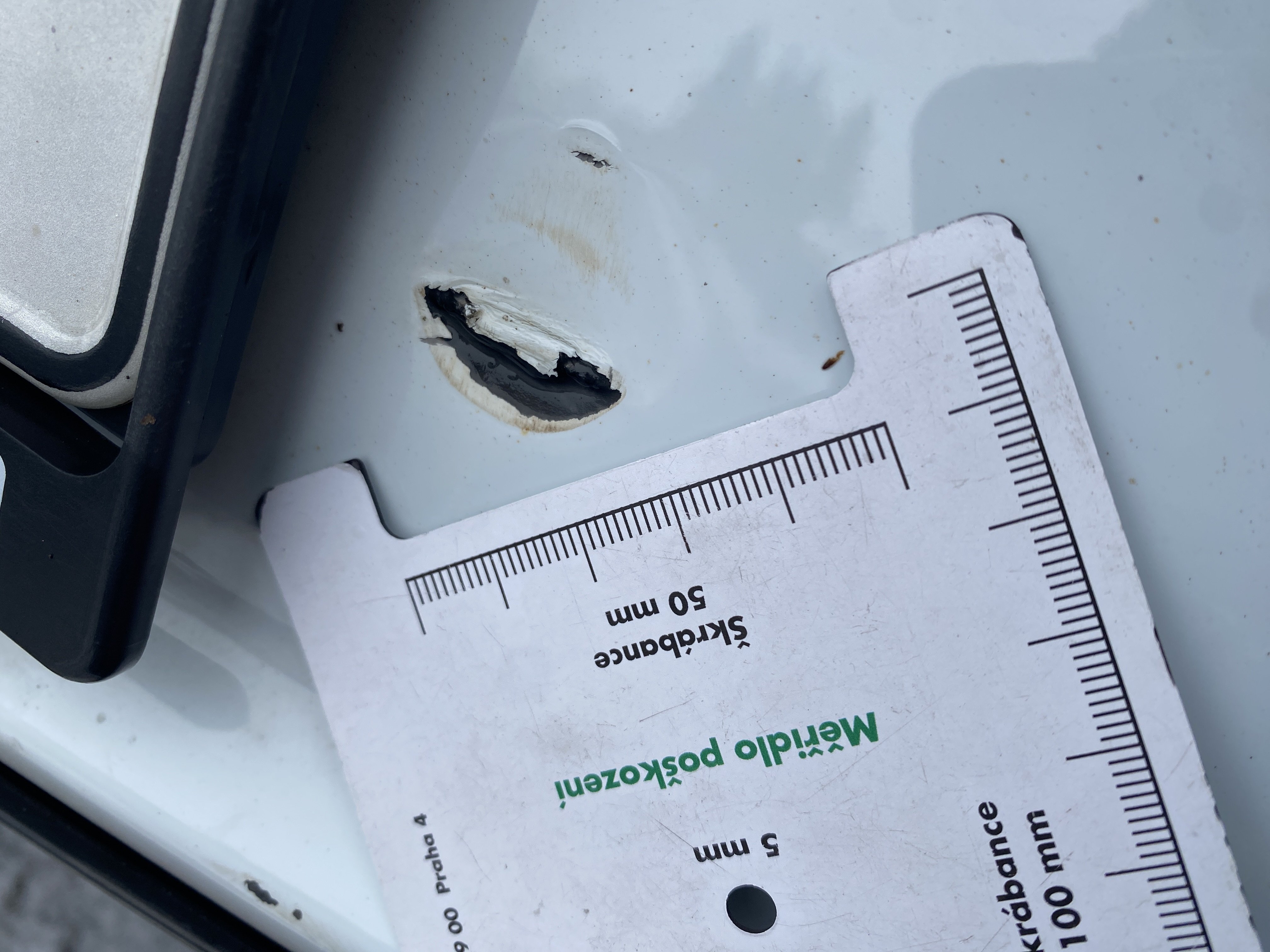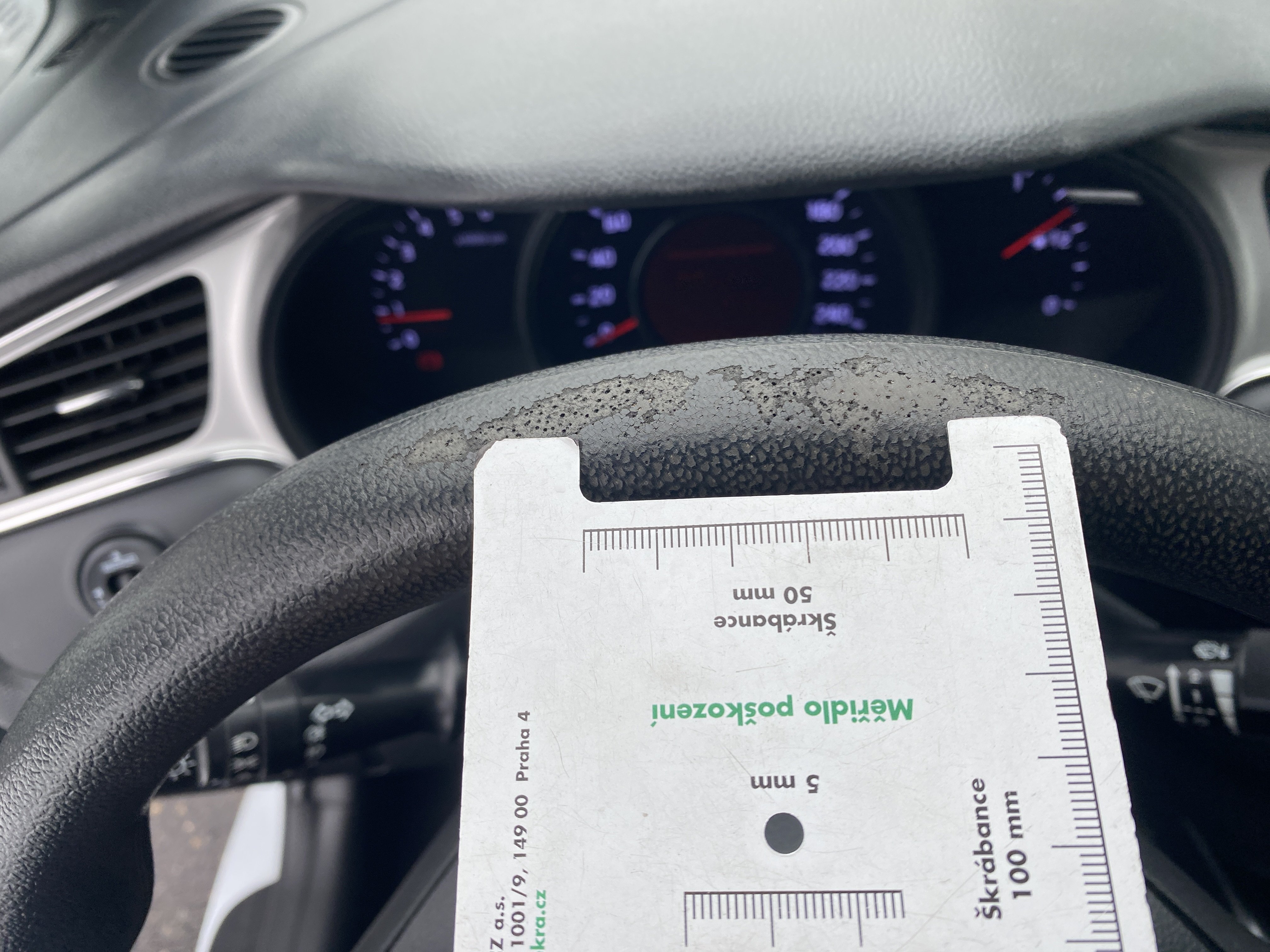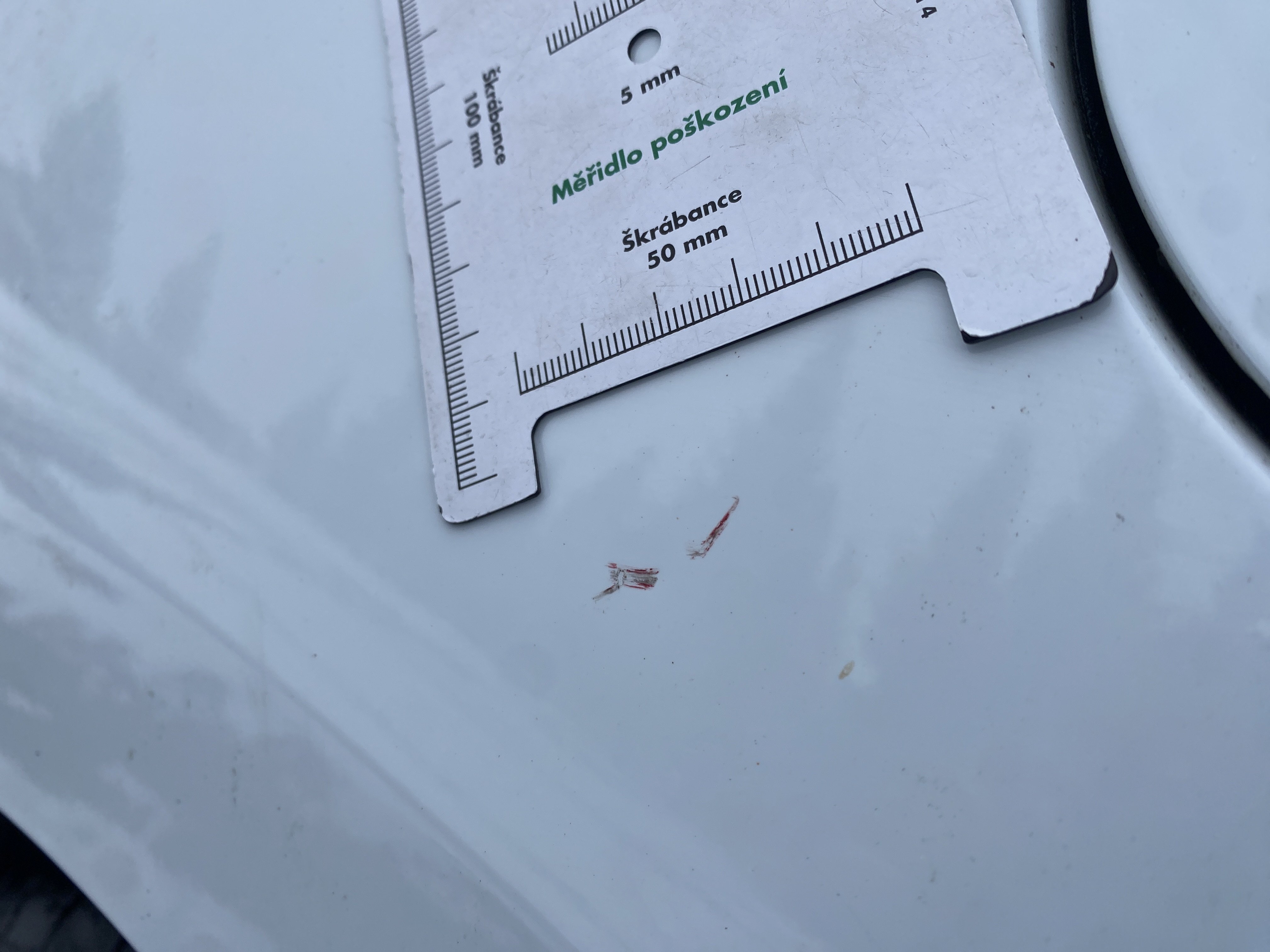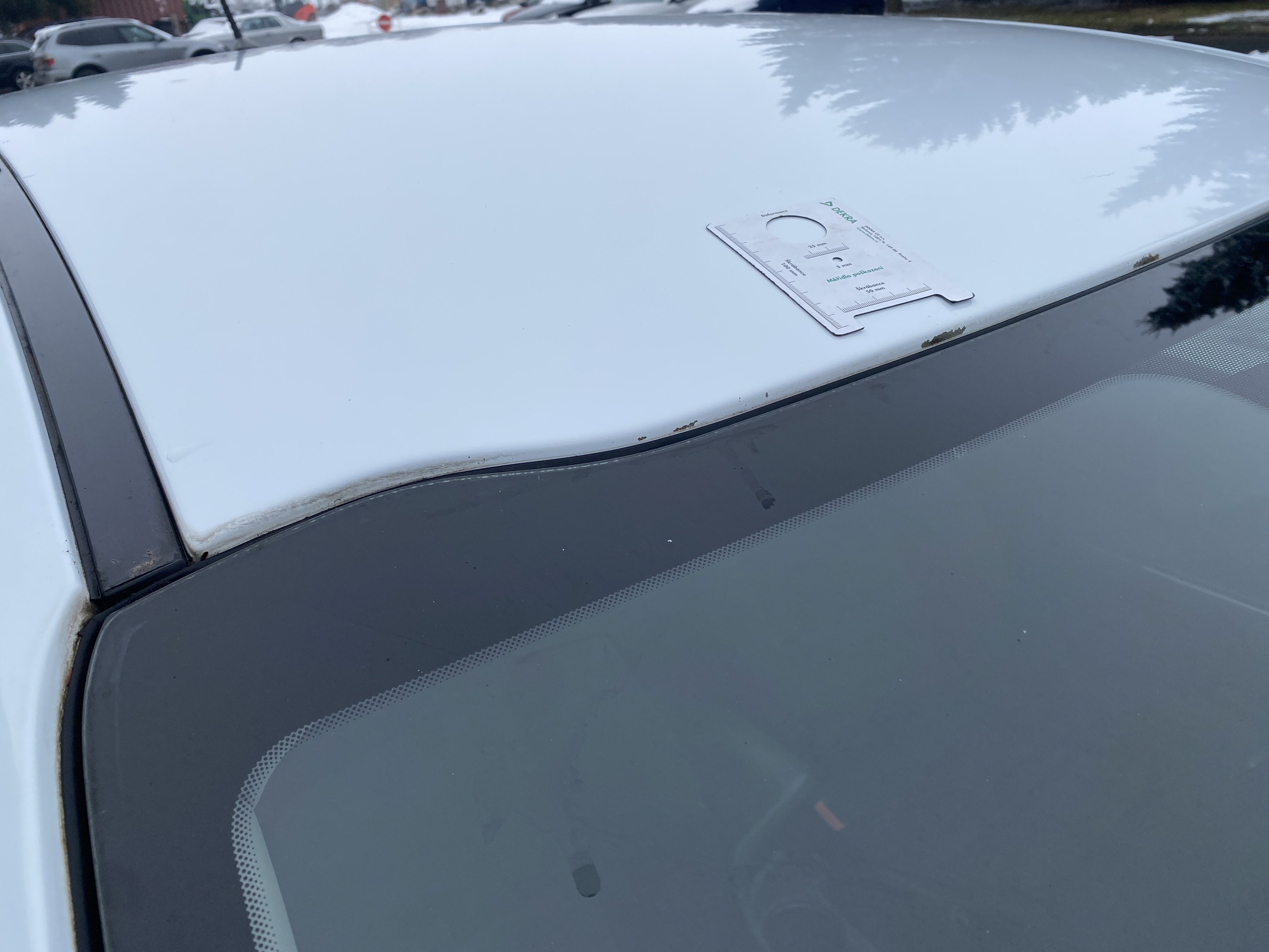 Oděrky a škrábance po obvodu karosérie, přední část karosérie je poškozená od kamínků, odřený přední nárazník, odřené víko motorového prostoru, odřená klika levých předních dveří, lehce promáčklé levé zadní dveře, odřený levý zadní blatník, odřený zadní nárazník, odřené víko zavazadlového prostoru - koroze, odřený pravý zadní blatník, promáčklé pravé přední dveře, odřená klika pravých předních dveří, odřené plato střechy - koroze, opotřebený volant, interiér vozidla opotřeben.