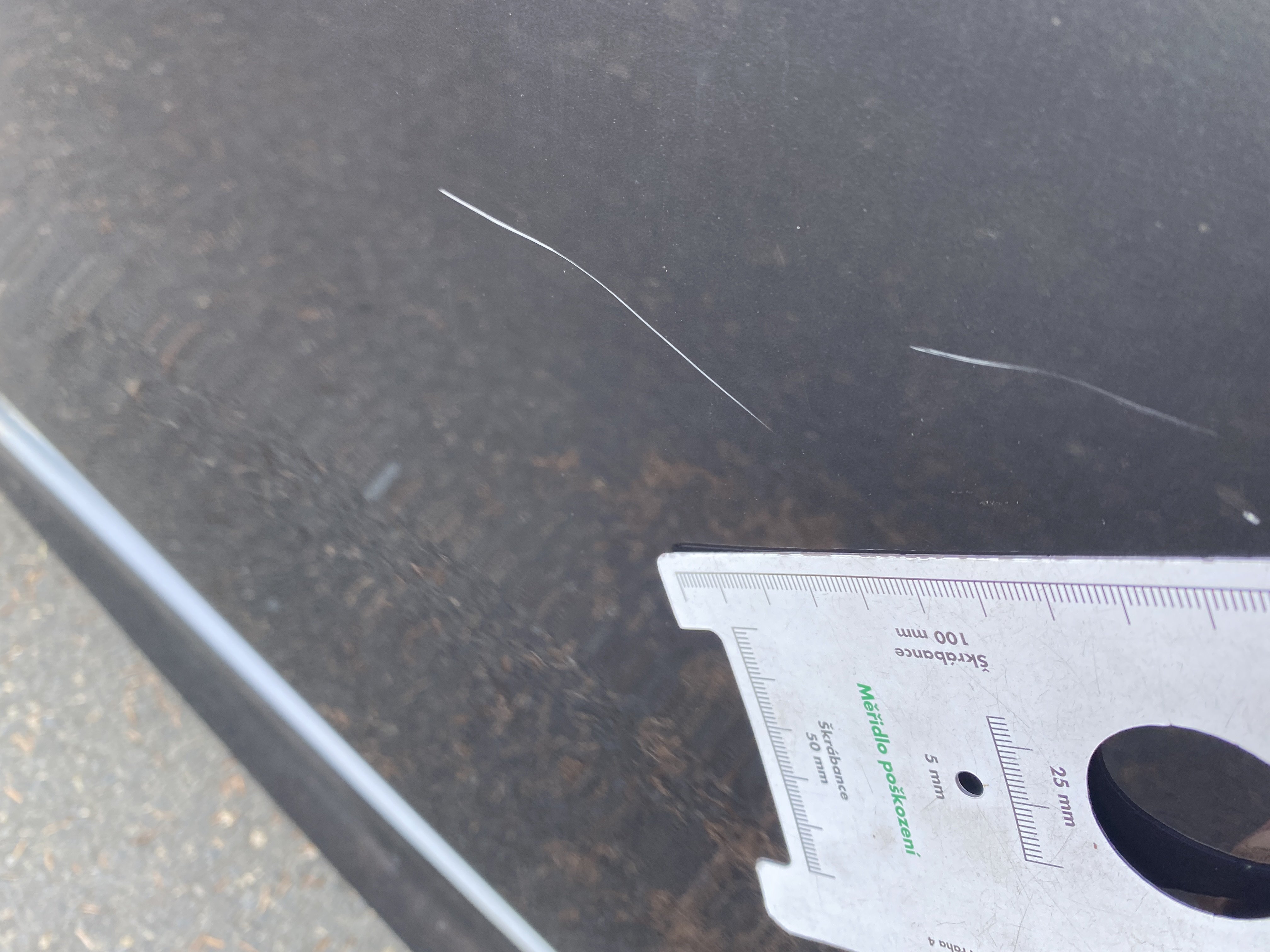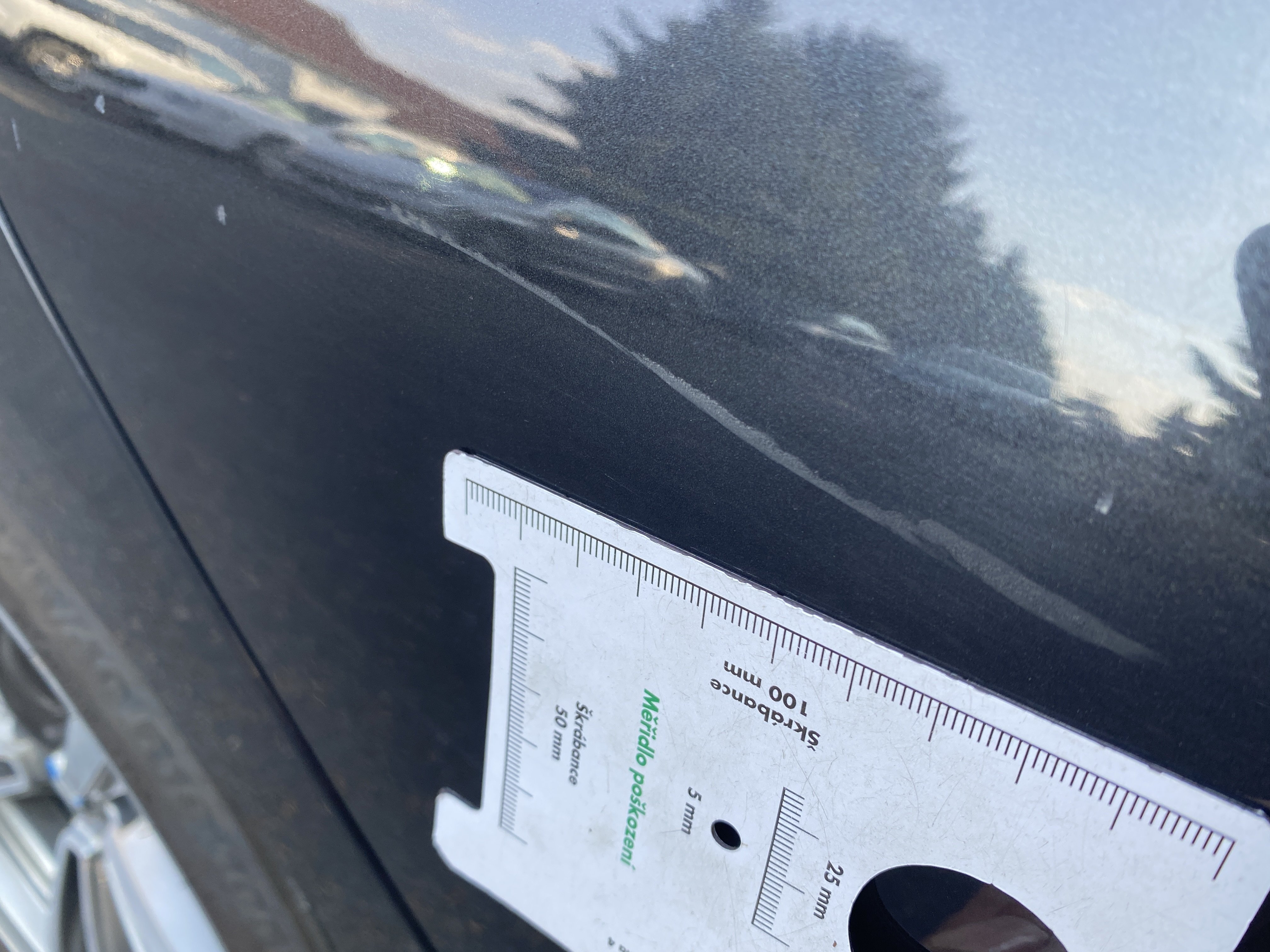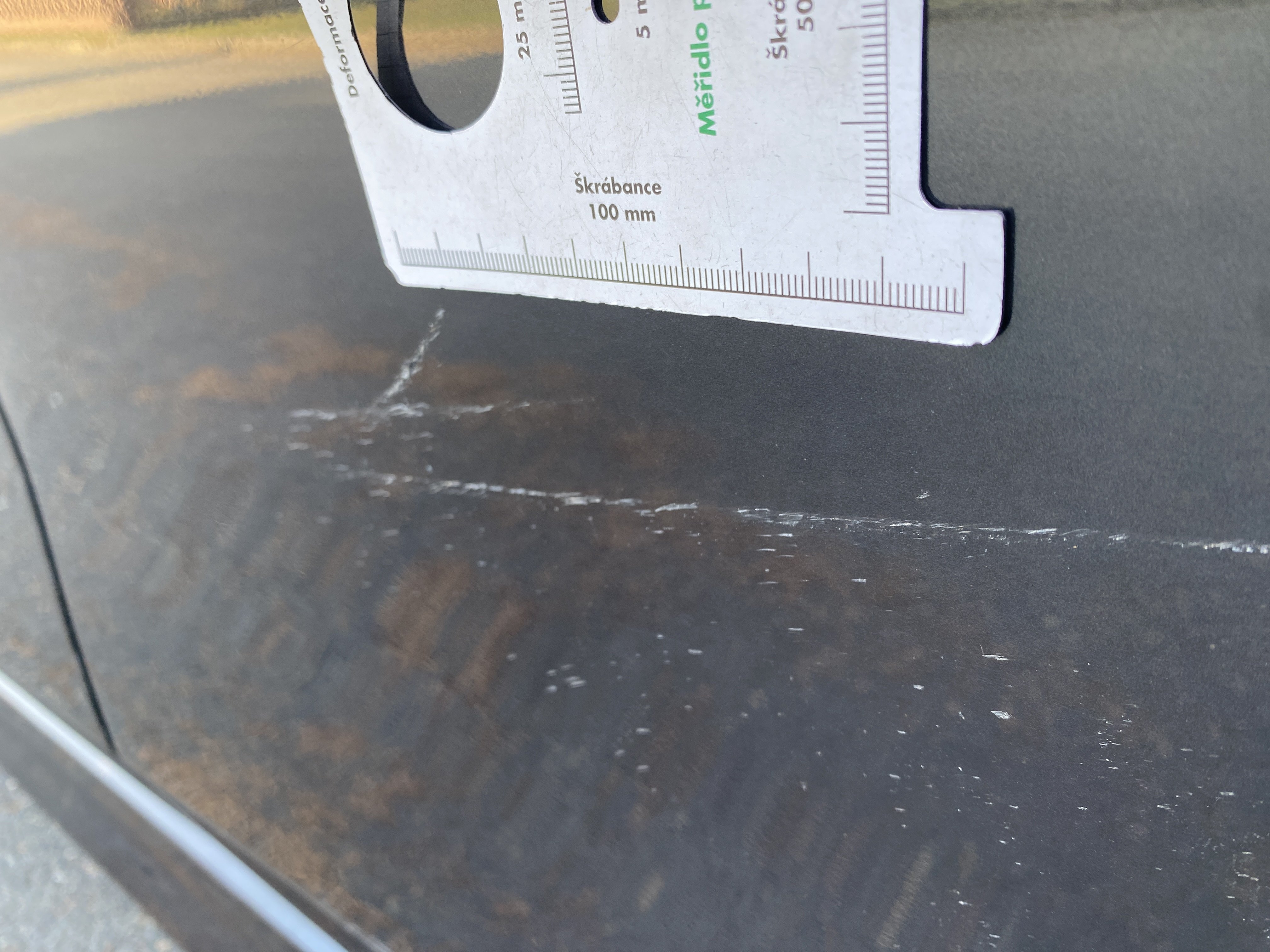 Oděrky a škrábance po obvodu karosérie, přední část karosérie je poškozená od kamínků, odřený přední nárazník, odřená hrana levých předních dveří, odřené levé zadní dveře, odřený zadní nárazník, odřený pravý zadní blatník, odřené pravé zadní dveře, odřené pravé přední dveře, svítí kontrolka opotřebení brzdových destiček, palubní počítač hlásí servisní interval, svítí kontrolka motoru, nefunkční stahování levého zadního okna, poškozen boční kryt levé přední sedačky, interiér vozidla poškozen,