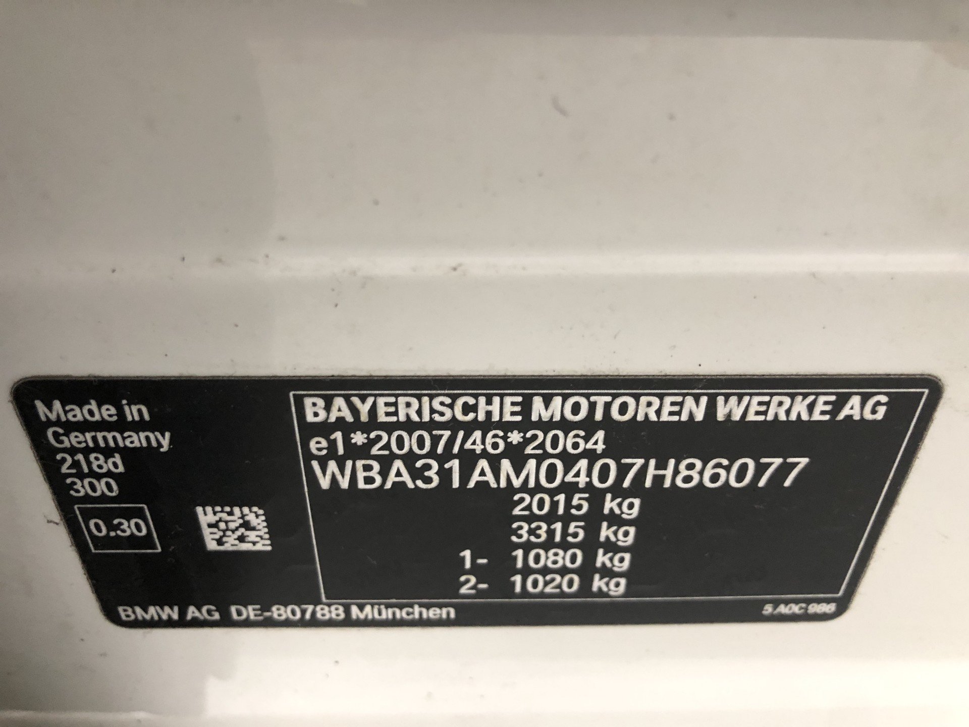 | VIN | WBA31AM0407H86077 |
