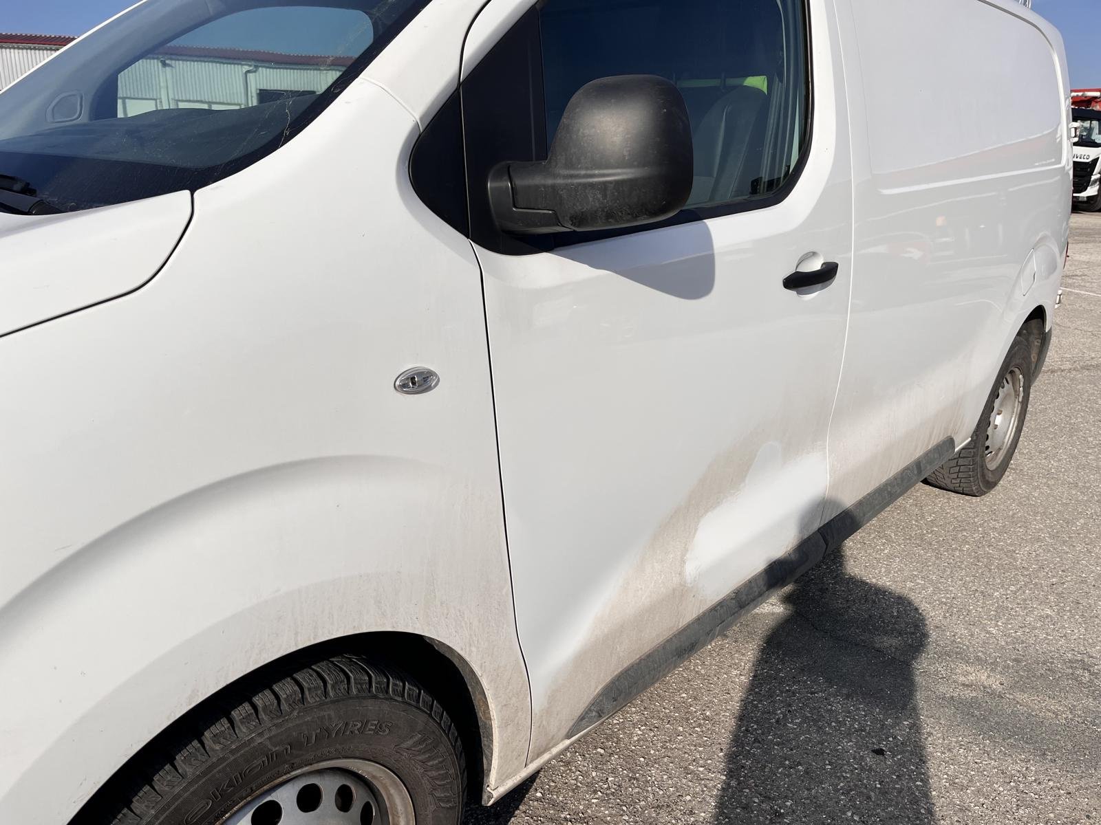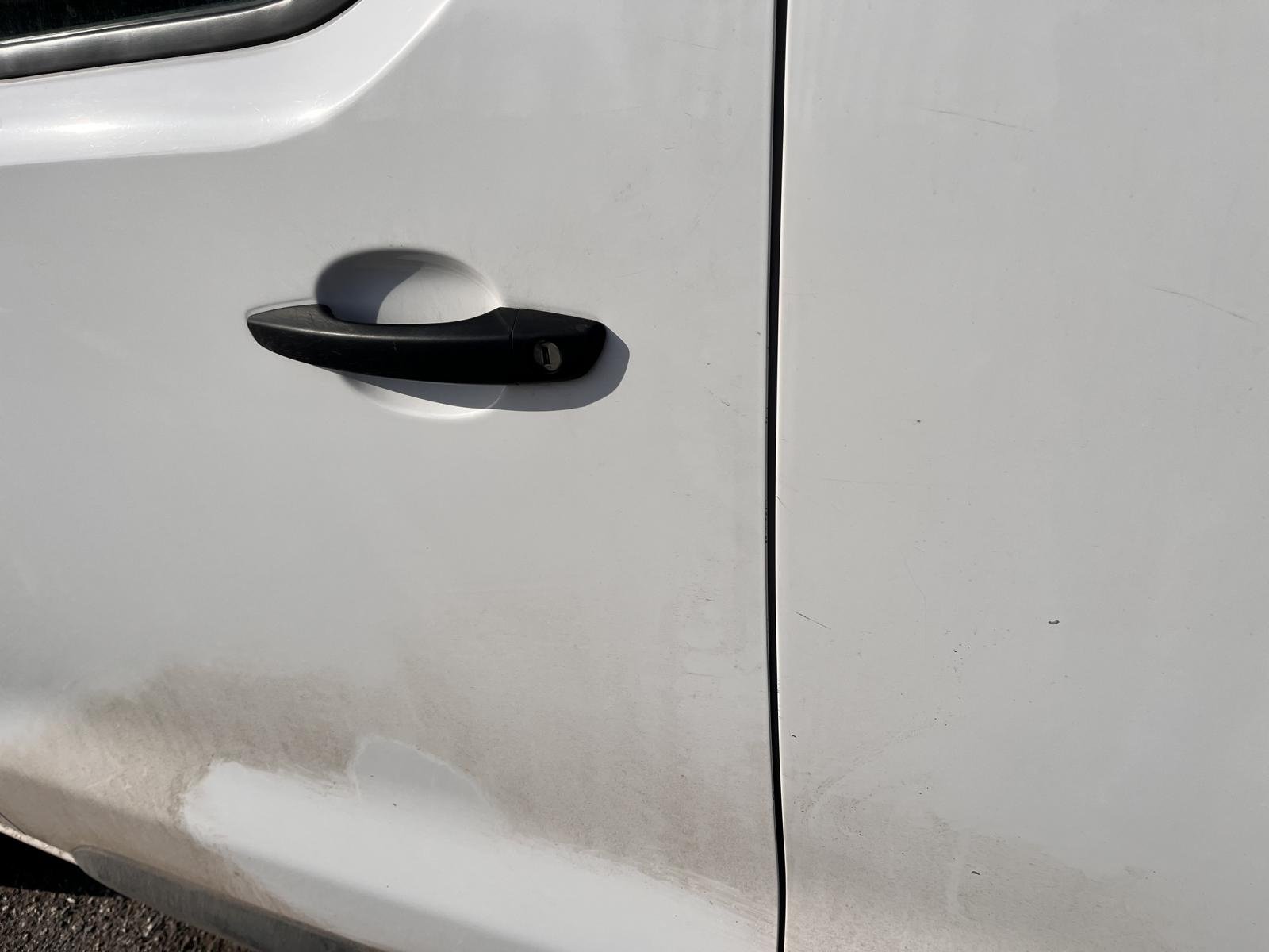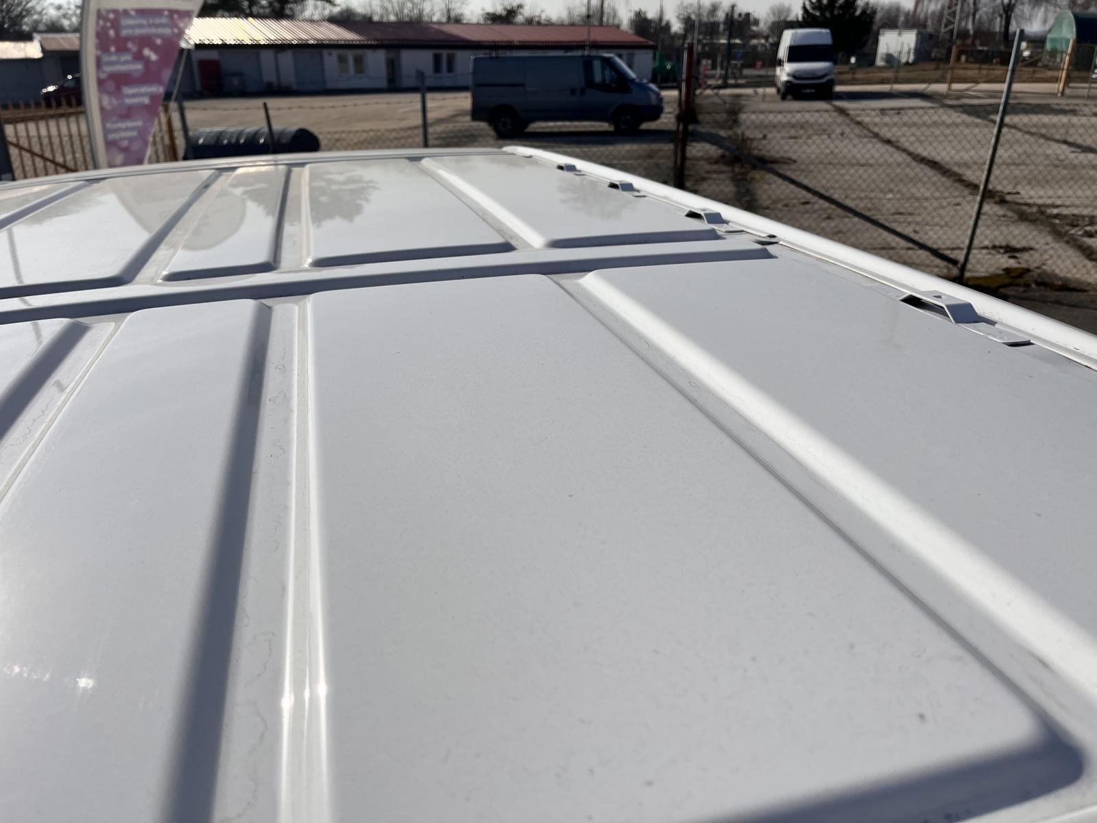Oděrky a škrábance po obvodu karosérie, přední část karosérie je poškozená od kamínků, deformace střechy, odřené levé zadní dveře nákladového prostoru, odřené pravé zadní dveře nákladového prostoru, odřené levé přední dveře, odřený zadní nárazník, interiér vozidla opotěben, deformace nákladového prostoru,