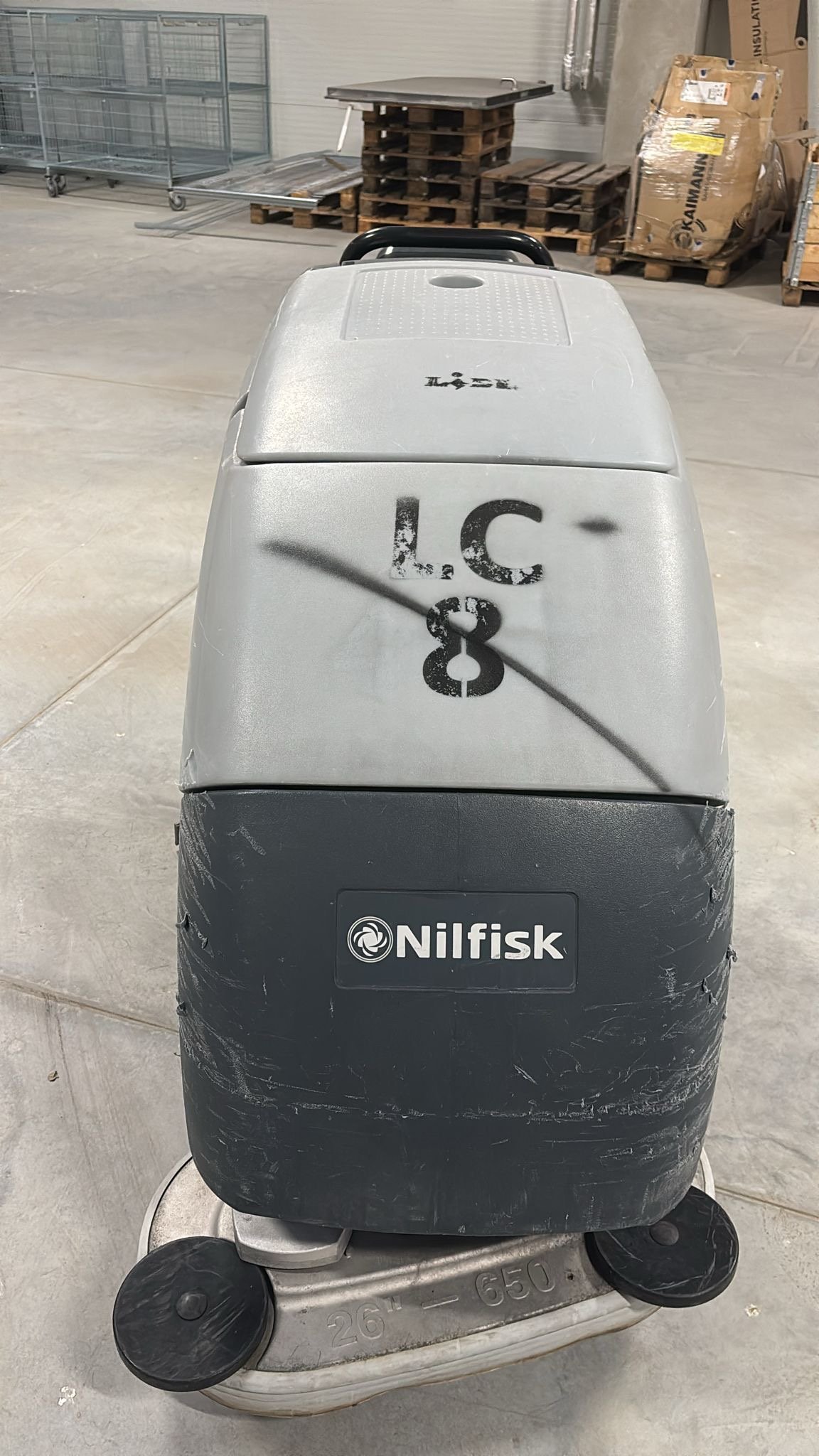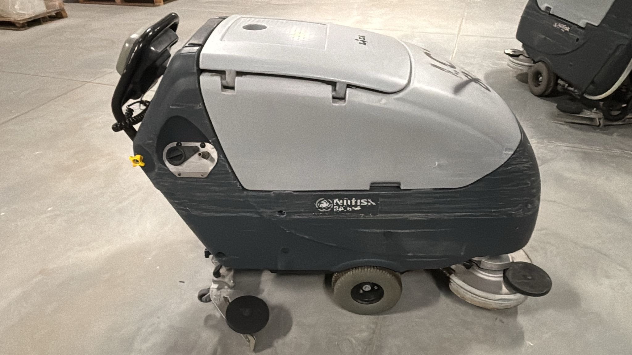 Oděrky a škrábance po obvodu. Podlahový mycí stroj Nilfisk BA 651, sériové číslo: 3510164102598, rok výroby: 2016, starší baterie.