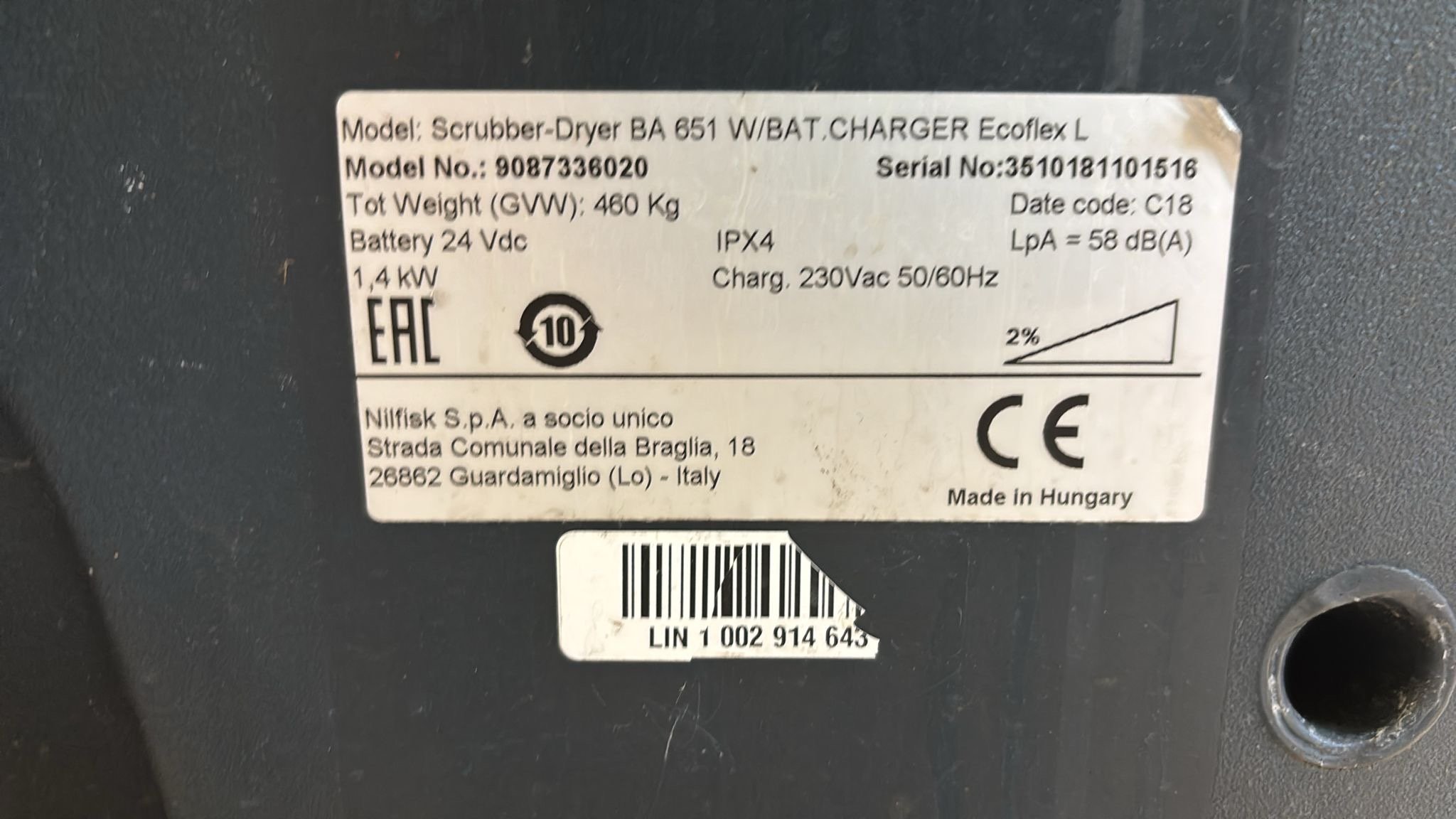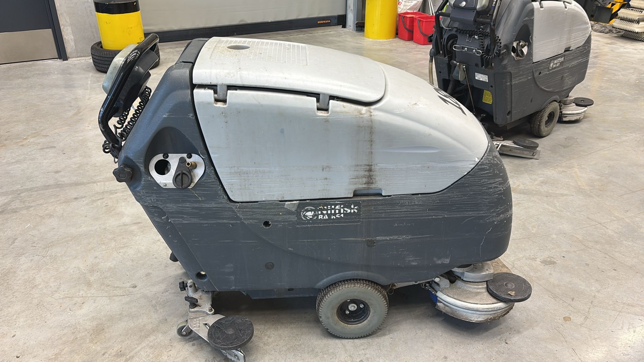 Oděrky a škrábance po obvodu. Podlahový mycí stroj Nilfisk BA 651, sériové číslo: 351018110516 , rok výroby: 2018, starší baterie.