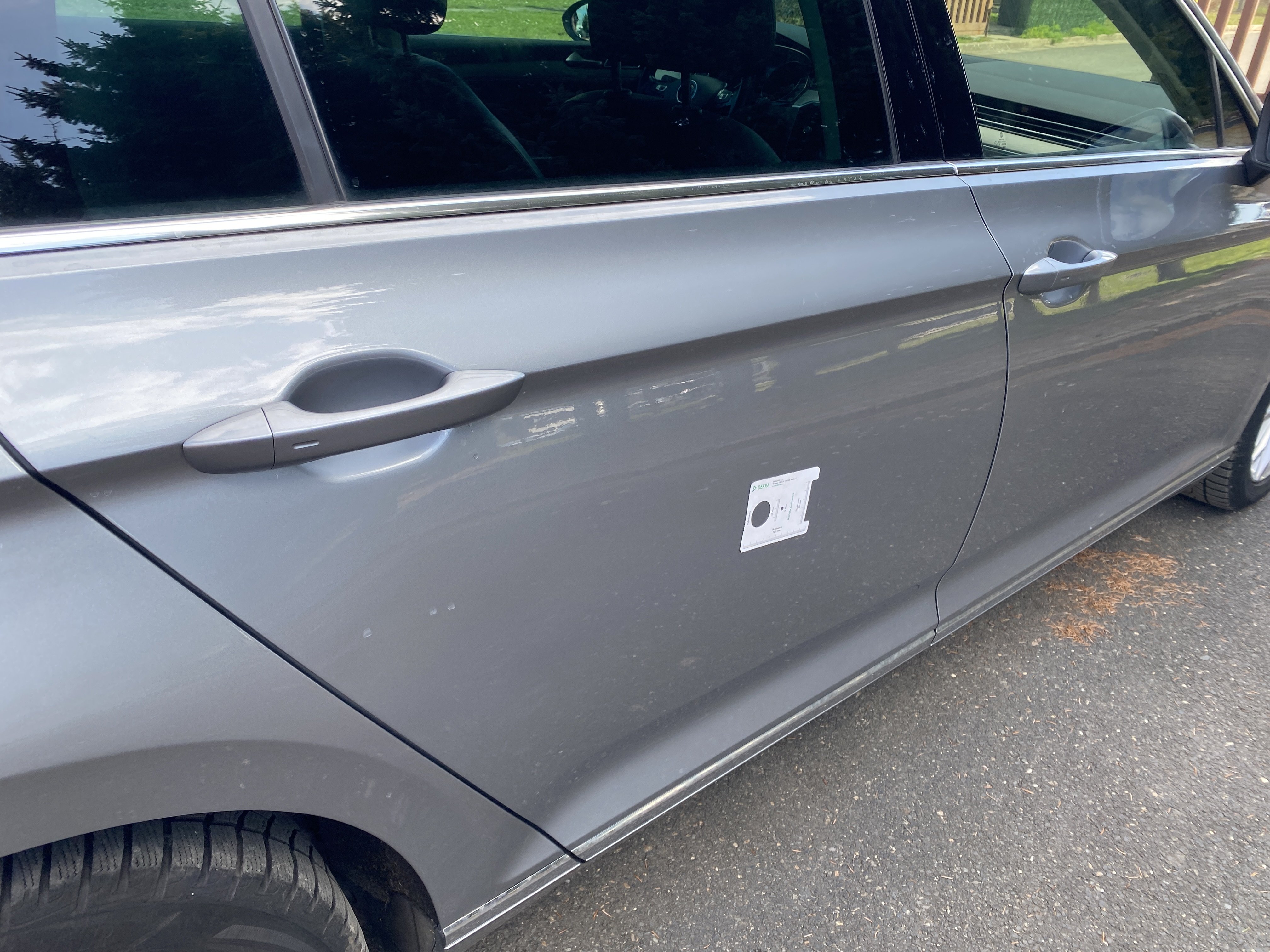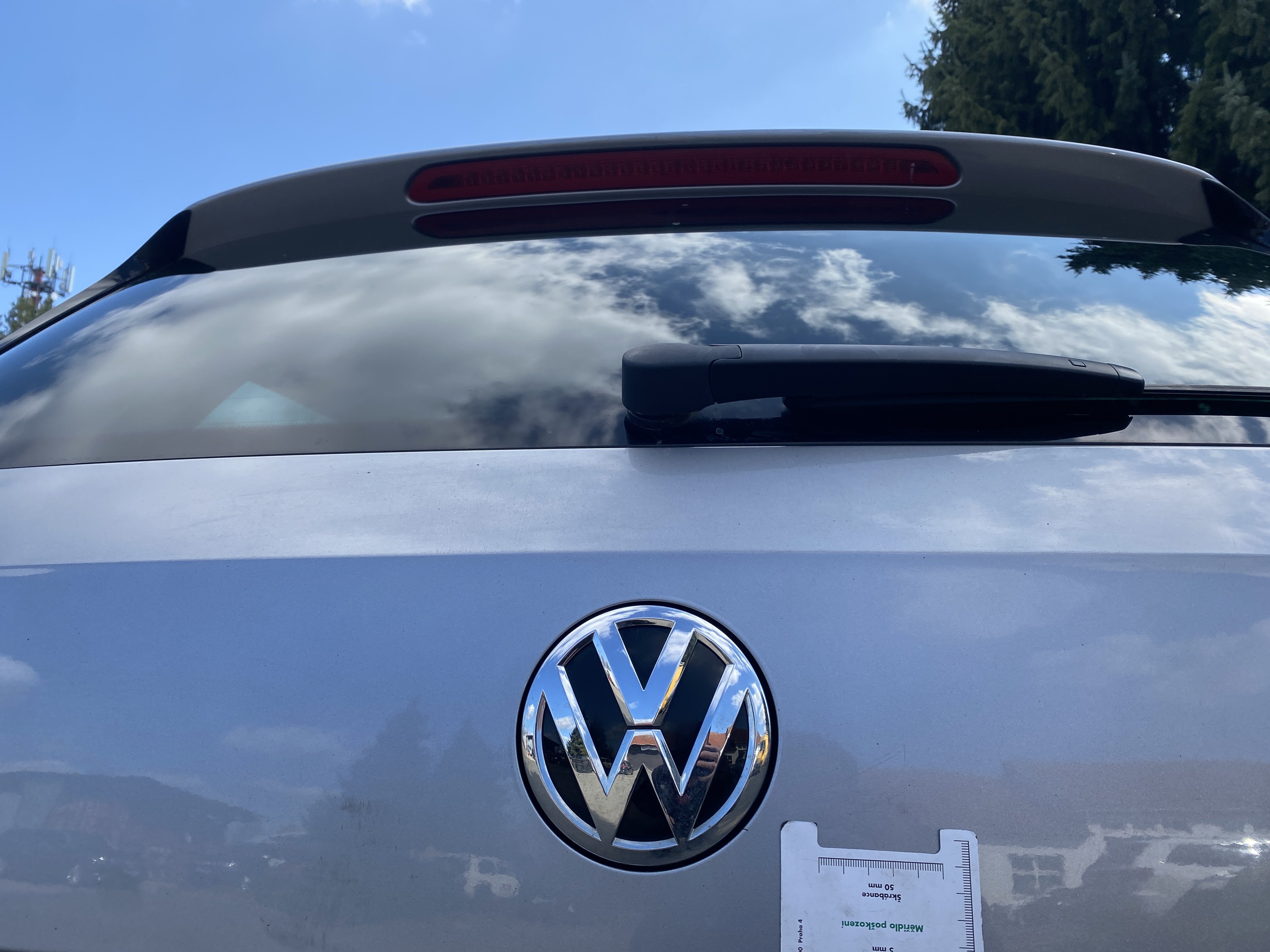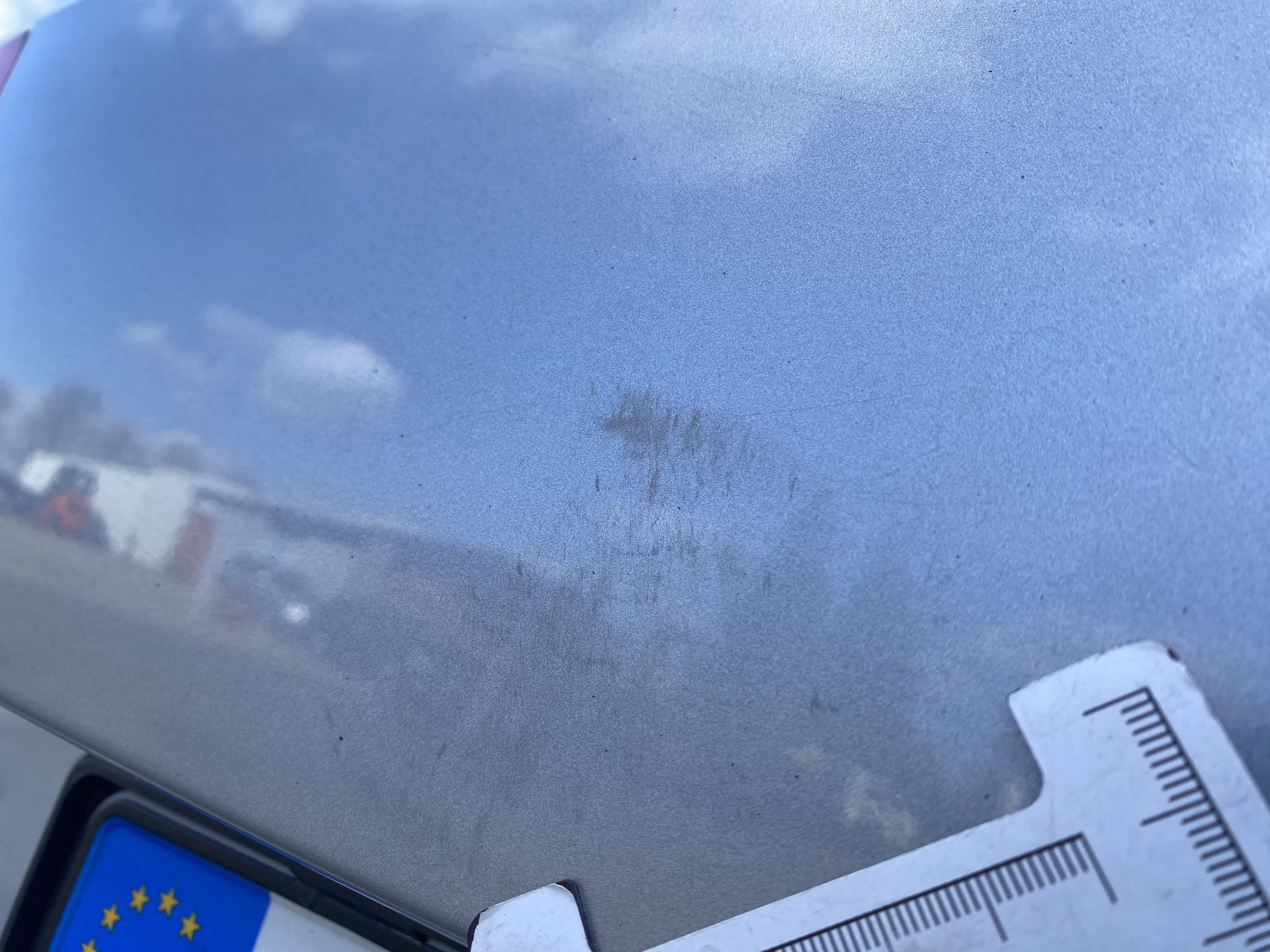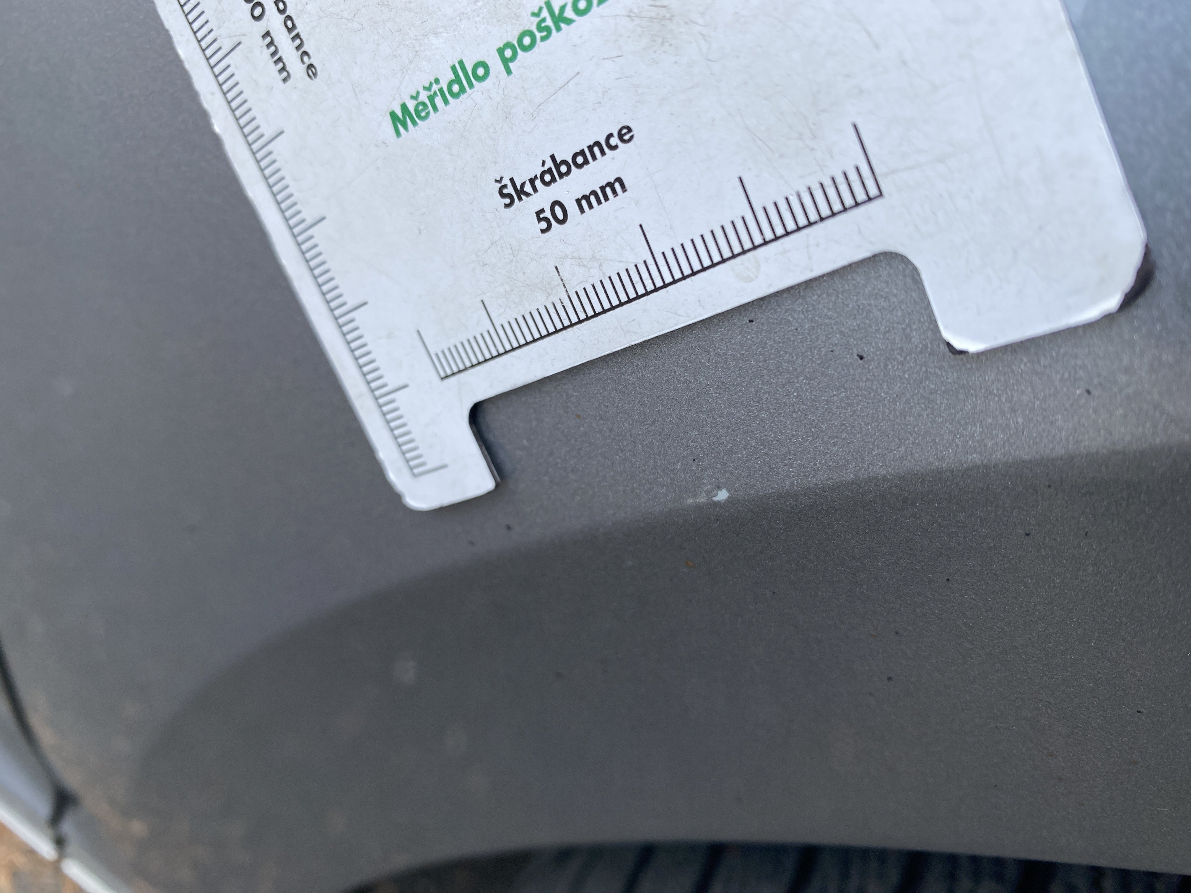 Oděrky a škrábance po obvodu karosérie, přední část karosérie je poškozená od kamínků, mírně odřený lem prvého předního blatníku, mírně promáčklé víko motorového prostoru - jamka, odřený kryt levého zpětného zrcátka, odřené víko zavazadlového porstoru, odřené pravé zadní dveře, interiér poškozen,