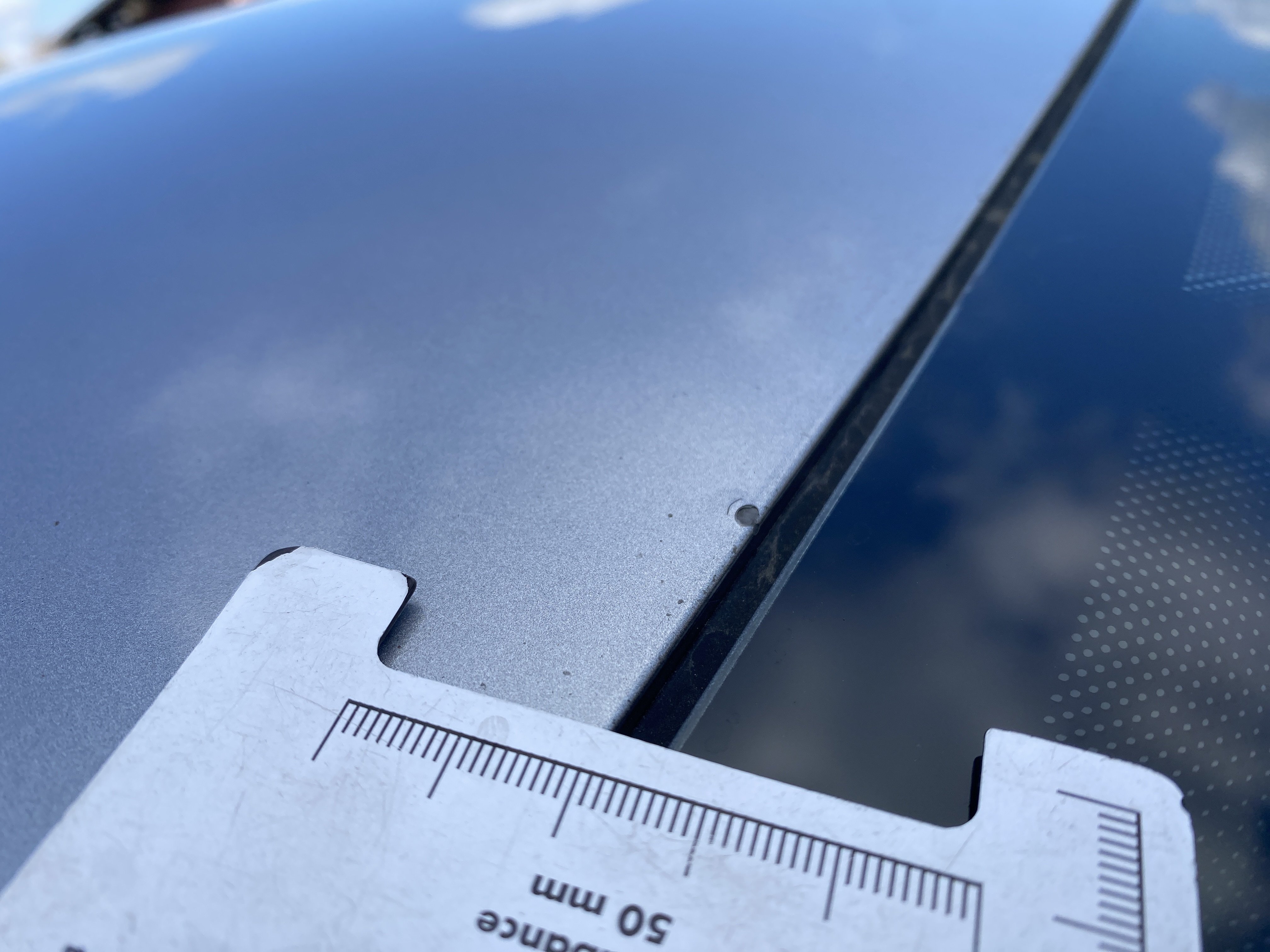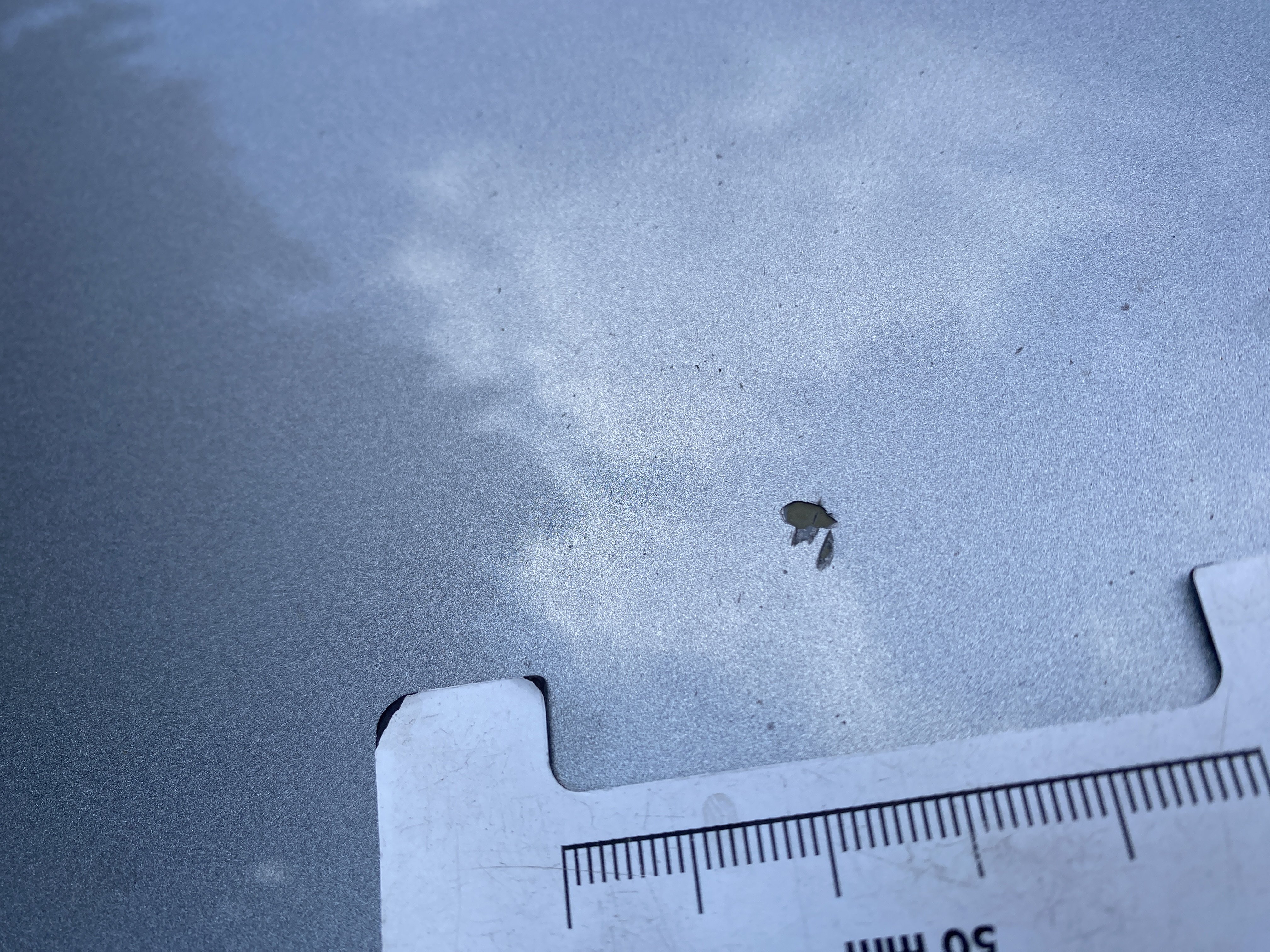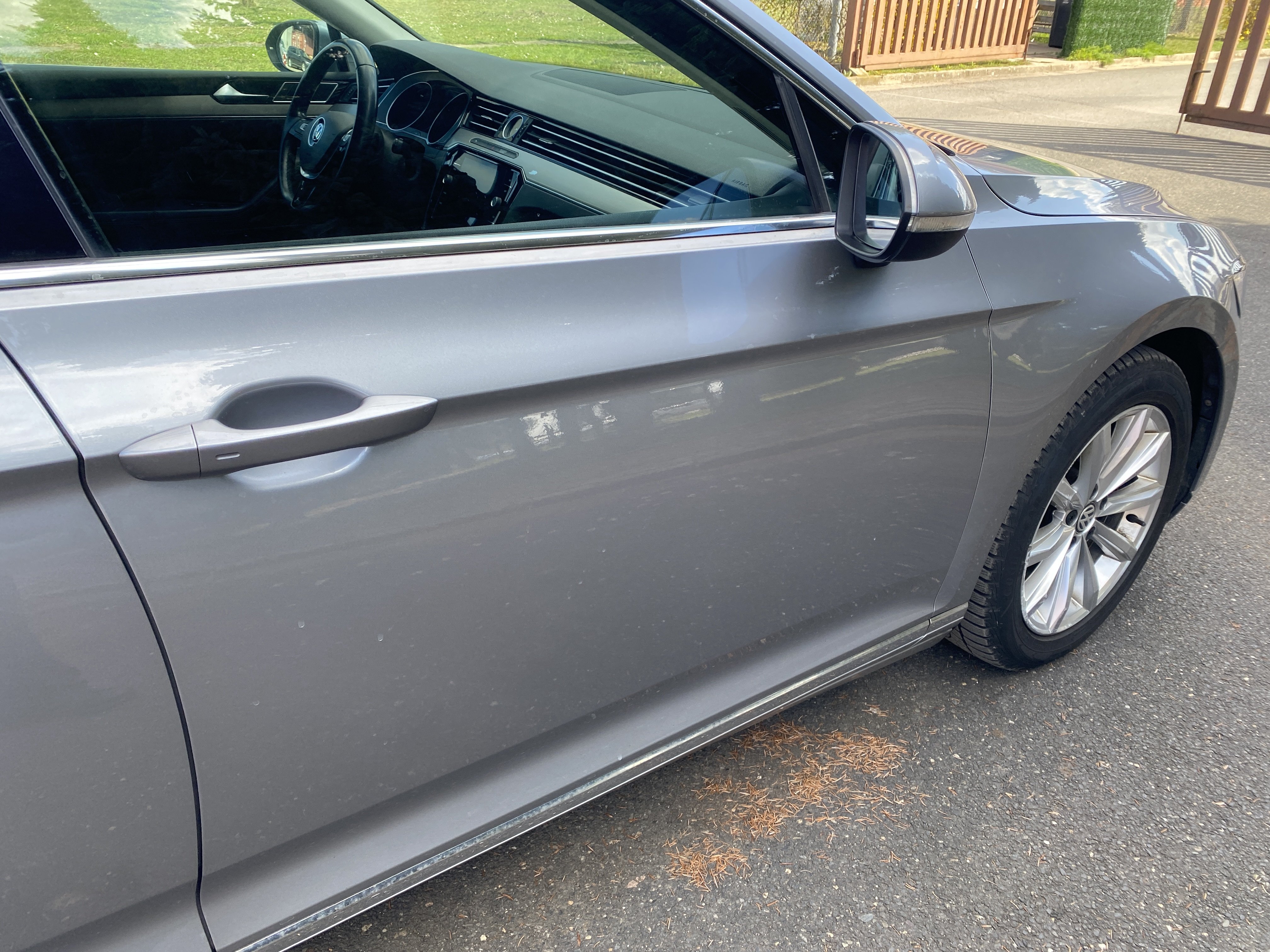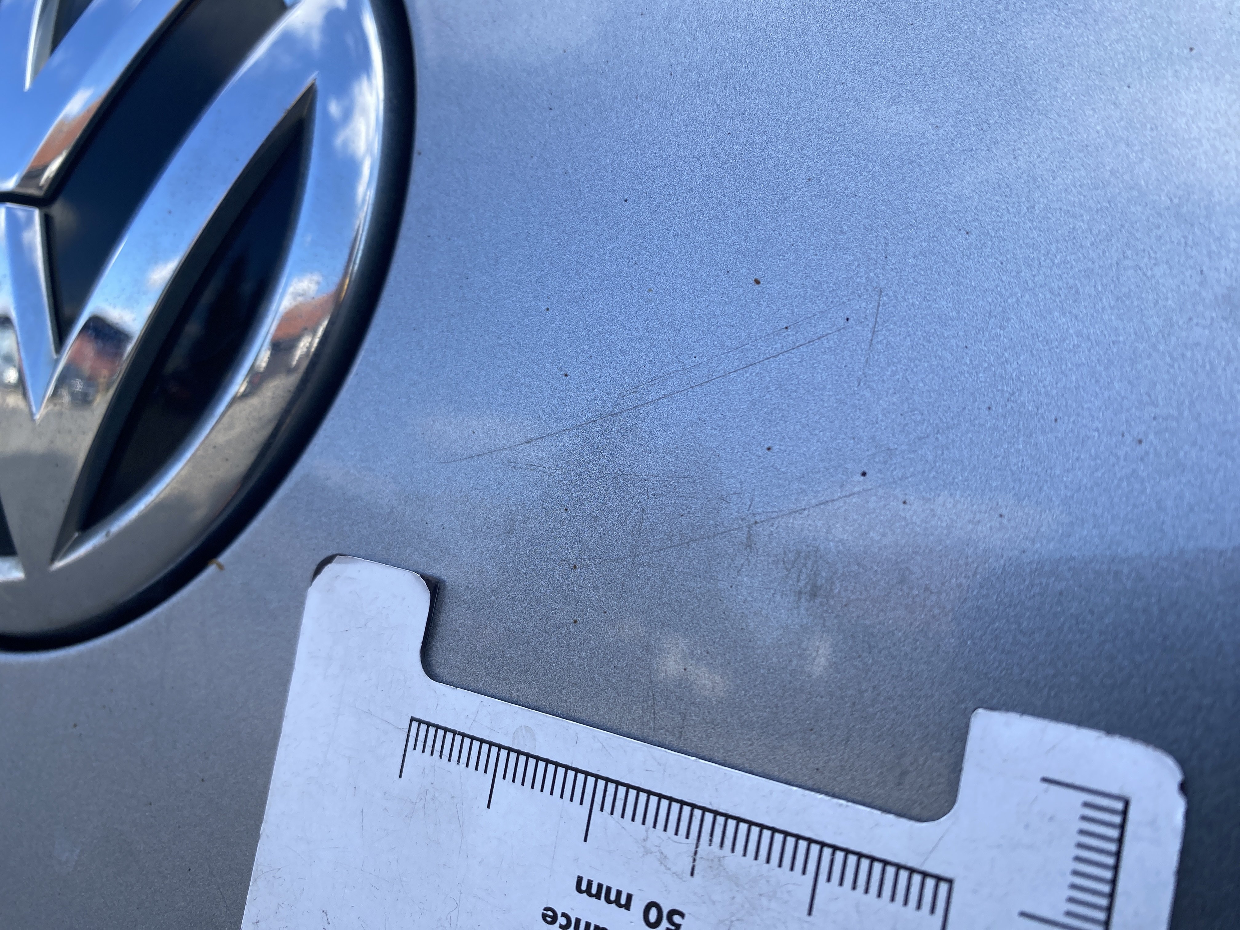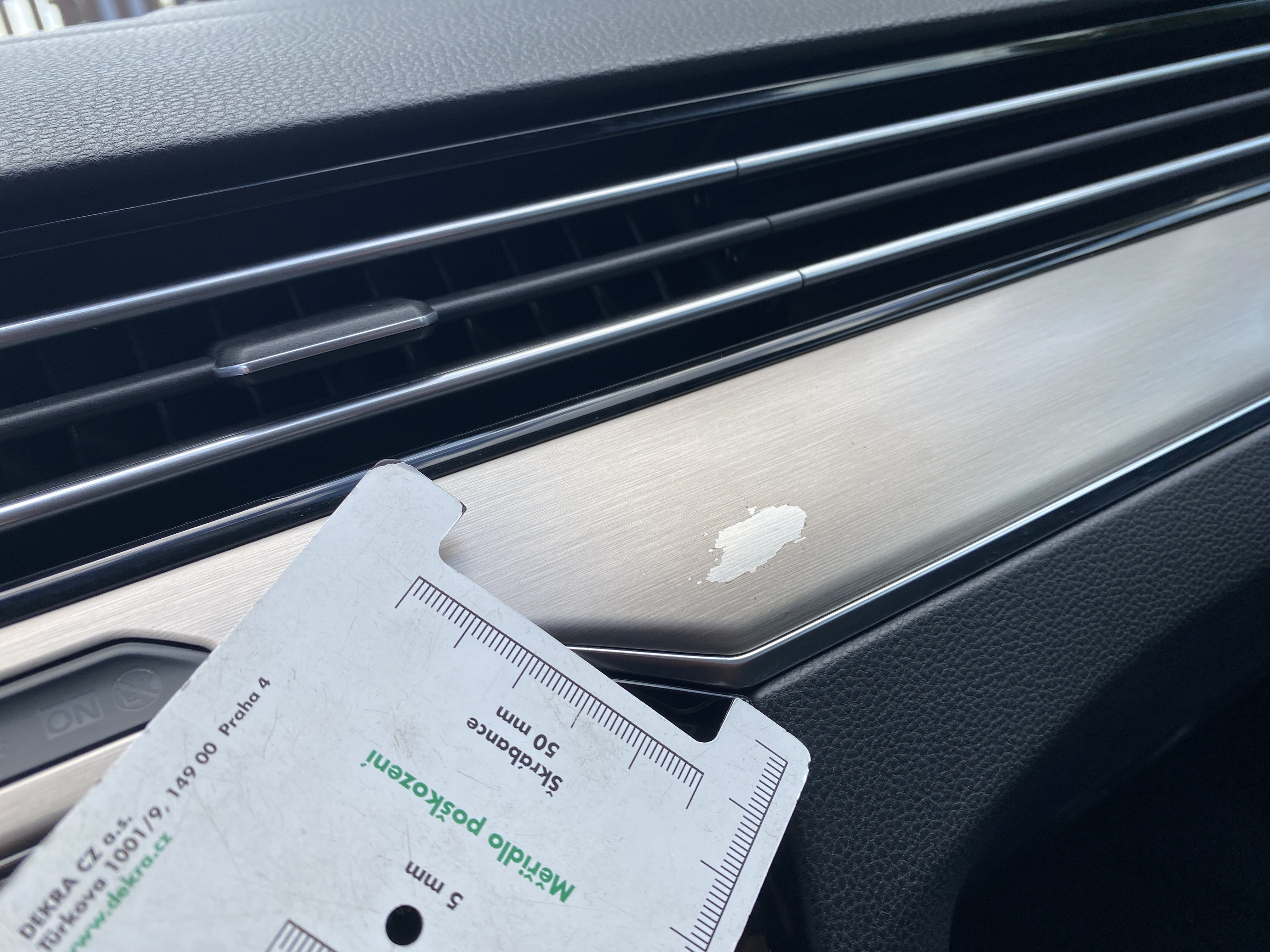Oděrky a škrábance po obvodu karosérie, přední část karosérie je poškozená od kamínků, mírně odřený lem prvého předního blatníku, mírně promáčklé víko motorového prostoru - jamka, odřený kryt levého zpětného zrcátka, odřené víko zavazadlového porstoru, odřené pravé zadní dveře, interiér poškozen,