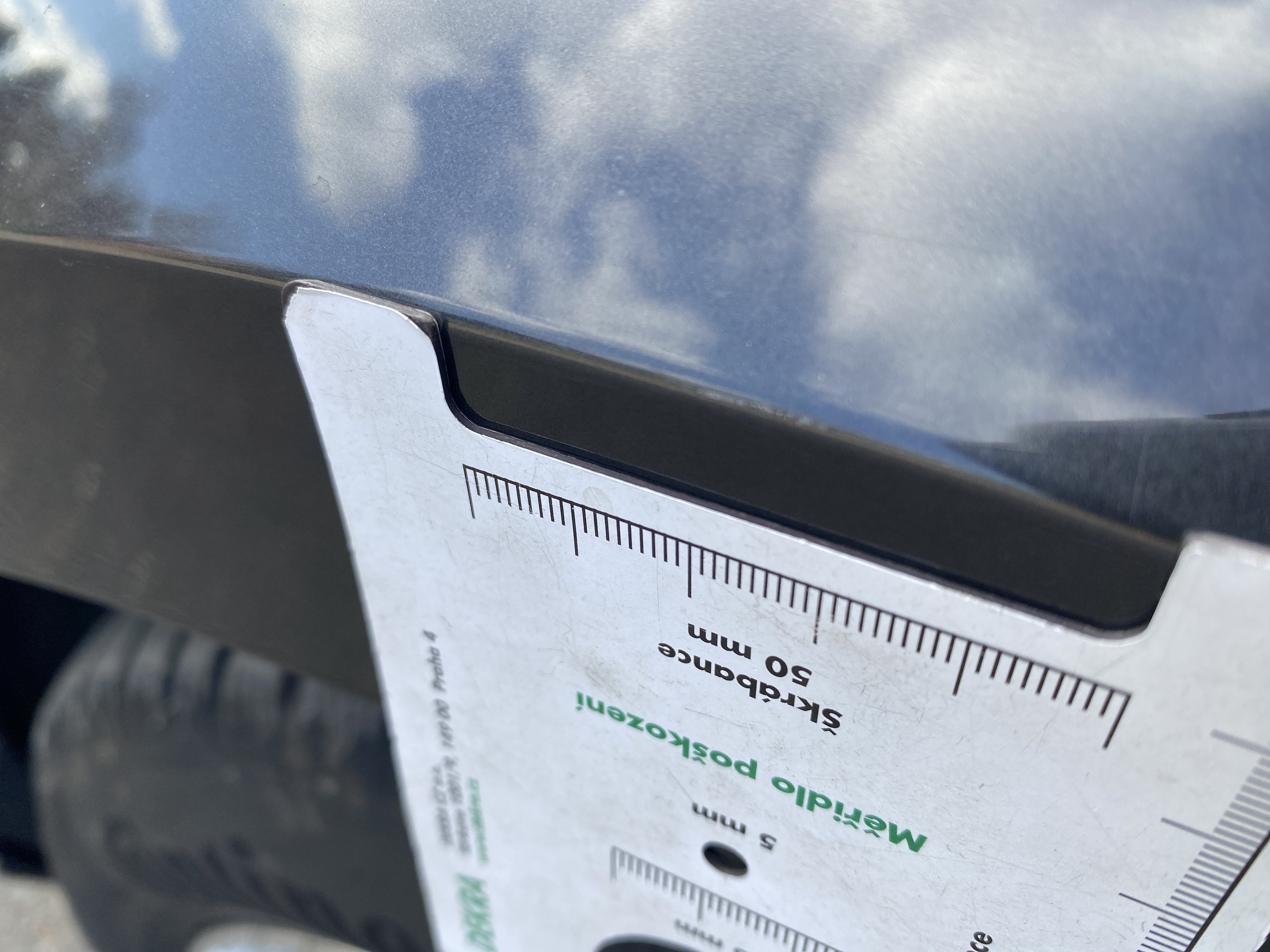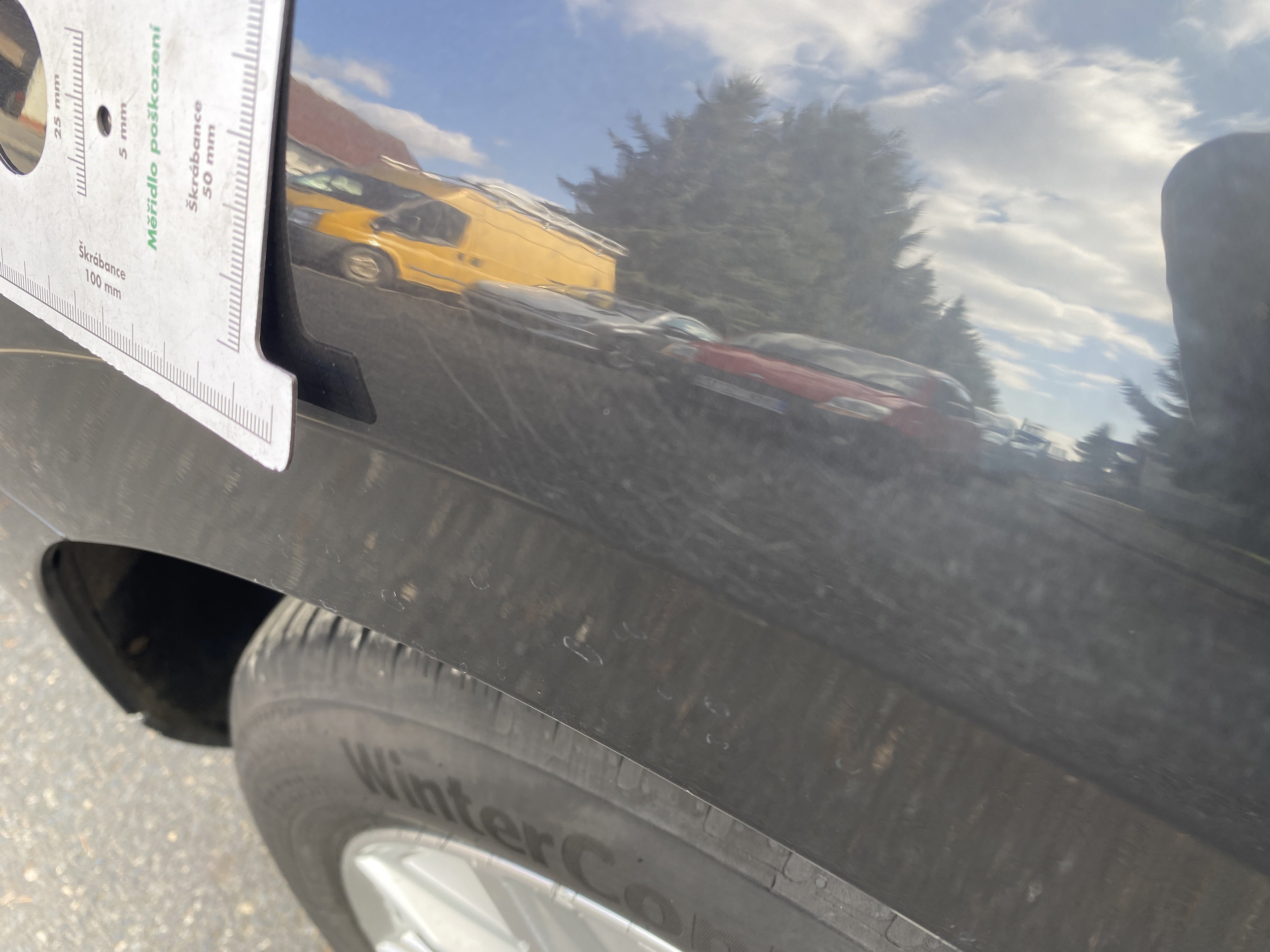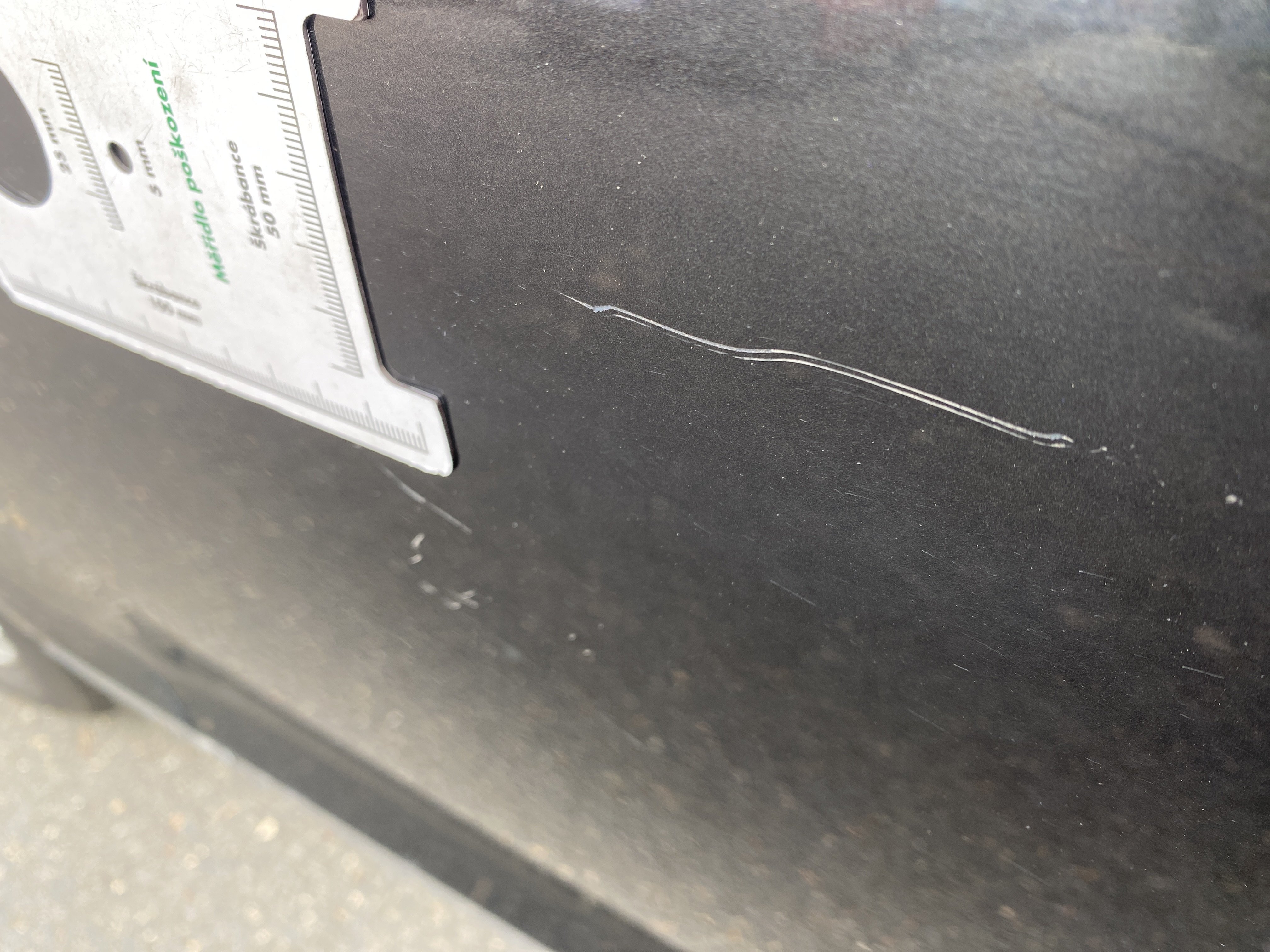 Oděrky a škrábance po obvodu karosérie, přední část karosérie je poškozená od kamínků, odřený přední nárazník, odřené a mírně promáčklé víko motorového porstoru - jamka, mírně odřený lem levého předního blatníku, promáčklý levý rám střechy - jamka, odřený zadní nárazník, mírně odřené víko zavzadlového porstoru, promáčklý spojler víka zavazadlového prostoru - jamka, odřený pravý zadní blatník, odřený pravý zadní blatník, odřené pravé zadní dveře, mírně promáčklé pravé přední dveře - jamka, odřené pravé přední dveře, interiér vozidla poškozen,