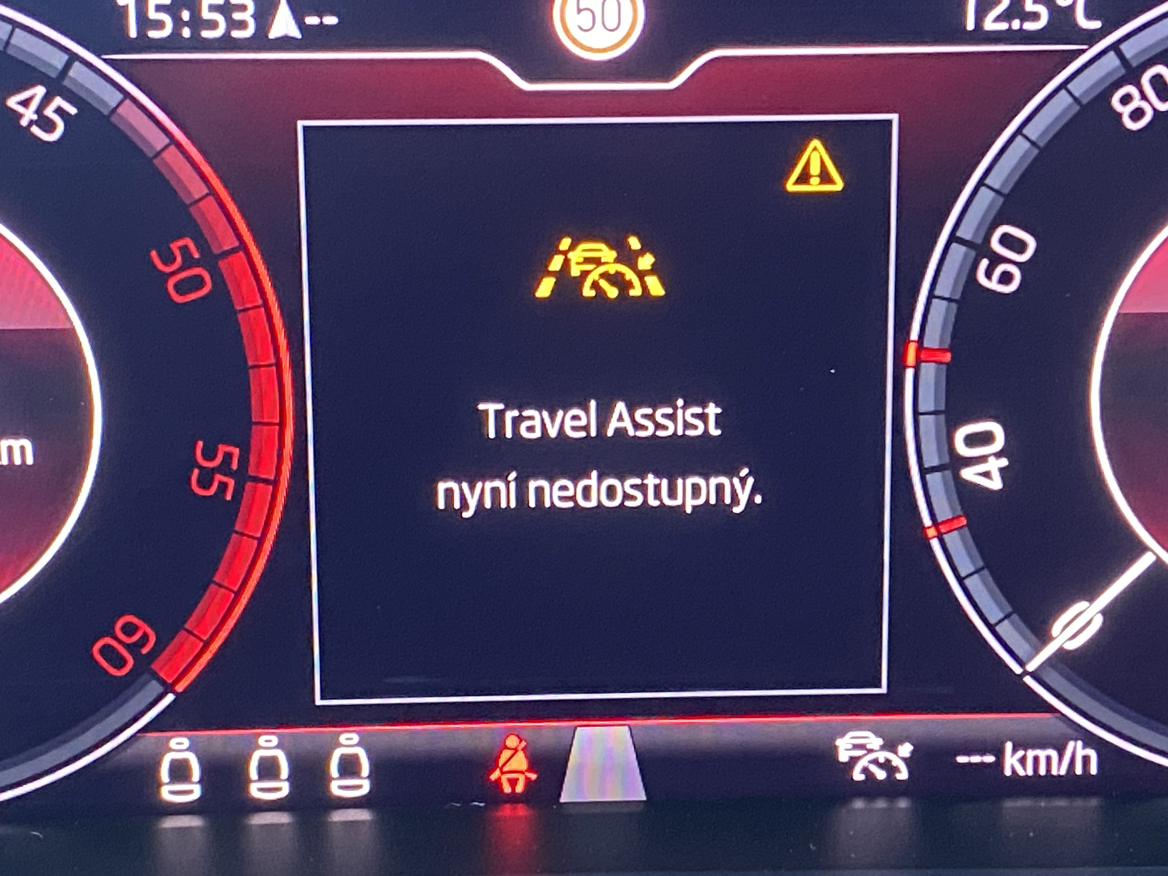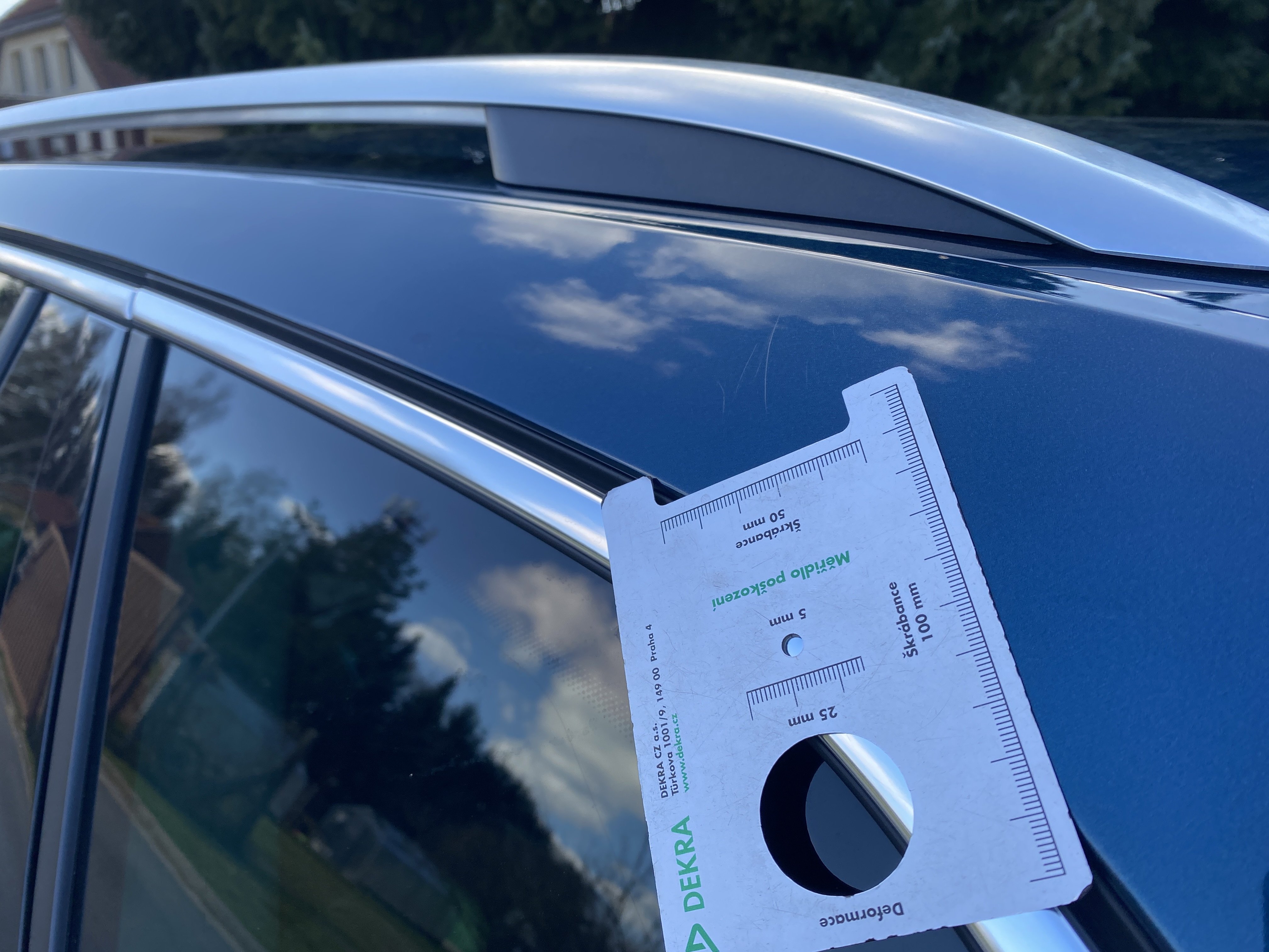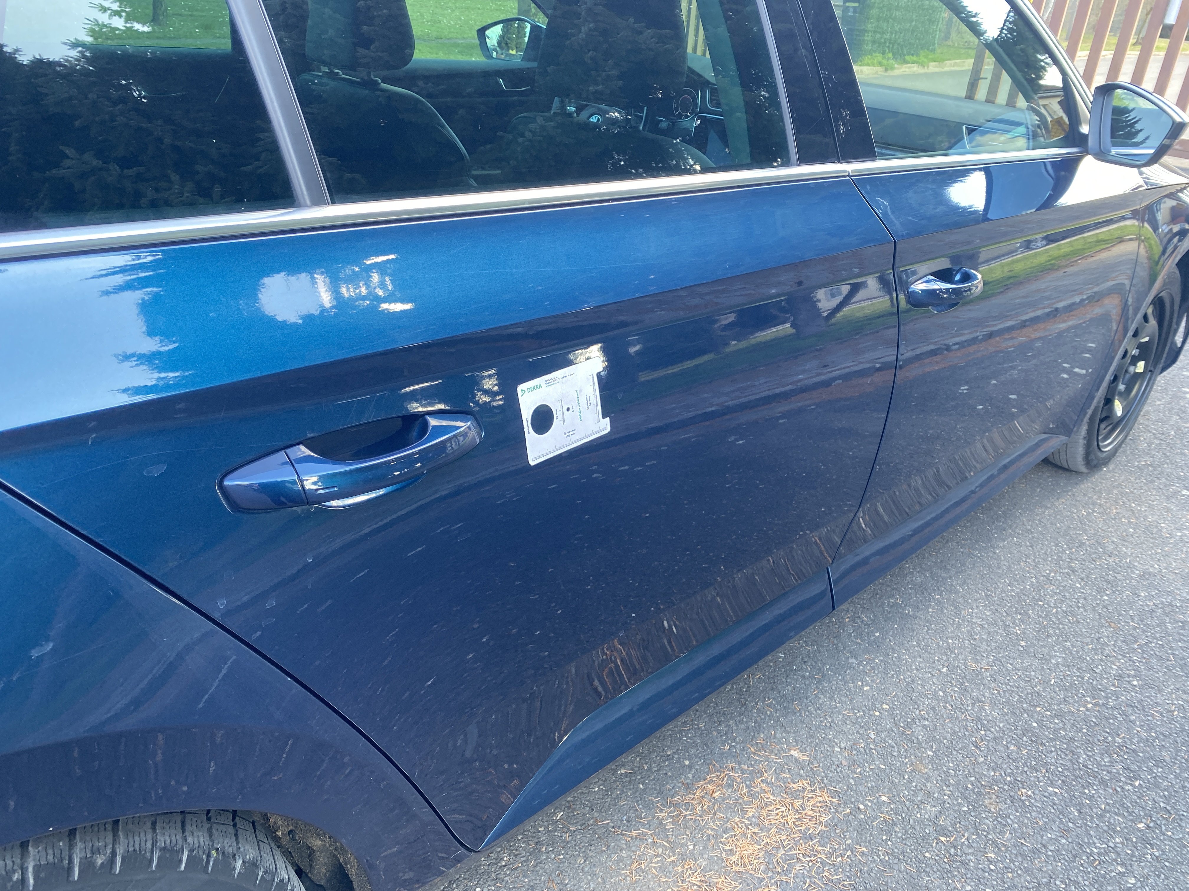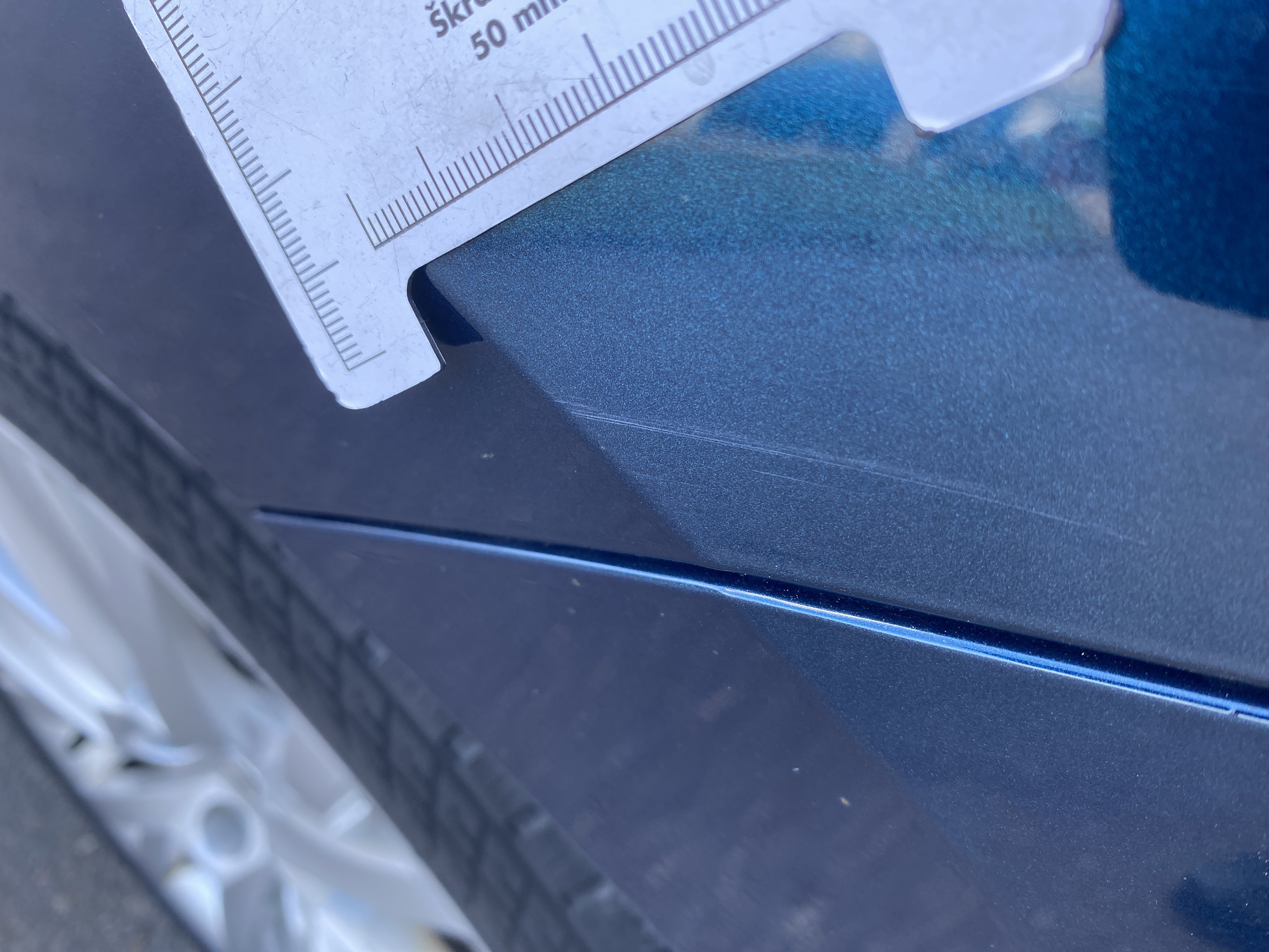 Oděrky a škrábance po obvodu karosérie, přední část karosérie je poškozená od kamínků, poškozená pravá přední pneumatika, mírně odřený pravý přední blatník, odřený přední nárazník, mírně odřené víko motorového prostoru, mírně promáčklý levý přední blatník - jamka, poškozené čelní sklo, mírně odřený levý zadní blatník, odřený levý rám střechy, odřený zadní nárazník, odřený pravý zadní blatník, odřené pravé zadní dveře, odřené pravé přední dveře, odřený kryt pravého zpětného zrcátka, svítí kontrolka travel assist, interiér vozidla opotřeben,