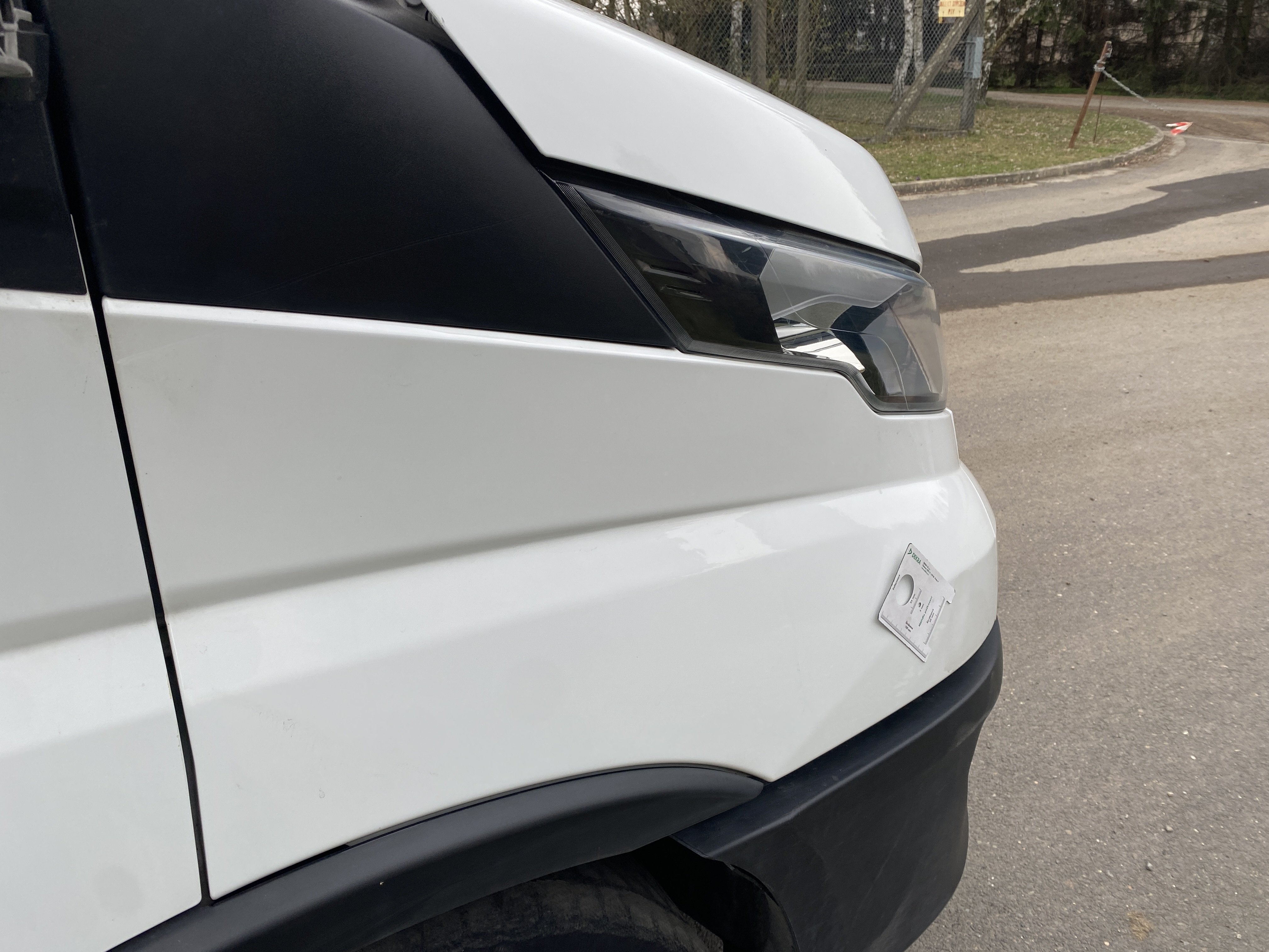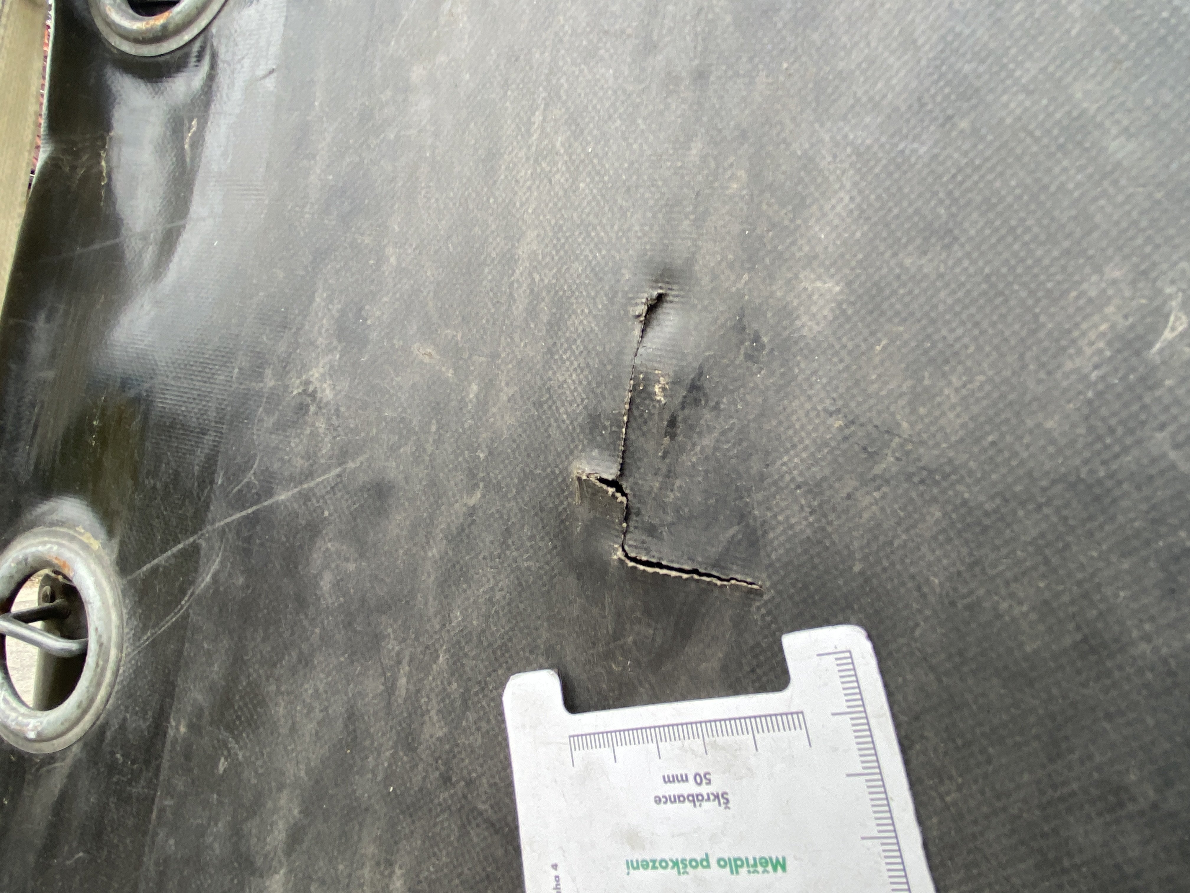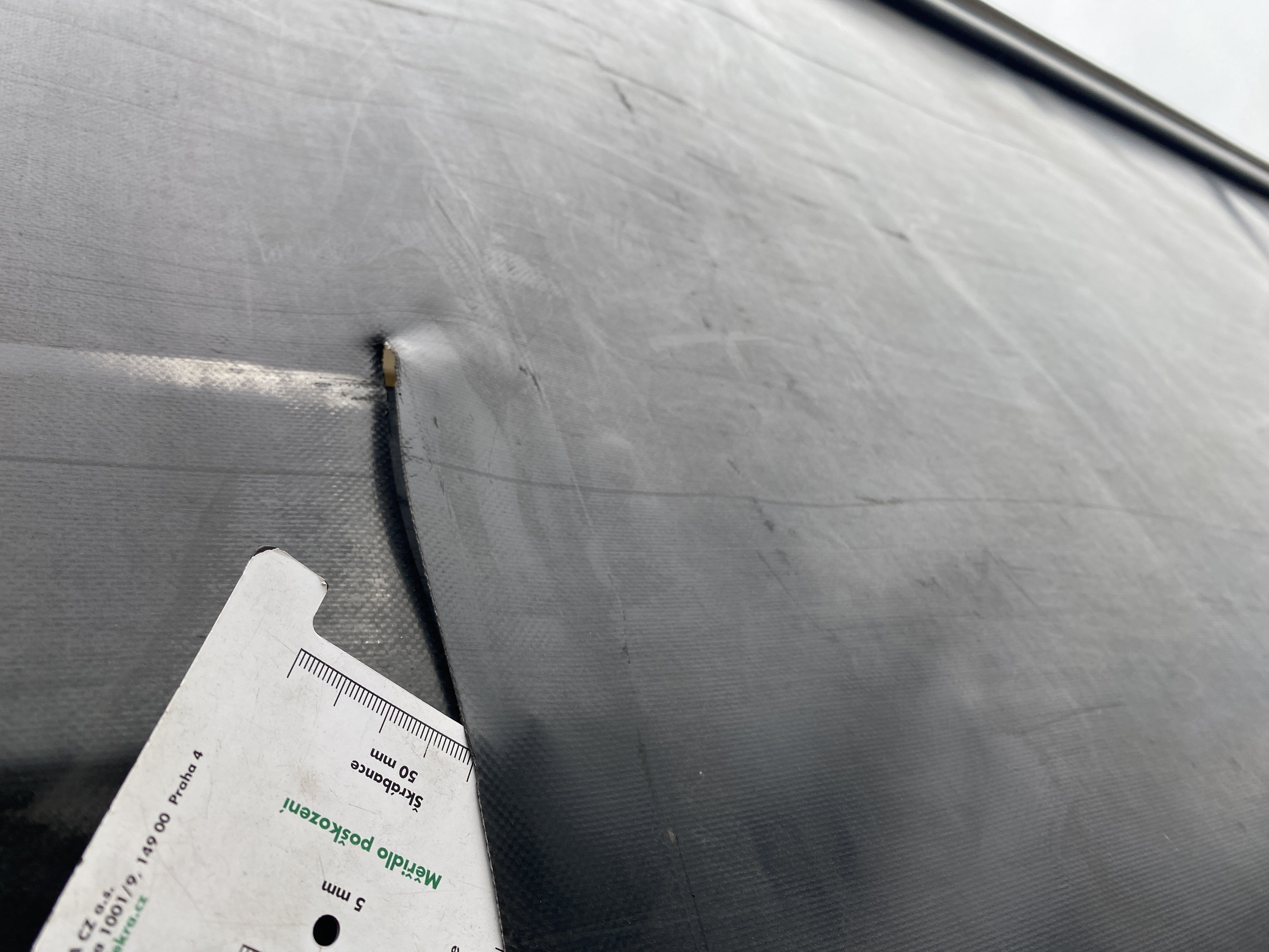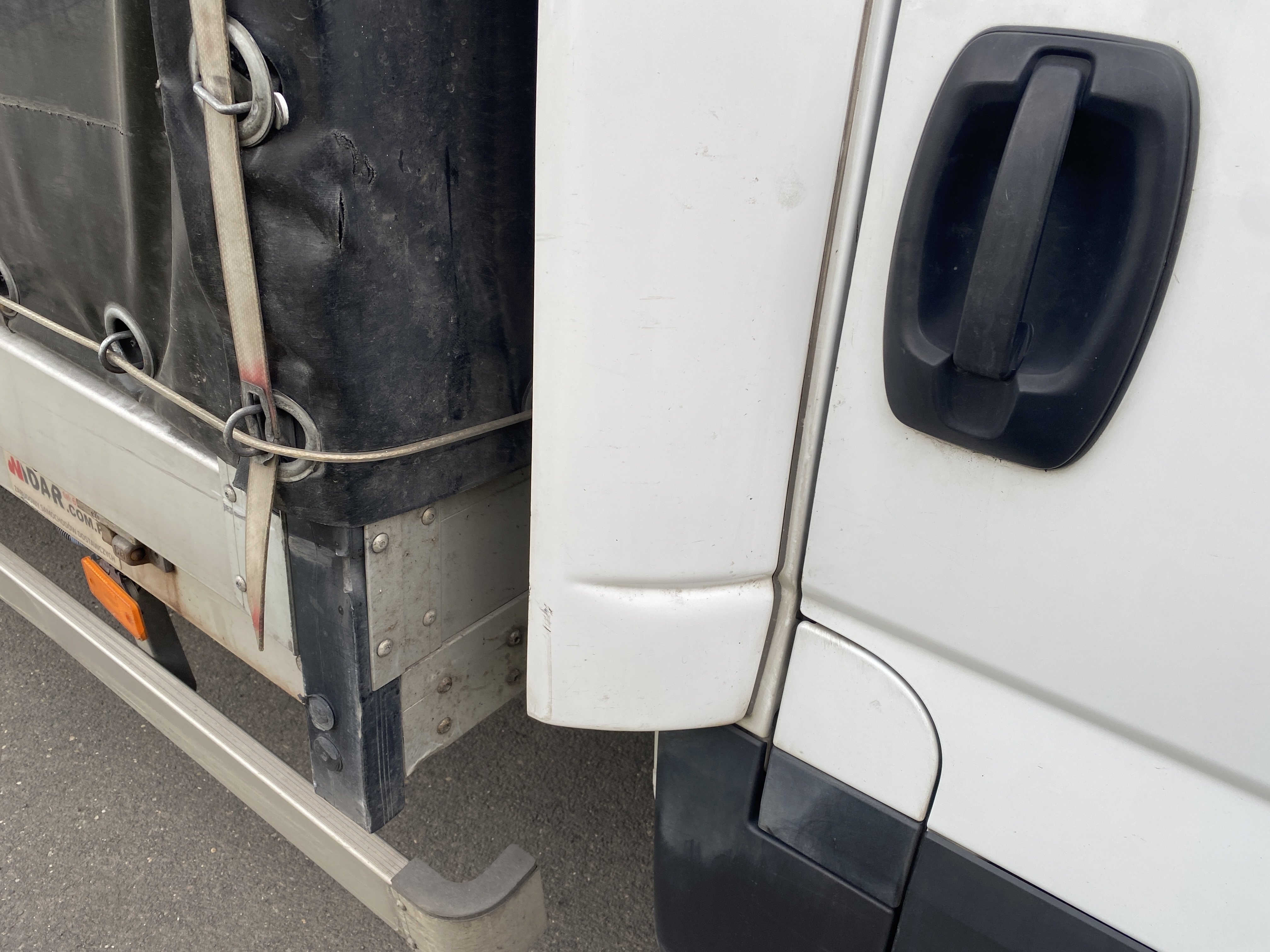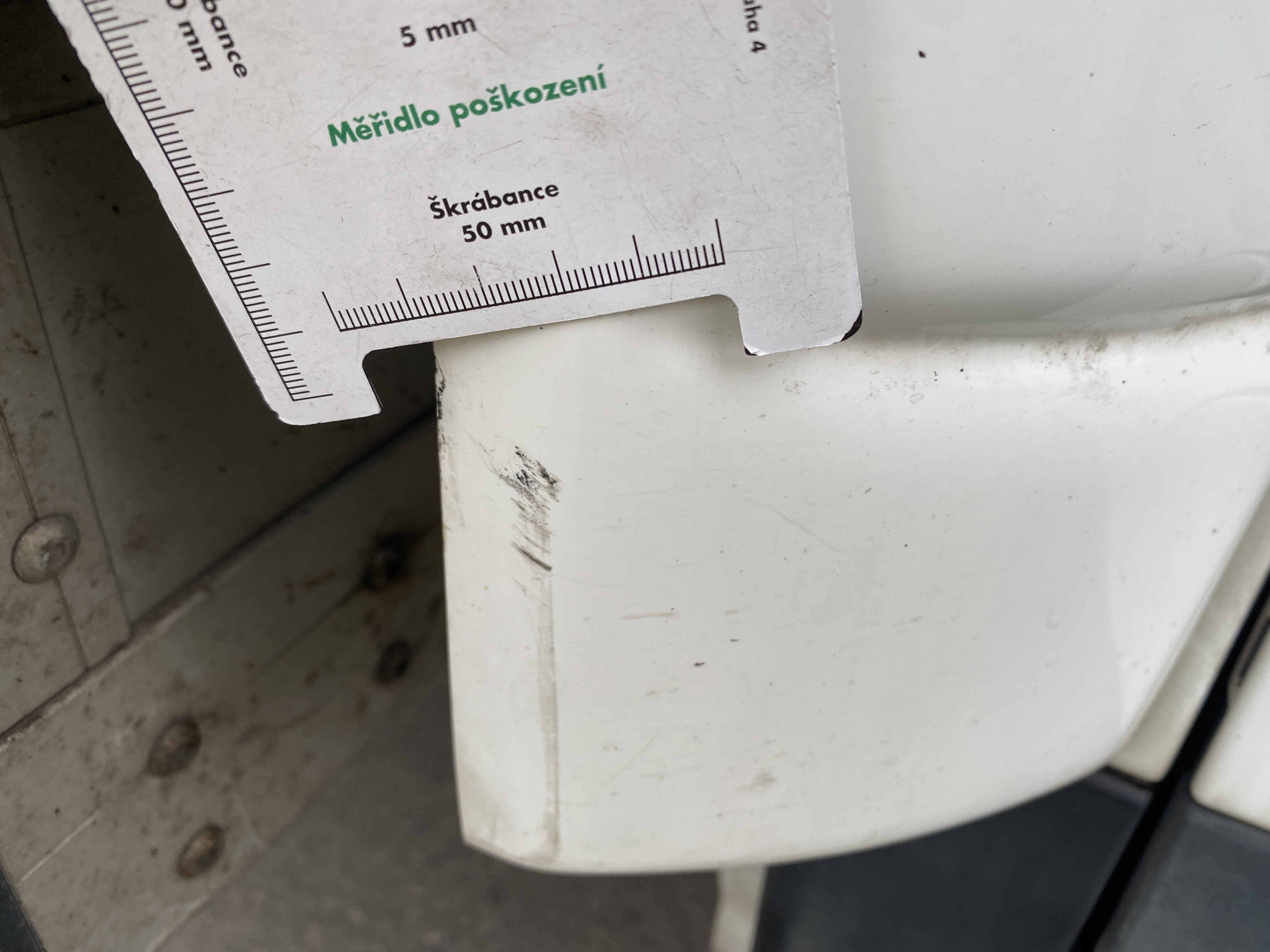 Oděrky a škrábance po obvodu karosérie, přední část karosérie je poškozená od kamínků, odřený pravý přední blatník, odřený přední nárazník, odřené víko motorového prostoru, poškozené čelní sklo, chybí plastový kryt levého zpětného zrcátka, odřené levé přední dveře, poškozená a roztžená plachta levé bočnice vozu, poškozené zadní čelo karoserie, roztržená plachta pravé bočnice vozu, chybí plastové víko bočního úložného prostoru, odřené pravé přední dveře, prasklý plastový kryt pravého zpětného zrcátka, prasklé sklo pravého zpětného zrcátka, poškozený sedák sedadla spolujezdce, poškozená elektroinstalace sedadla spolujezdce, ulomená přihrádka úložného prostoru spolujezdce, chybí plastový kryt baterie, chybí kryt pojistkové skříně, svítí kontrolka ABS, palubní počítač hklásí servisní intrval, svítí kontrolka ASR, svítí kontrolka ESP, poškozen akumulátor, interiér vozidla poškozen,