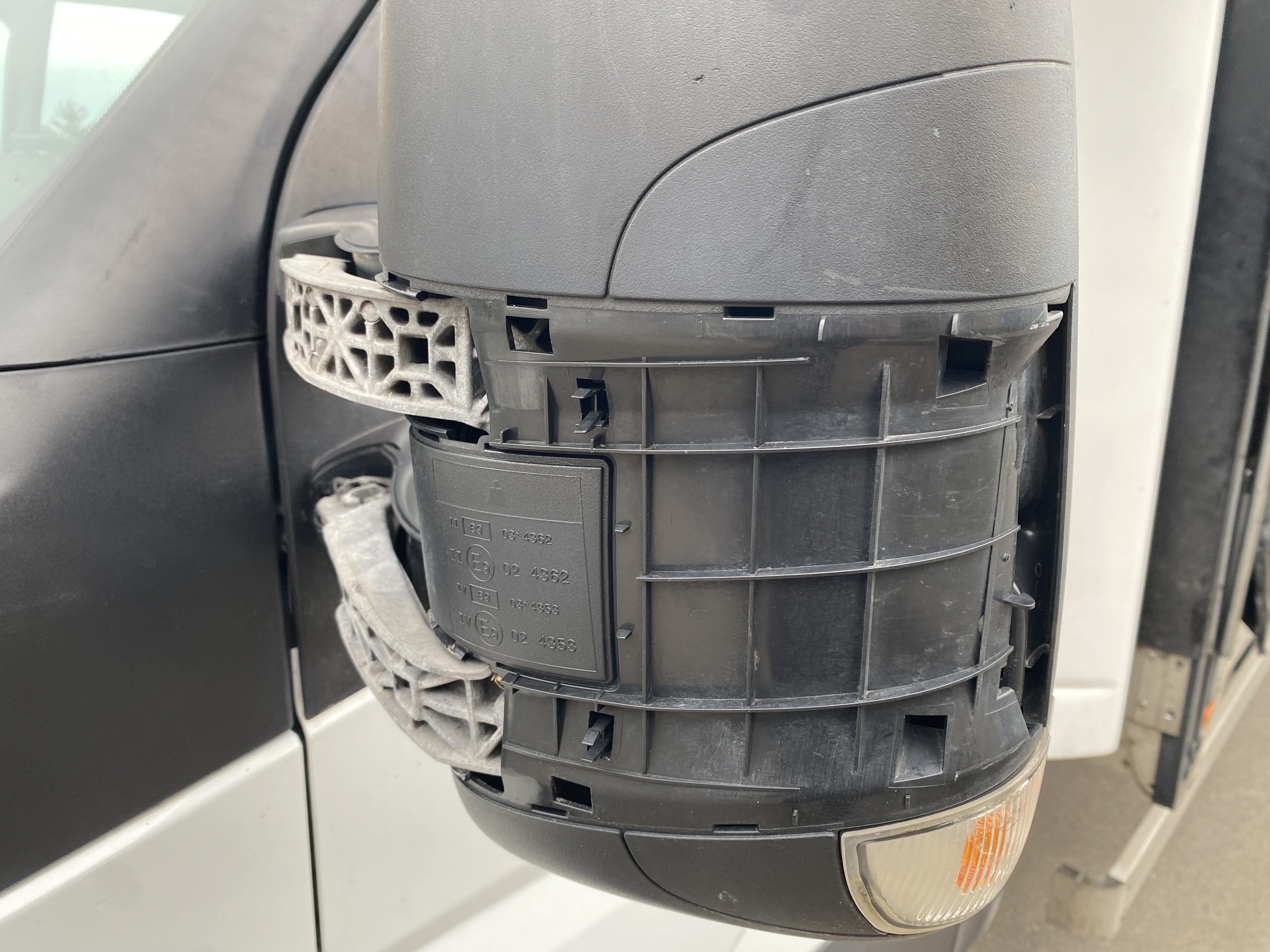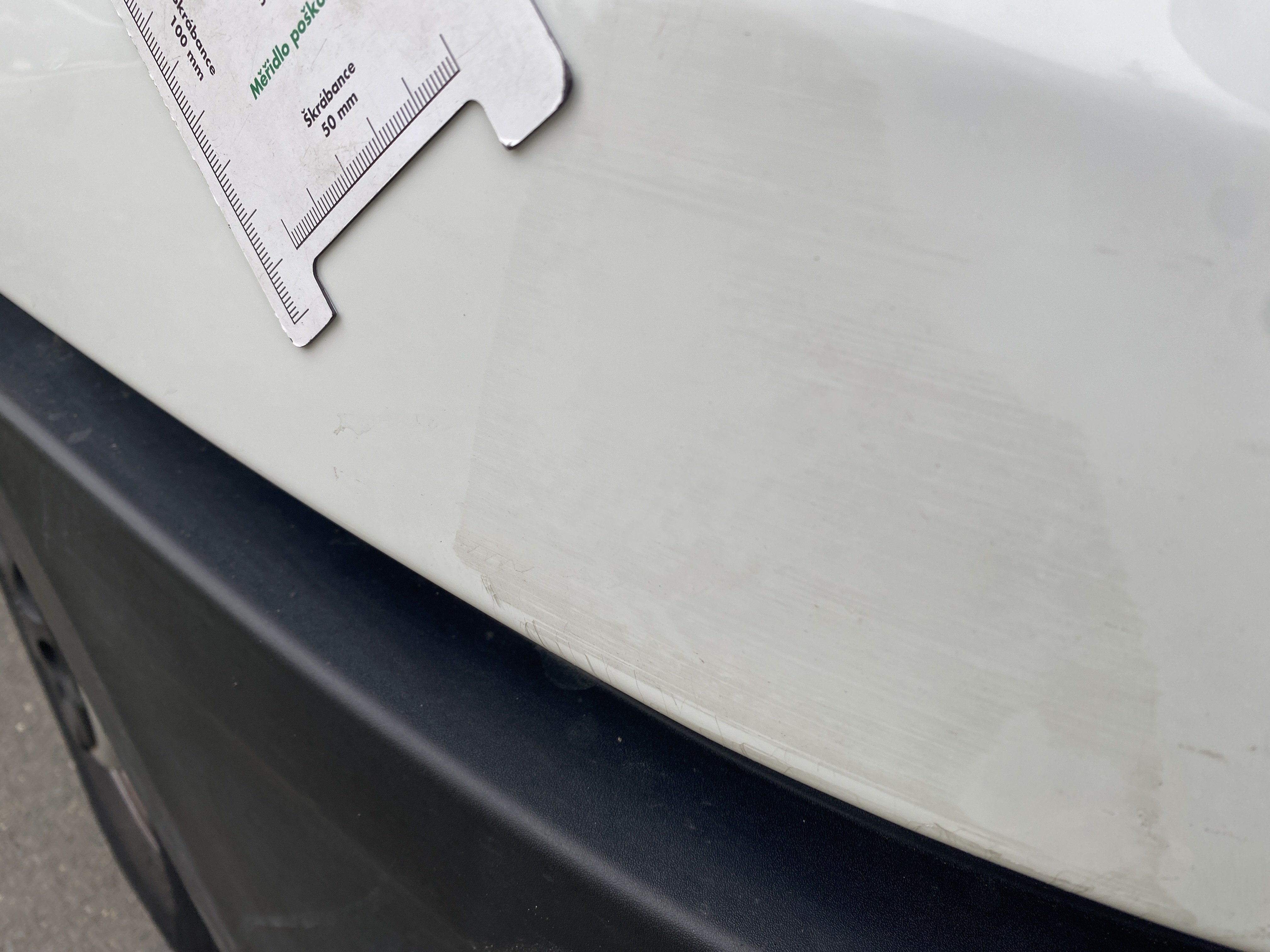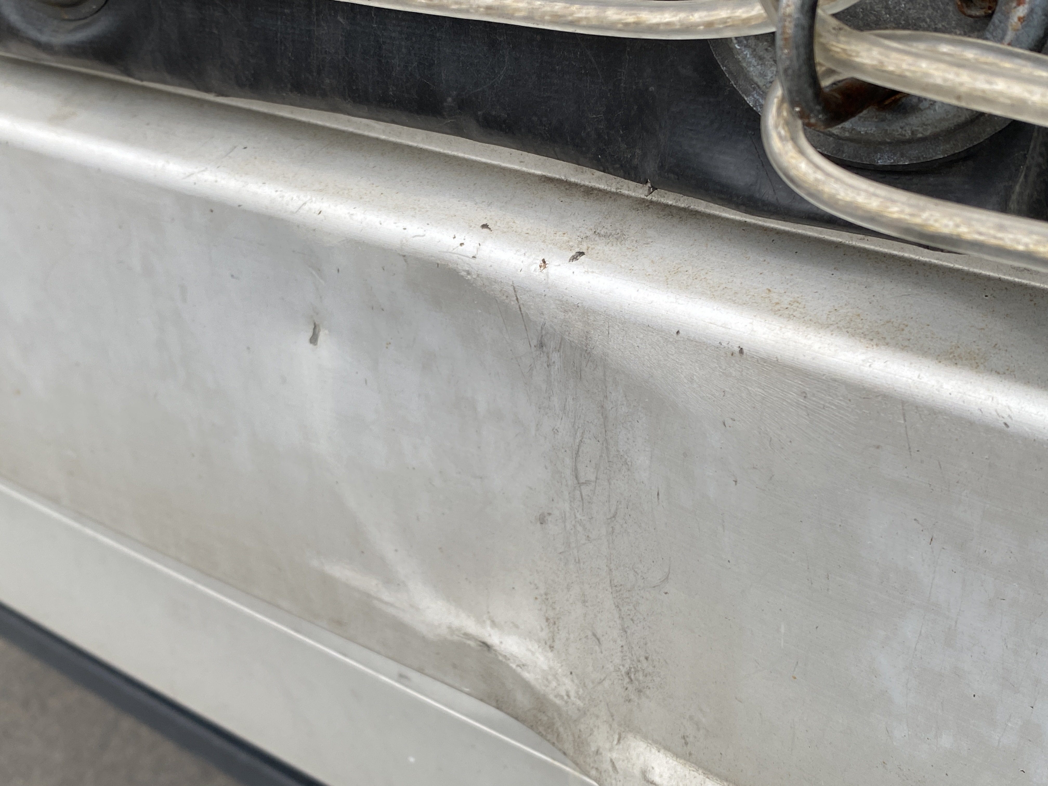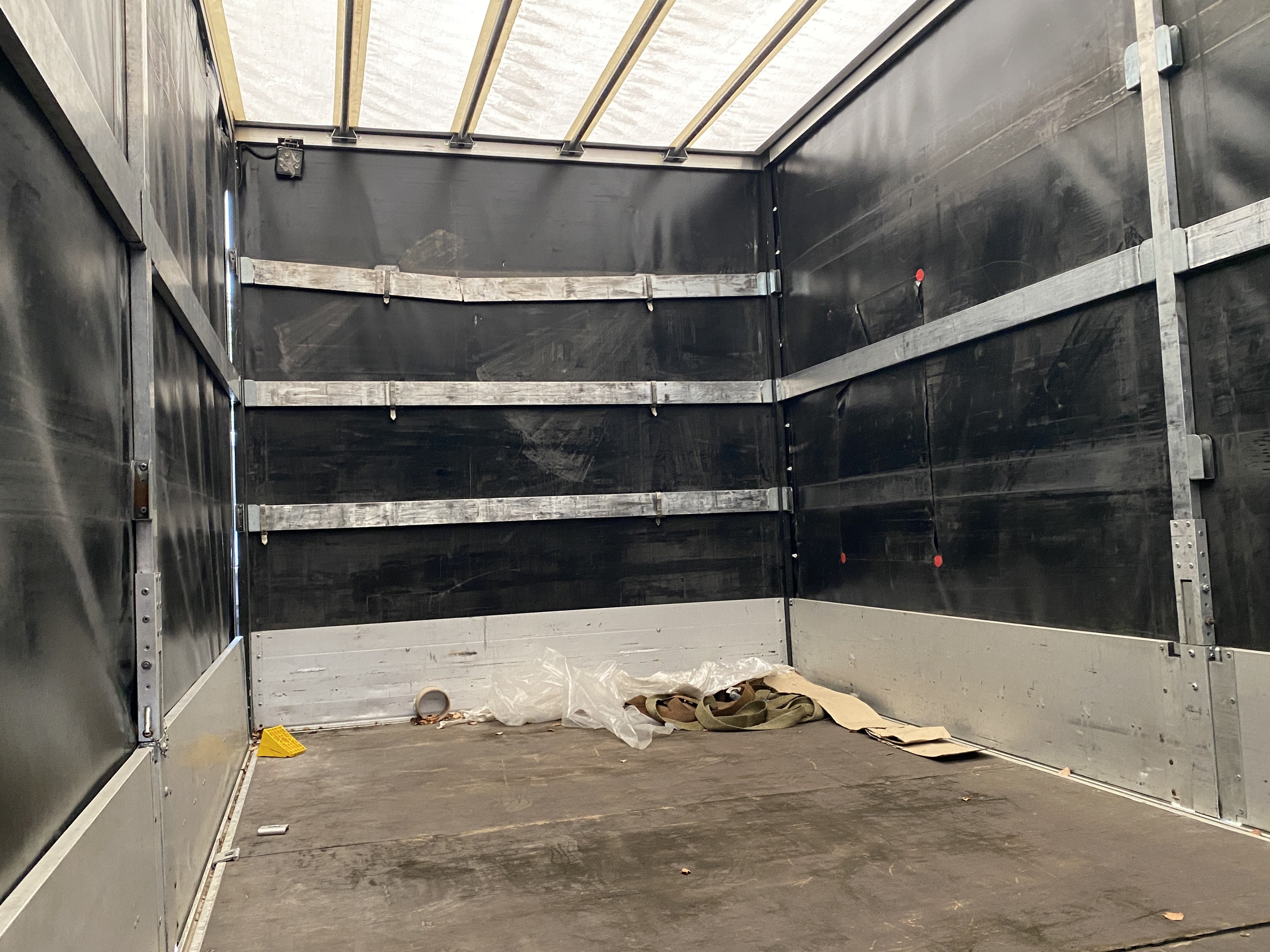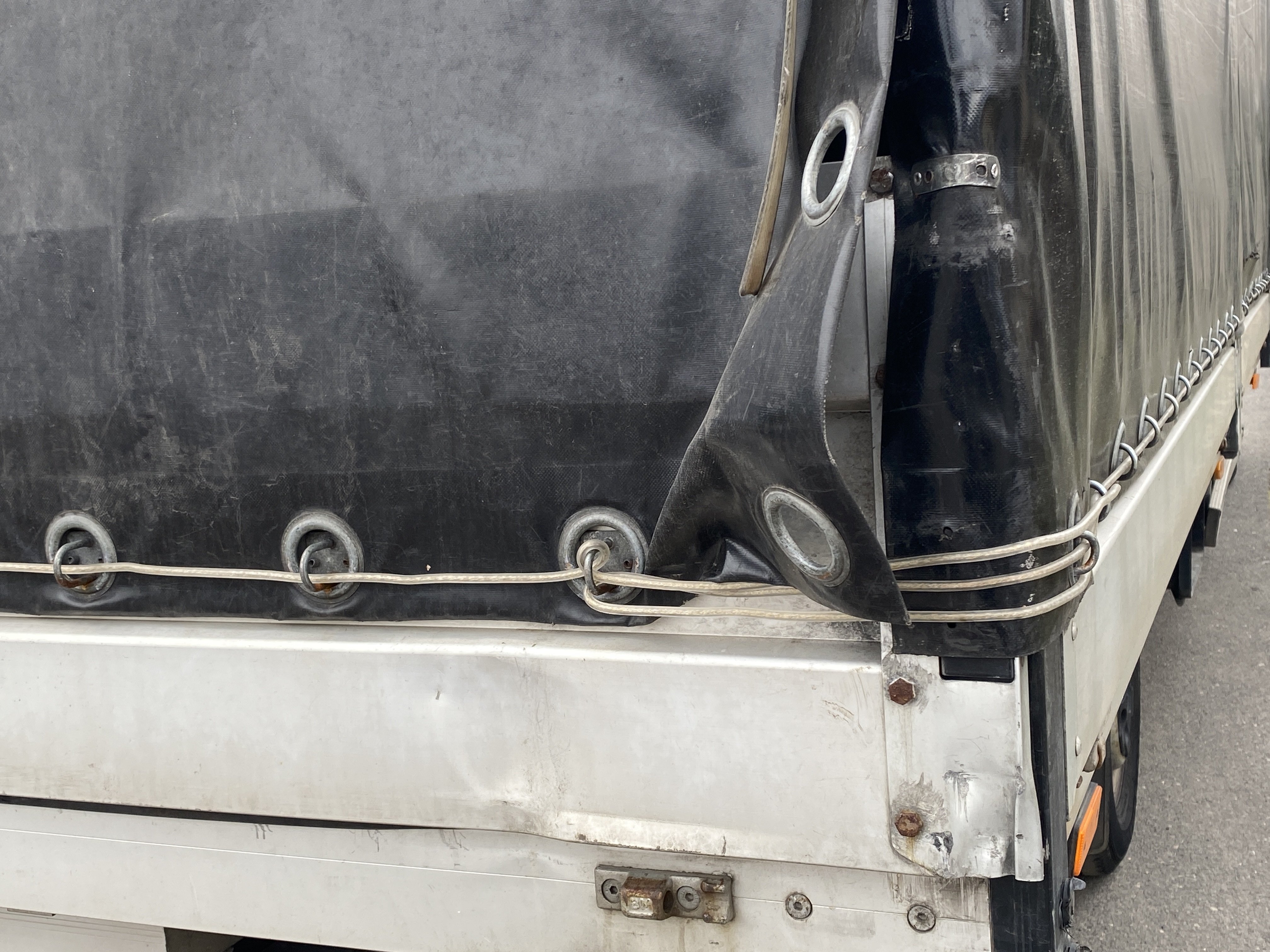 Oděrky a škrábance po obvodu karosérie, přední část karosérie je poškozená od kamínků, odřený pravý přední blatník, odřený přední nárazník, odřené víko motorového prostoru, poškozené čelní sklo, chybí plastový kryt levého zpětného zrcátka, odřené levé přední dveře, poškozená a roztžená plachta levé bočnice vozu, poškozené zadní čelo karoserie, roztržená plachta pravé bočnice vozu, chybí plastové víko bočního úložného prostoru, odřené pravé přední dveře, prasklý plastový kryt pravého zpětného zrcátka, prasklé sklo pravého zpětného zrcátka, poškozený sedák sedadla spolujezdce, poškozená elektroinstalace sedadla spolujezdce, ulomená přihrádka úložného prostoru spolujezdce, chybí plastový kryt baterie, chybí kryt pojistkové skříně, svítí kontrolka ABS, palubní počítač hklásí servisní intrval, svítí kontrolka ASR, svítí kontrolka ESP, poškozen akumulátor, interiér vozidla poškozen,