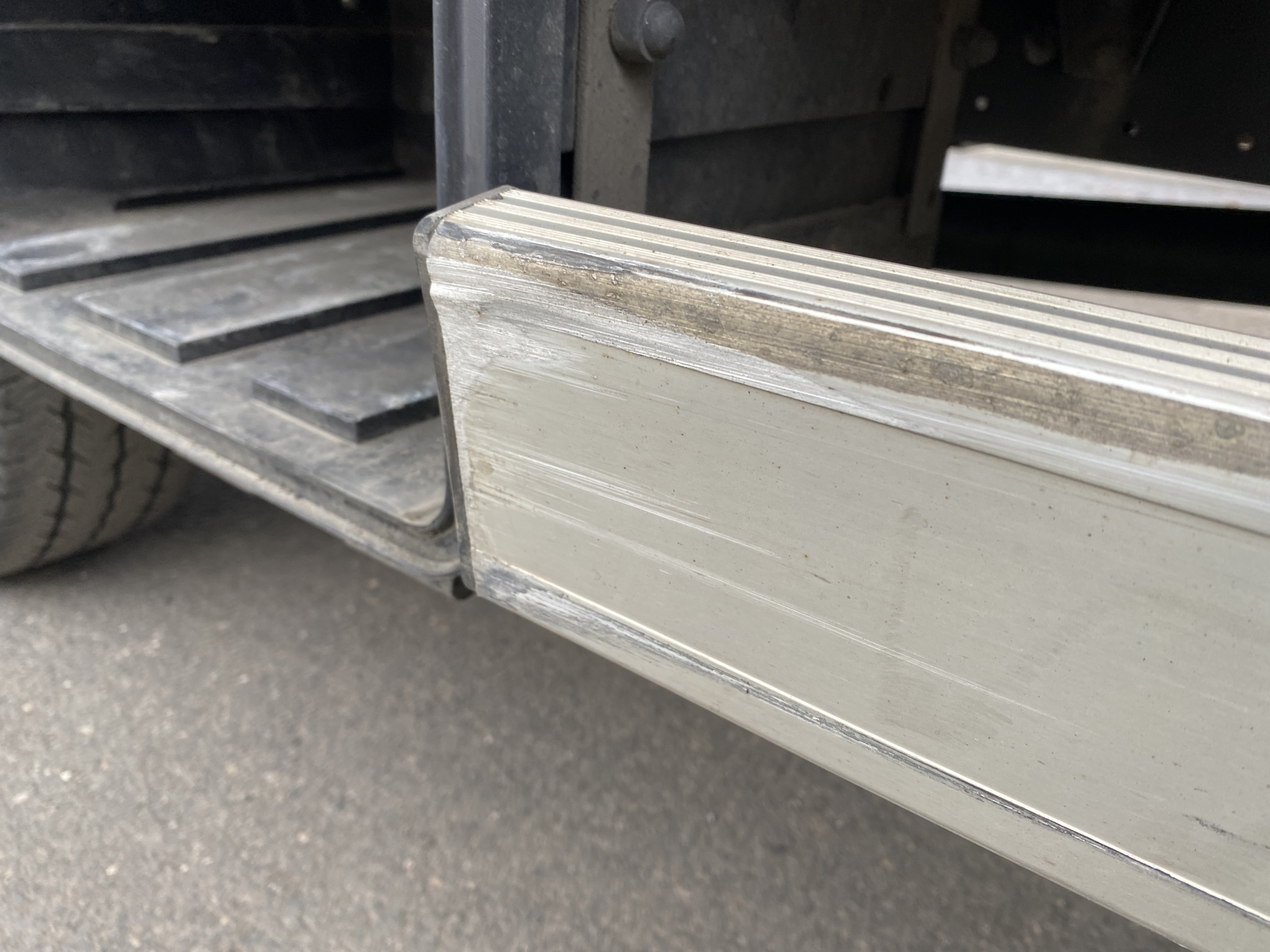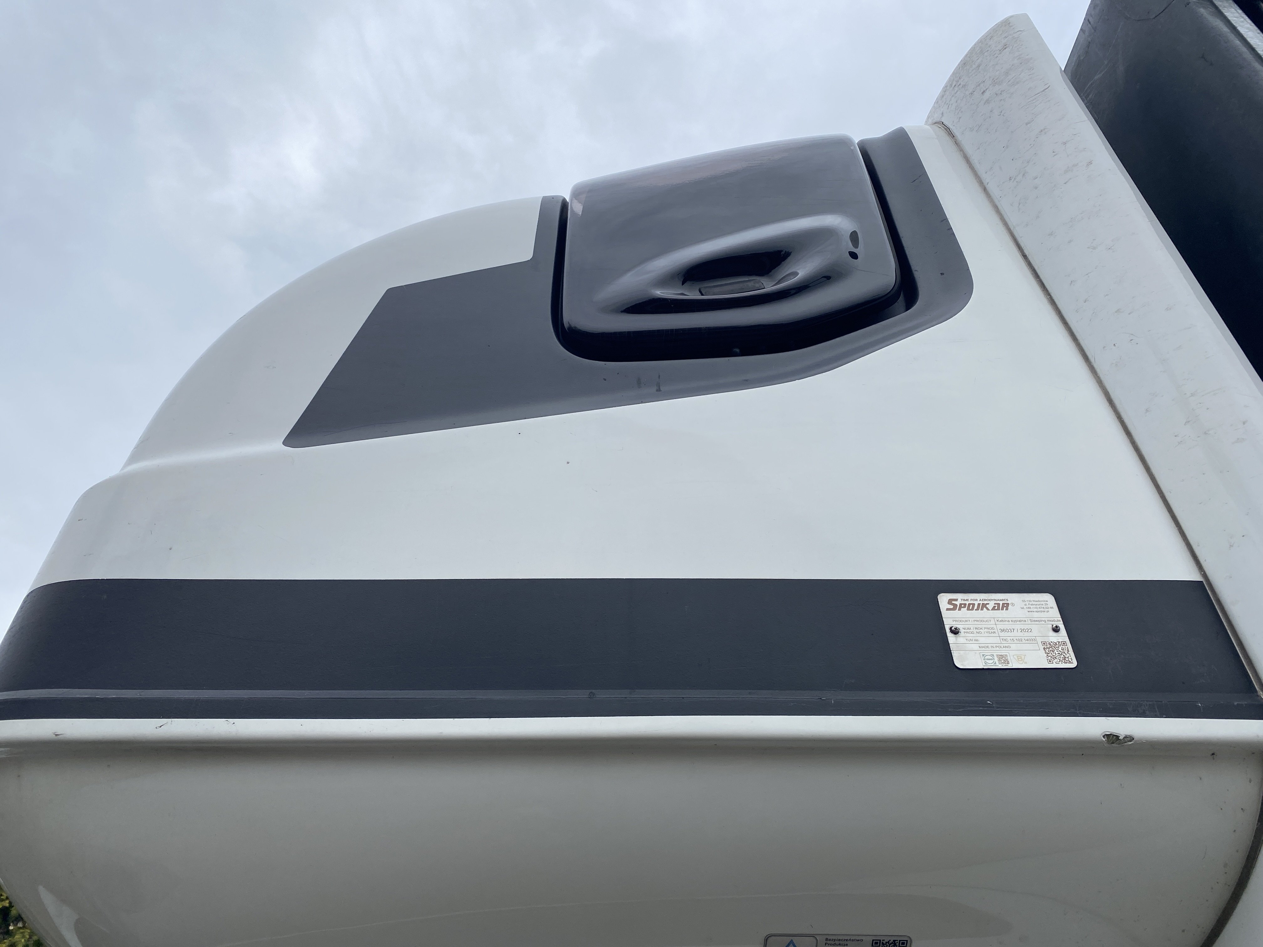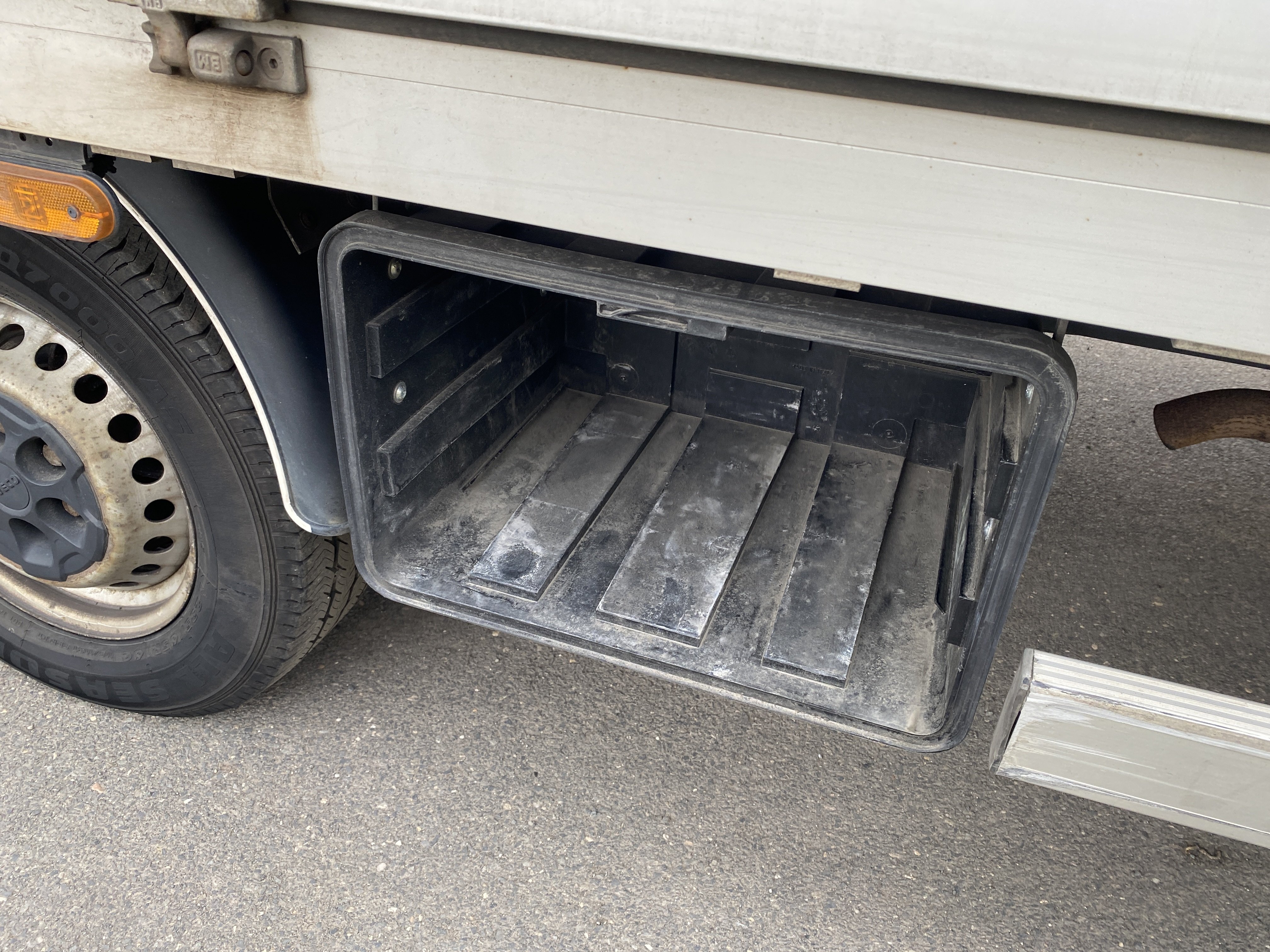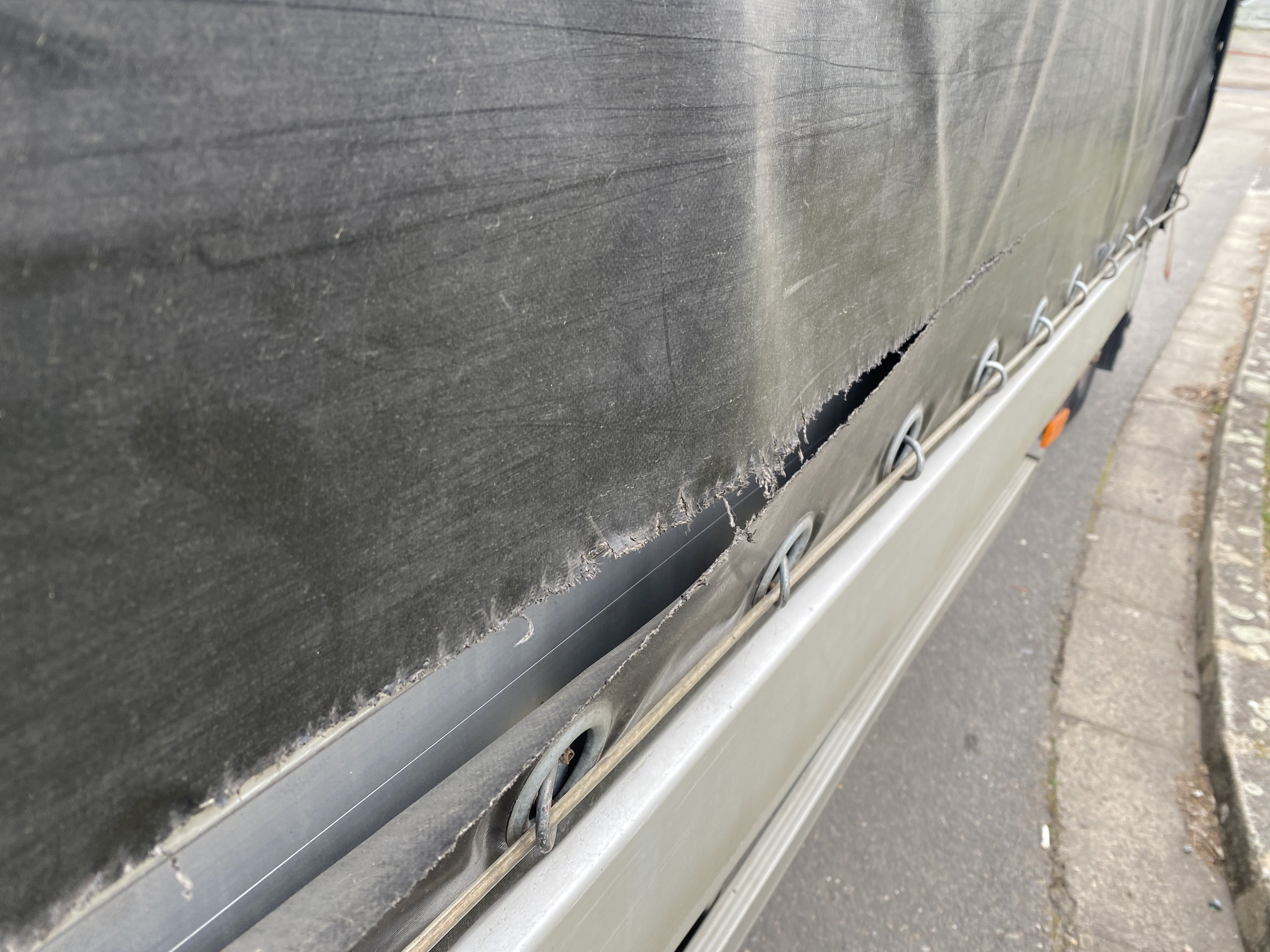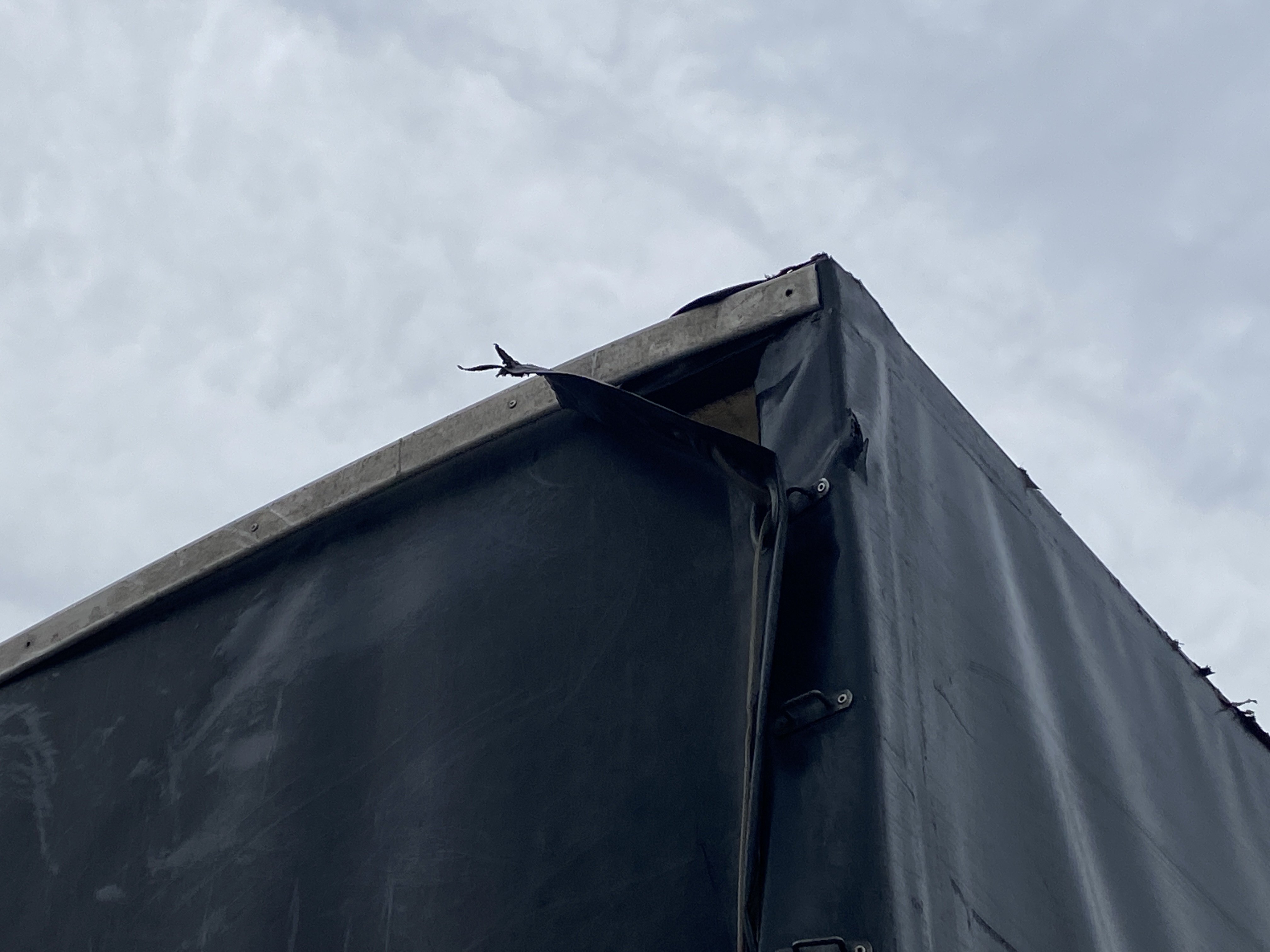 Oděrky a škrábance po obvodu karosérie, přední část karosérie je poškozená od kamínků, odřený pravý přední blatník, odřený přední nárazník, odřené víko motorového prostoru, poškozené čelní sklo, chybí plastový kryt levého zpětného zrcátka, odřené levé přední dveře, poškozená a roztžená plachta levé bočnice vozu, poškozené zadní čelo karoserie, roztržená plachta pravé bočnice vozu, chybí plastové víko bočního úložného prostoru, odřené pravé přední dveře, prasklý plastový kryt pravého zpětného zrcátka, prasklé sklo pravého zpětného zrcátka, poškozený sedák sedadla spolujezdce, poškozená elektroinstalace sedadla spolujezdce, ulomená přihrádka úložného prostoru spolujezdce, chybí plastový kryt baterie, chybí kryt pojistkové skříně, svítí kontrolka ABS, palubní počítač hklásí servisní intrval, svítí kontrolka ASR, svítí kontrolka ESP, poškozen akumulátor, interiér vozidla poškozen,