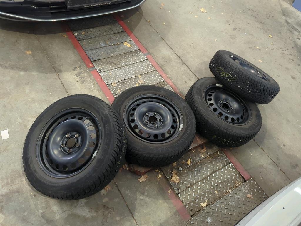 4x zimné pneumatiky na plechových diskoch, uložené vo vozidle.