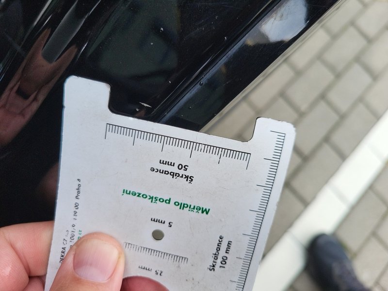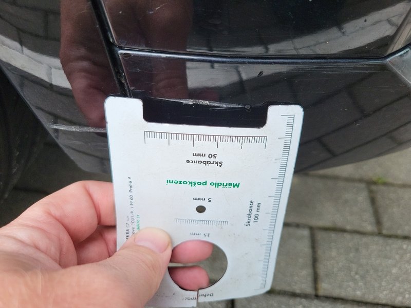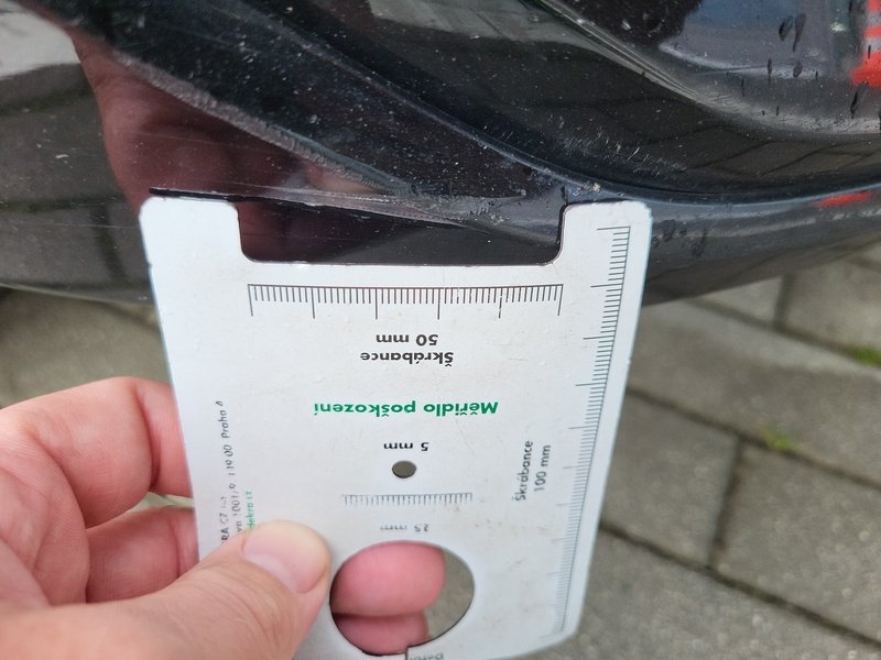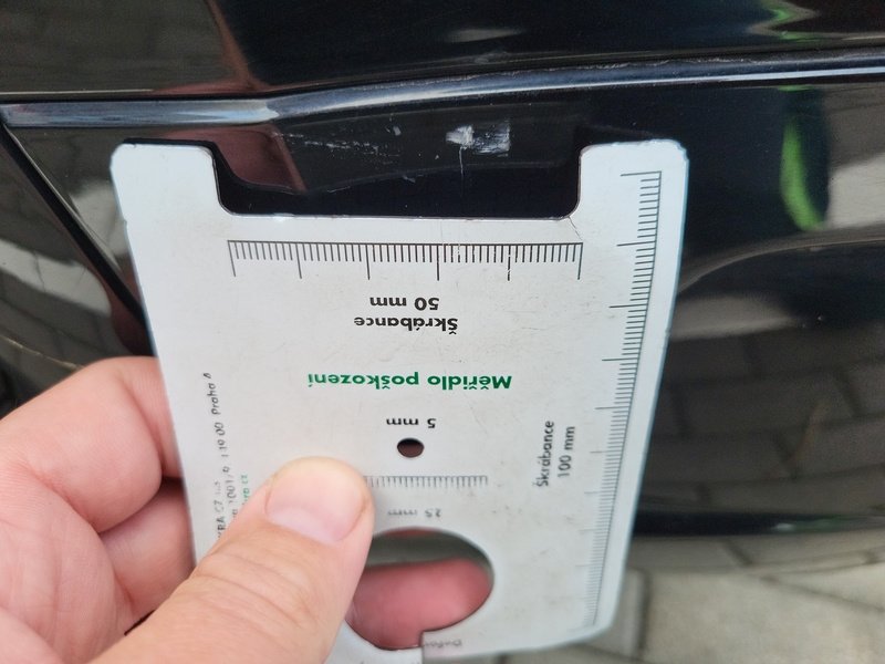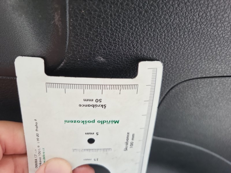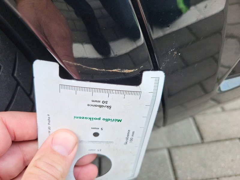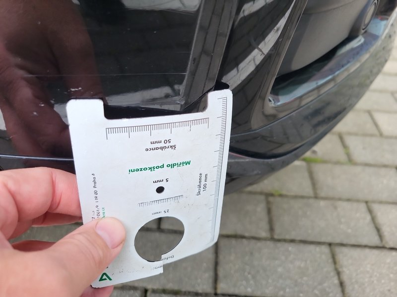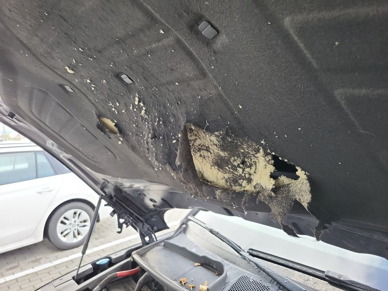 Oděrky a škrábance po obvodu karosérie, přední část karosérie je poškozená od kamínků, poškozené čelní sklo, odřený lem kola pravého předního blatníku, odřený přední nárazník, odřený spojler předního nárazníku, mírně promáčklá levá zadní bočnice - jamka, odřené madlo kliky pravých předních dveří, mírně promáčklé pravé přední dveře - jamka, odřený levý C sloupek, odřený lem kola levého zadního blatníku, odřený spojler zadního nárazníku, poškozená hluková izolace víka motorového prostrou, interiér vozidla opotřeben,