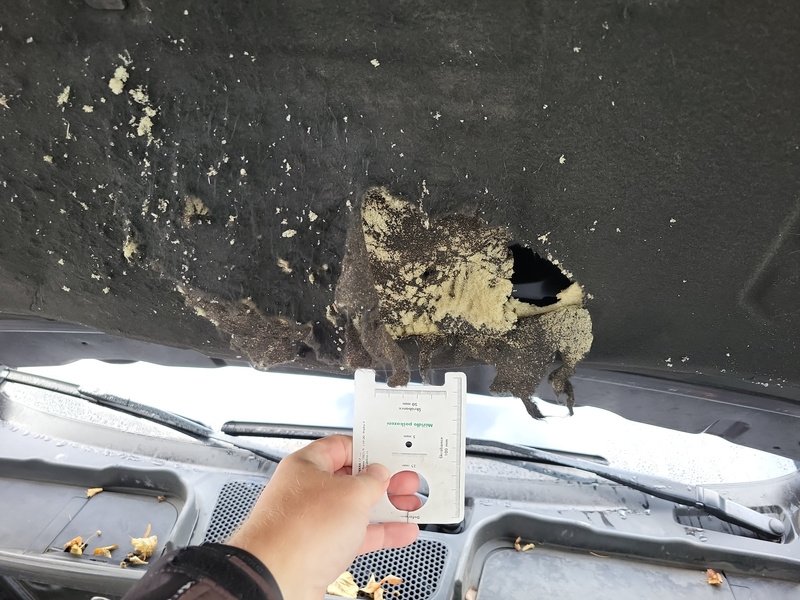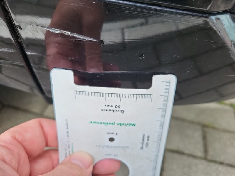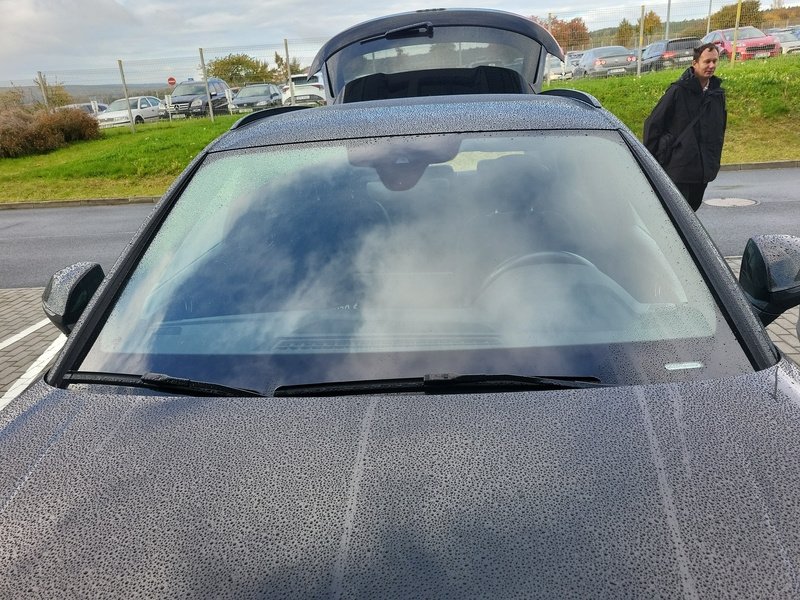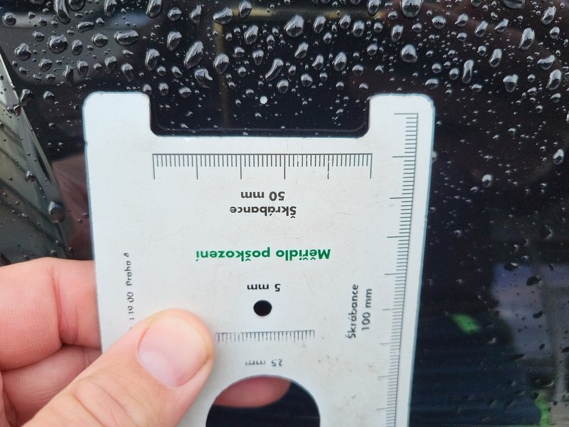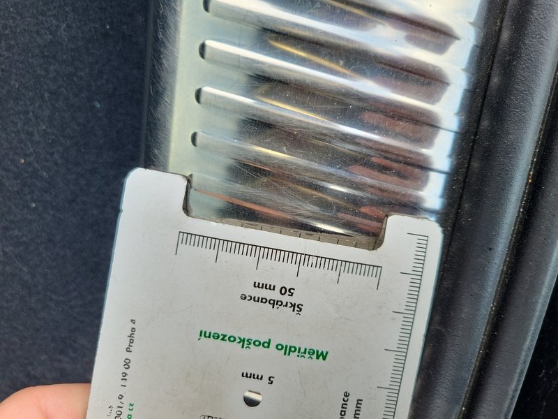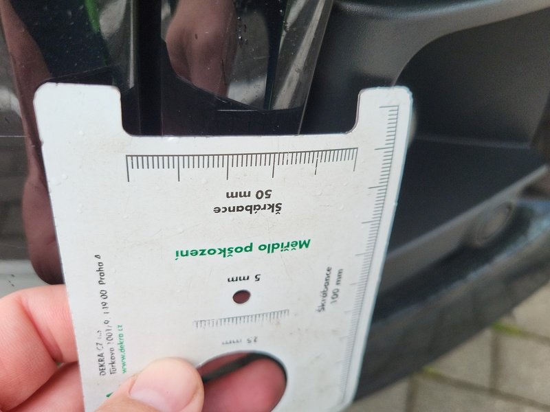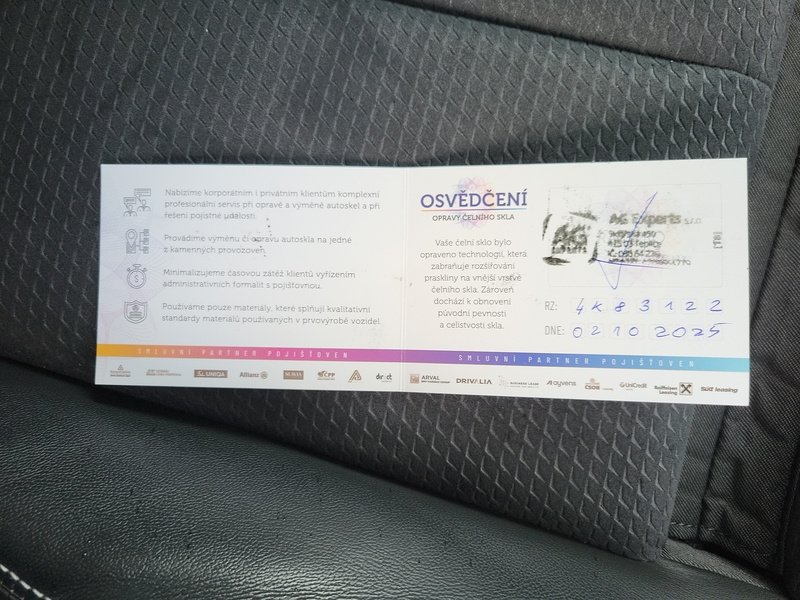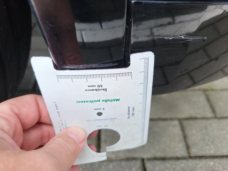 Oděrky a škrábance po obvodu karosérie, přední část karosérie je poškozená od kamínků, poškozené čelní sklo, odřený lem kola pravého předního blatníku, odřený přední nárazník, odřený spojler předního nárazníku, mírně promáčklá levá zadní bočnice - jamka, odřené madlo kliky pravých předních dveří, mírně promáčklé pravé přední dveře - jamka, odřený levý C sloupek, odřený lem kola levého zadního blatníku, odřený spojler zadního nárazníku, poškozená hluková izolace víka motorového prostrou, interiér vozidla opotřeben,