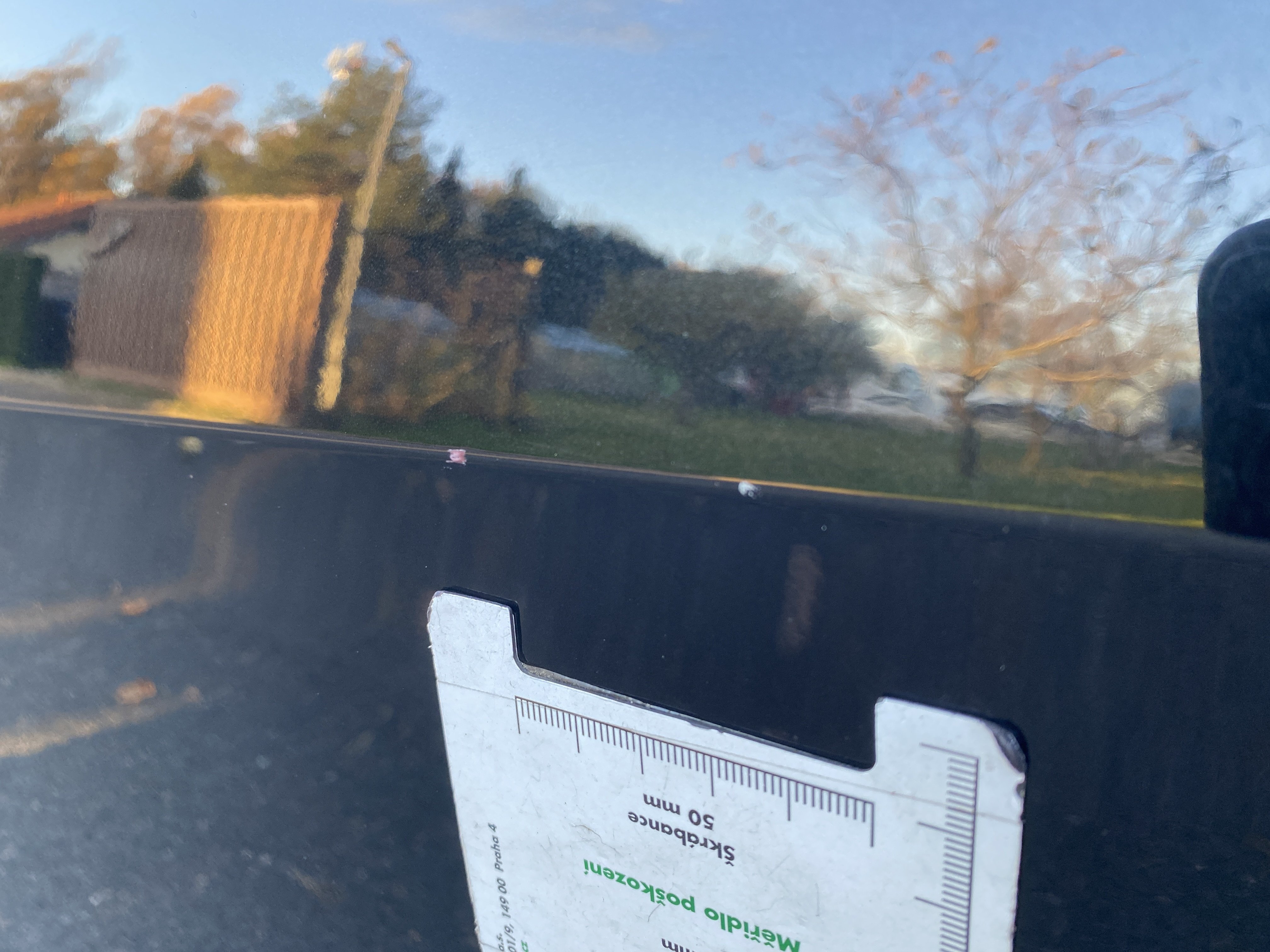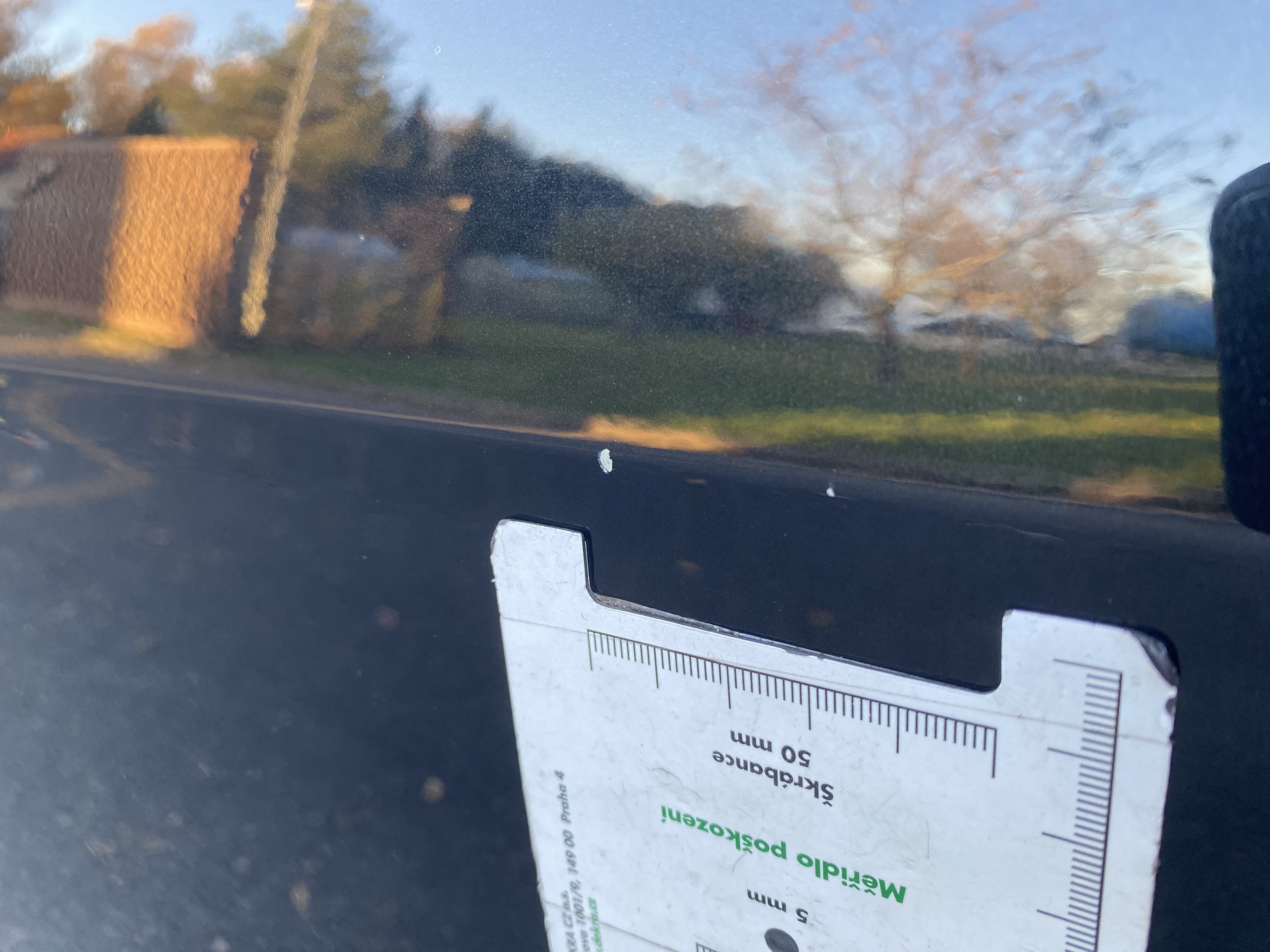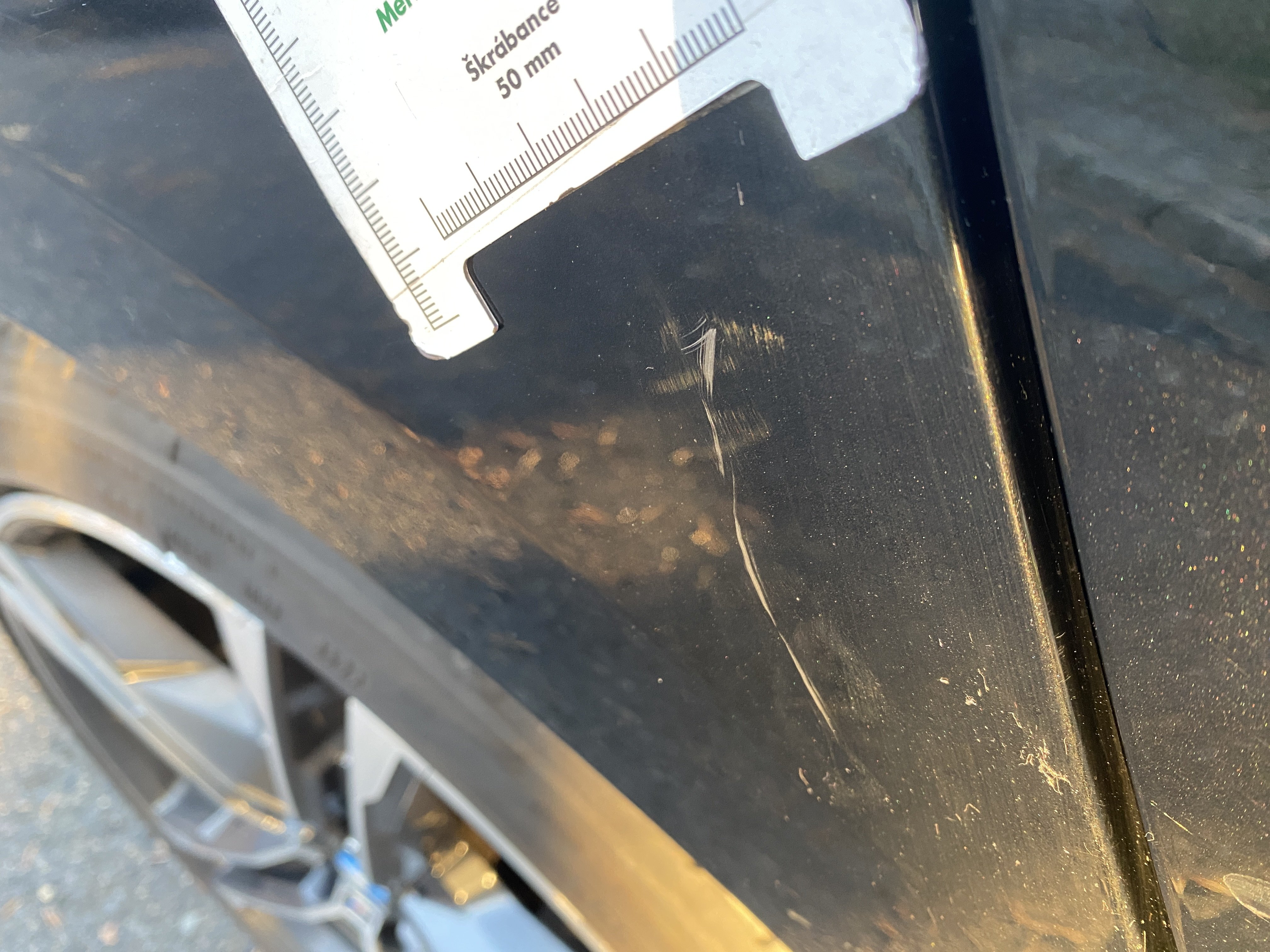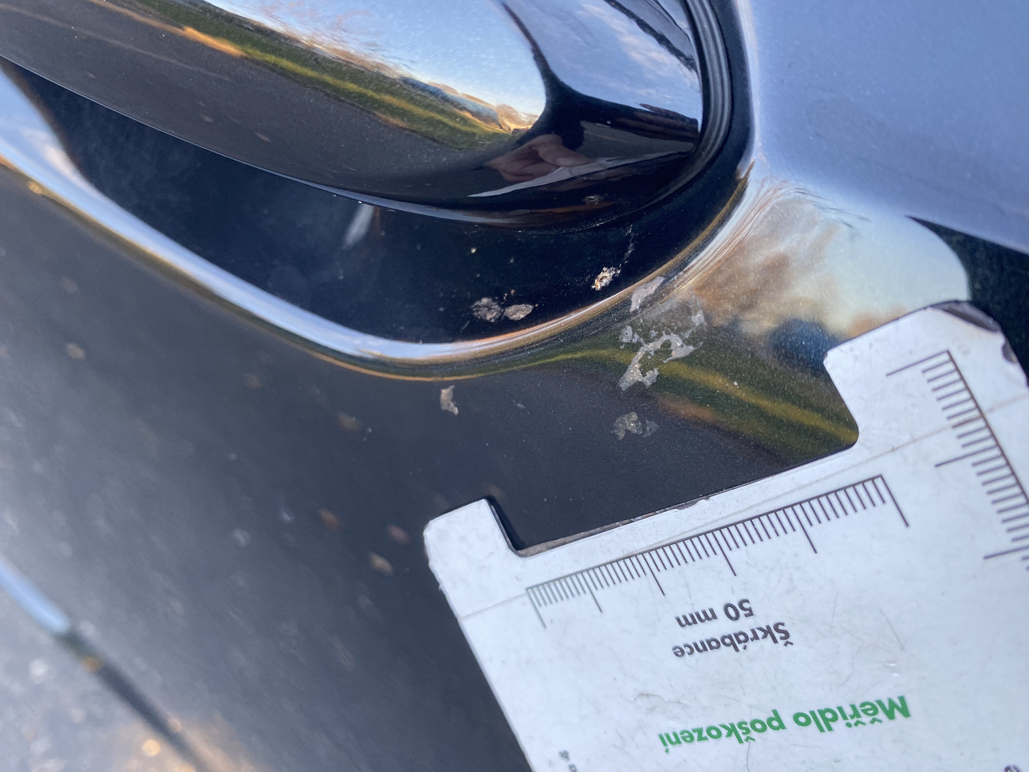 Oděrky a škrábance po obvodu karosérie, přední část karosérie je poškozená od kamínků, odřený přední nárazník, mírně odřený kryt levého zpětného zrcátka, odřené levé zadní dveře, odřené víko zavazadlového prostoru, odřený lem pravého zadního blatníku, mírně odřené pravé přední dveře, mírně poškozené čelní sklo, mírně promáčklé víko motorového prostoru - jamka, interiér vozidla opotřeben,