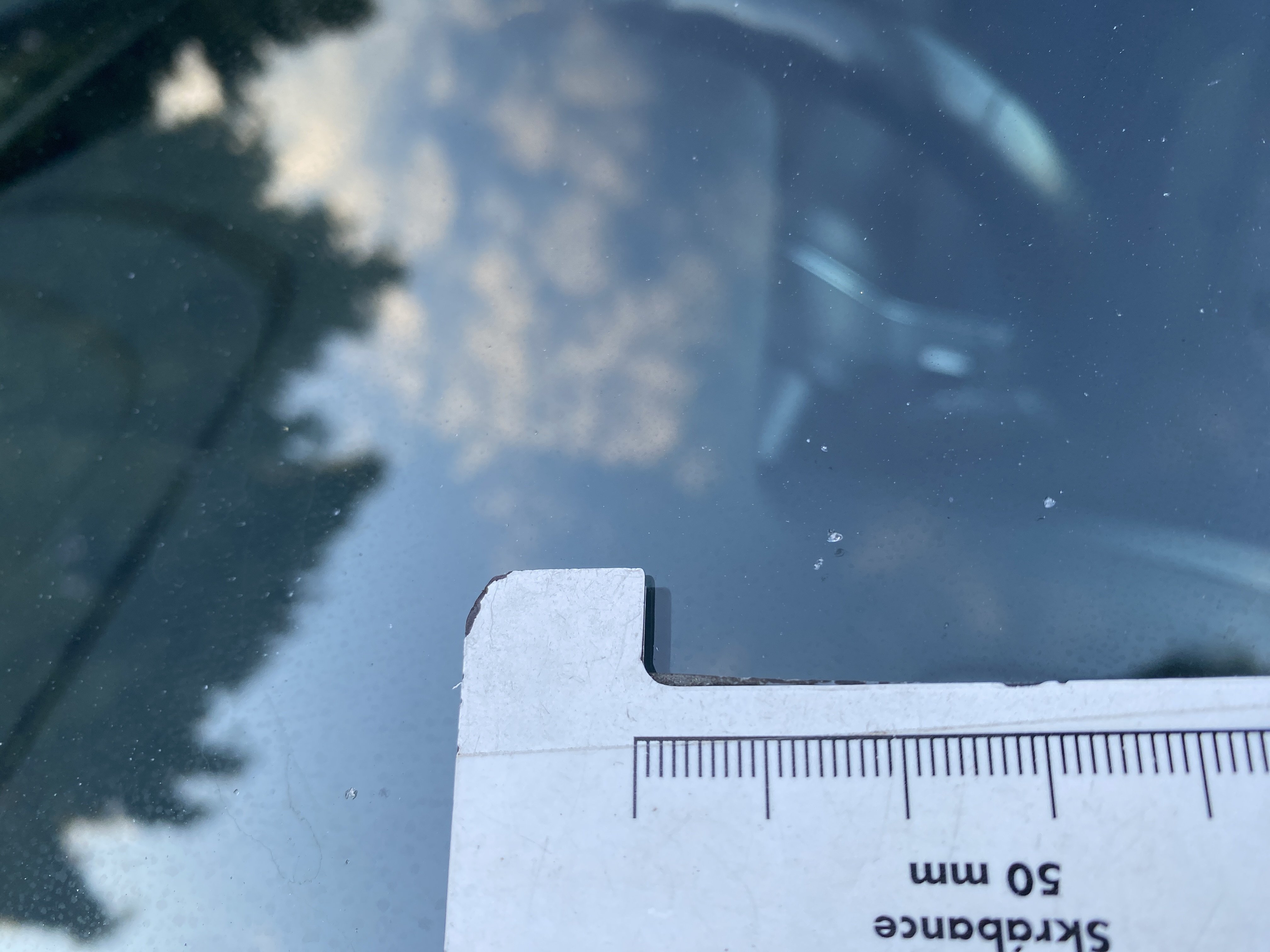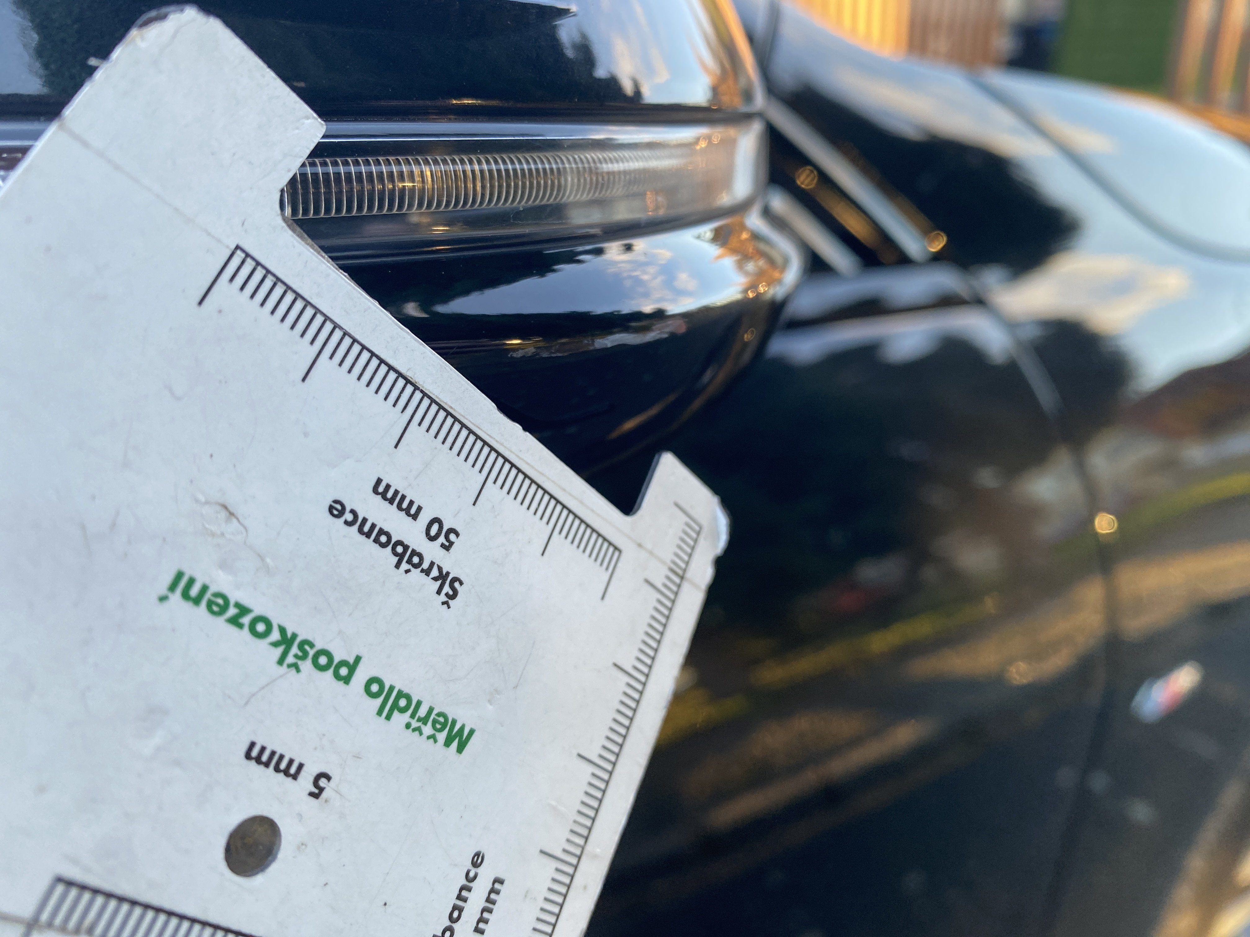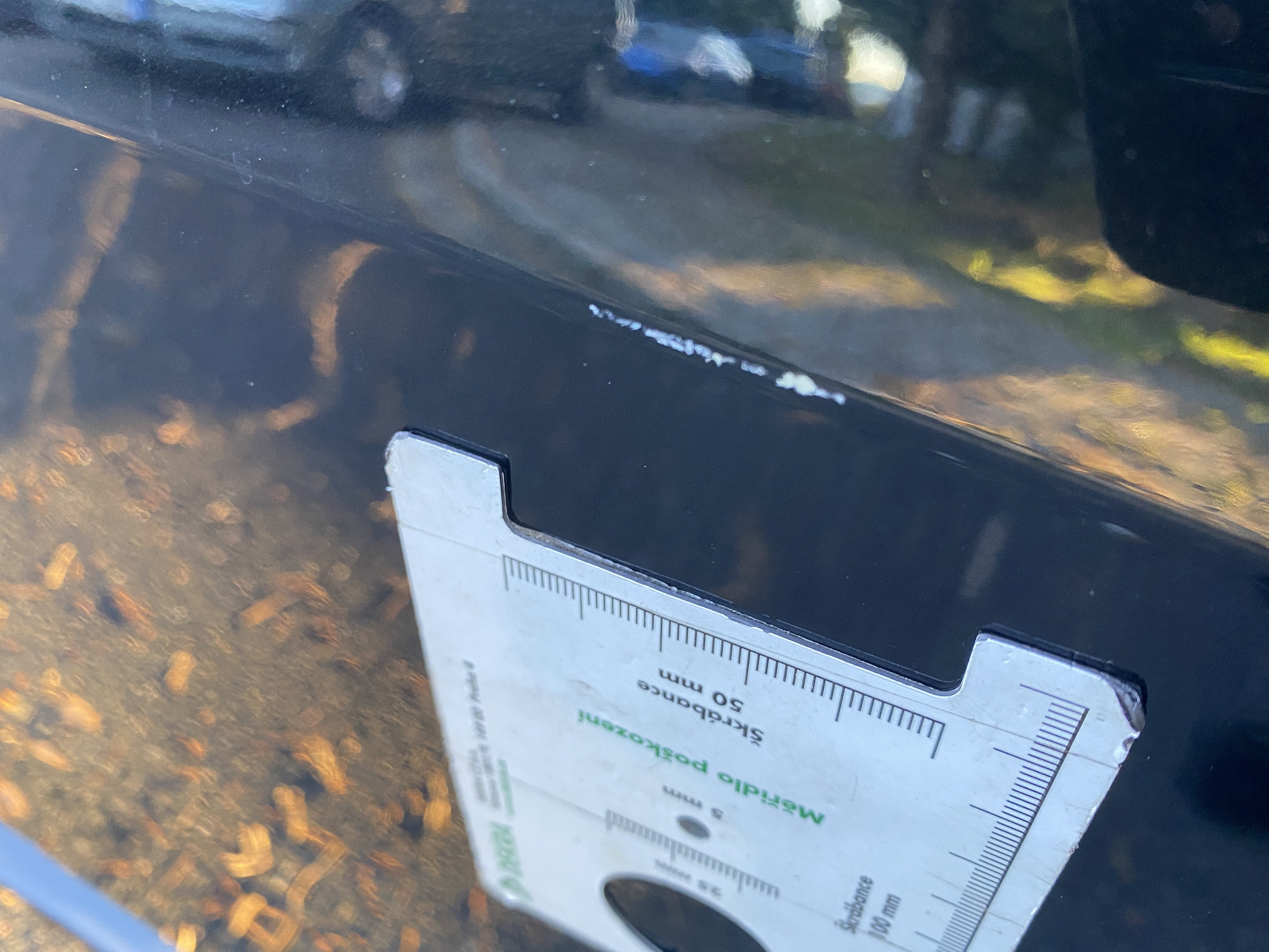 Oděrky a škrábance po obvodu karosérie, přední část karosérie je poškozená od kamínků, odřený přední nárazník, mírně odřený kryt levého zpětného zrcátka, odřené levé zadní dveře, odřené víko zavazadlového prostoru, odřený lem pravého zadního blatníku, mírně odřené pravé přední dveře, mírně poškozené čelní sklo, mírně promáčklé víko motorového prostoru - jamka, interiér vozidla opotřeben,