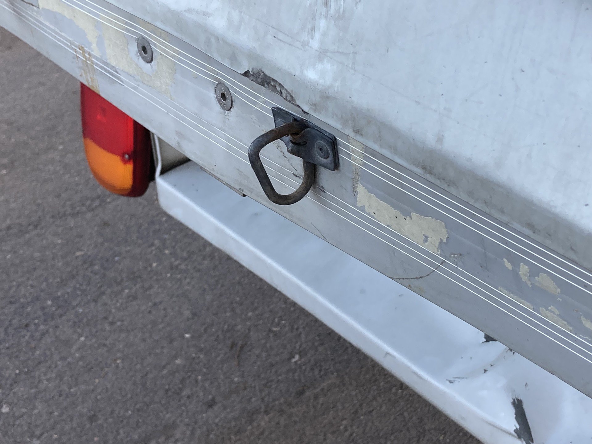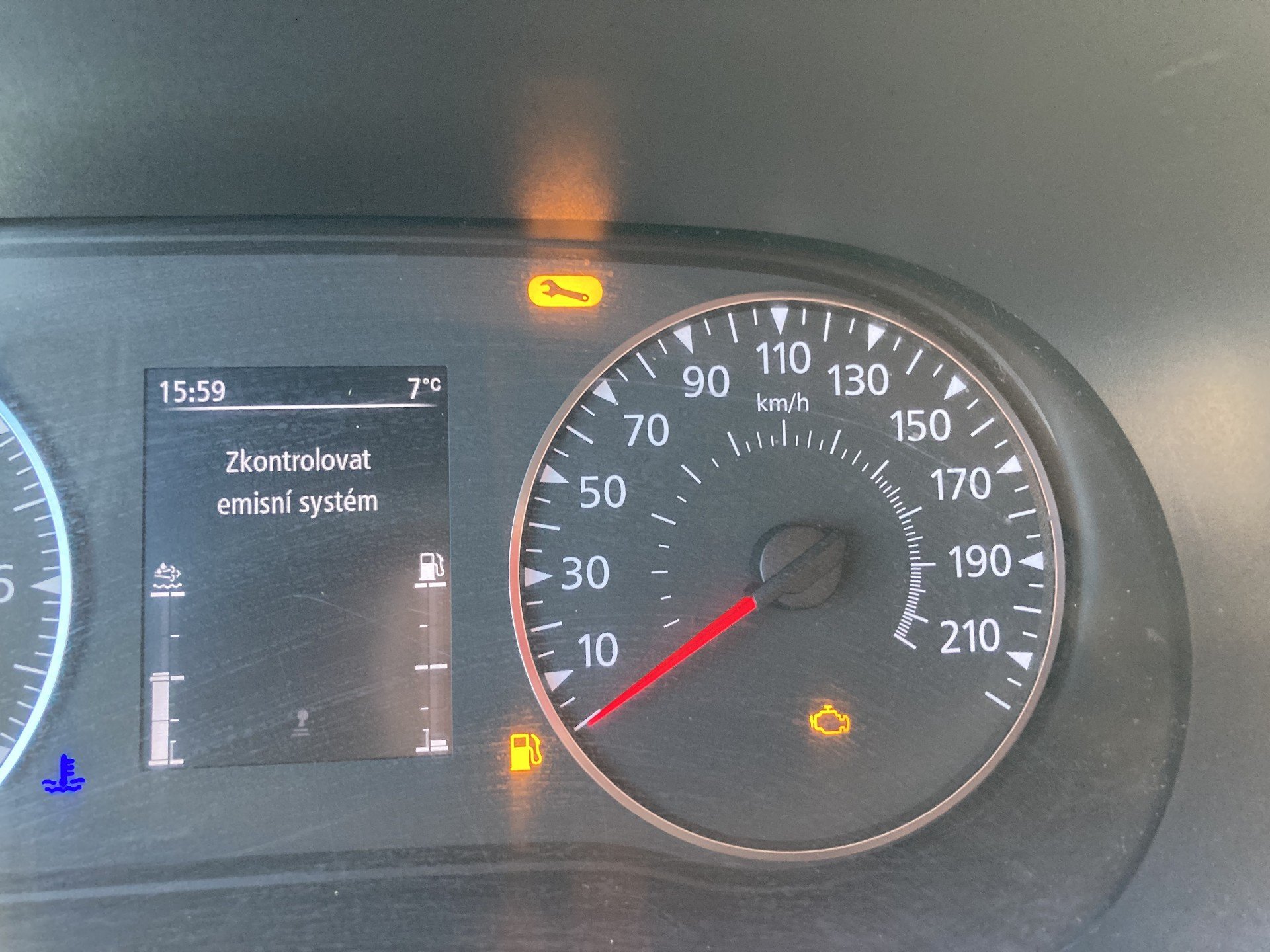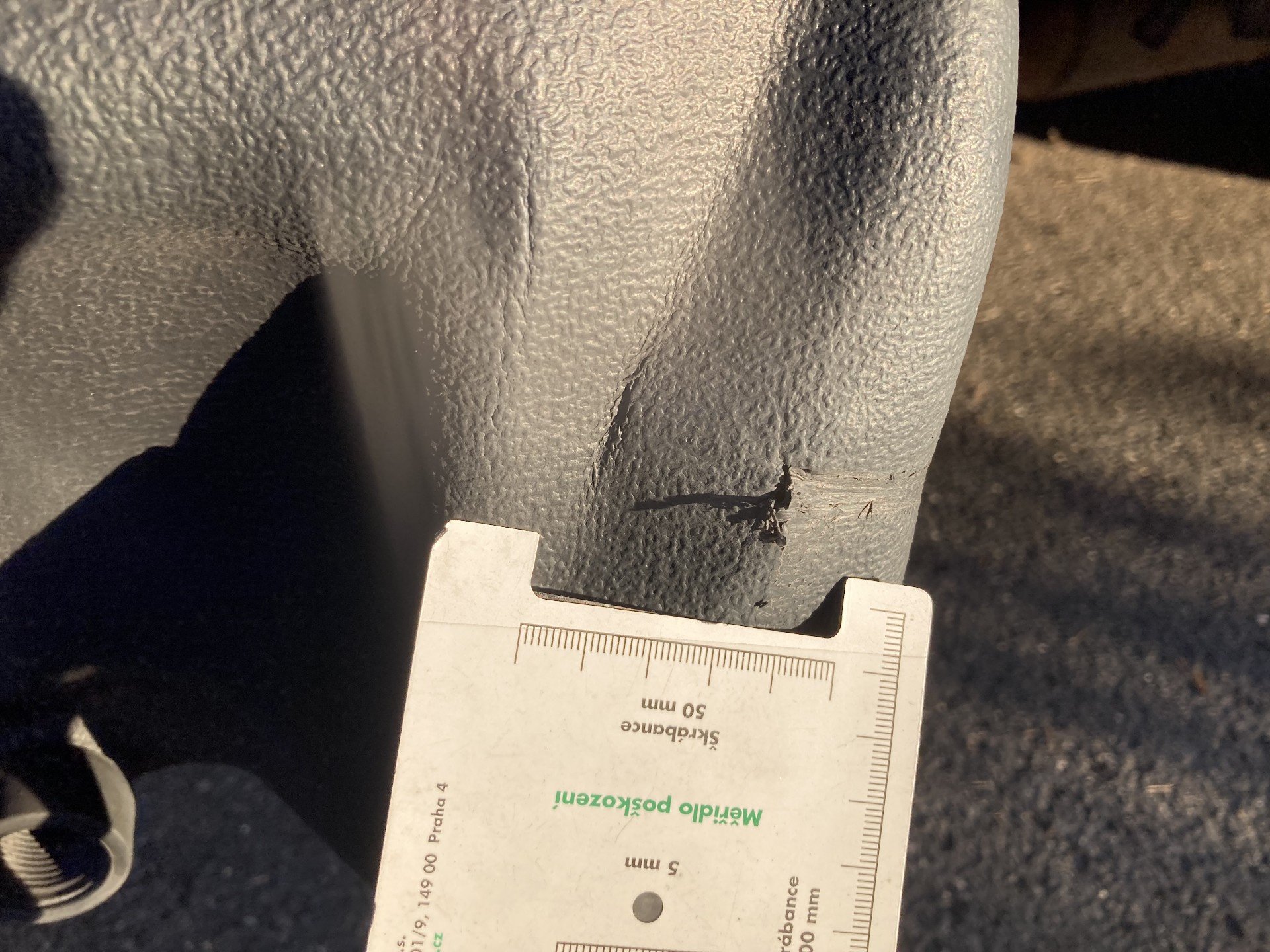 Oděrky a škrábance po obvodu karosérie, přední část karosérie je poškozená od kamínku, odřený přední nárazník, poškozen pravý přední světlomet, koroze víka motorového porstoru, poškozené čelní sklo, odřený levý přední blatník, poškozen kryt levého zpětného zrcátka, odřené levé přední dveře, deformace zadního nárazníku, poškozen kryt pravého zpětného zrcátka, palubní počítač hlásí servisní interval, svítí kontrolka motoru, interiér vozidla opotřeben, deformace nákladového porstsoru,