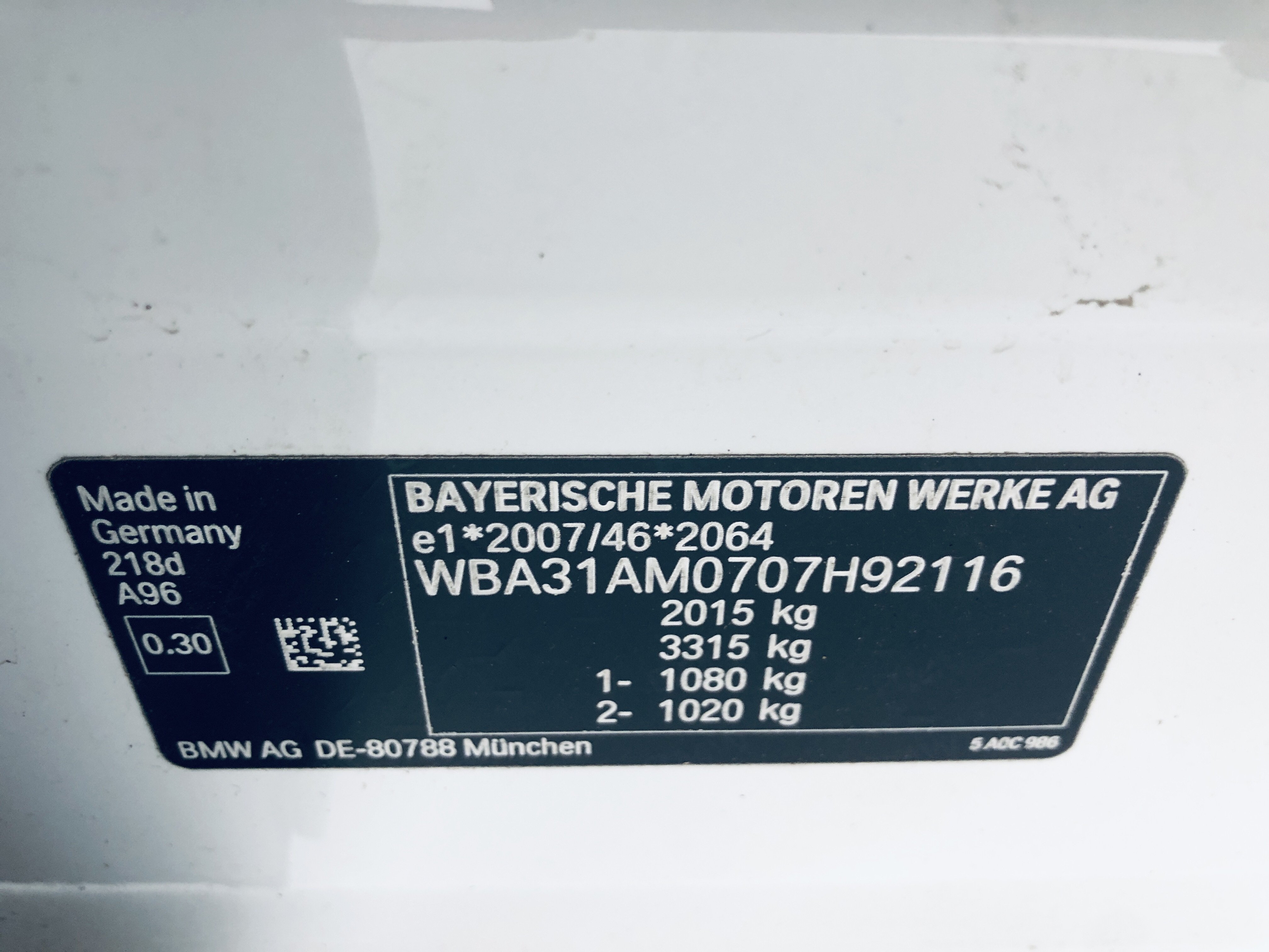| VIN | WBA31AM0707H92116 |