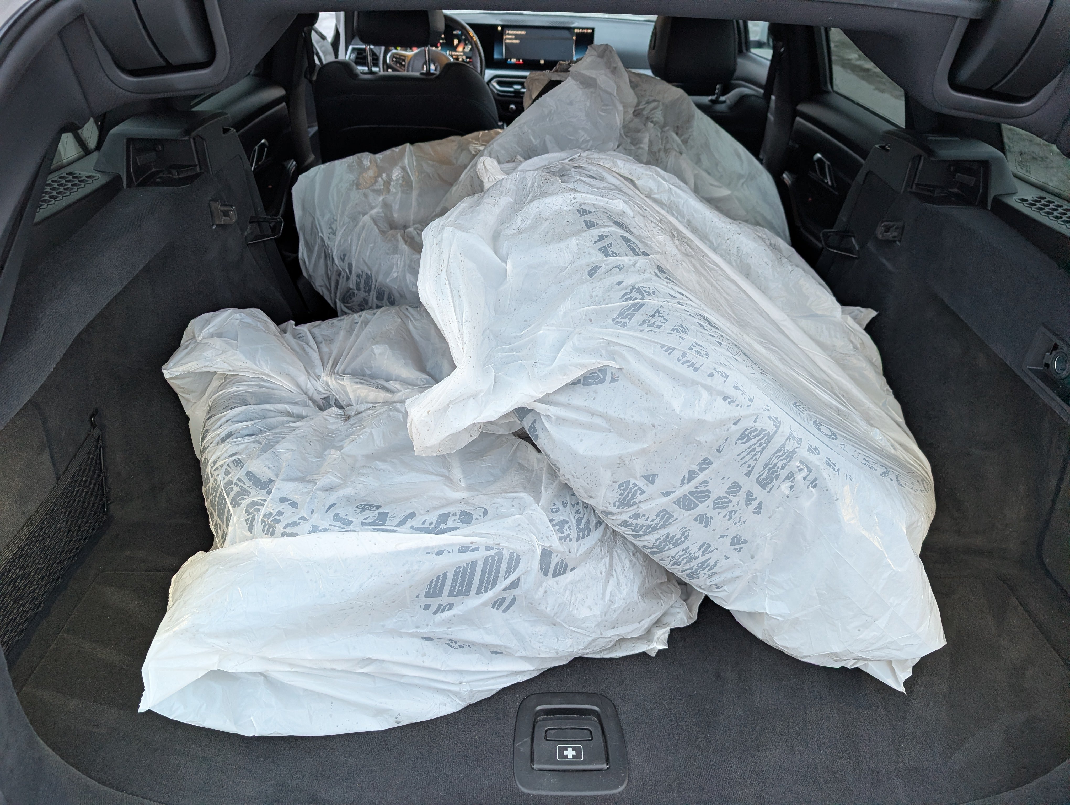 4x zimné pneumatiky na diskoch, uložené vo vozidle.