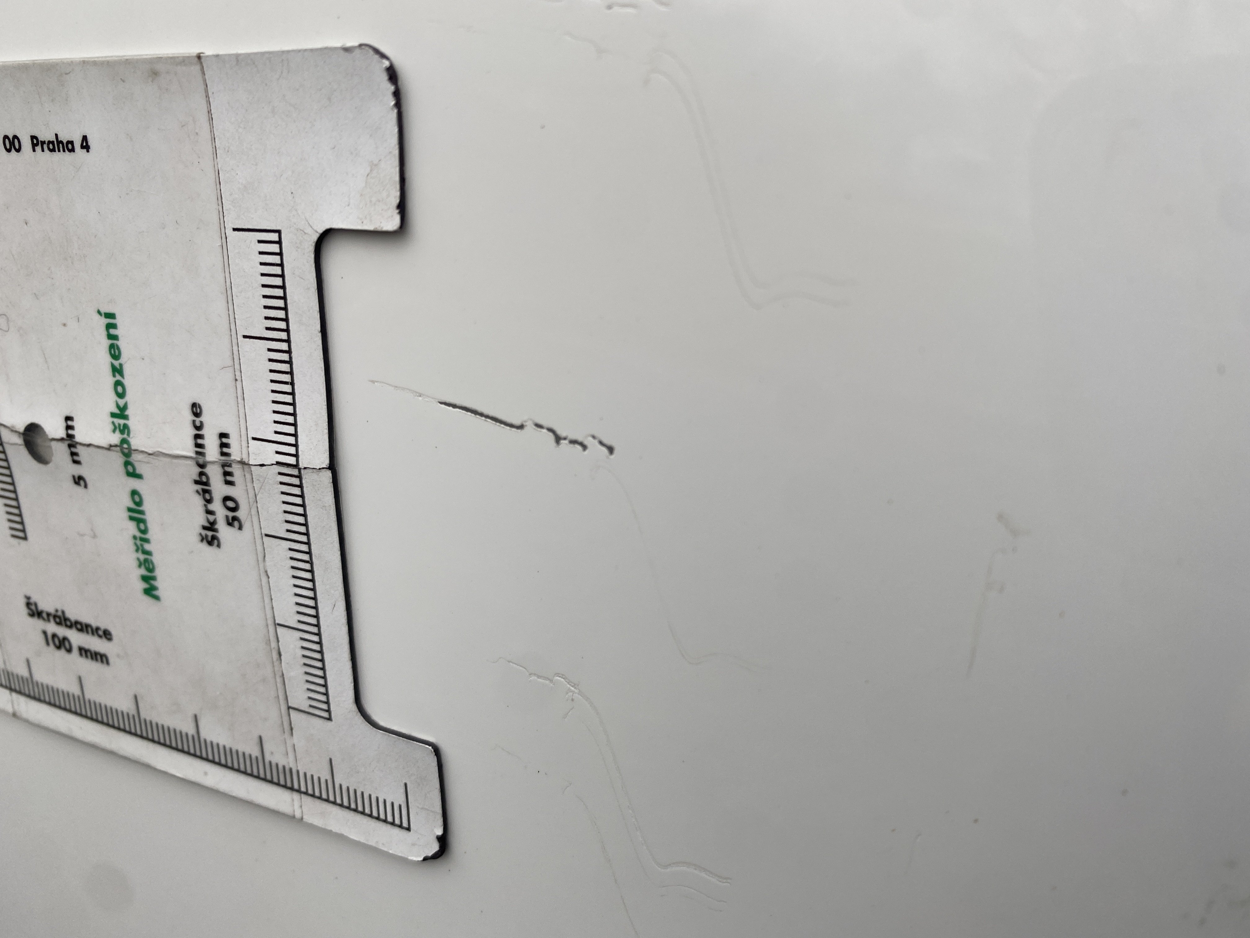 Oděrky a škrábance po obvodu karosérie, přední část karosérie je poškozená od kamínků, deformace předního nárazníku, poškozená lišta předního nárazníku, mírně promáčklé levé přední dveře - jamka, mírně promáčklý levý rám dveří - jamka, odřený levý práh, deformace zadního nárazníku, odřená pravá zadní bočnice, deforamce krytu pravého práhu, deformace pravých zadních dveří, odřený pravý C sloupek, mírně promáčklý pravý přední blatník - jamka, poškozená větrací mřížka středového tunelu, interiér vozidla opotřeben,