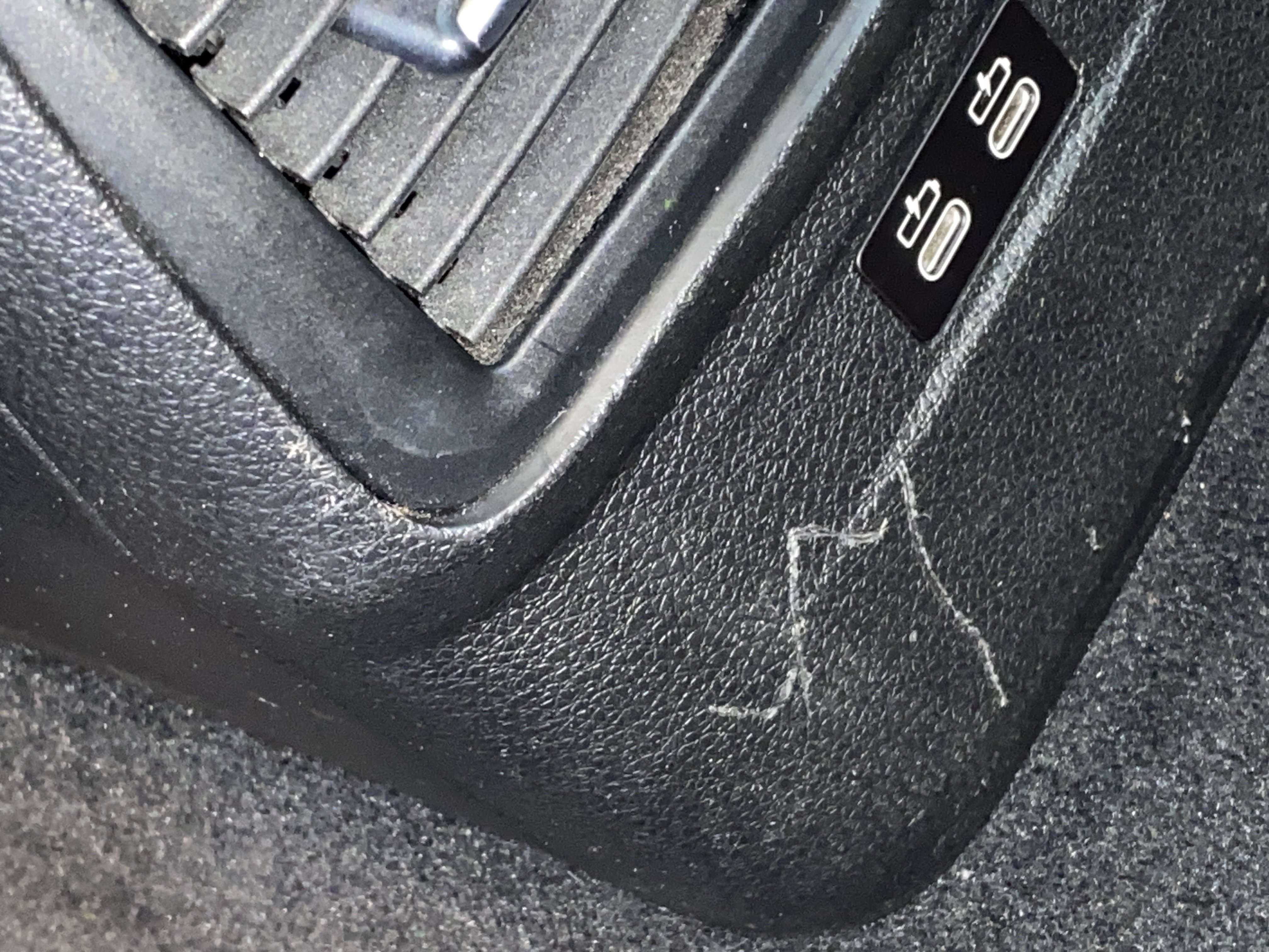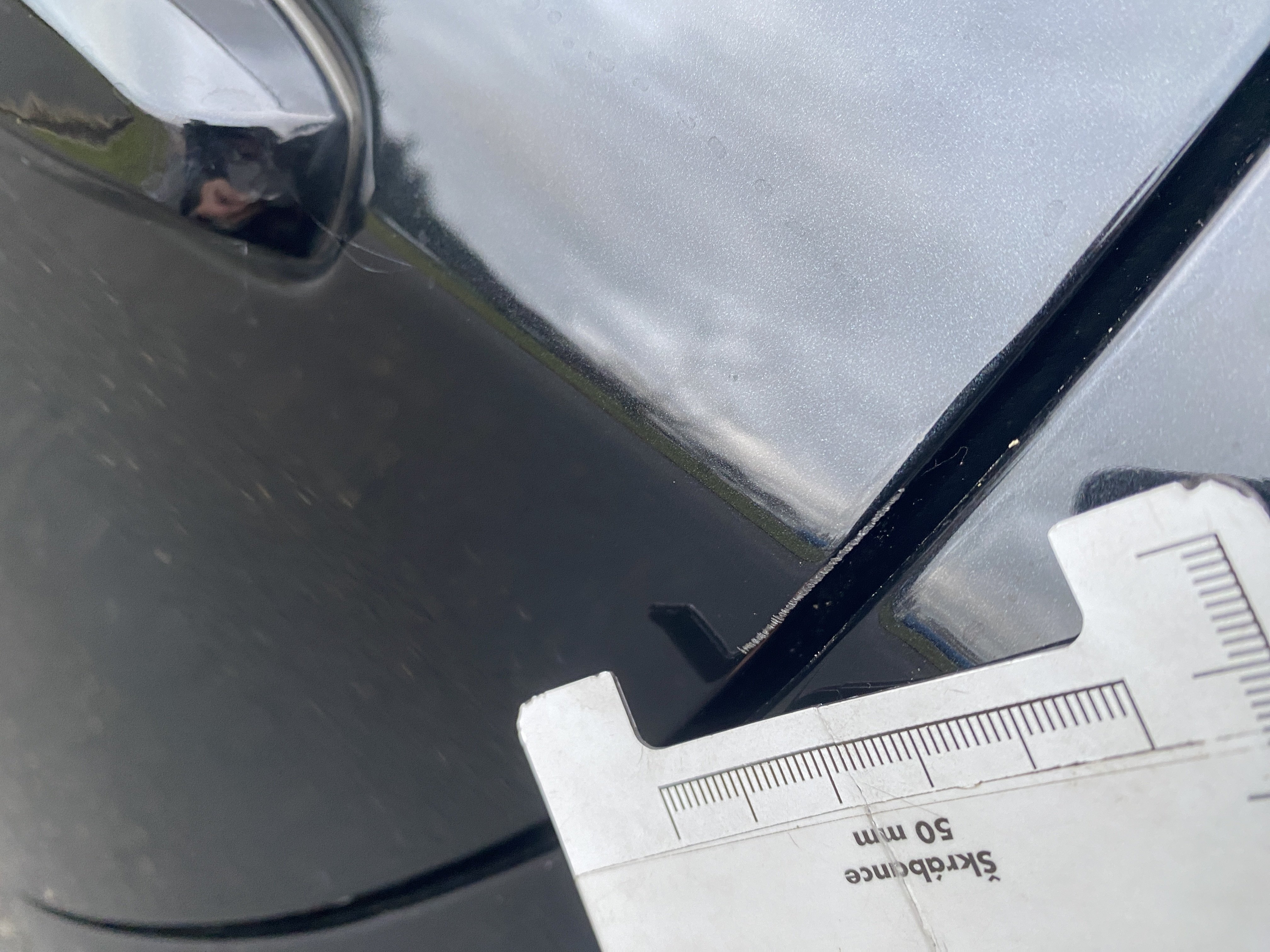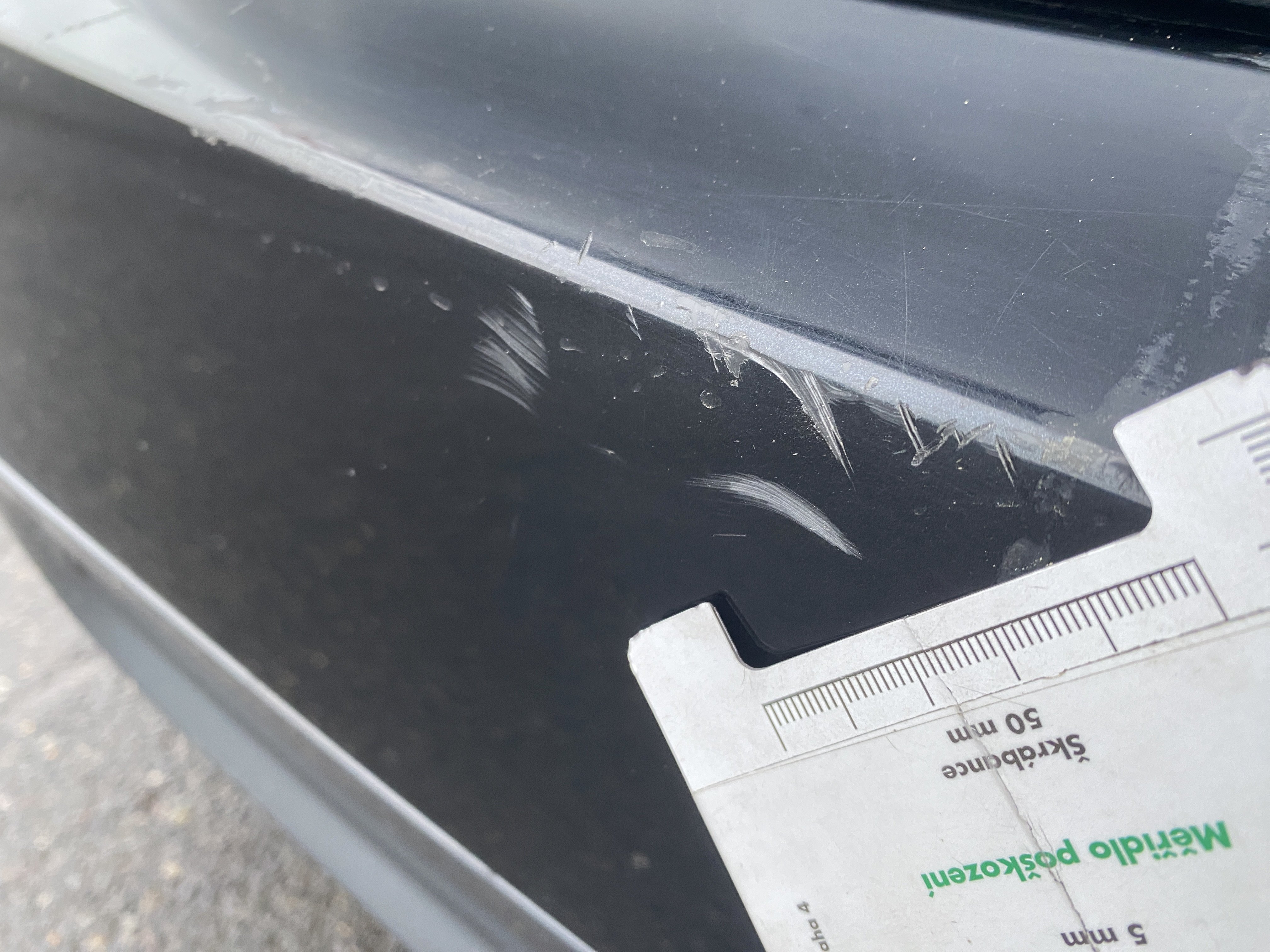 Oděrky a škrábance po obvodu karosérie, přední část karosérie je poškozená od kamínků, mírně odřený kryt levého zpětného zrcátka, odřená hrana levých zadních dveří, odřený zadní nárazník, mírně odřený pravý zadní blatník, odřené pravé zadní dveře, chybí plastová krytka zadního sterače, odřené pravé přední dveře, odřený kryt pravého zpětného zrcátka, promáčklé plato střechy - jamky, poškozené čelní sklo, karosérie nese stopy po předchozí opravě, interiér vozidla opotřeben,