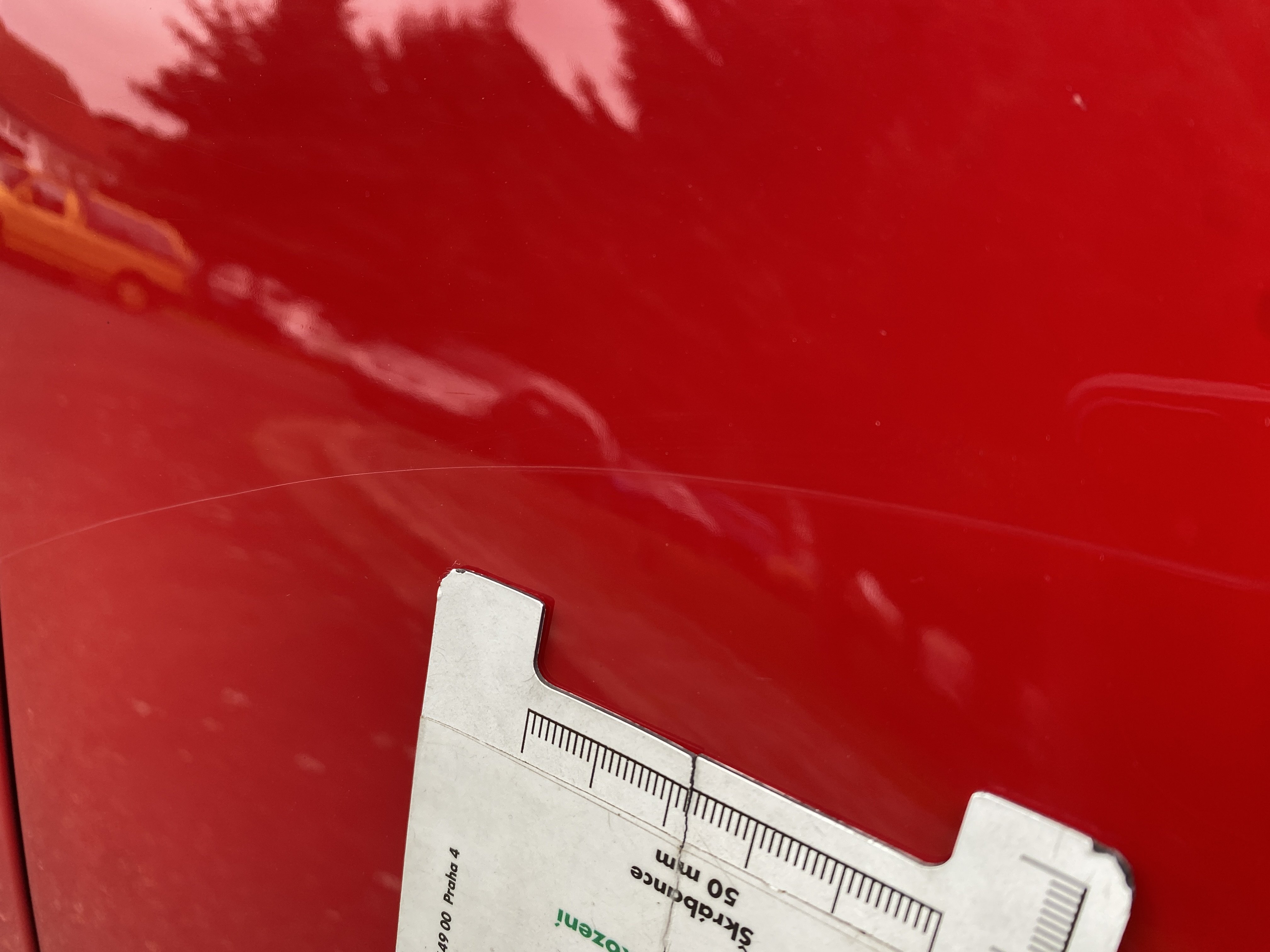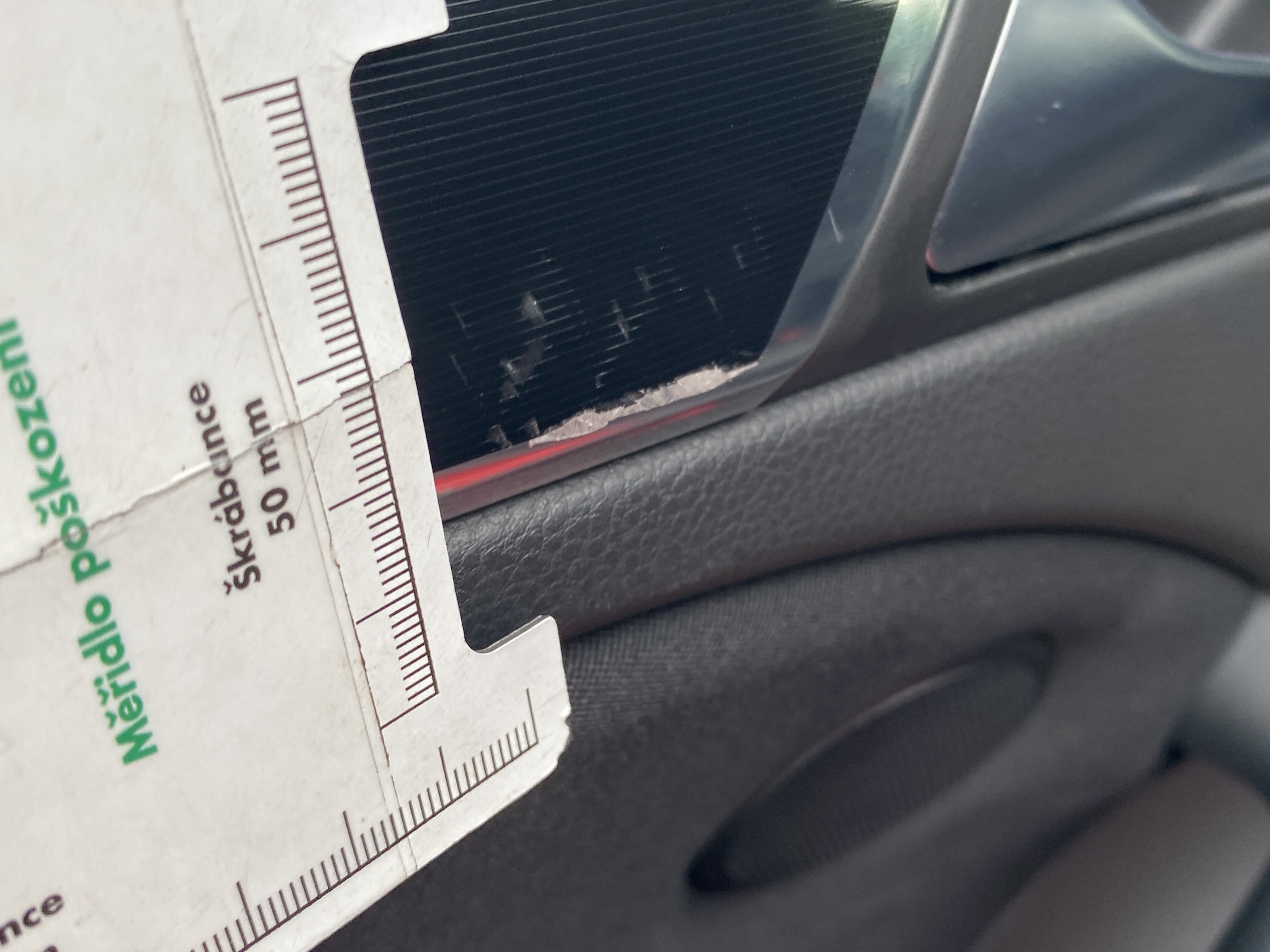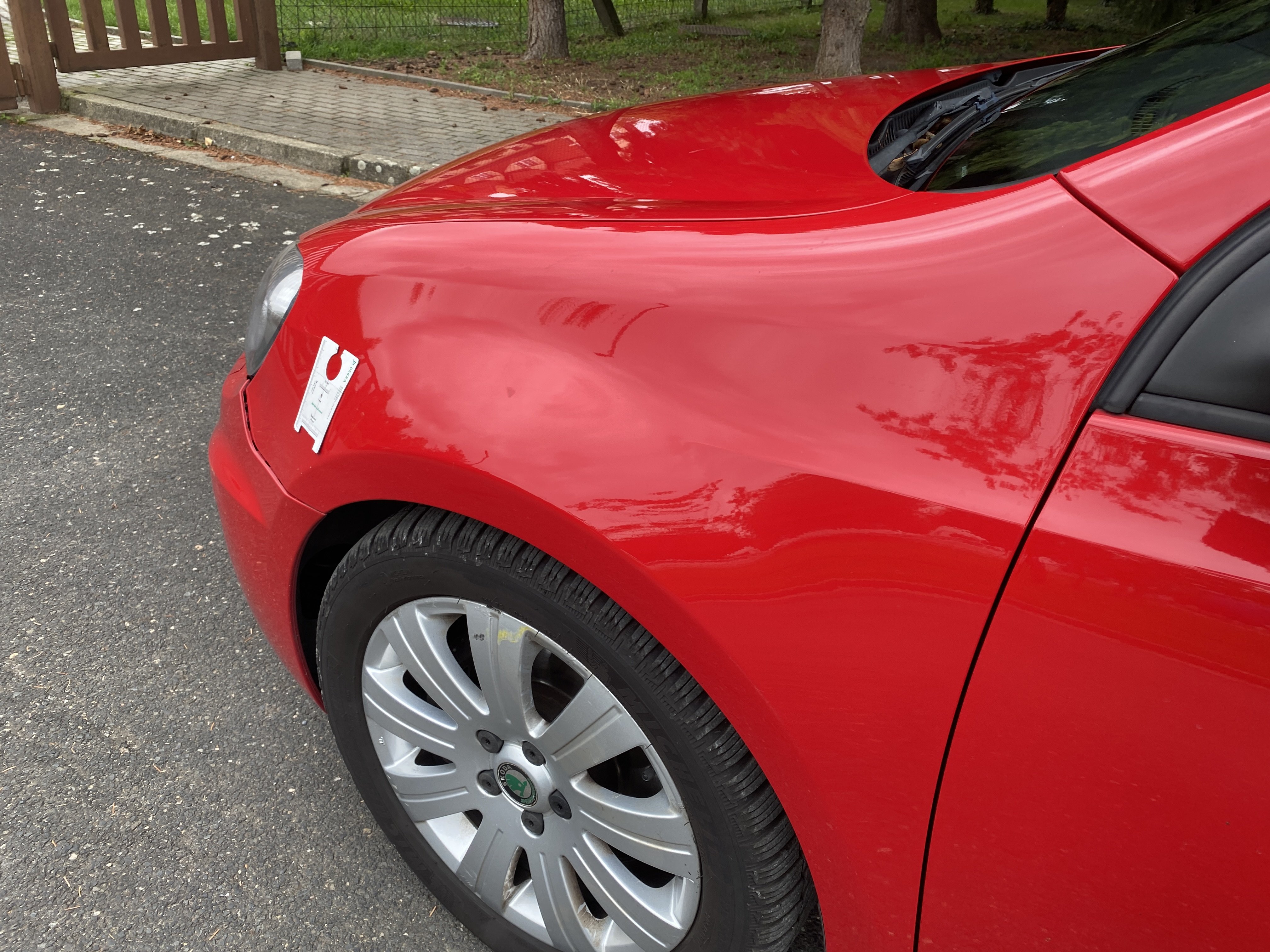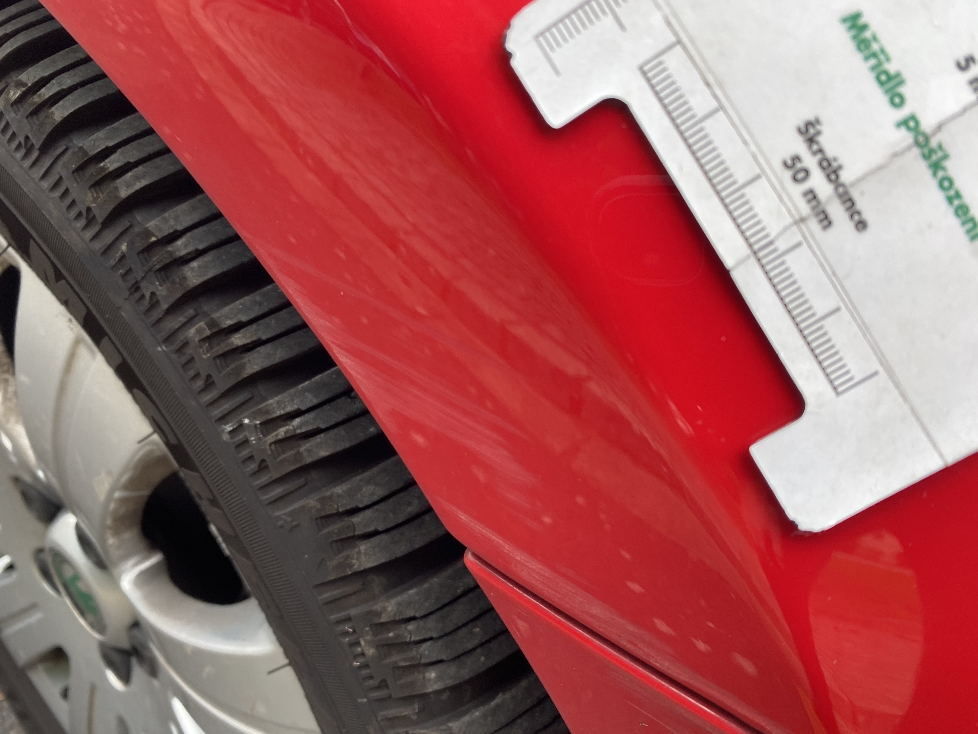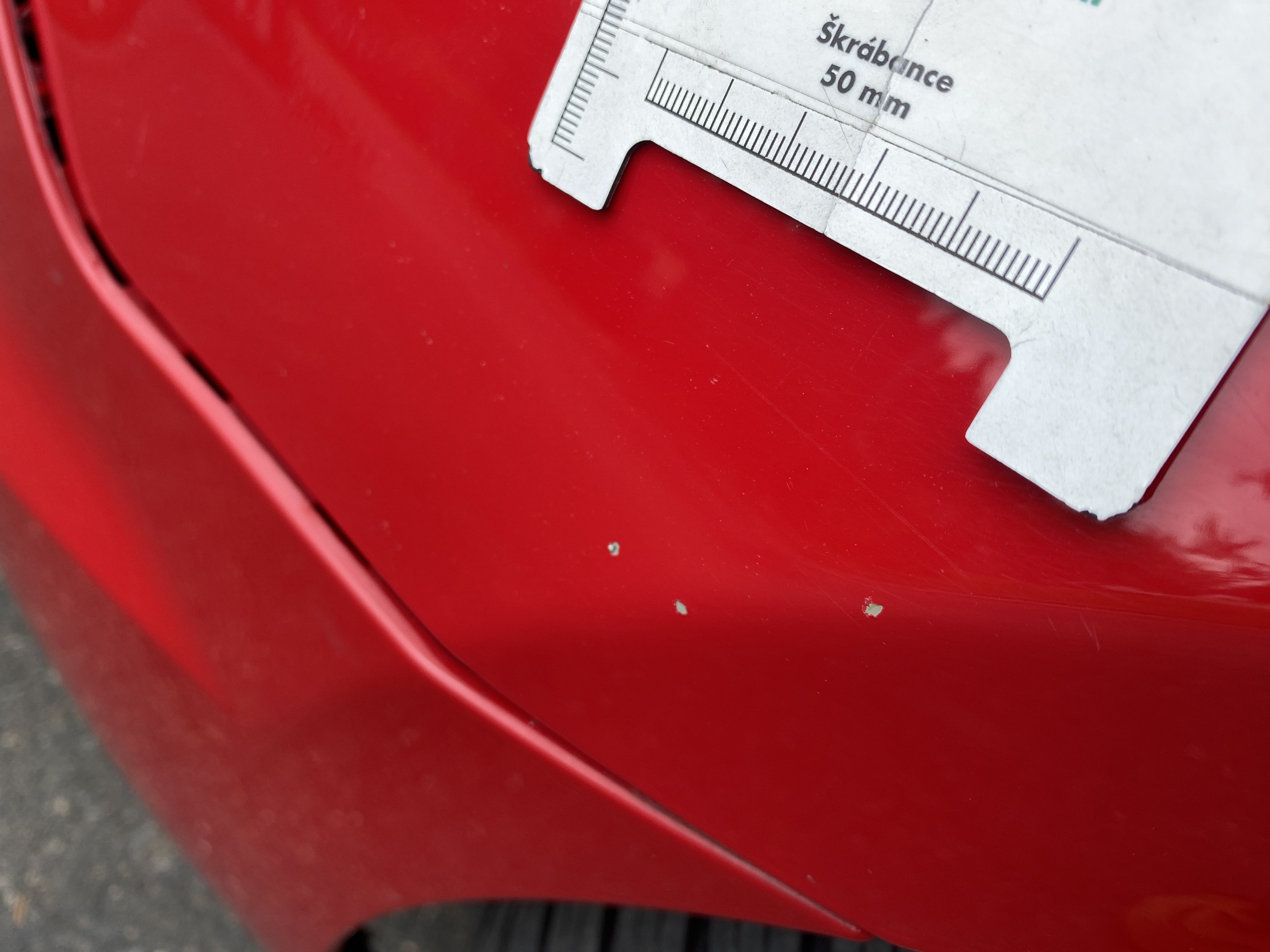 Oděrky a škrábance po obvodu karosérie, přední část karosérie je poškozená od kamínků, karosérie nese stopy po předchozí opravě, odřené pravé přední dveře, odřený pravý přední blatník, odřený přední nárazník, přední nárazník nelícuje, odřené víko motorového prostoru, odřená klika levých předních dveří, odřený zadní nárazník, odřený pravý zadní blatník, svítí kontrolka motoru, interiér vozidla opotřeben, palubní počítač hlásí servisní interval, svítí kontrolka motoru, poškozen potah levého předního sedadla,