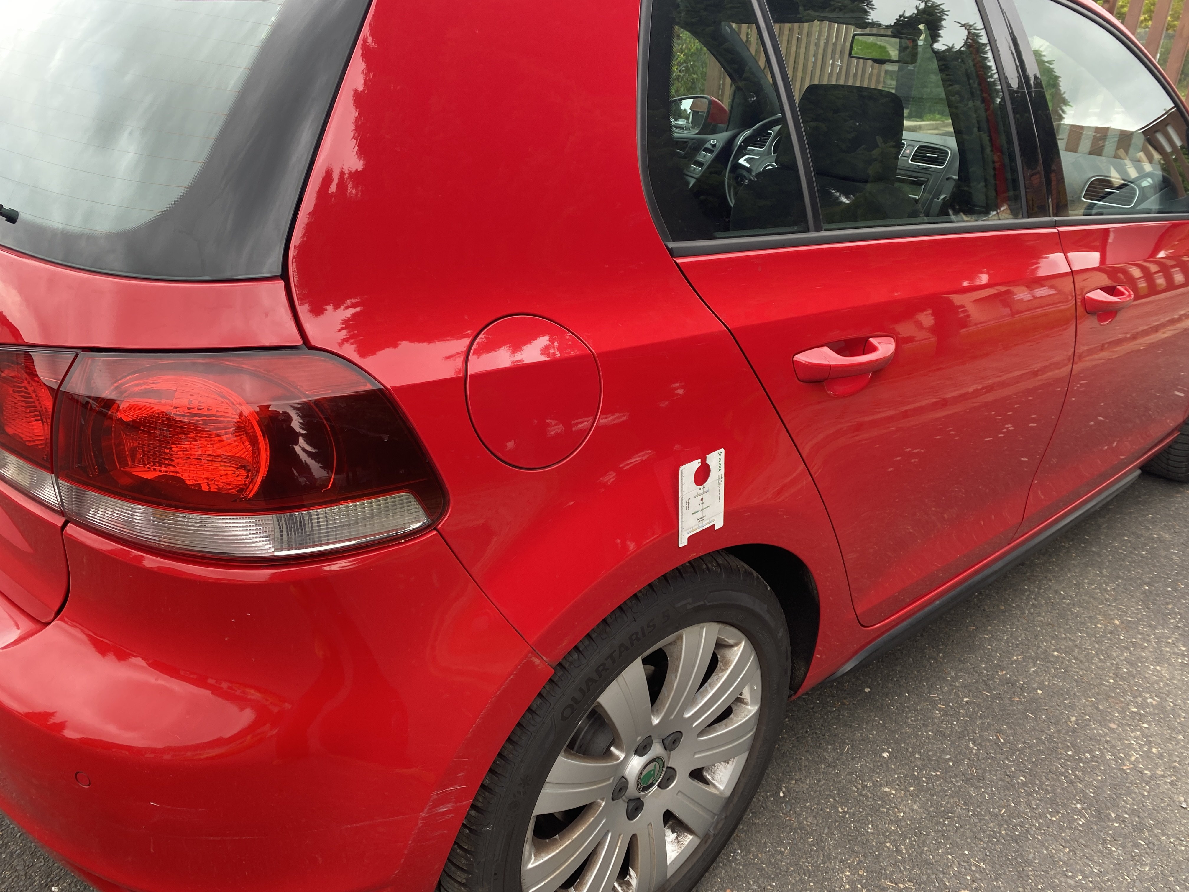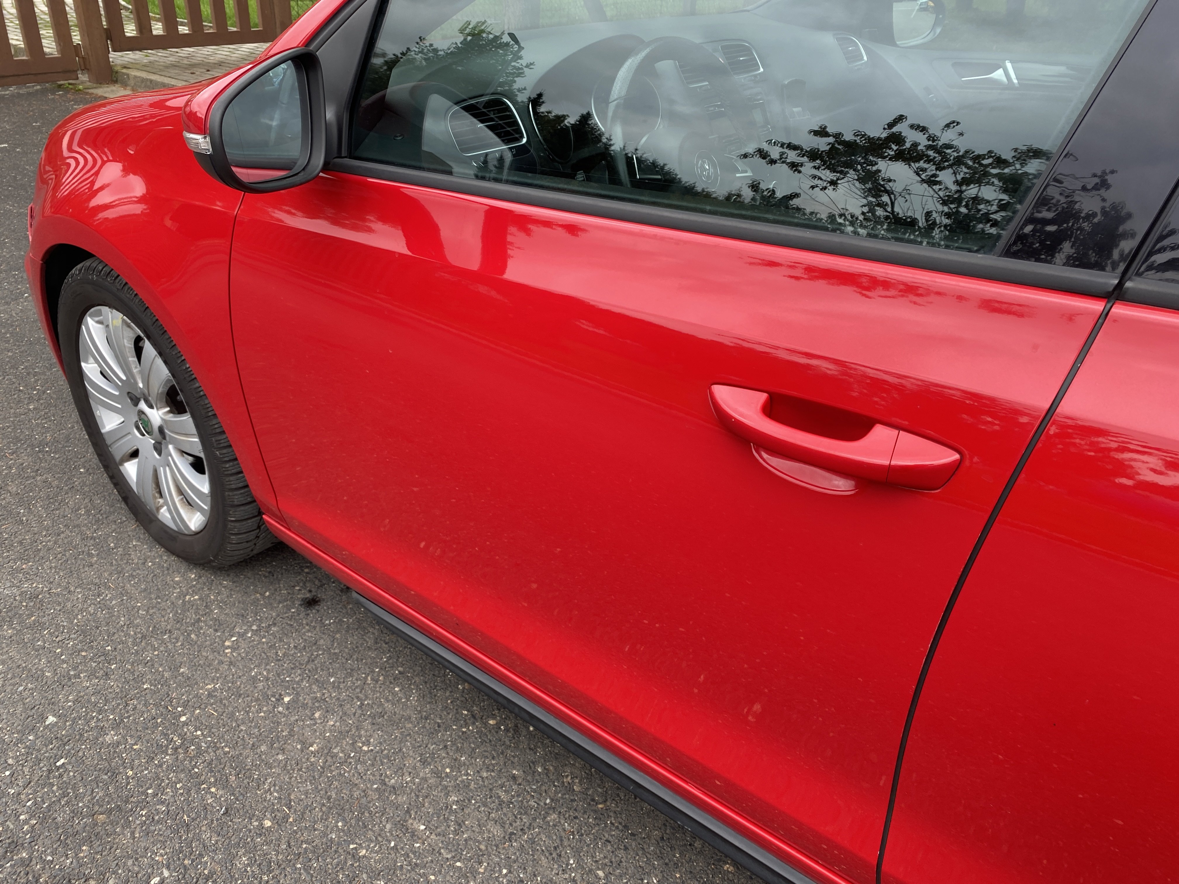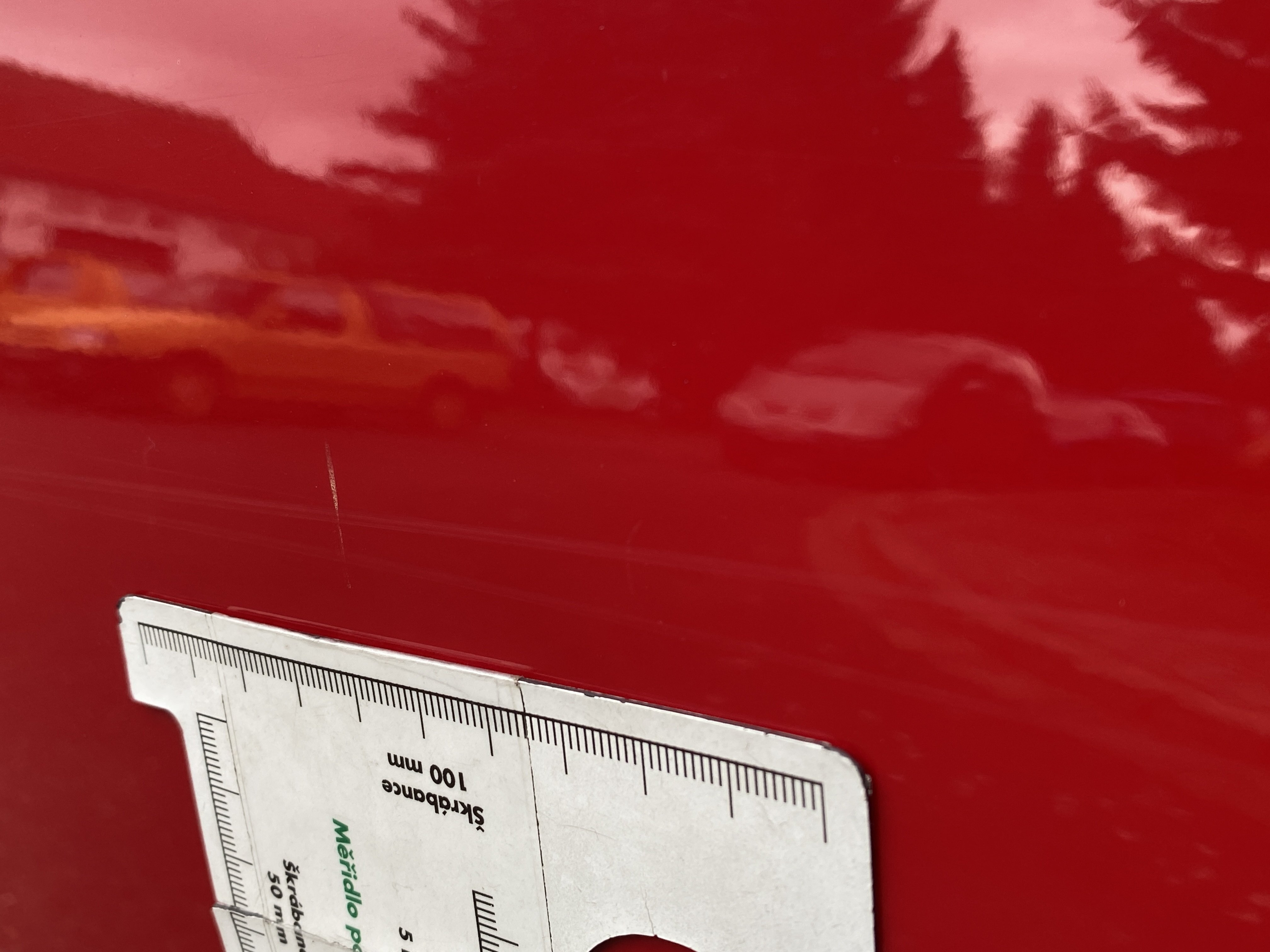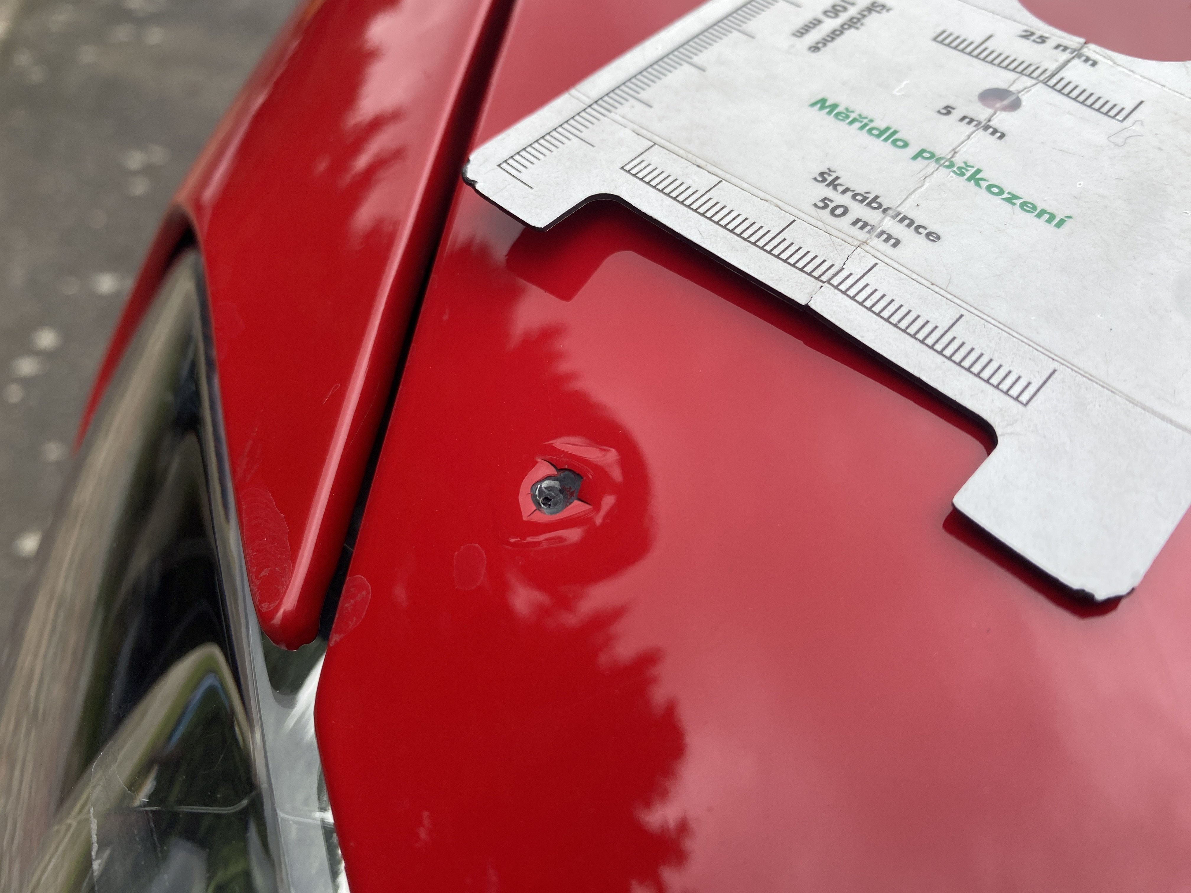 Oděrky a škrábance po obvodu karosérie, přední část karosérie je poškozená od kamínků, karosérie nese stopy po předchozí opravě, odřené pravé přední dveře, odřený pravý přední blatník, odřený přední nárazník, přední nárazník nelícuje, odřené víko motorového prostoru, odřená klika levých předních dveří, odřený zadní nárazník, odřený pravý zadní blatník, svítí kontrolka motoru, interiér vozidla opotřeben, palubní počítač hlásí servisní interval, svítí kontrolka motoru, poškozen potah levého předního sedadla,