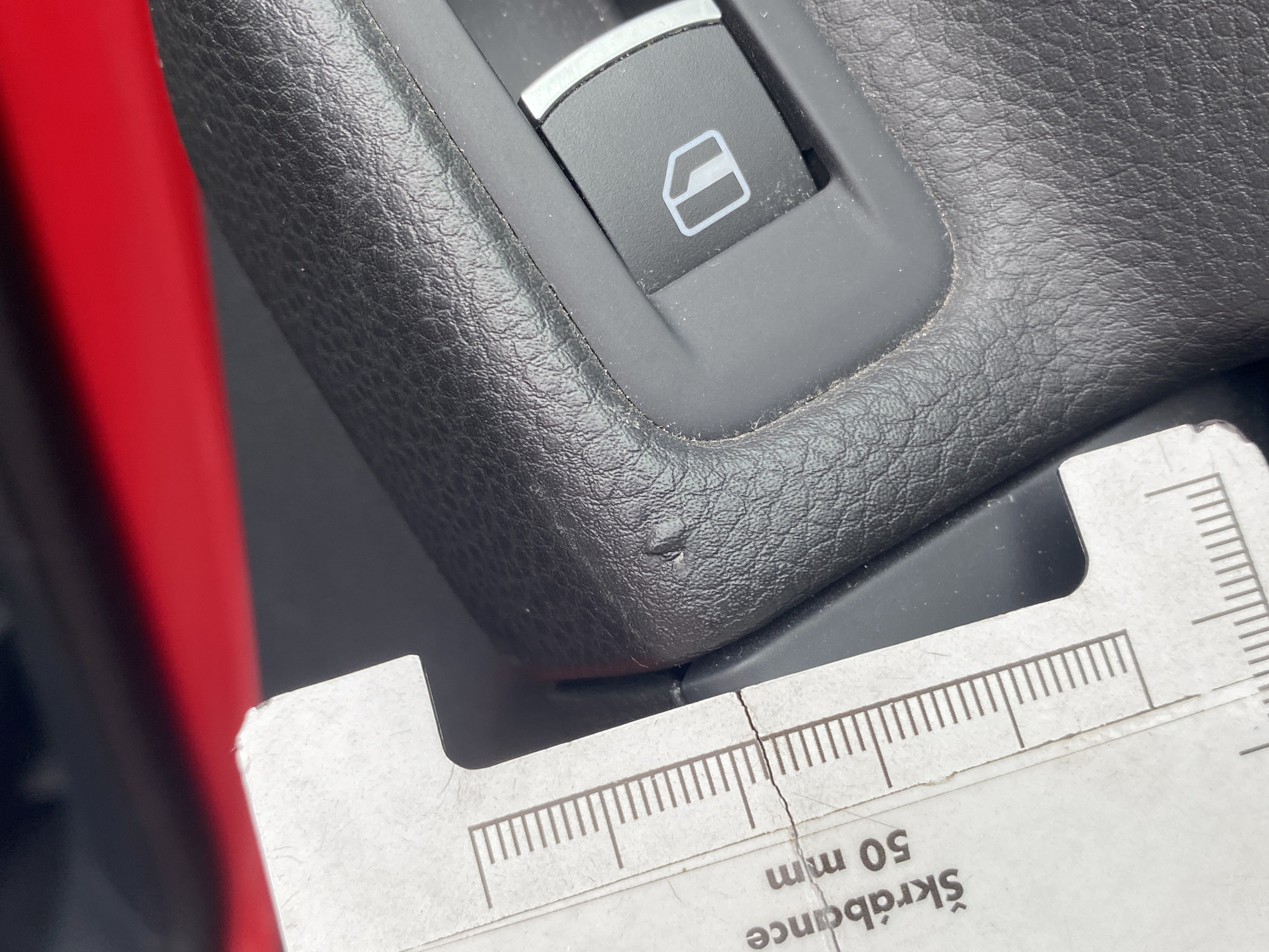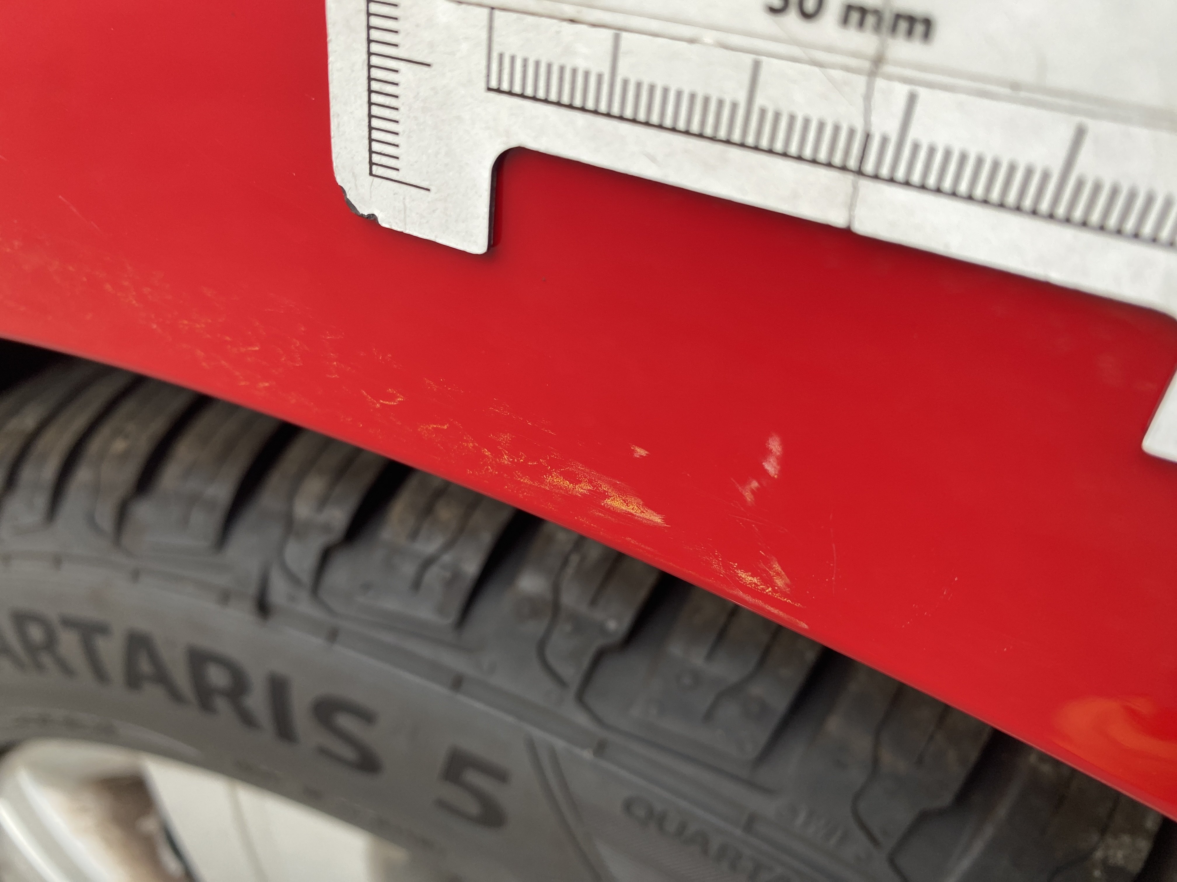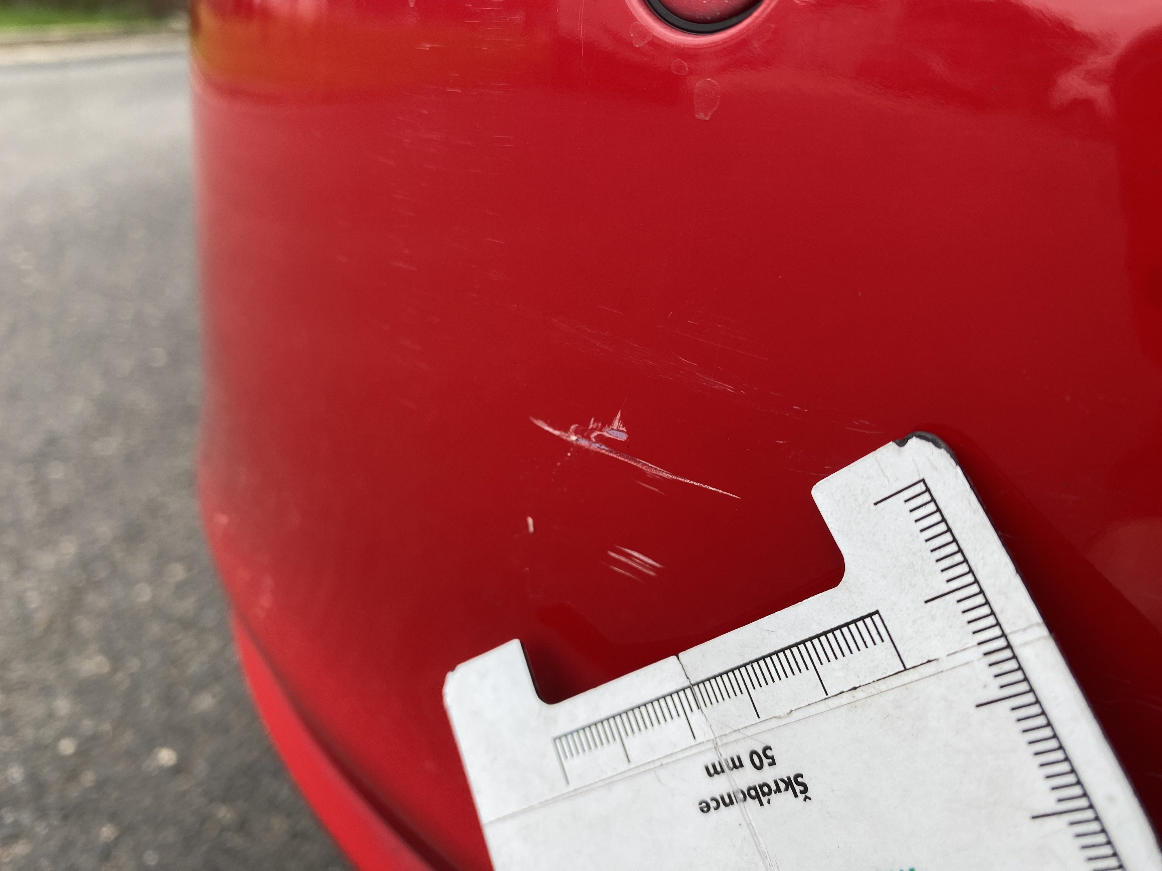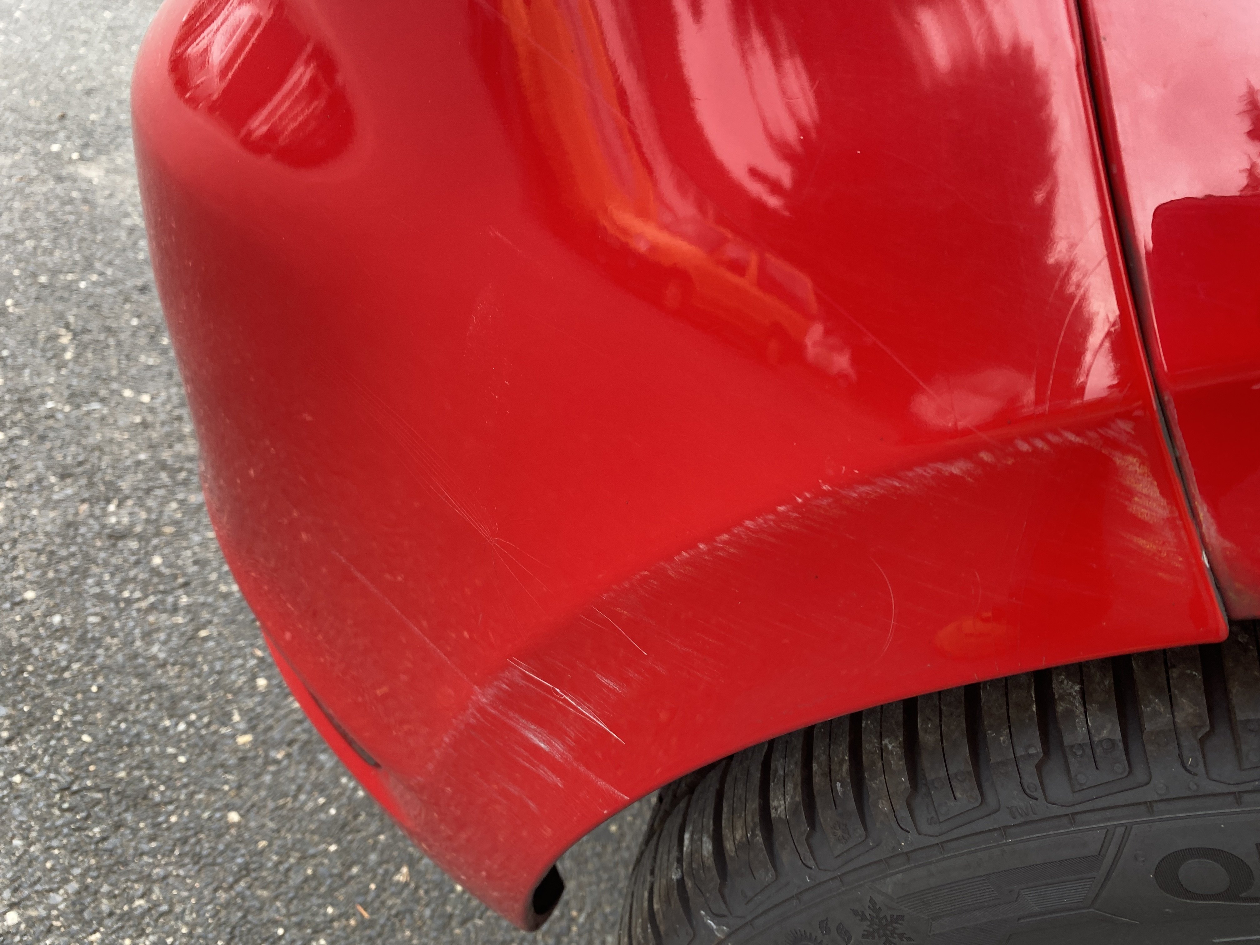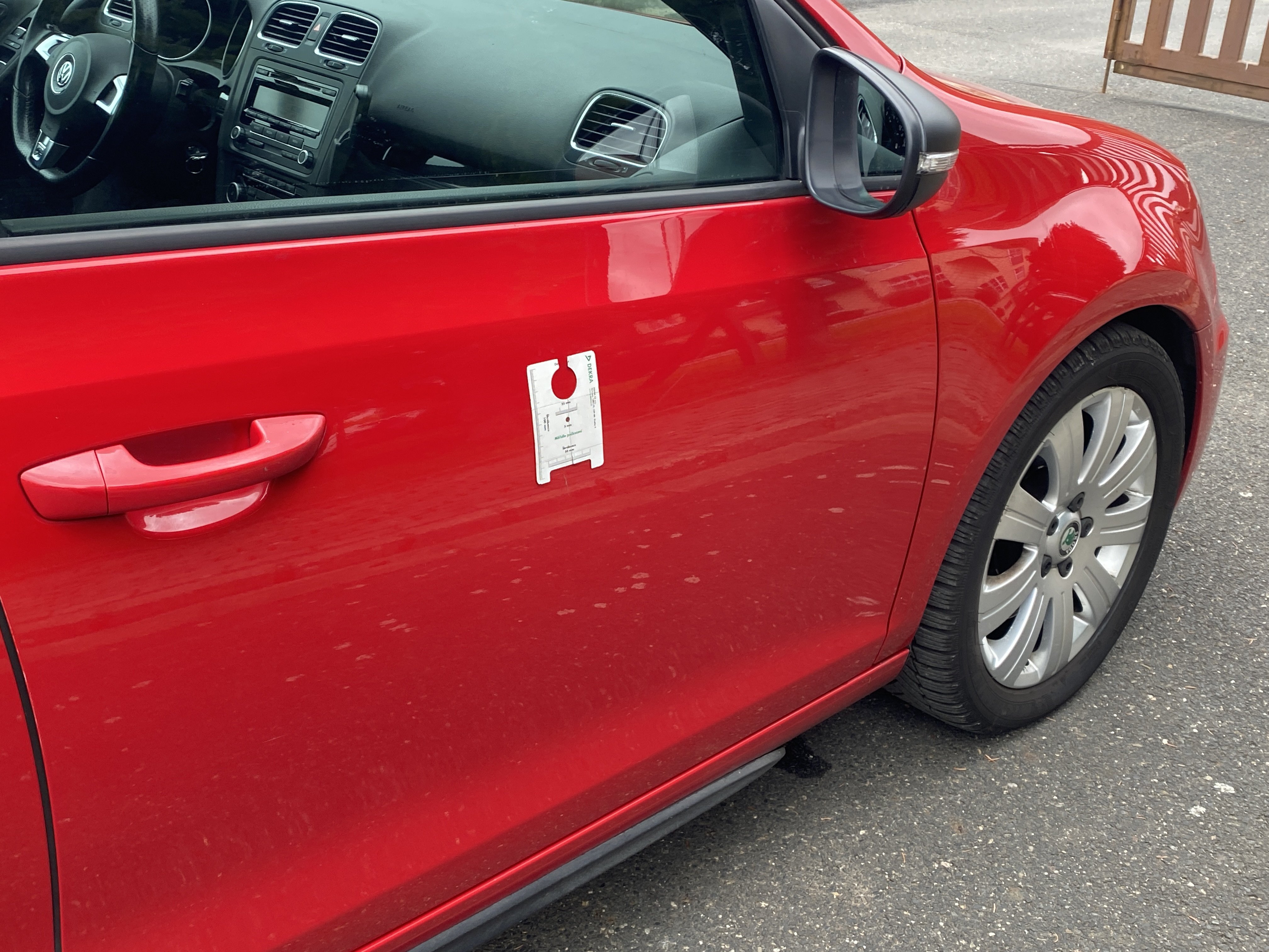 Oděrky a škrábance po obvodu karosérie, přední část karosérie je poškozená od kamínků, karosérie nese stopy po předchozí opravě, odřené pravé přední dveře, odřený pravý přední blatník, odřený přední nárazník, přední nárazník nelícuje, odřené víko motorového prostoru, odřená klika levých předních dveří, odřený zadní nárazník, odřený pravý zadní blatník, svítí kontrolka motoru, interiér vozidla opotřeben, palubní počítač hlásí servisní interval, svítí kontrolka motoru, poškozen potah levého předního sedadla,
