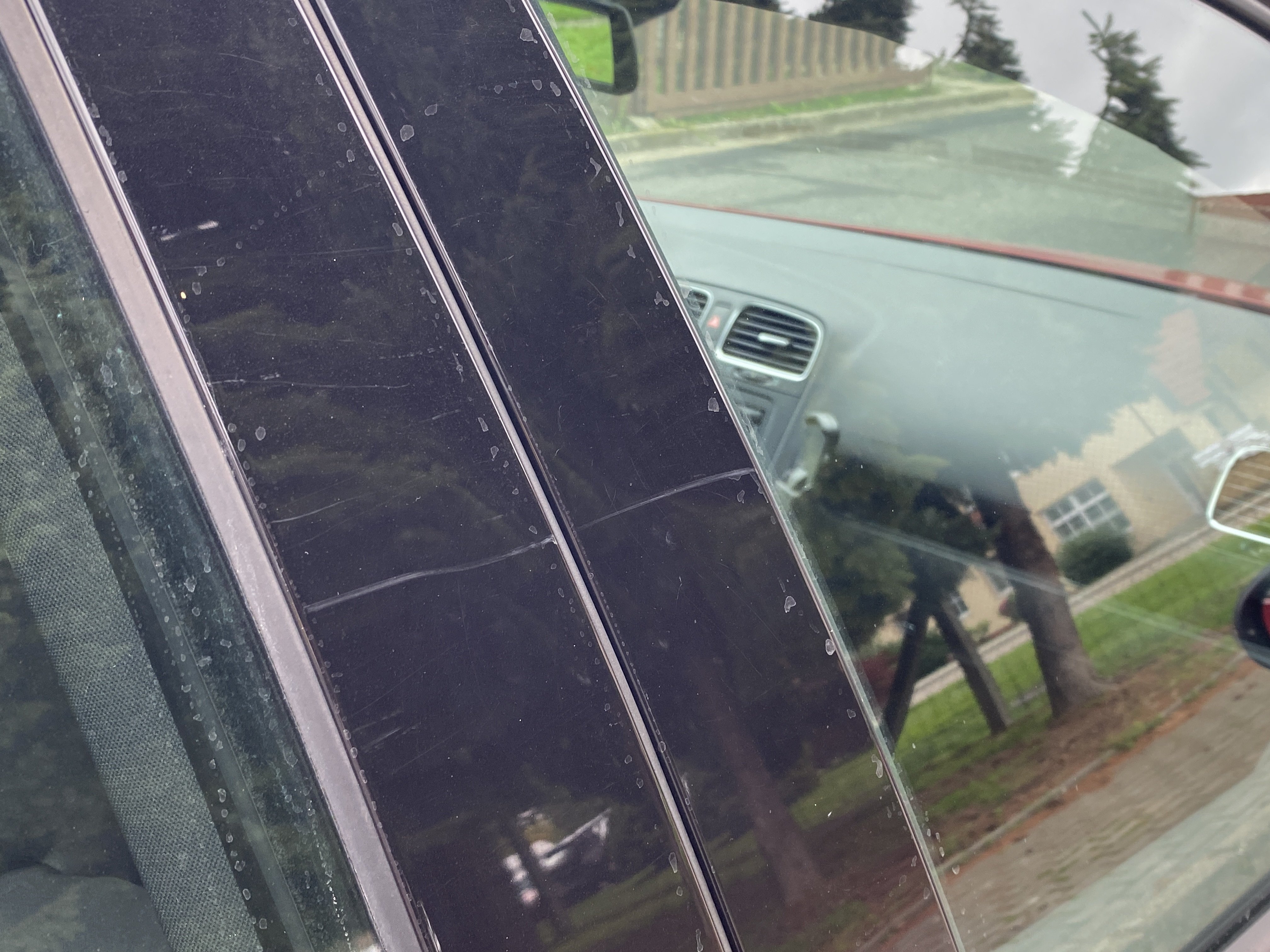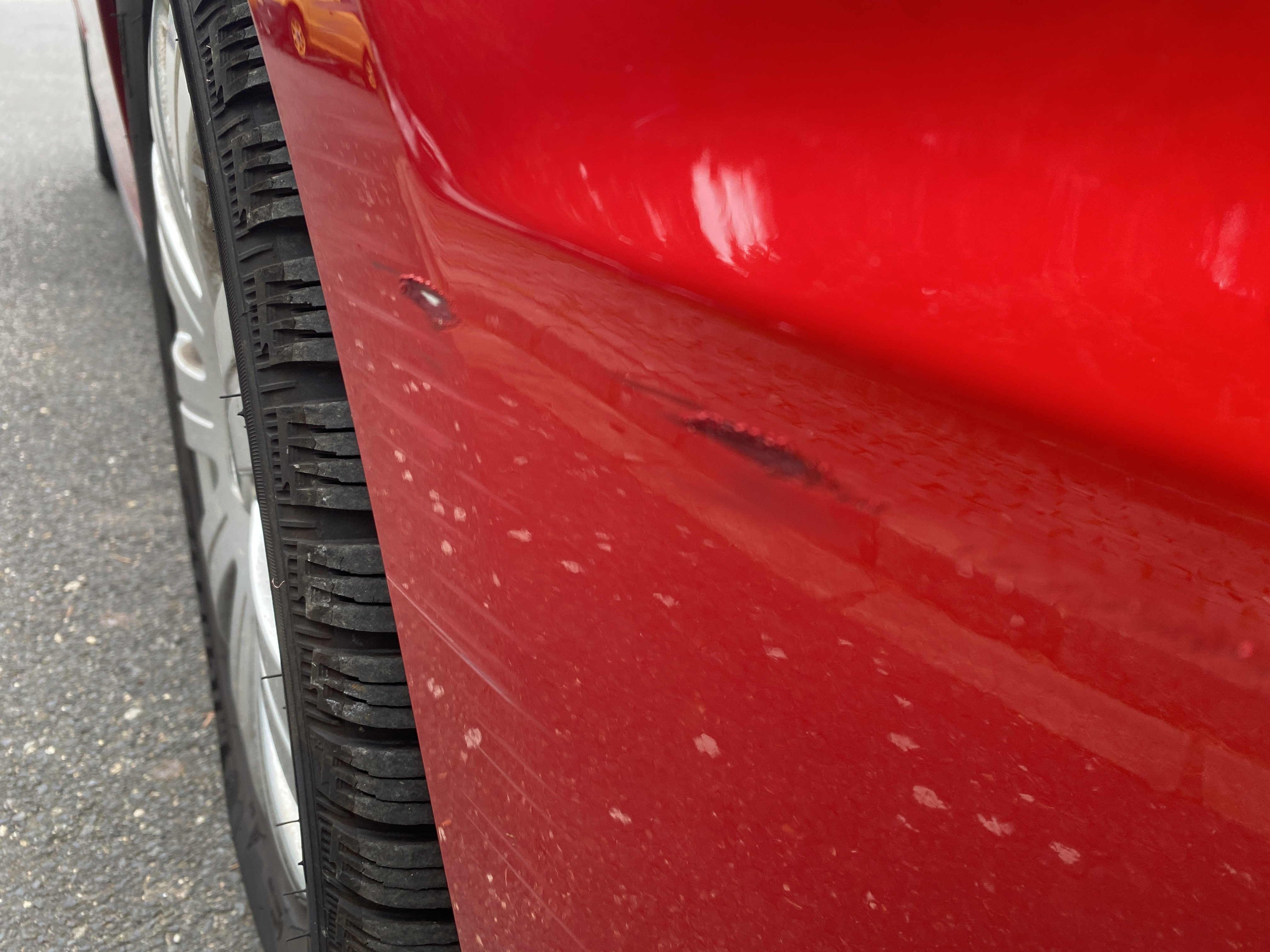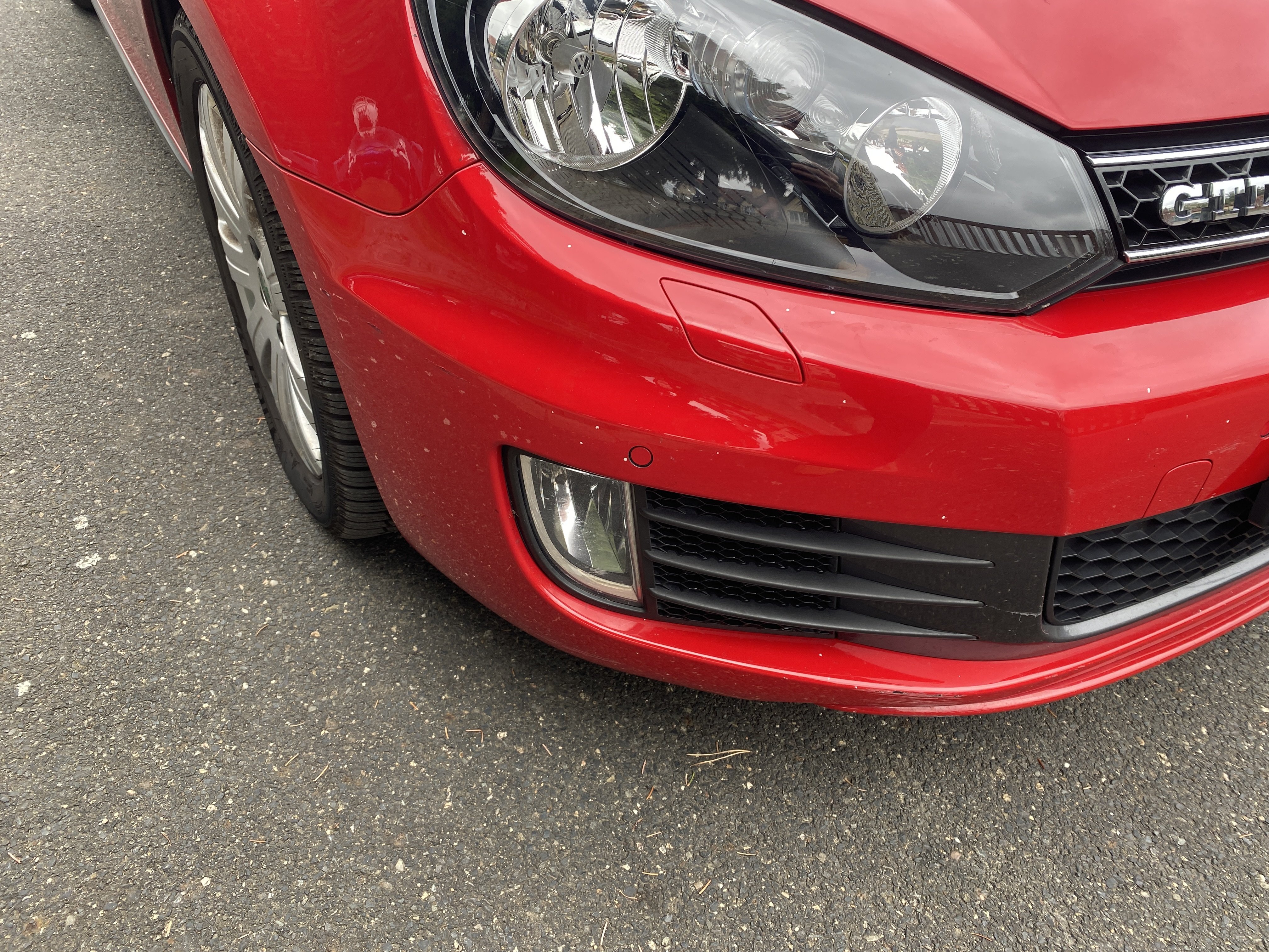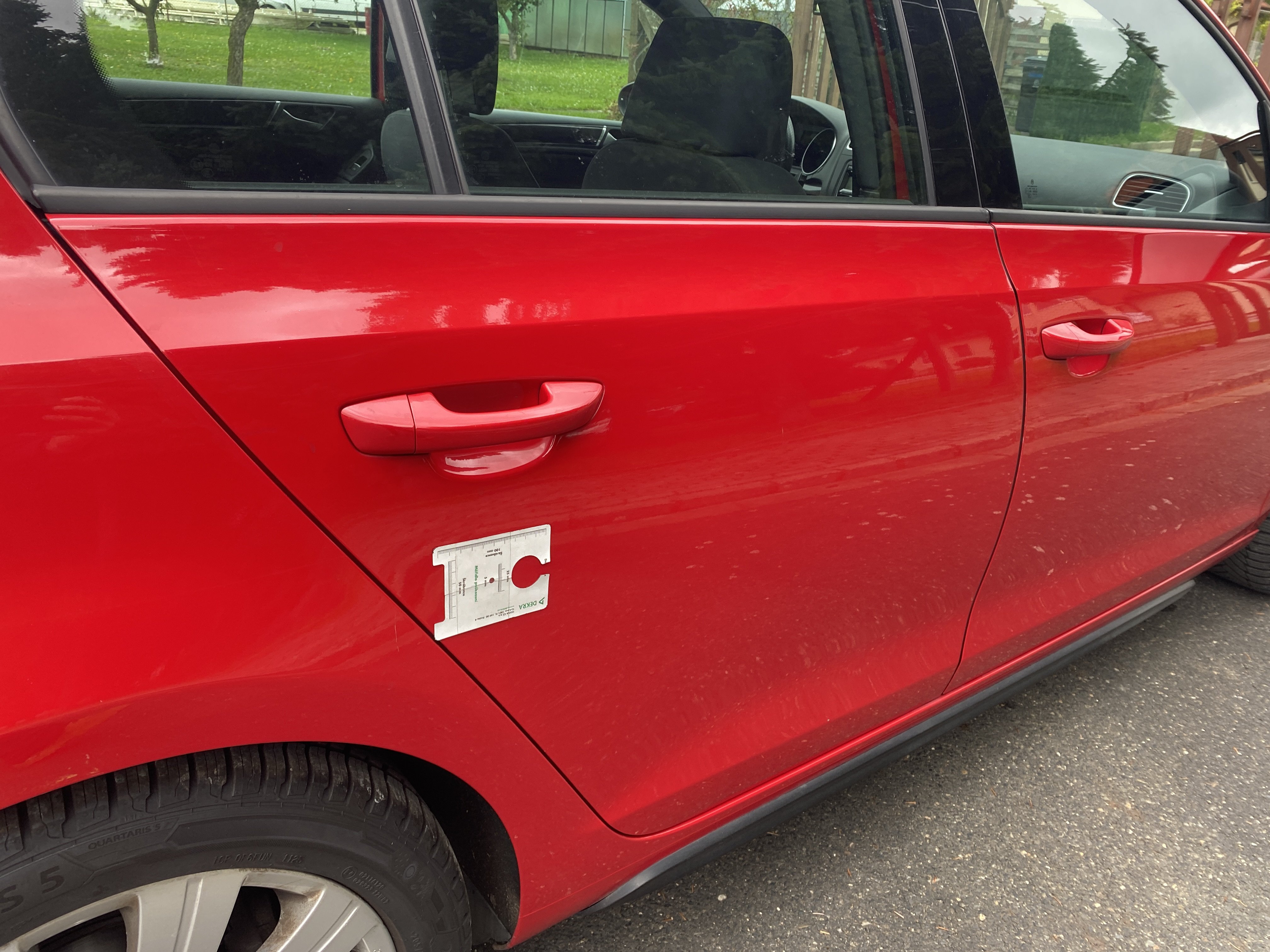 Oděrky a škrábance po obvodu karosérie, přední část karosérie je poškozená od kamínků, karosérie nese stopy po předchozí opravě, odřené pravé přední dveře, odřený pravý přední blatník, odřený přední nárazník, přední nárazník nelícuje, odřené víko motorového prostoru, odřená klika levých předních dveří, odřený zadní nárazník, odřený pravý zadní blatník, svítí kontrolka motoru, interiér vozidla opotřeben, palubní počítač hlásí servisní interval, svítí kontrolka motoru, poškozen potah levého předního sedadla,